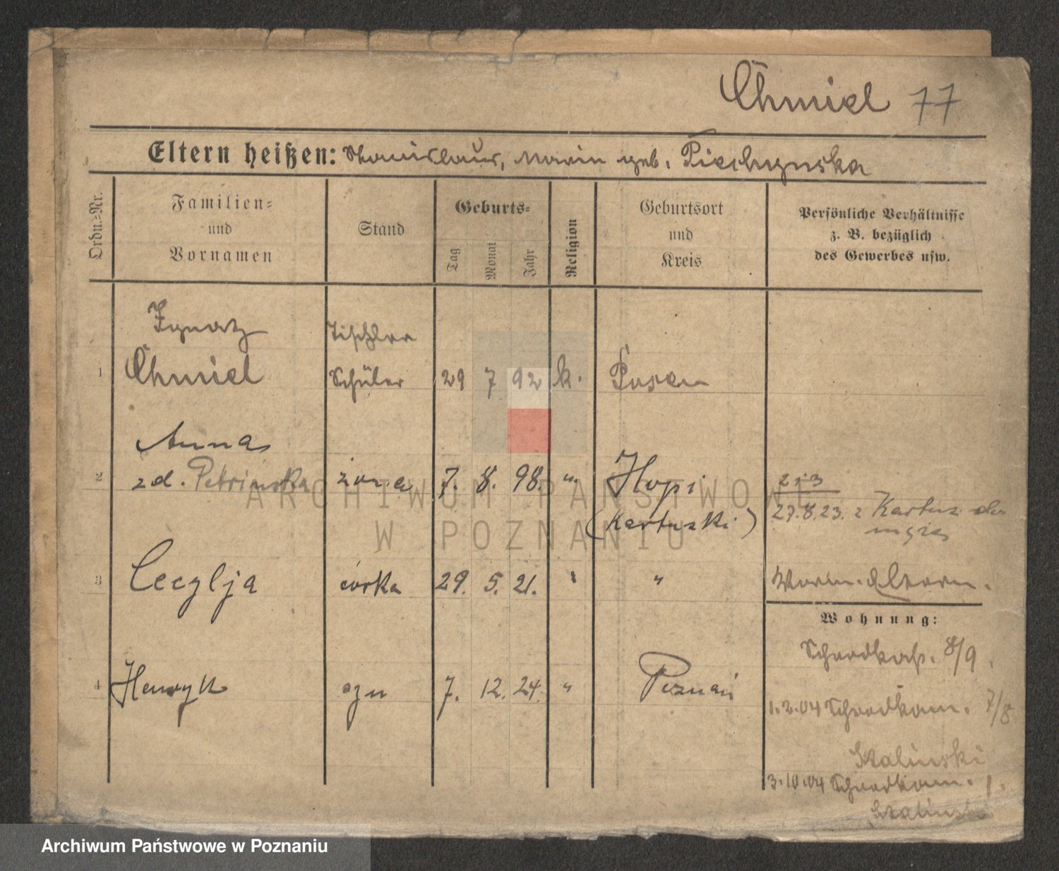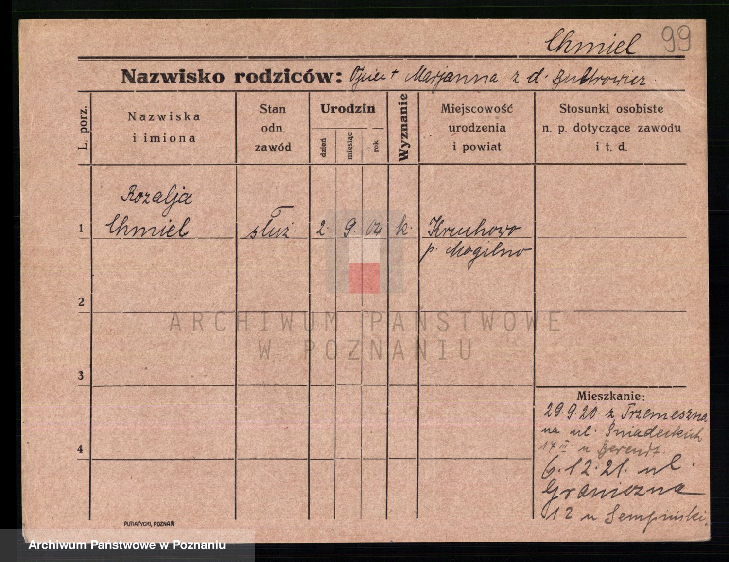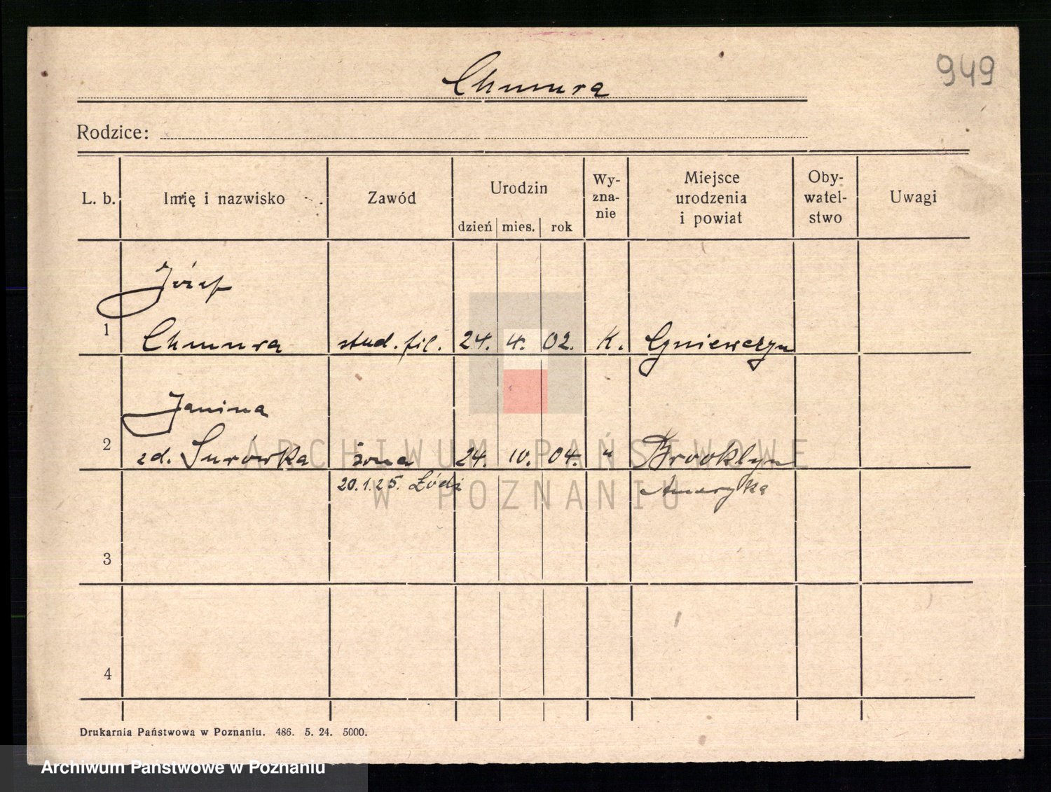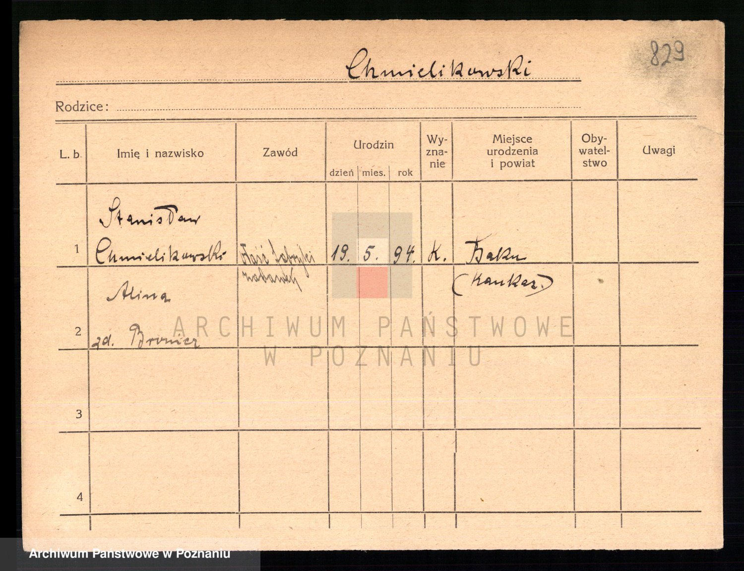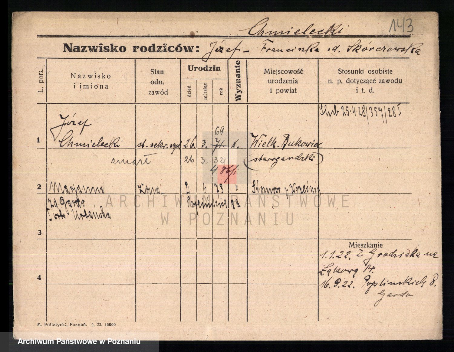 Podgląd karty osobowej dostępny jest po kliknięciu na nazwisko lub ikonkę karty. Można dokonywać powiększenia (ikony na górze) lub przechodzić między kolejnymi skanami (strzałki po bokach).