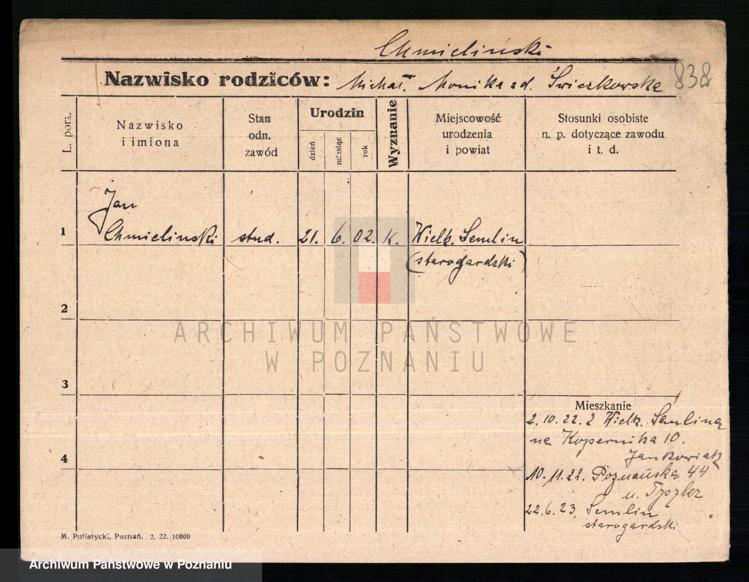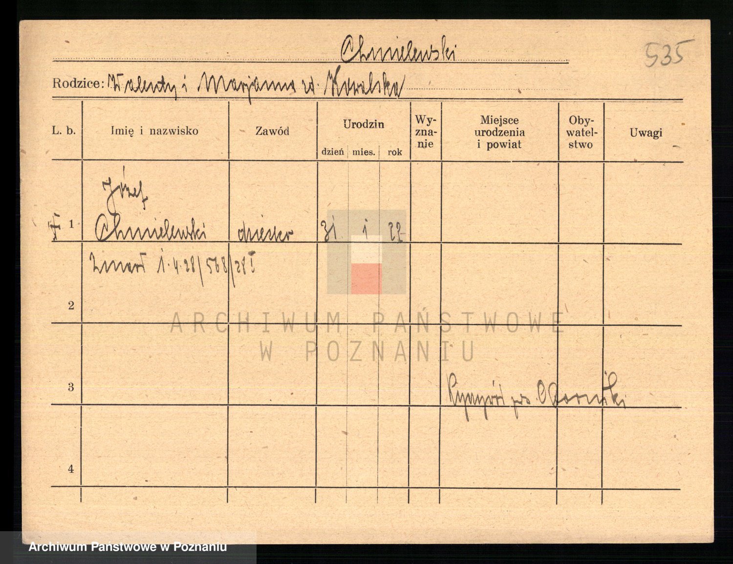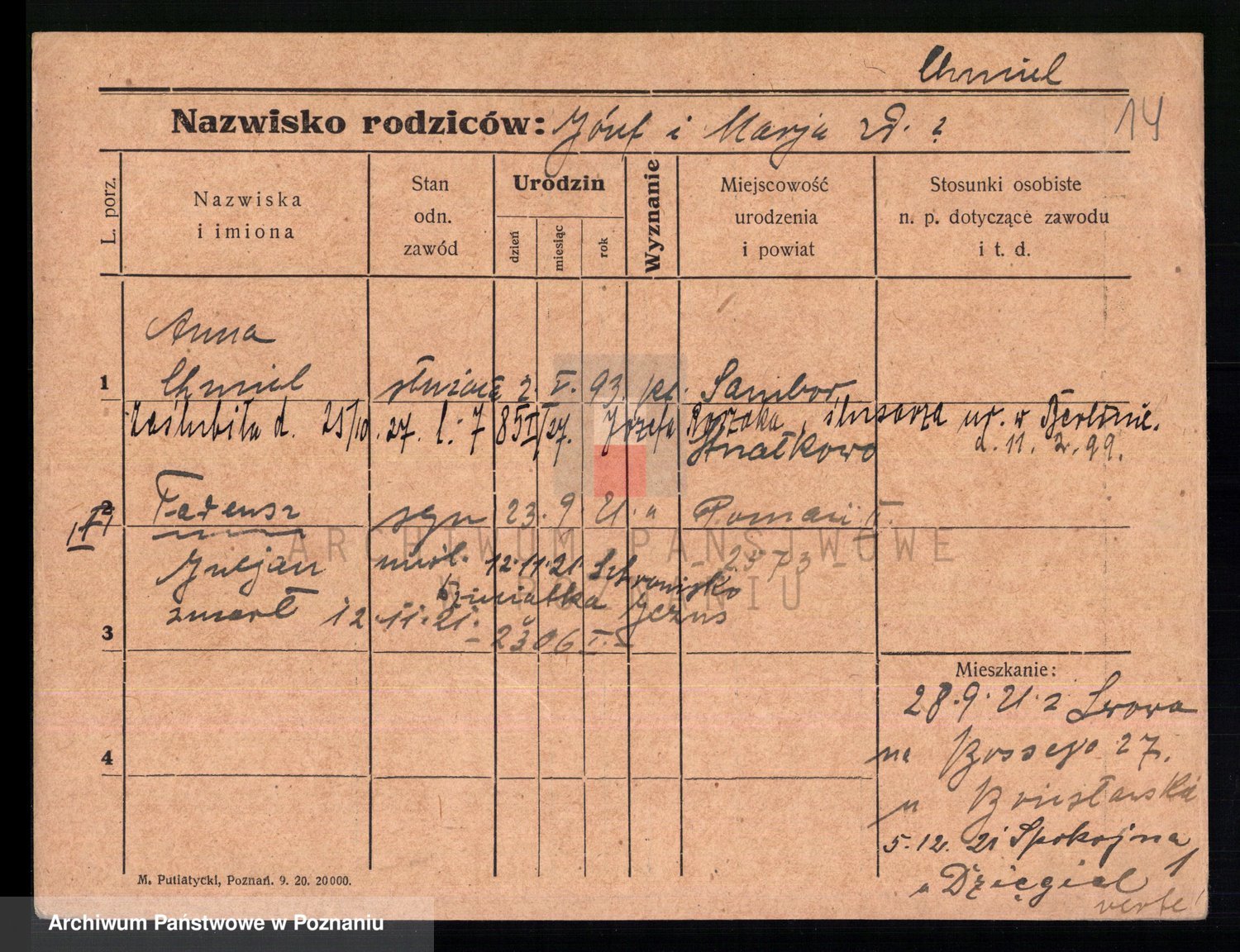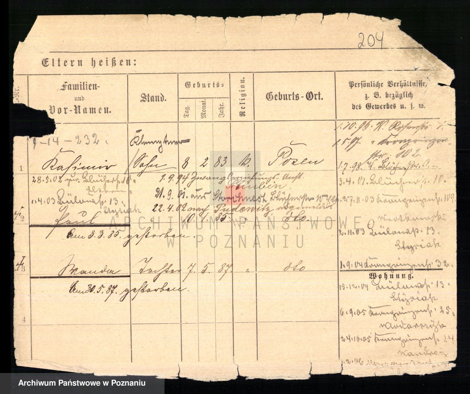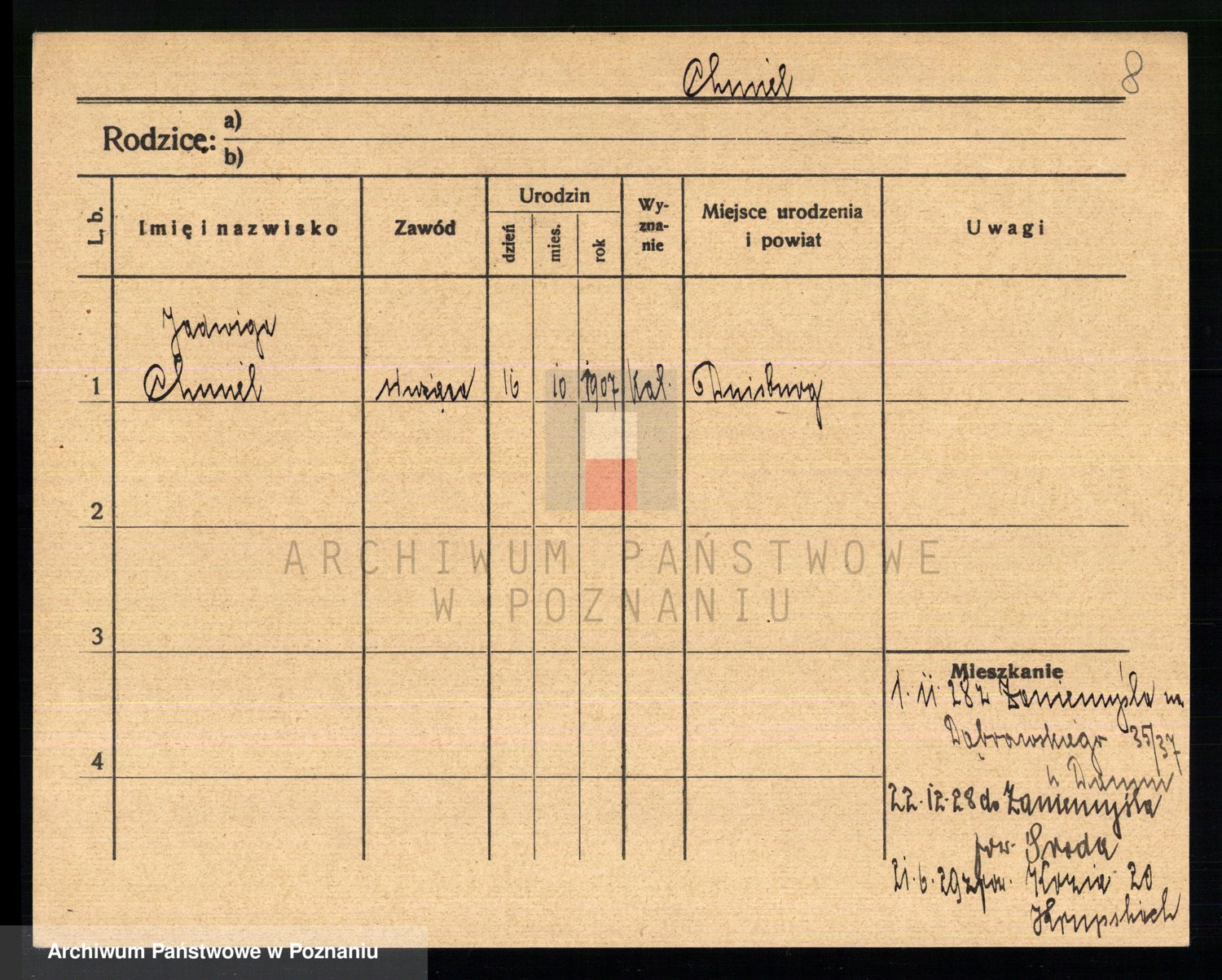 Podgląd karty osobowej dostępny jest po kliknięciu na nazwisko lub ikonkę karty. Można dokonywać powiększenia (ikony na górze) lub przechodzić między kolejnymi skanami (strzałki po bokach).