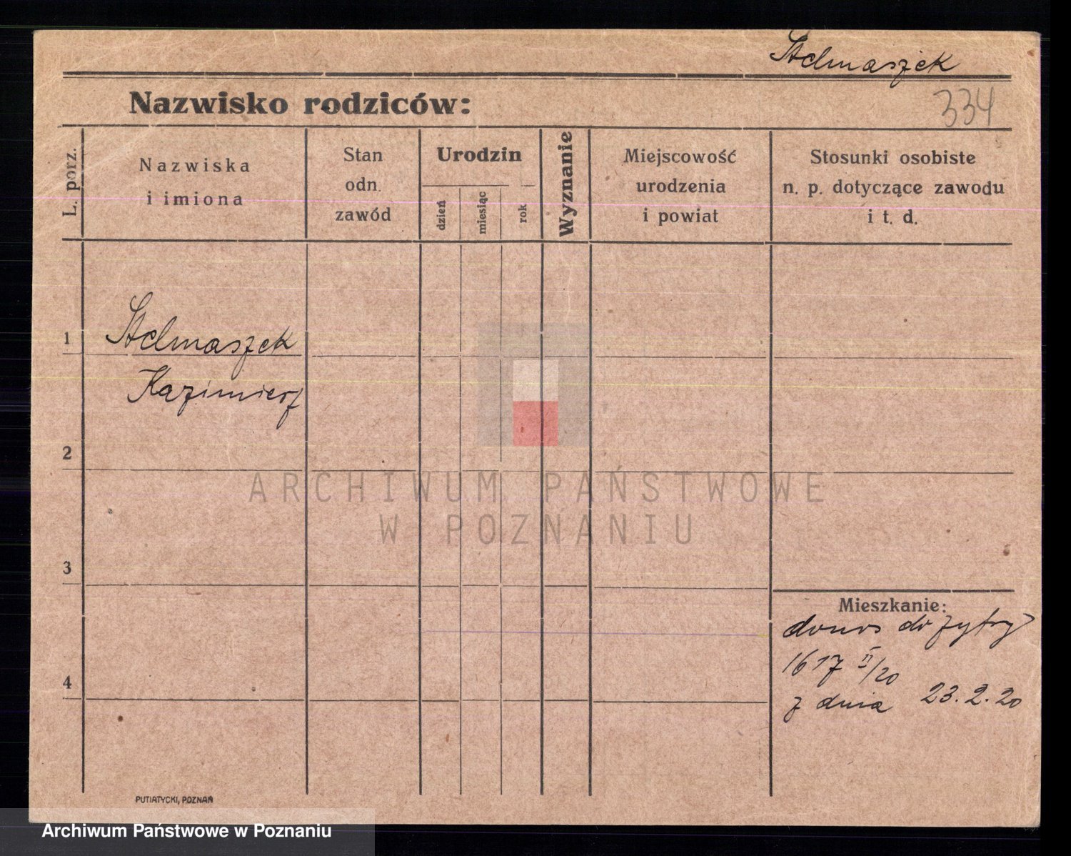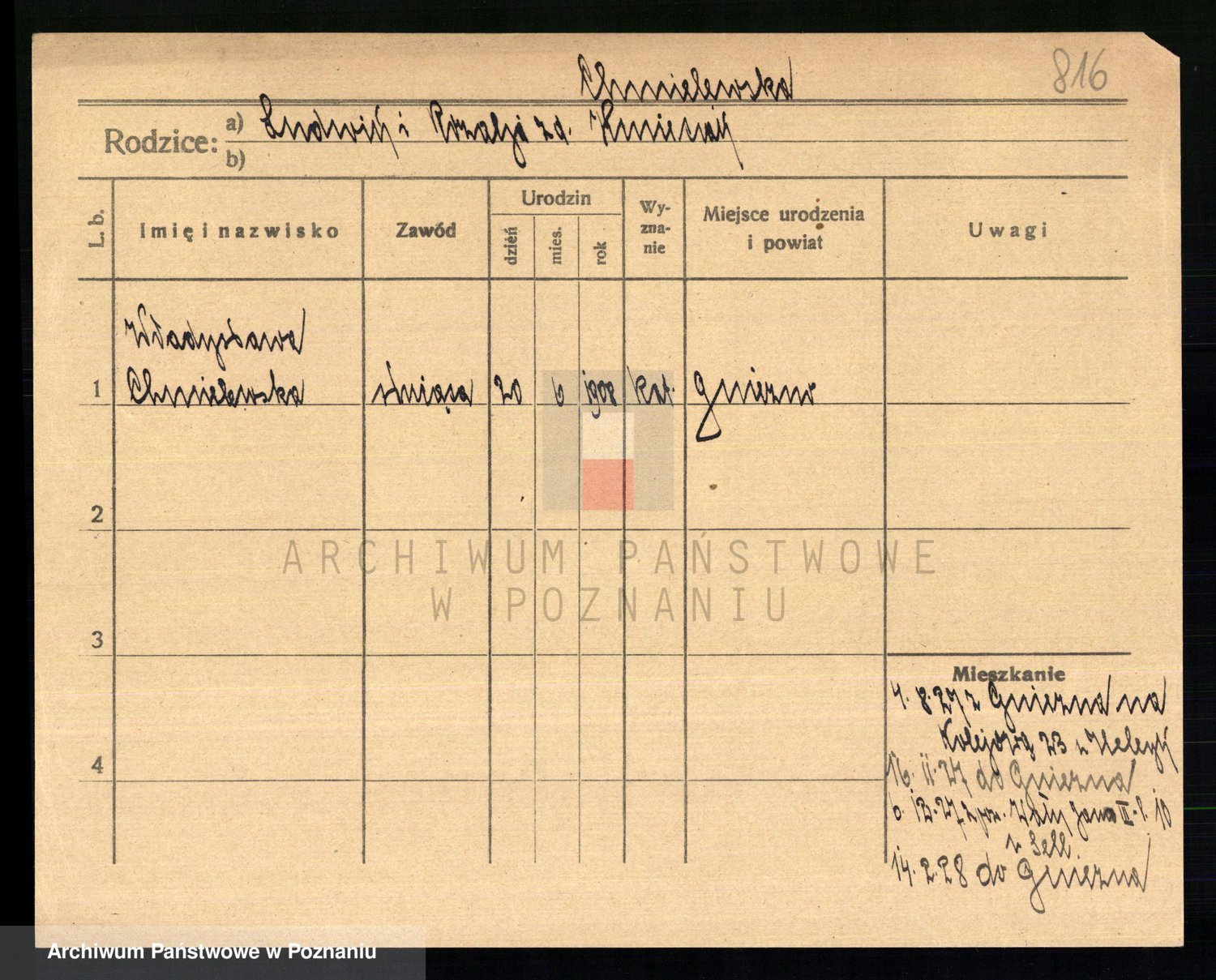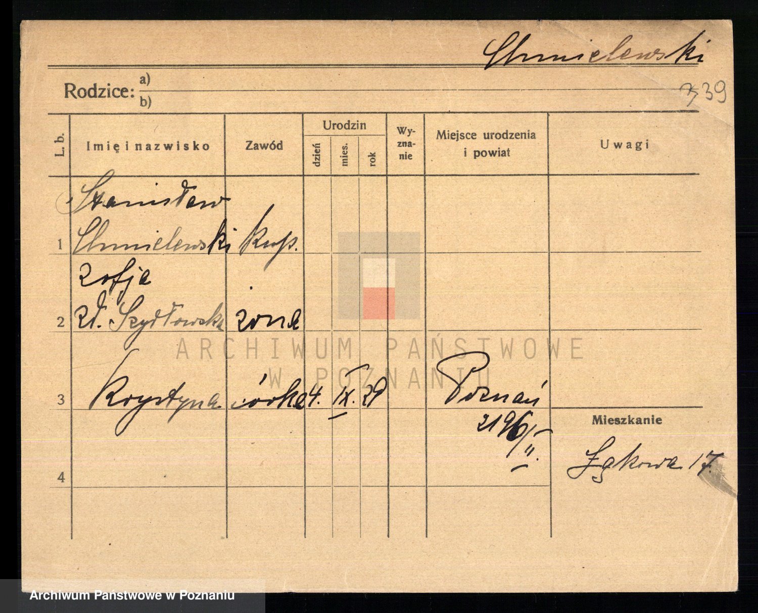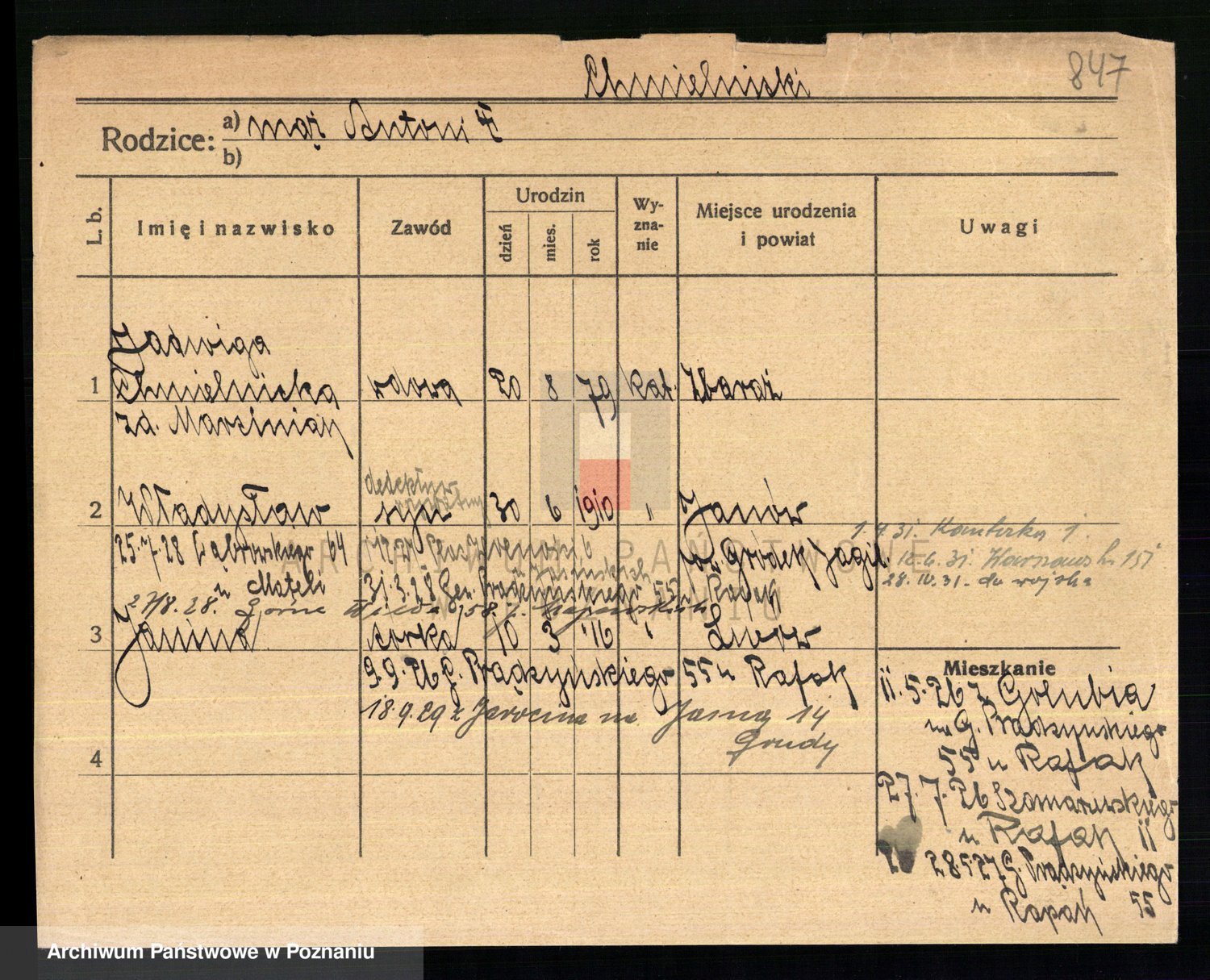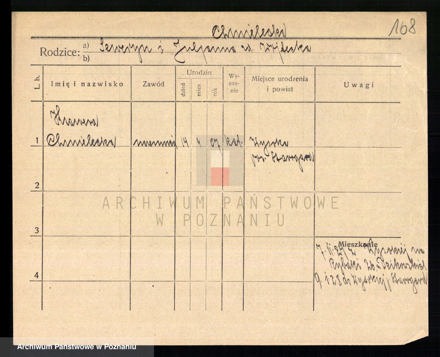 Podgląd karty osobowej dostępny jest po kliknięciu na nazwisko lub ikonkę karty. Można dokonywać powiększenia (ikony na górze) lub przechodzić między kolejnymi skanami (strzałki po bokach).