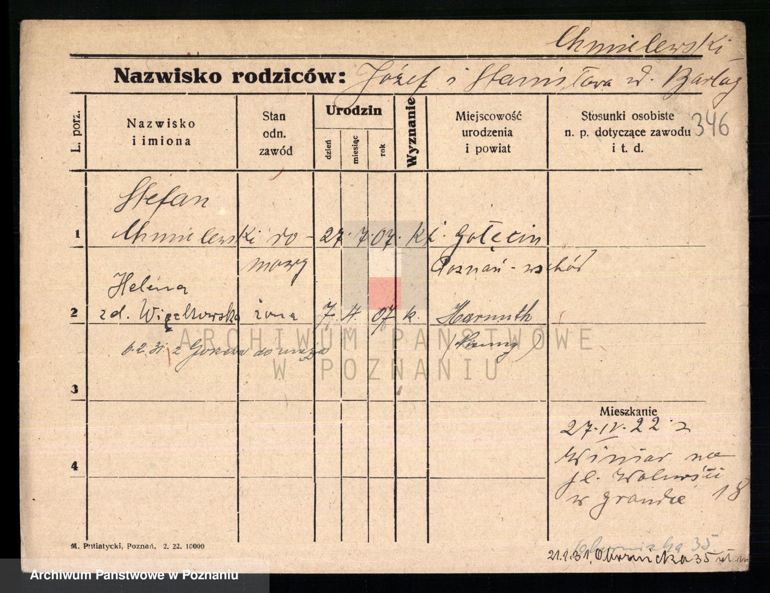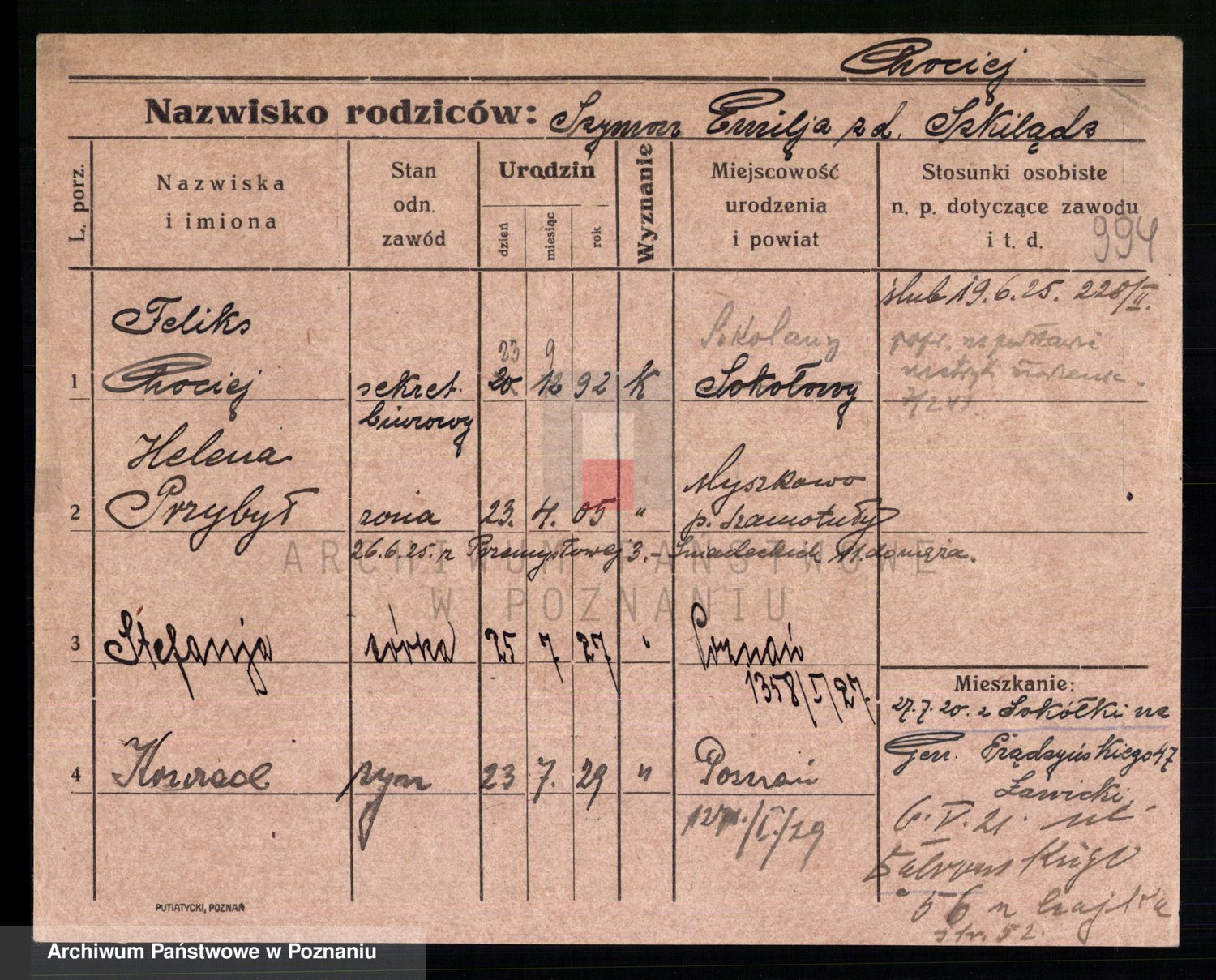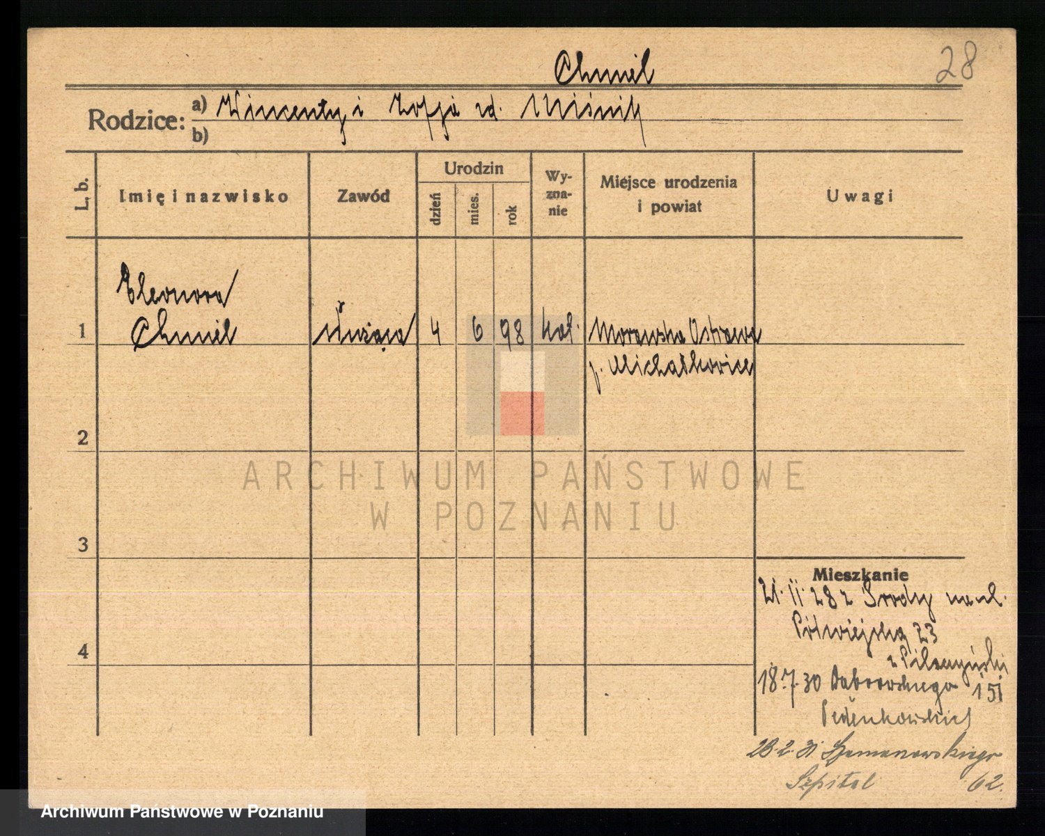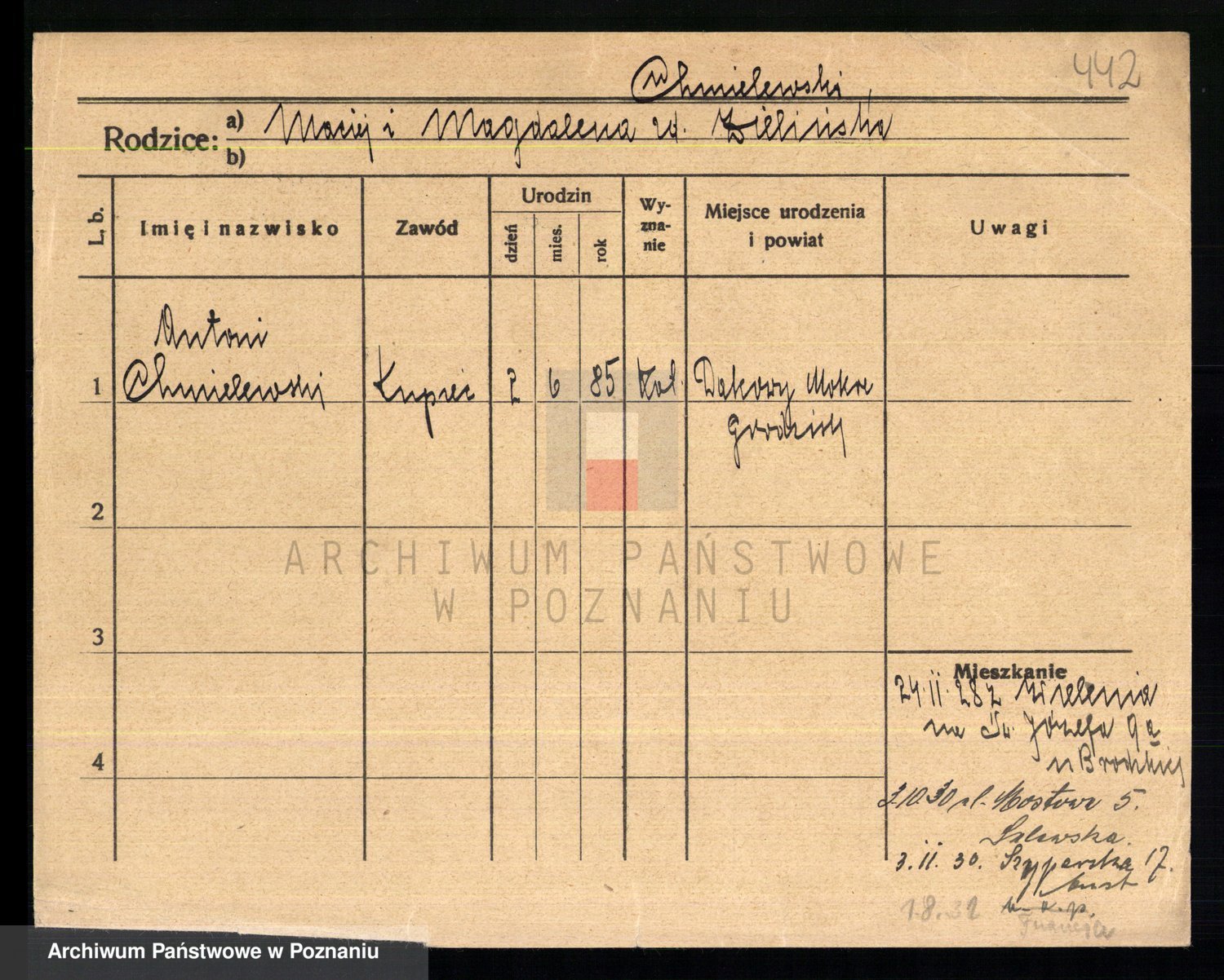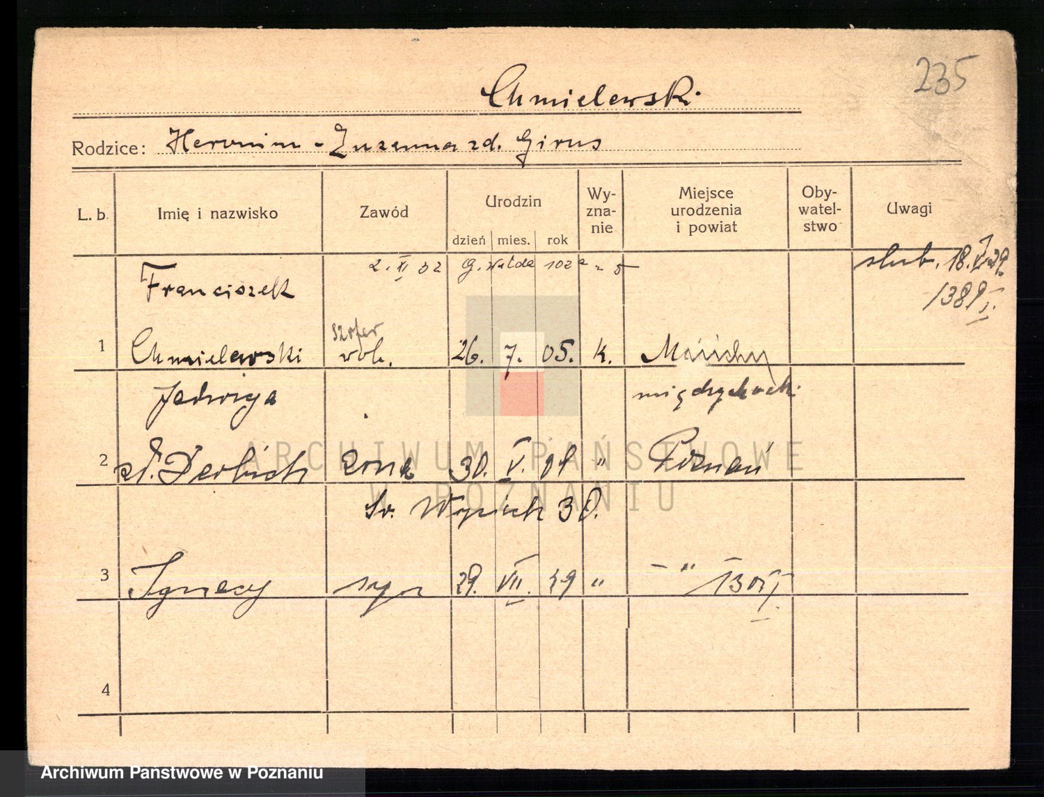 Podgląd karty osobowej dostępny jest po kliknięciu na nazwisko lub ikonkę karty. Można dokonywać powiększenia (ikony na górze) lub przechodzić między kolejnymi skanami (strzałki po bokach).