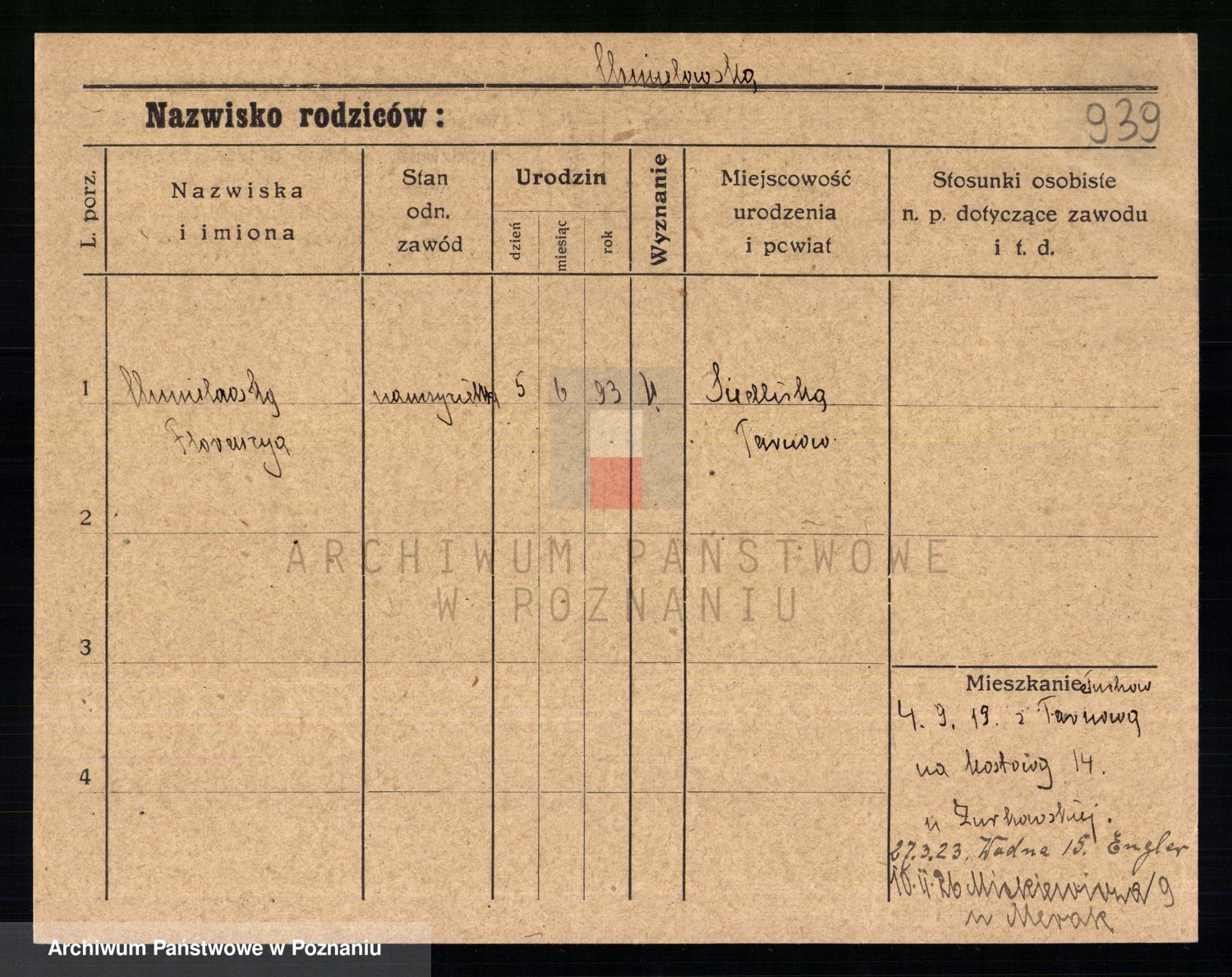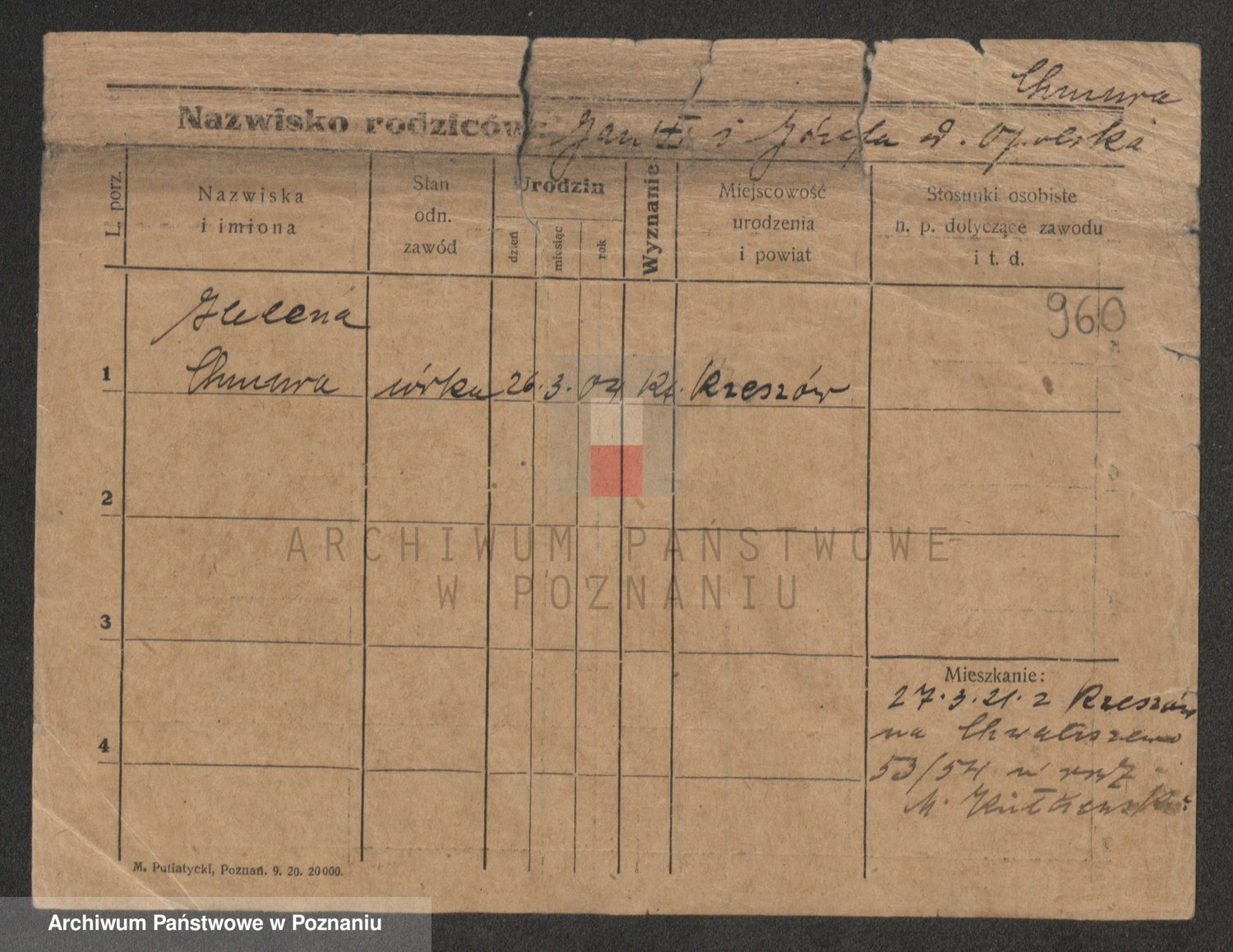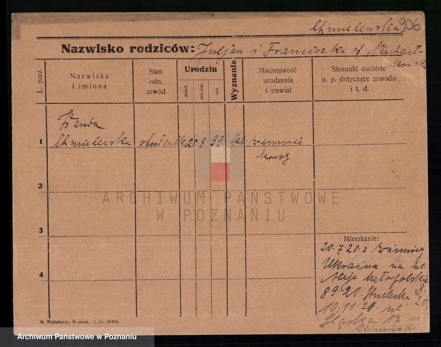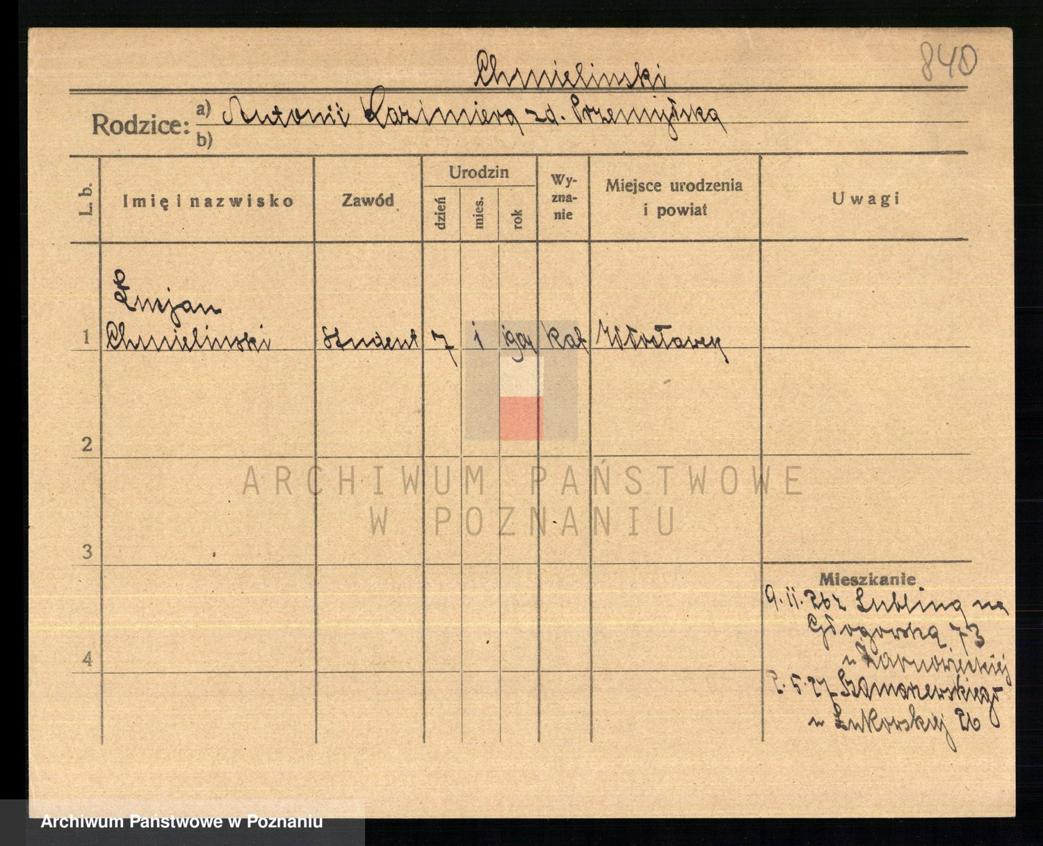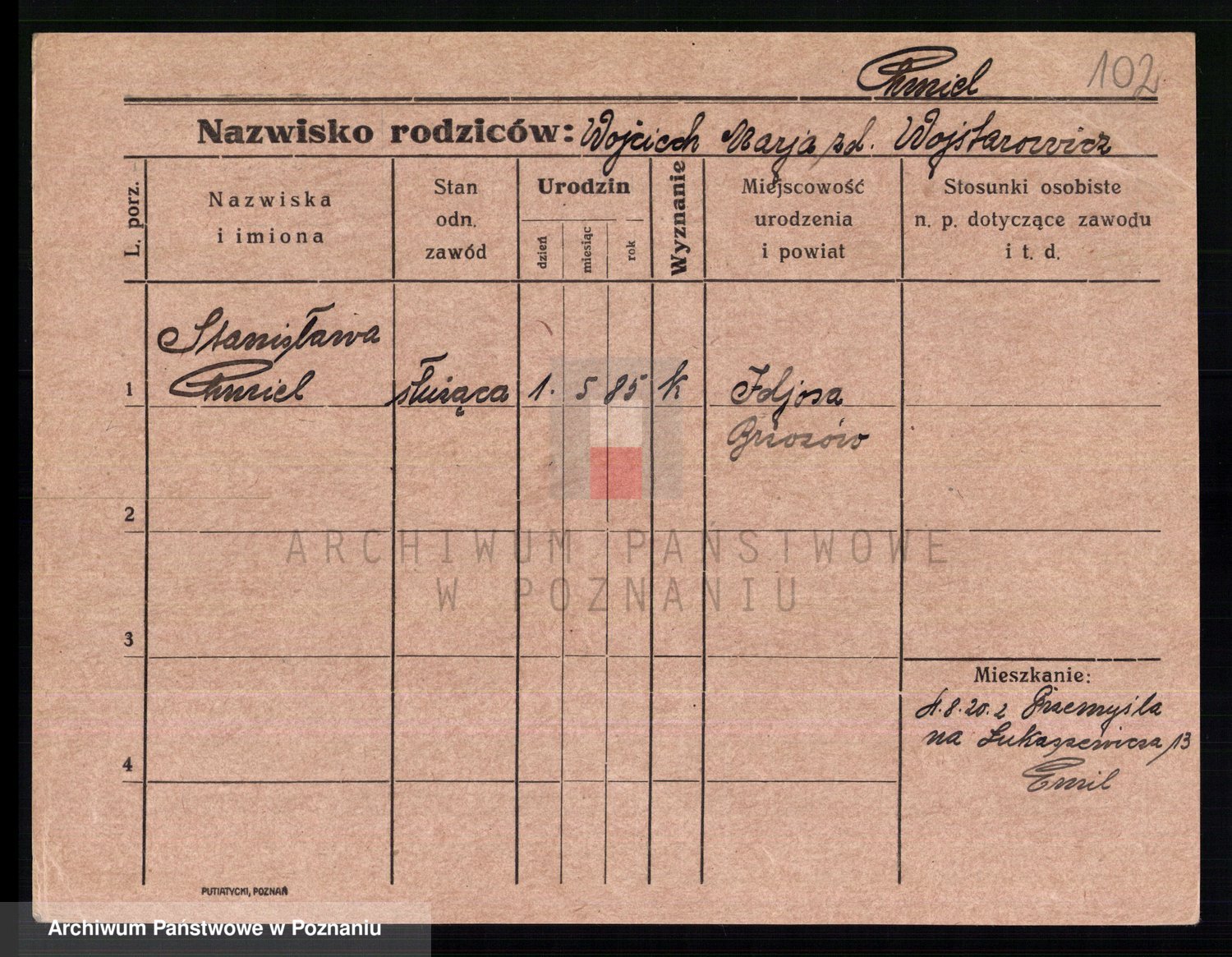 Podgląd karty osobowej dostępny jest po kliknięciu na nazwisko lub ikonkę karty. Można dokonywać powiększenia (ikony na górze) lub przechodzić między kolejnymi skanami (strzałki po bokach).