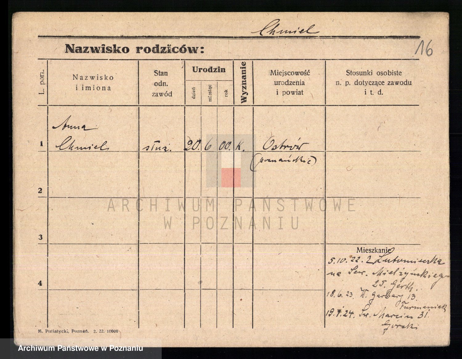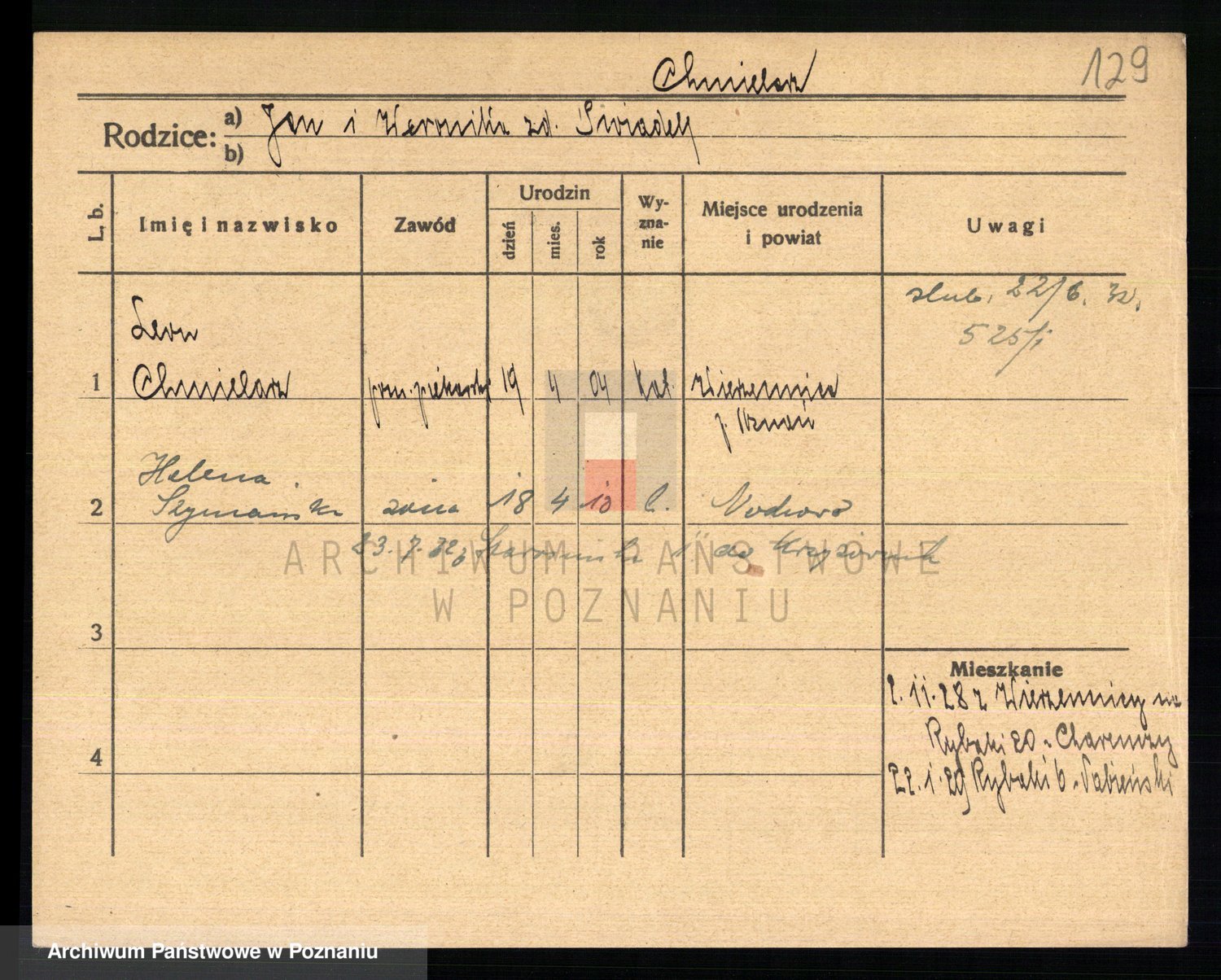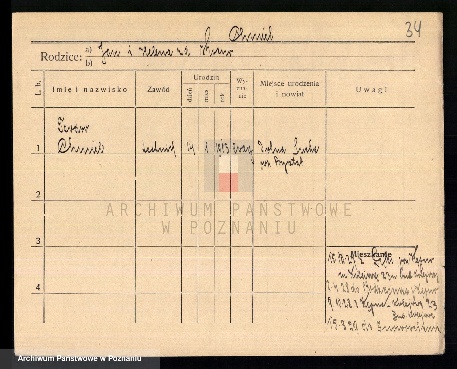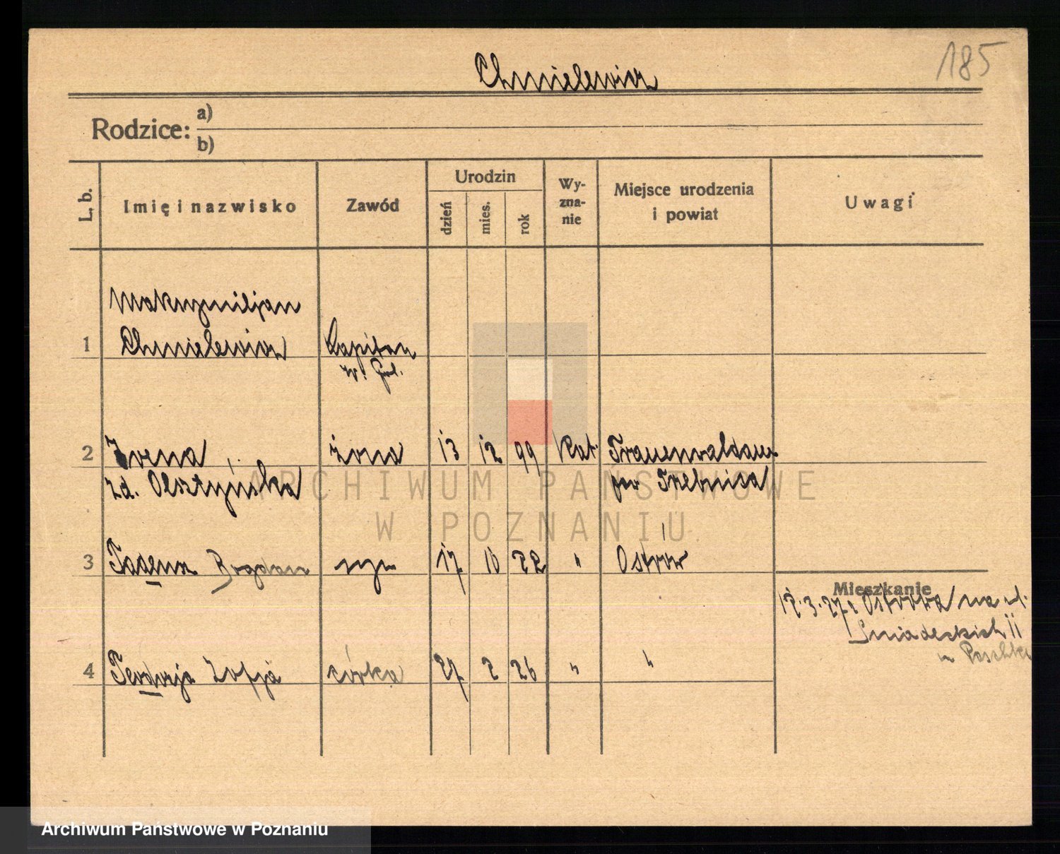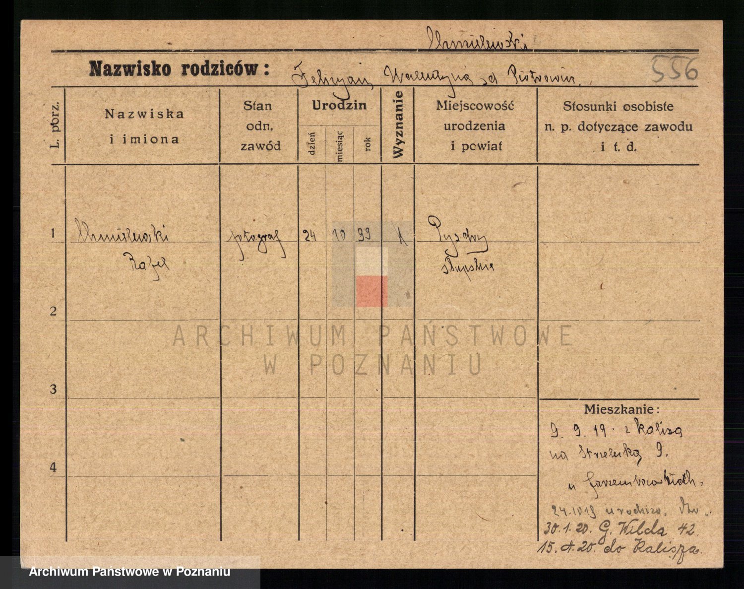 Podgląd karty osobowej dostępny jest po kliknięciu na nazwisko lub ikonkę karty. Można dokonywać powiększenia (ikony na górze) lub przechodzić między kolejnymi skanami (strzałki po bokach).