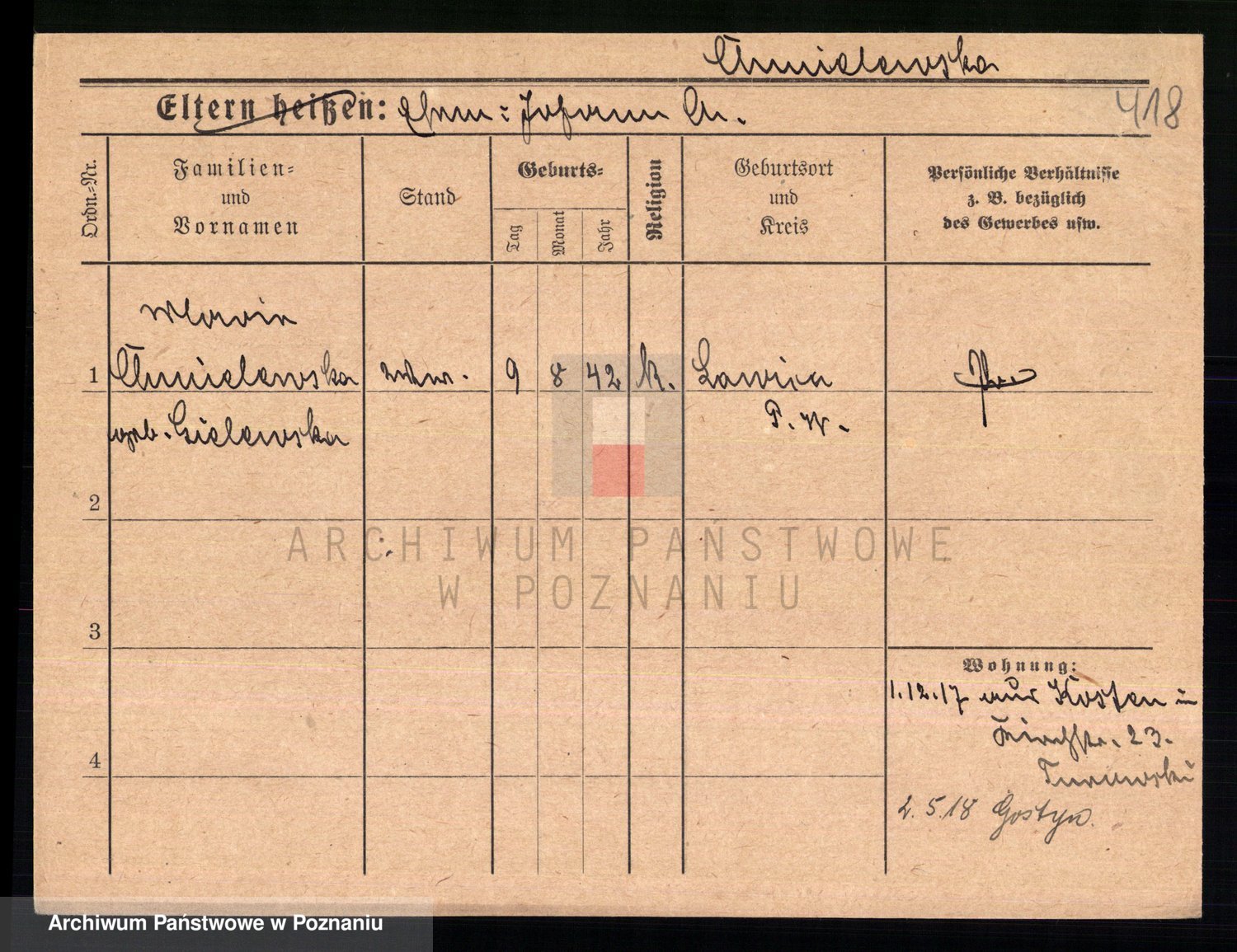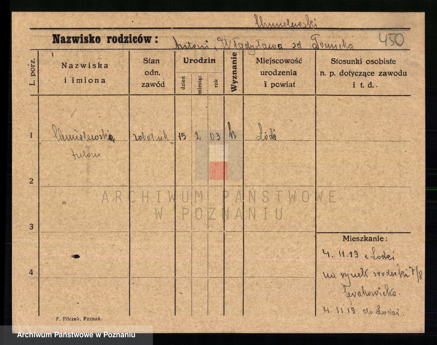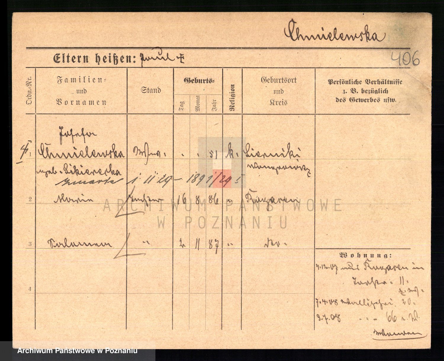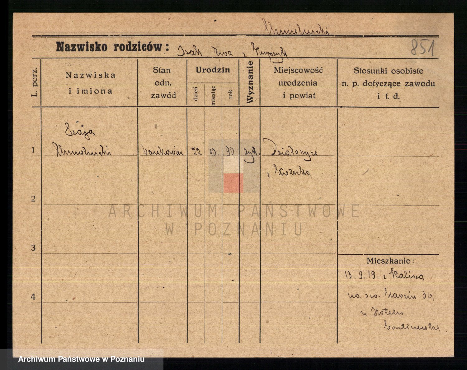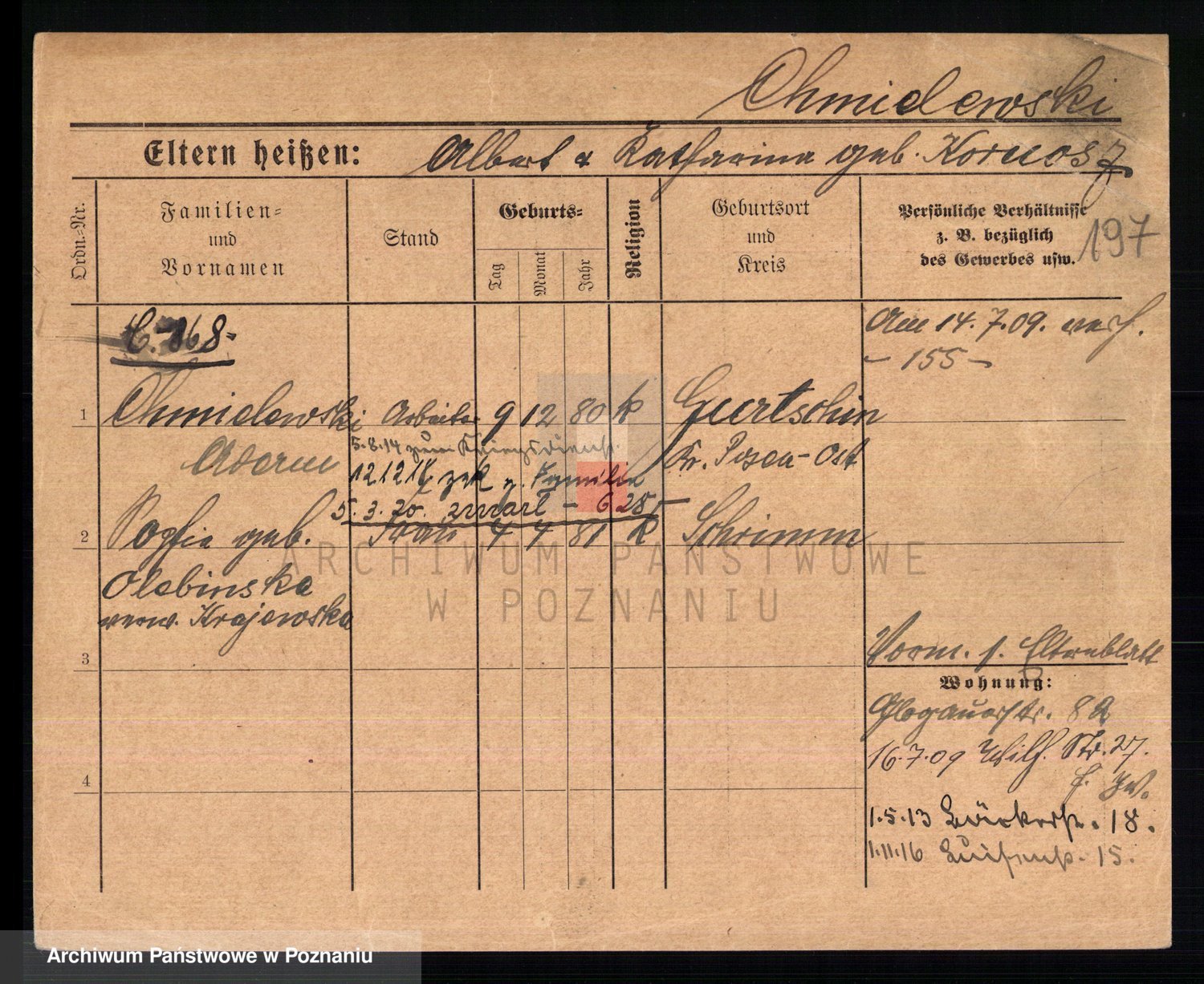 Podgląd karty osobowej dostępny jest po kliknięciu na nazwisko lub ikonkę karty. Można dokonywać powiększenia (ikony na górze) lub przechodzić między kolejnymi skanami (strzałki po bokach).