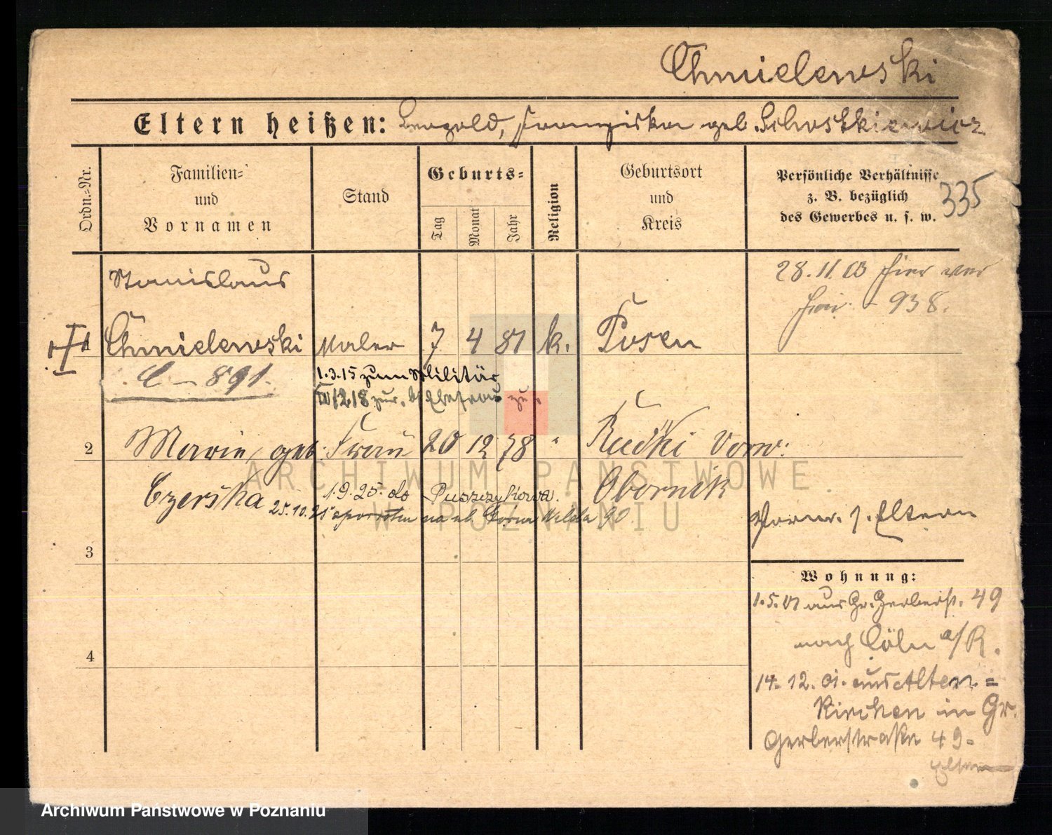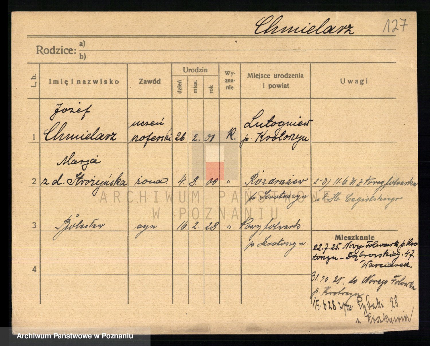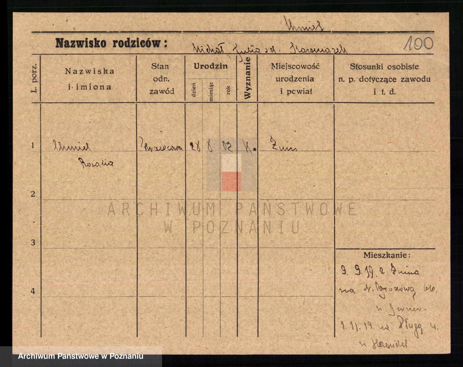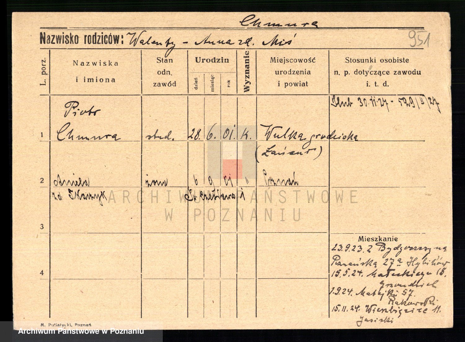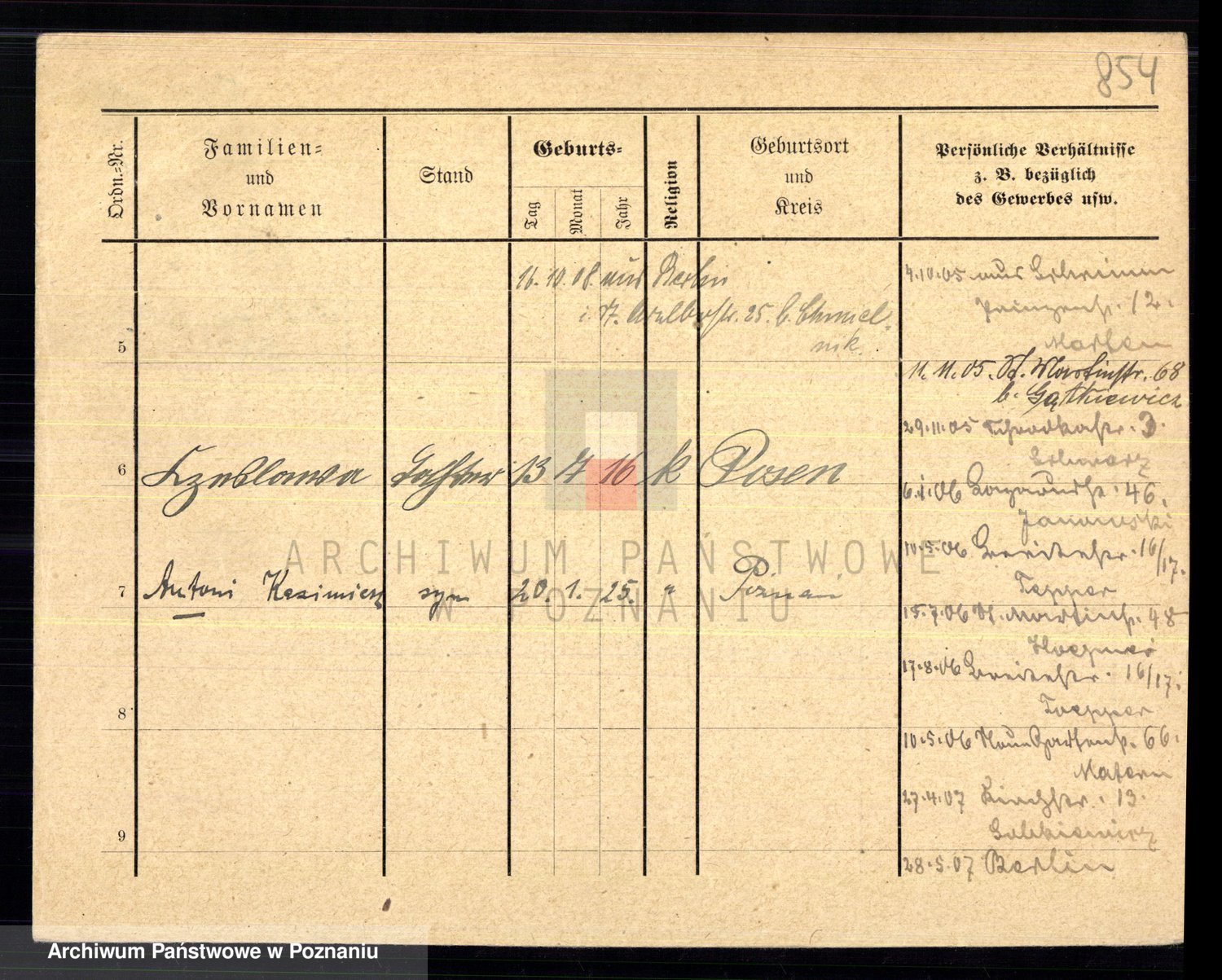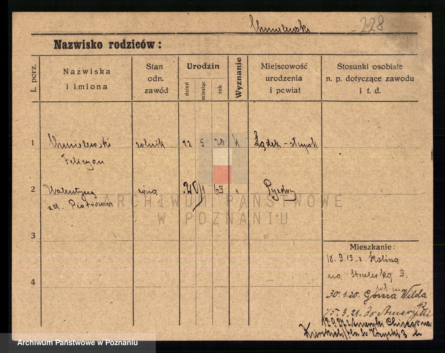 Podgląd karty osobowej dostępny jest po kliknięciu na nazwisko lub ikonkę karty. Można dokonywać powiększenia (ikony na górze) lub przechodzić między kolejnymi skanami (strzałki po bokach).