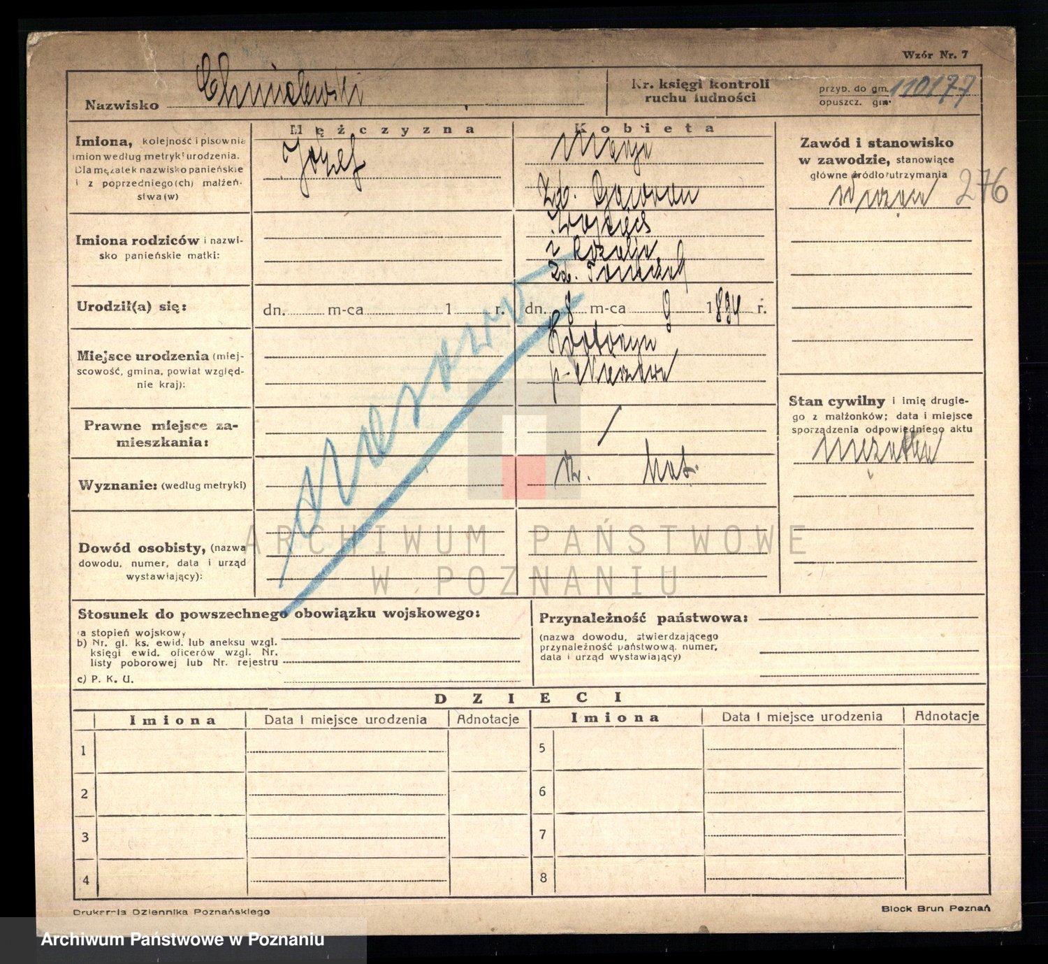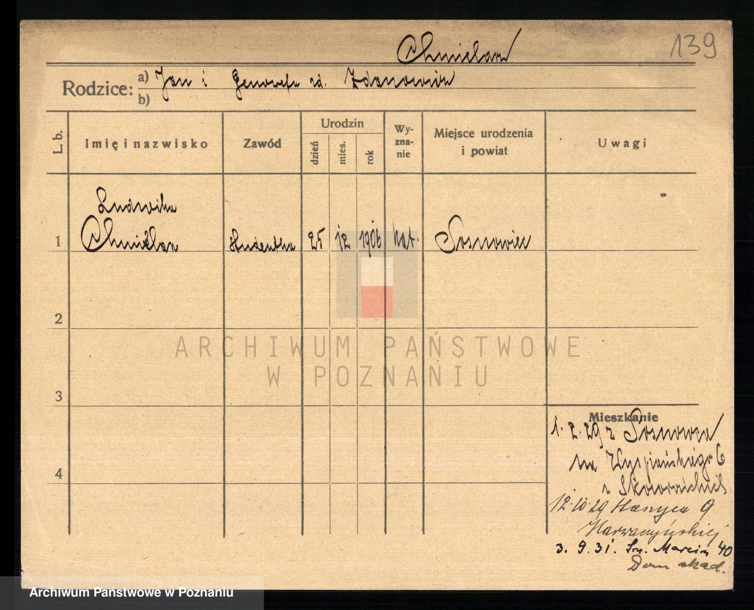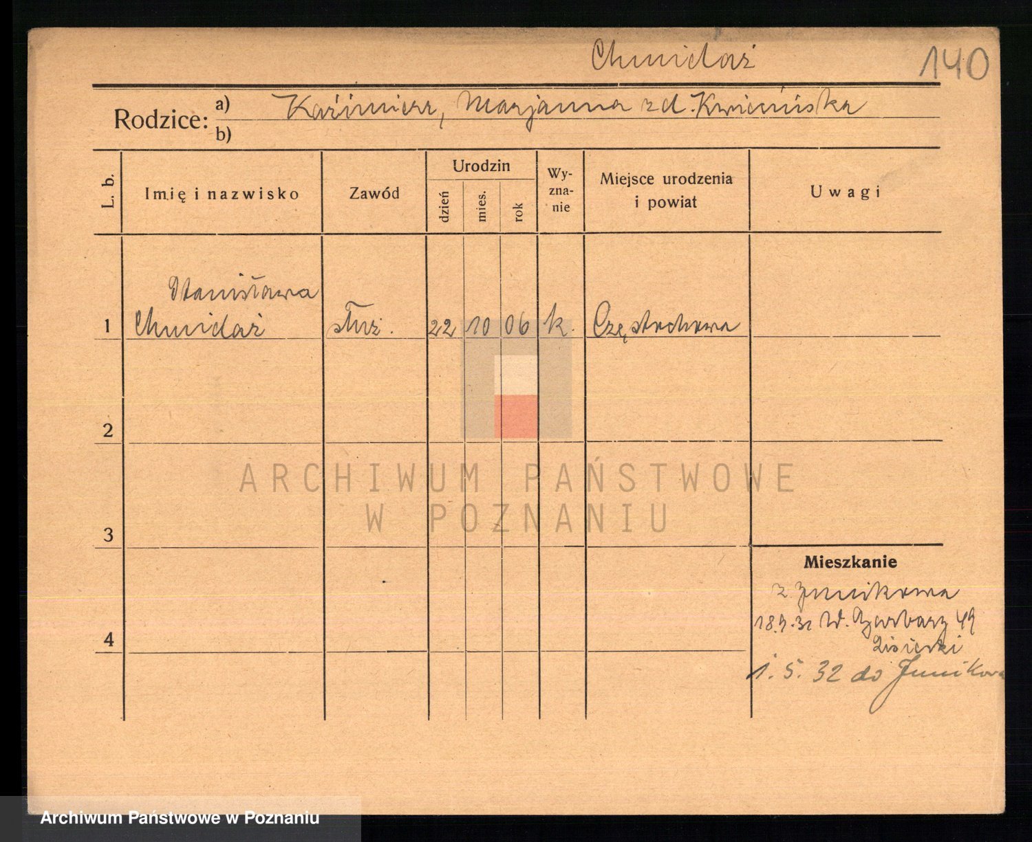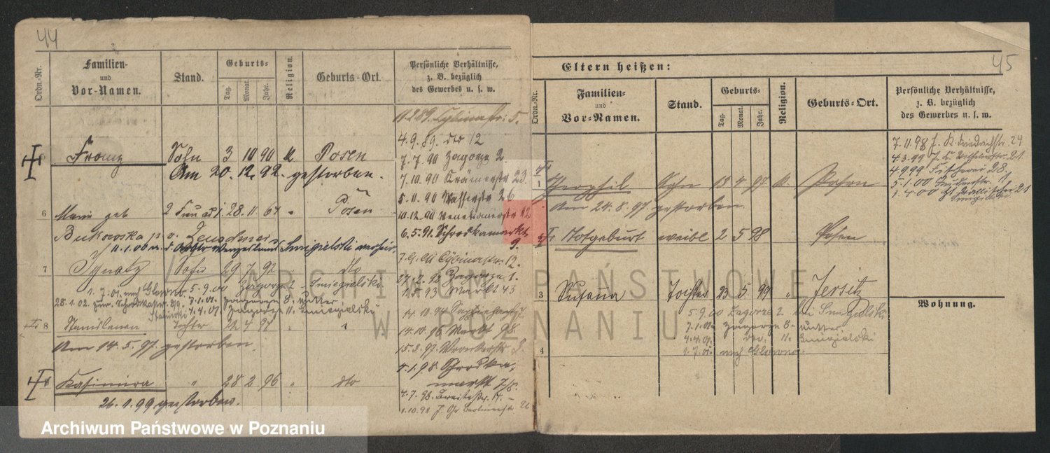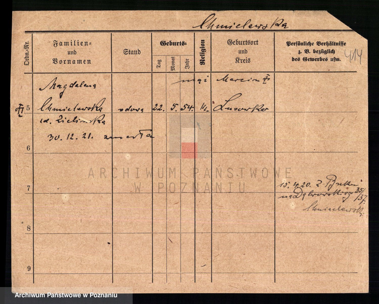 Podgląd karty osobowej dostępny jest po kliknięciu na nazwisko lub ikonkę karty. Można dokonywać powiększenia (ikony na górze) lub przechodzić między kolejnymi skanami (strzałki po bokach).