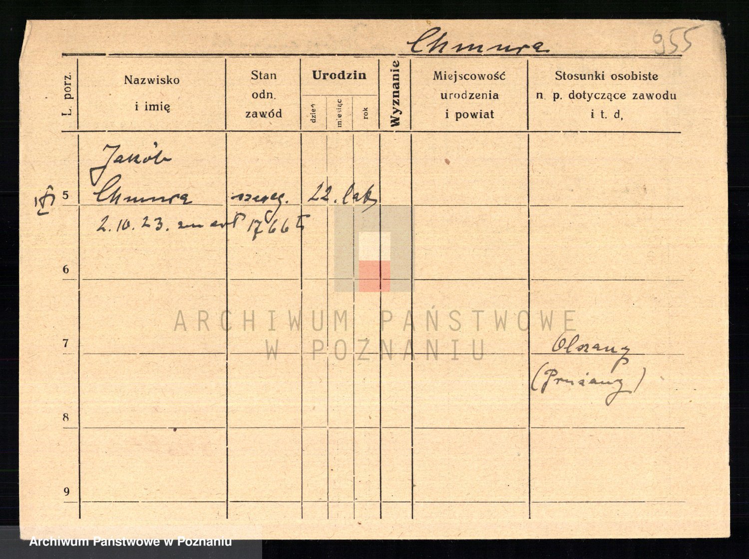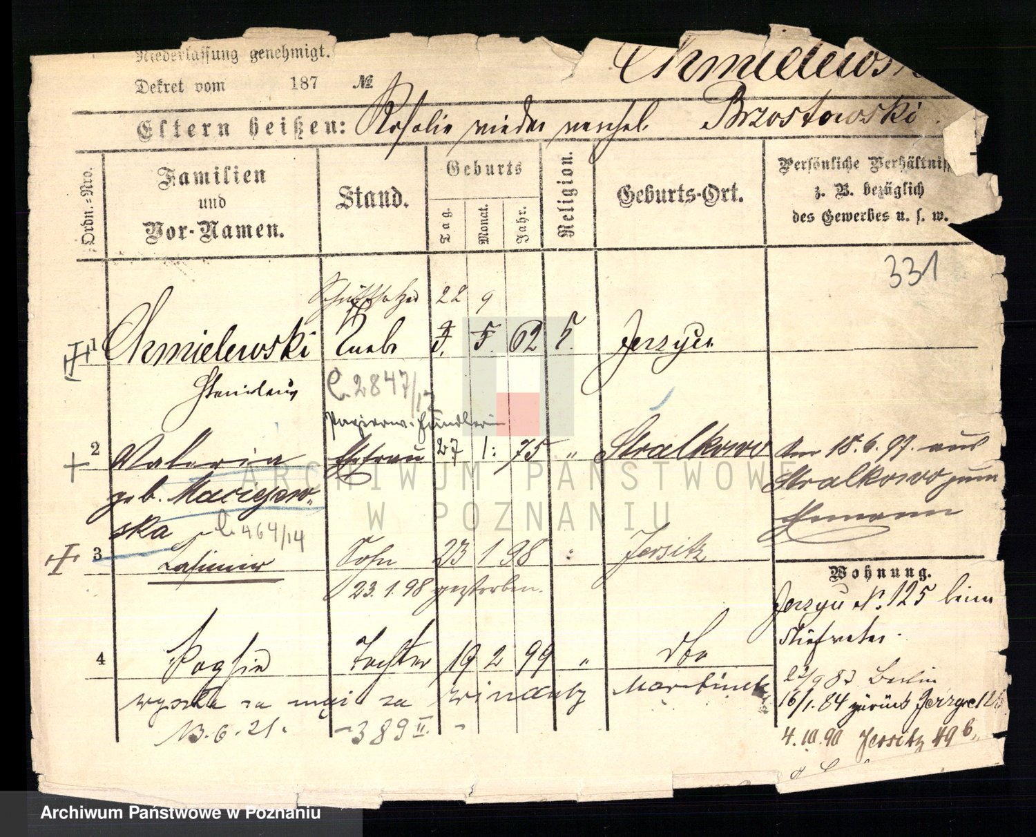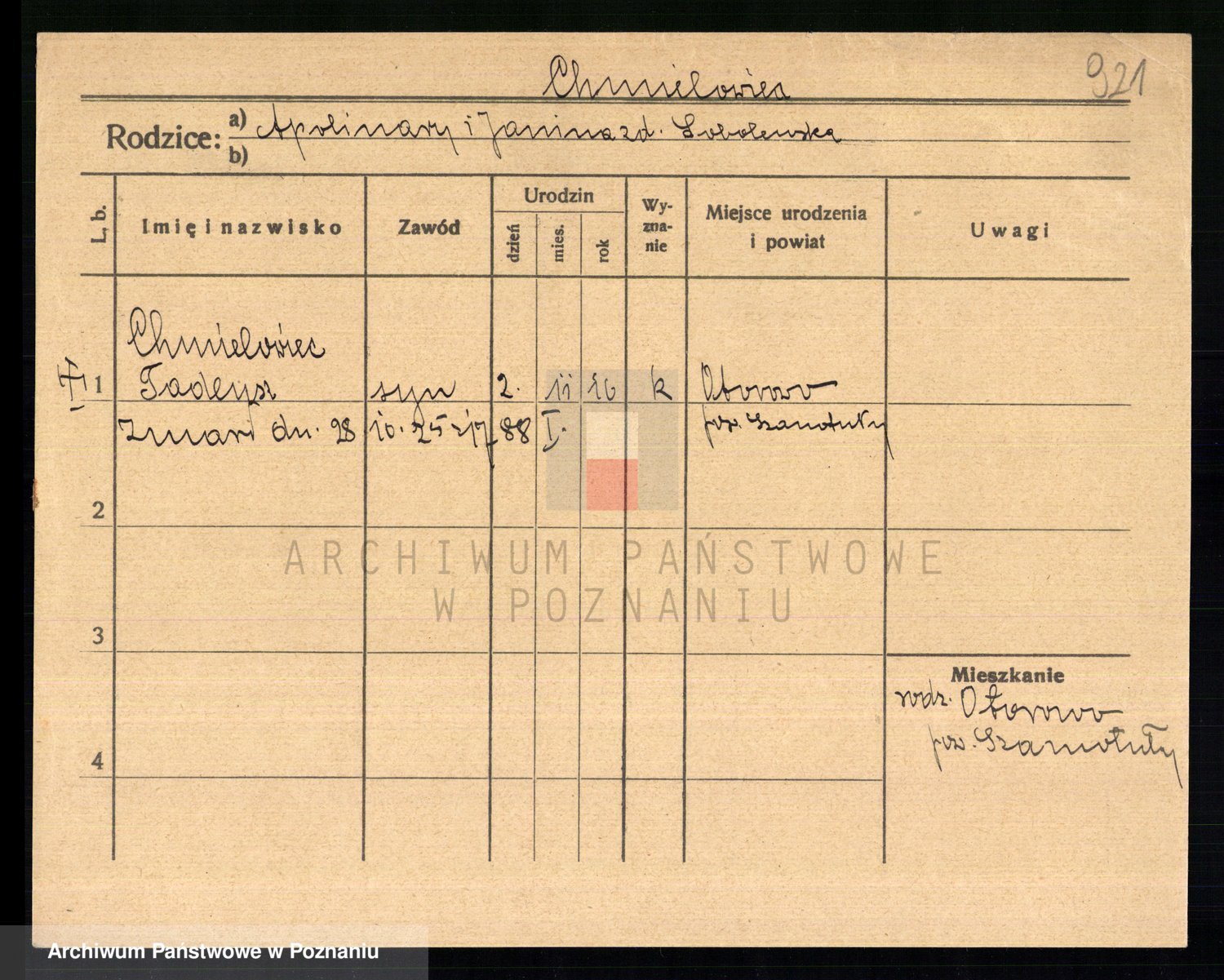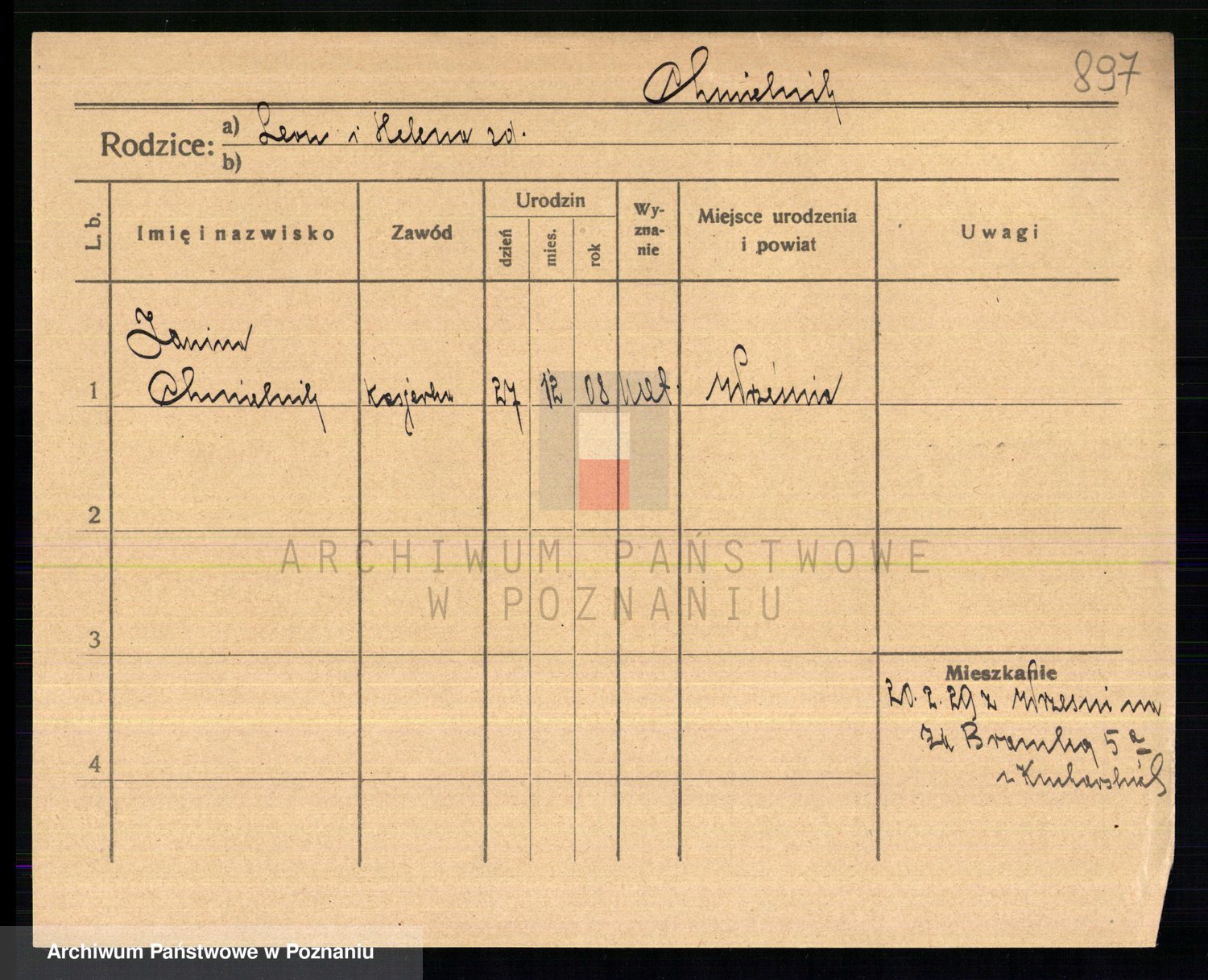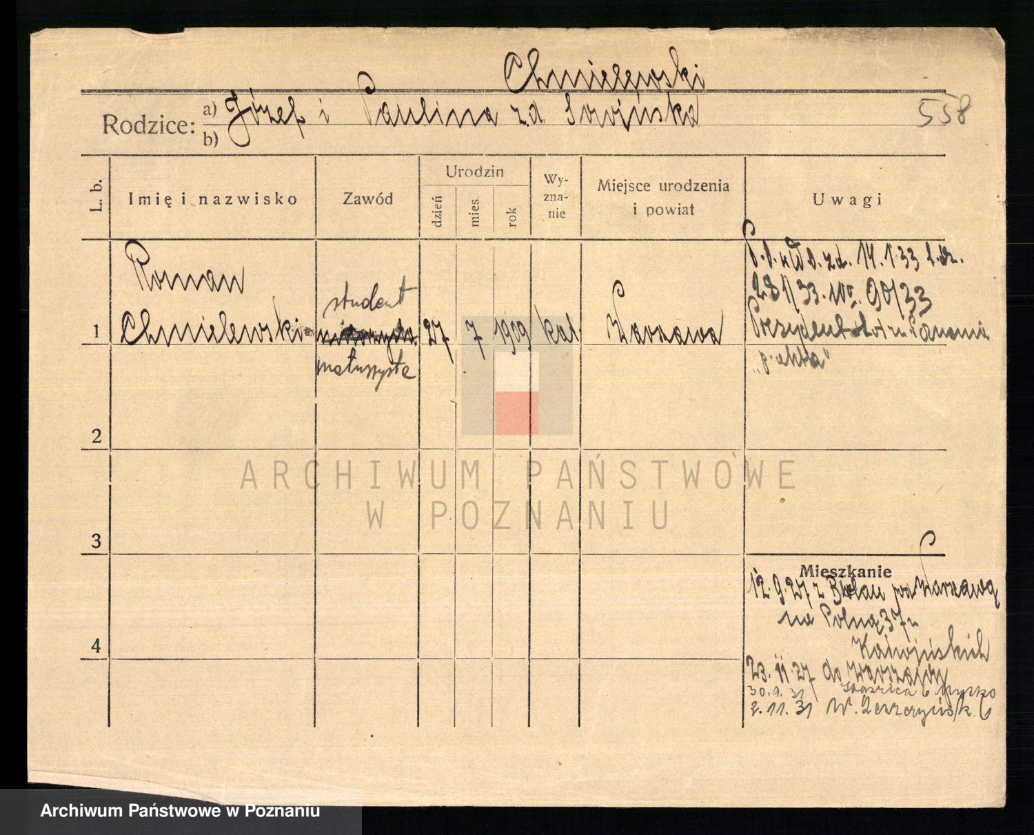 Podgląd karty osobowej dostępny jest po kliknięciu na nazwisko lub ikonkę karty. Można dokonywać powiększenia (ikony na górze) lub przechodzić między kolejnymi skanami (strzałki po bokach).