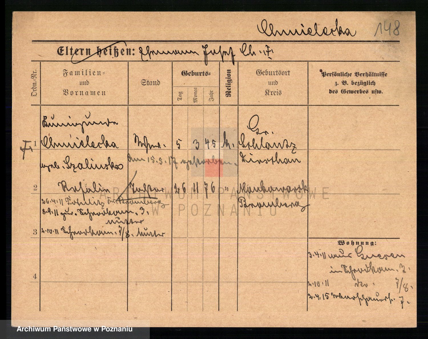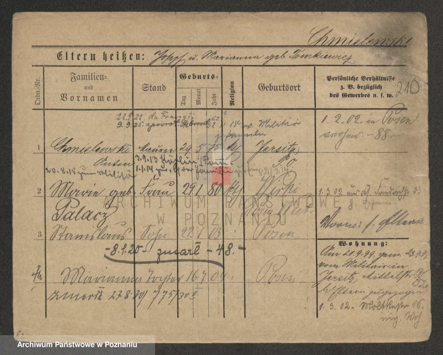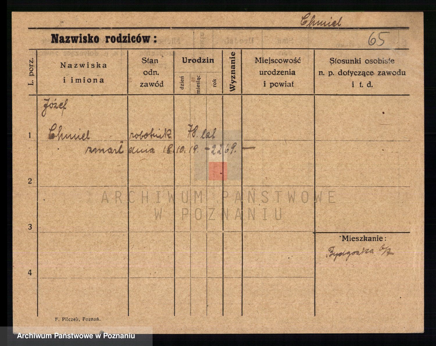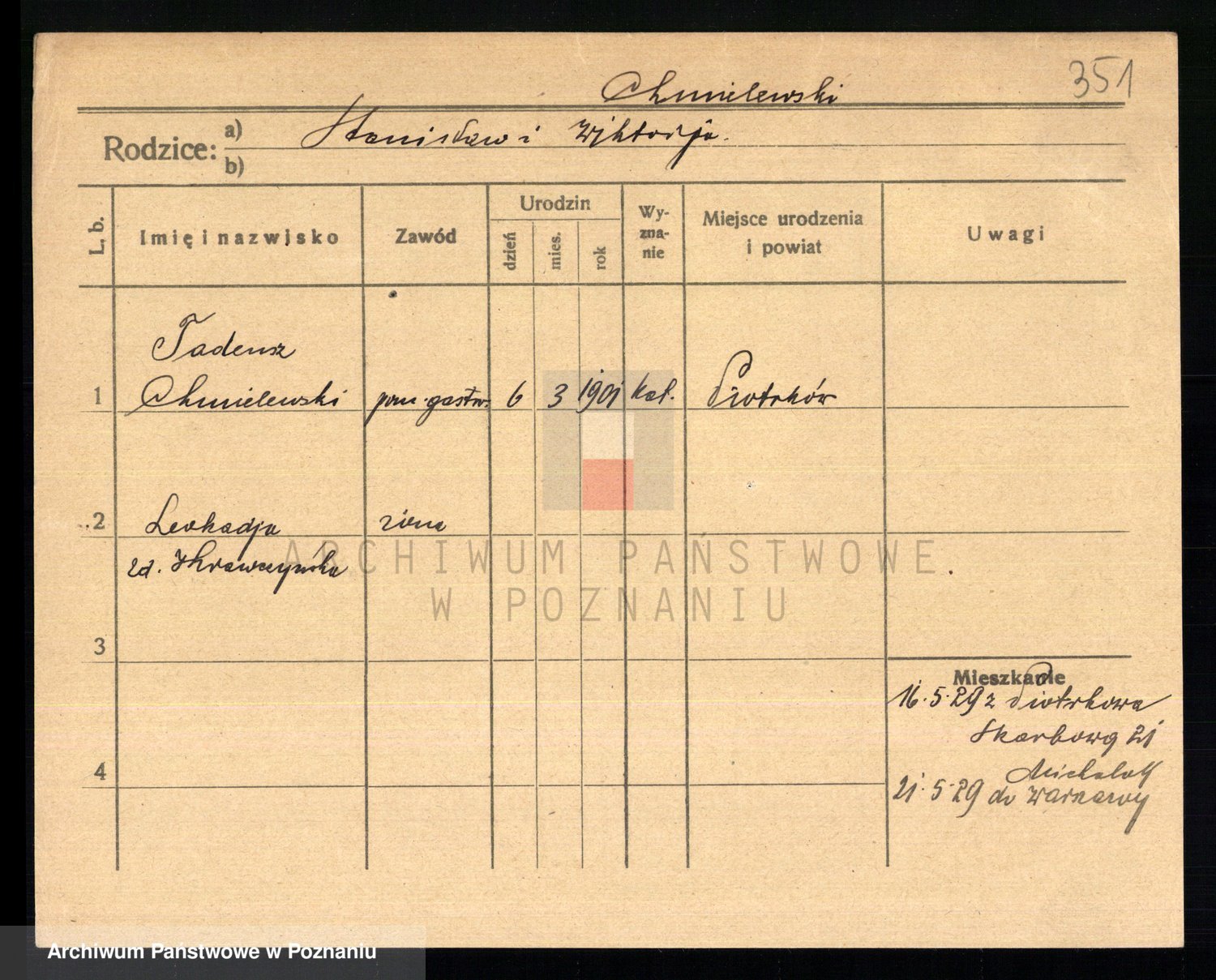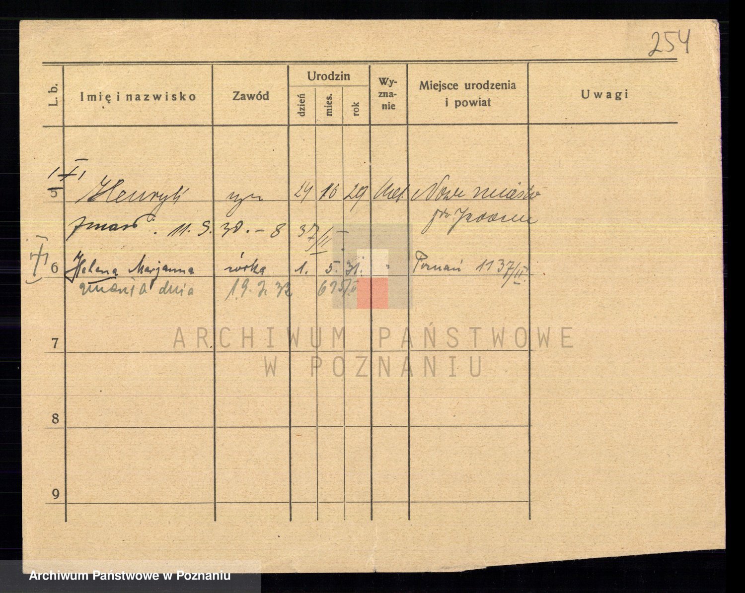 Podgląd karty osobowej dostępny jest po kliknięciu na nazwisko lub ikonkę karty. Można dokonywać powiększenia (ikony na górze) lub przechodzić między kolejnymi skanami (strzałki po bokach).