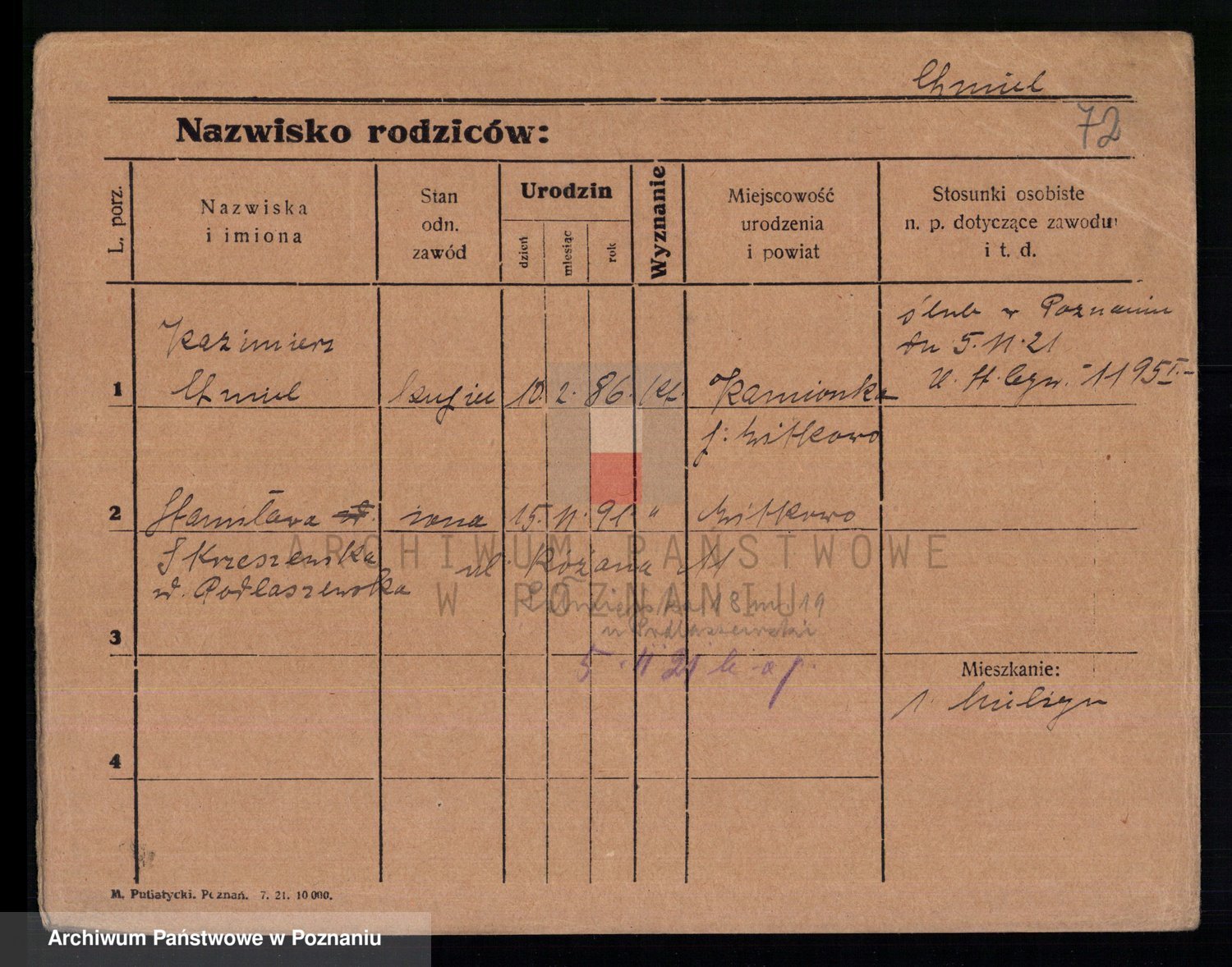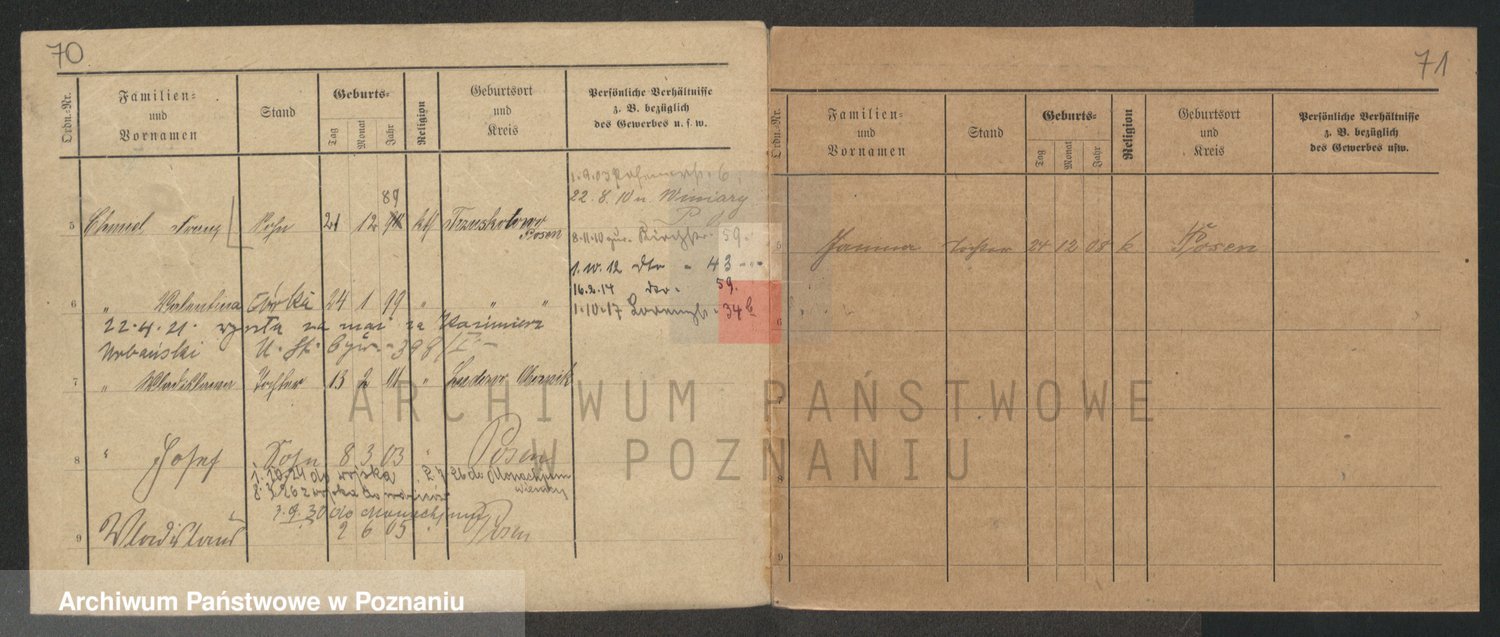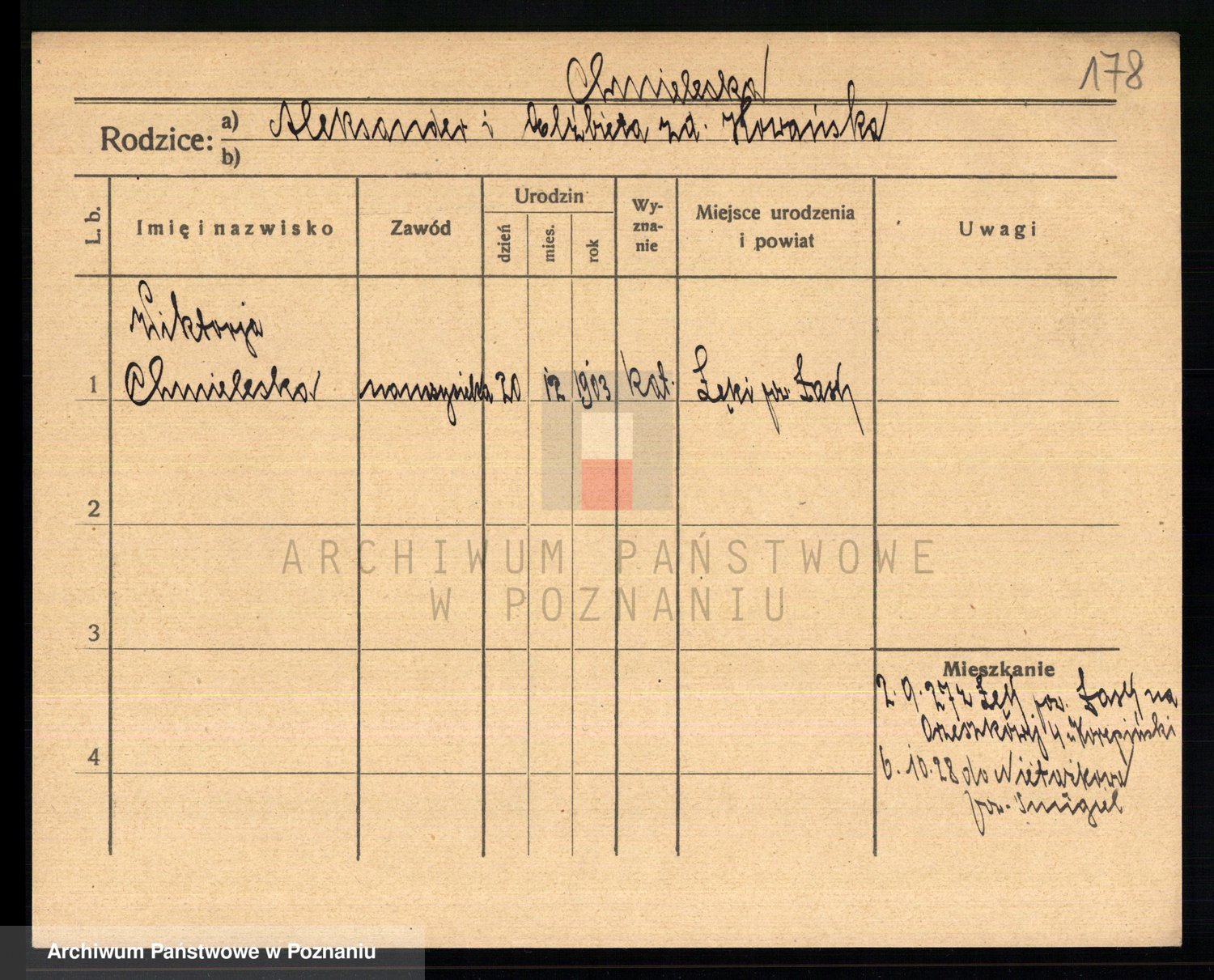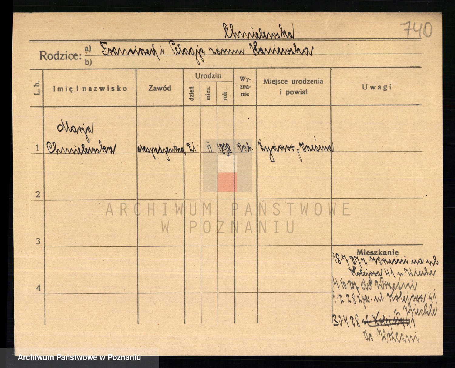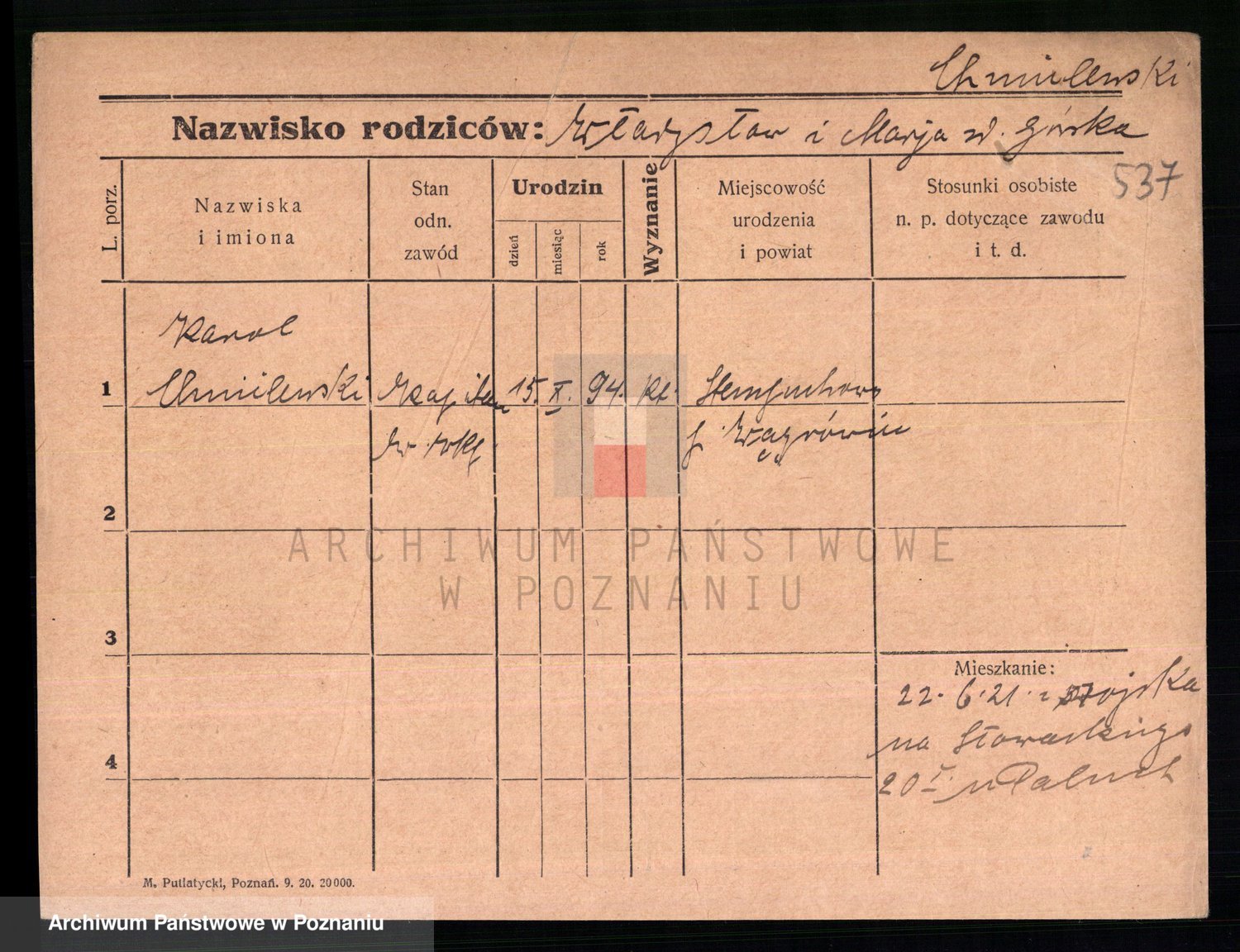 Podgląd karty osobowej dostępny jest po kliknięciu na nazwisko lub ikonkę karty. Można dokonywać powiększenia (ikony na górze) lub przechodzić między kolejnymi skanami (strzałki po bokach).