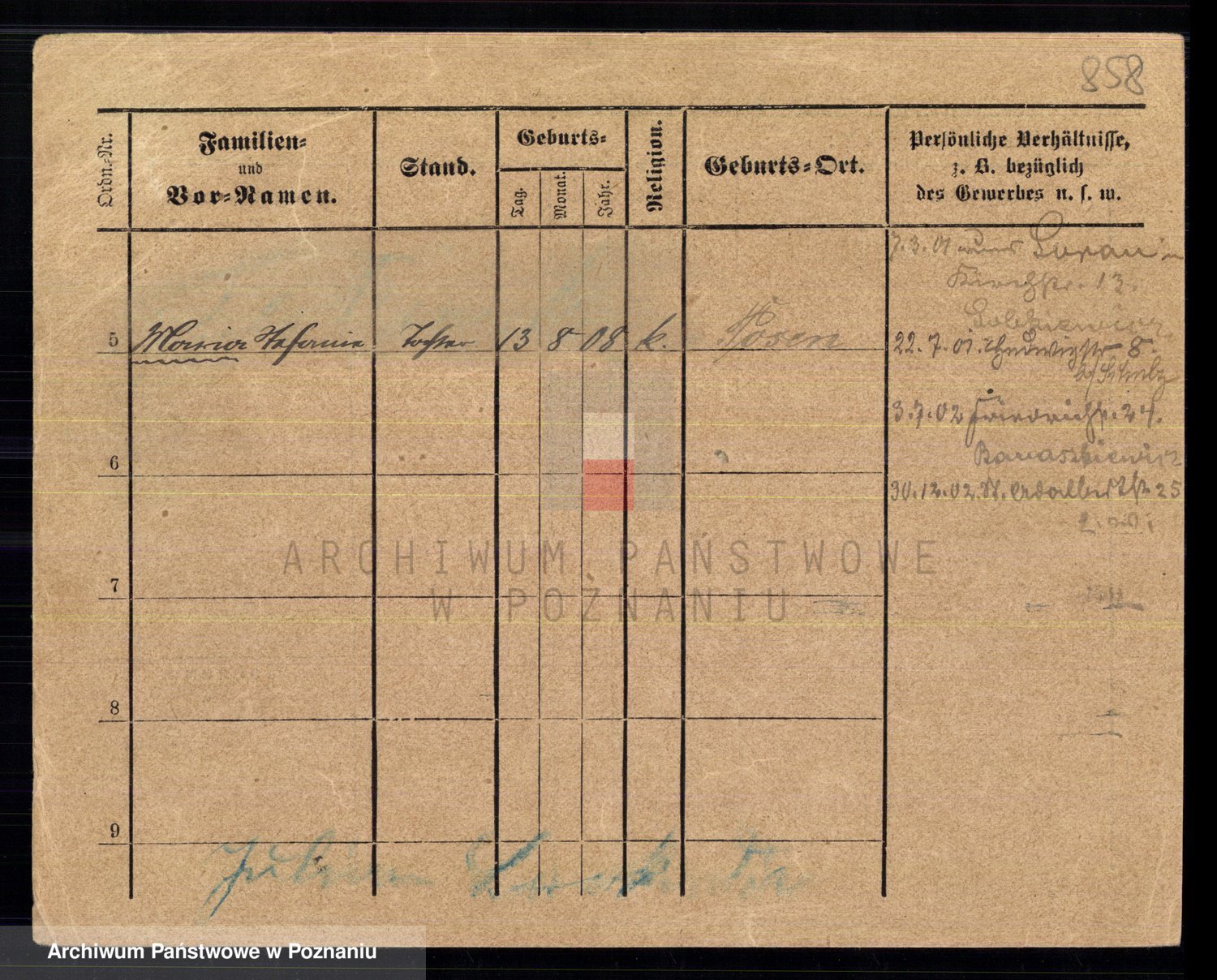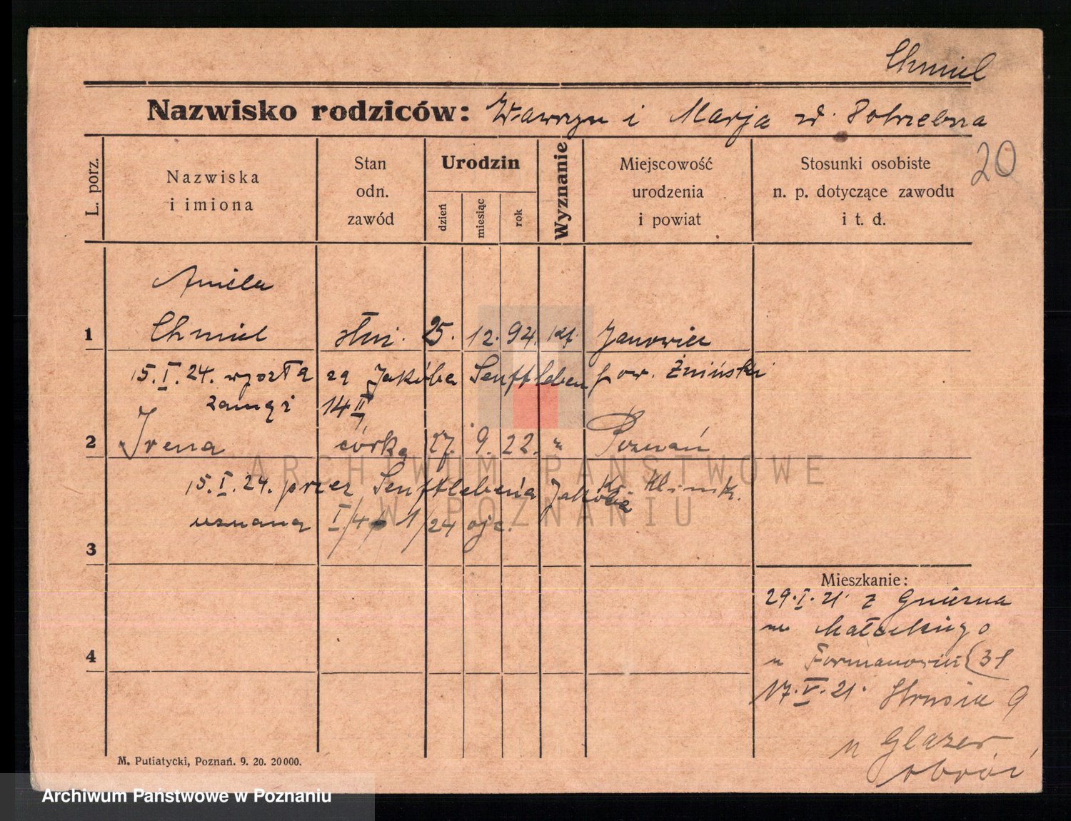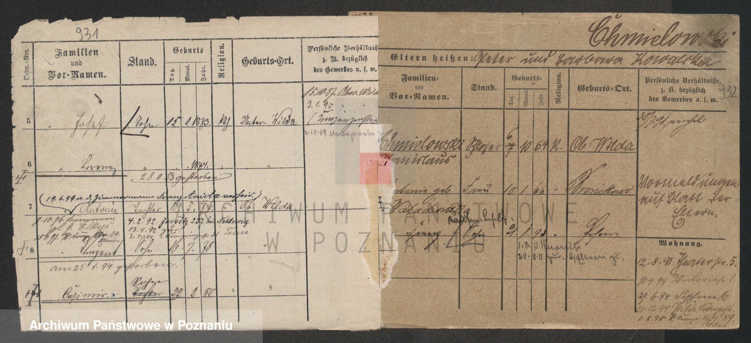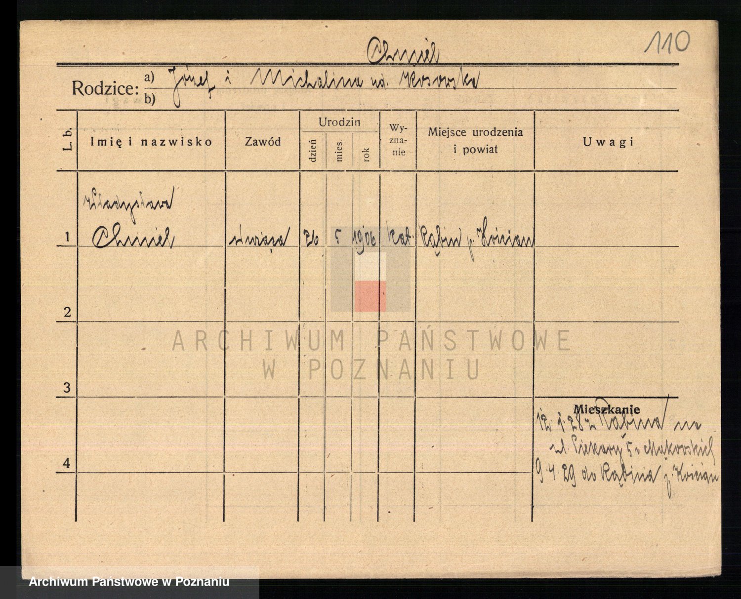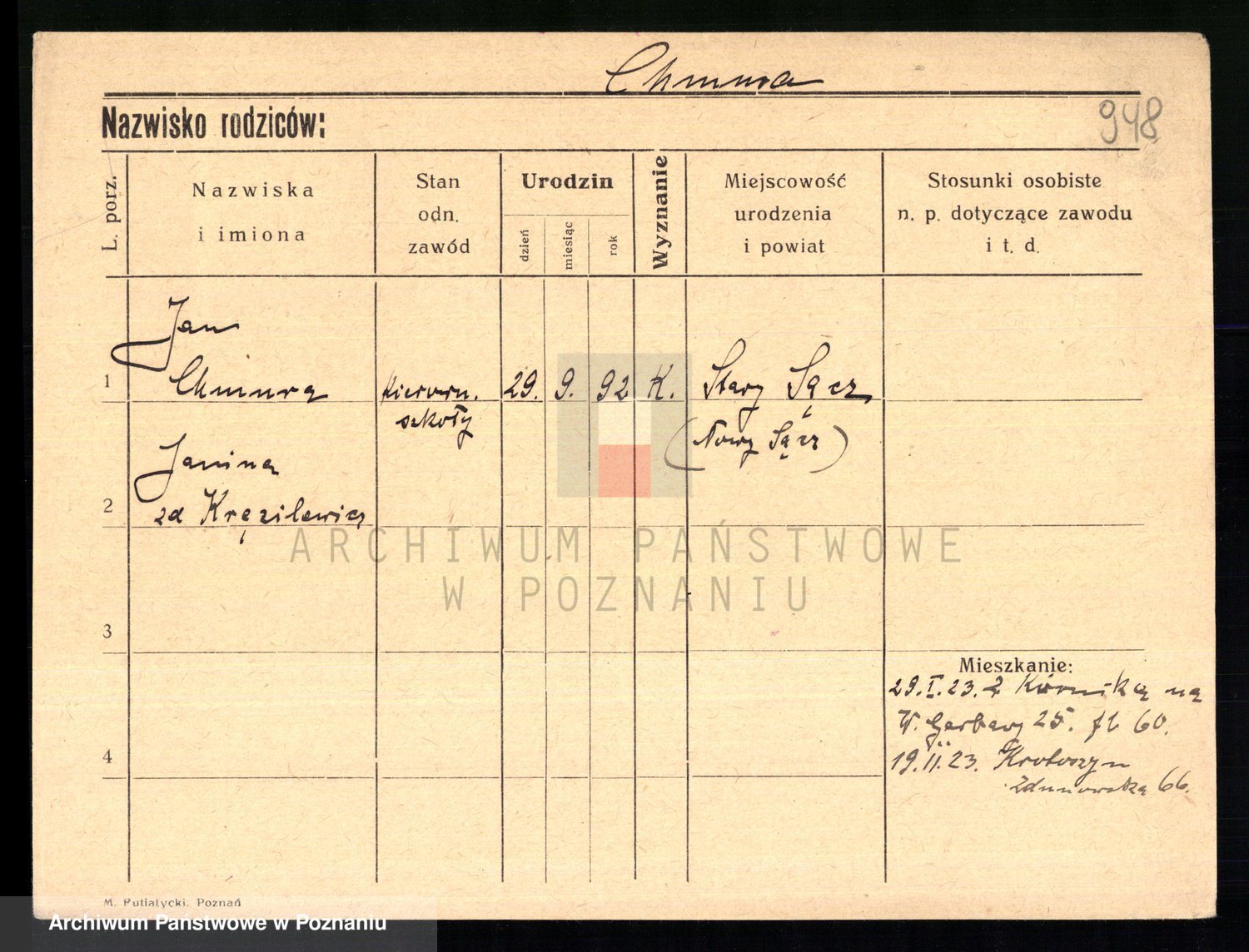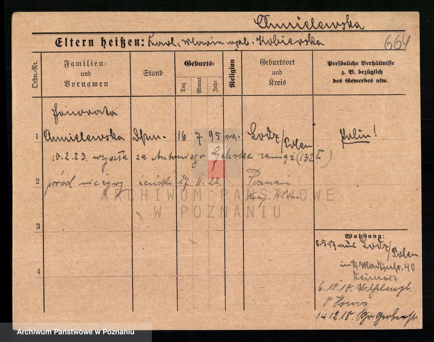 Podgląd karty osobowej dostępny jest po kliknięciu na nazwisko lub ikonkę karty. Można dokonywać powiększenia (ikony na górze) lub przechodzić między kolejnymi skanami (strzałki po bokach).