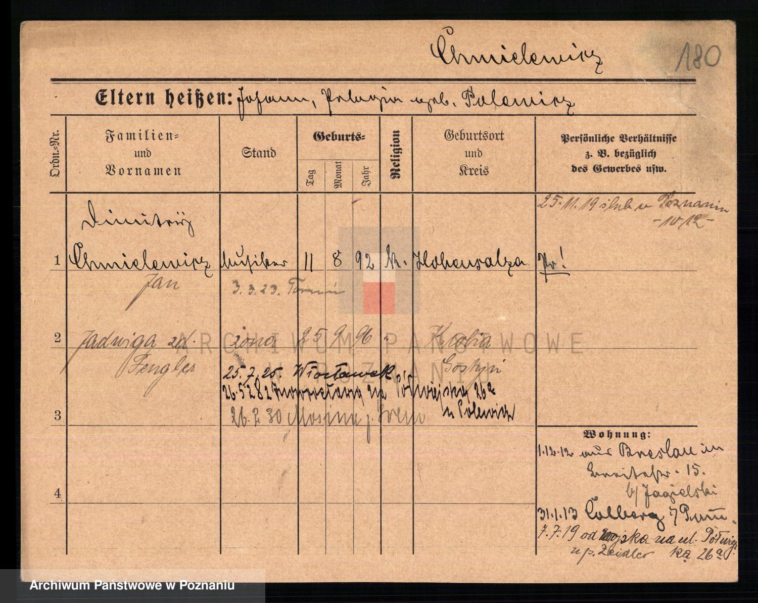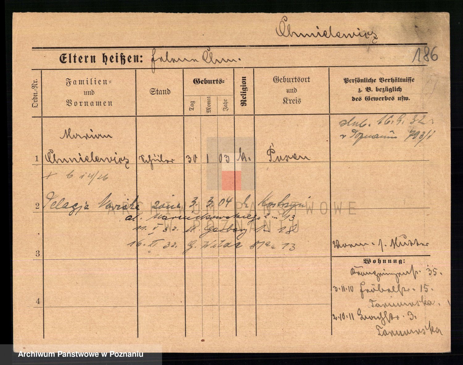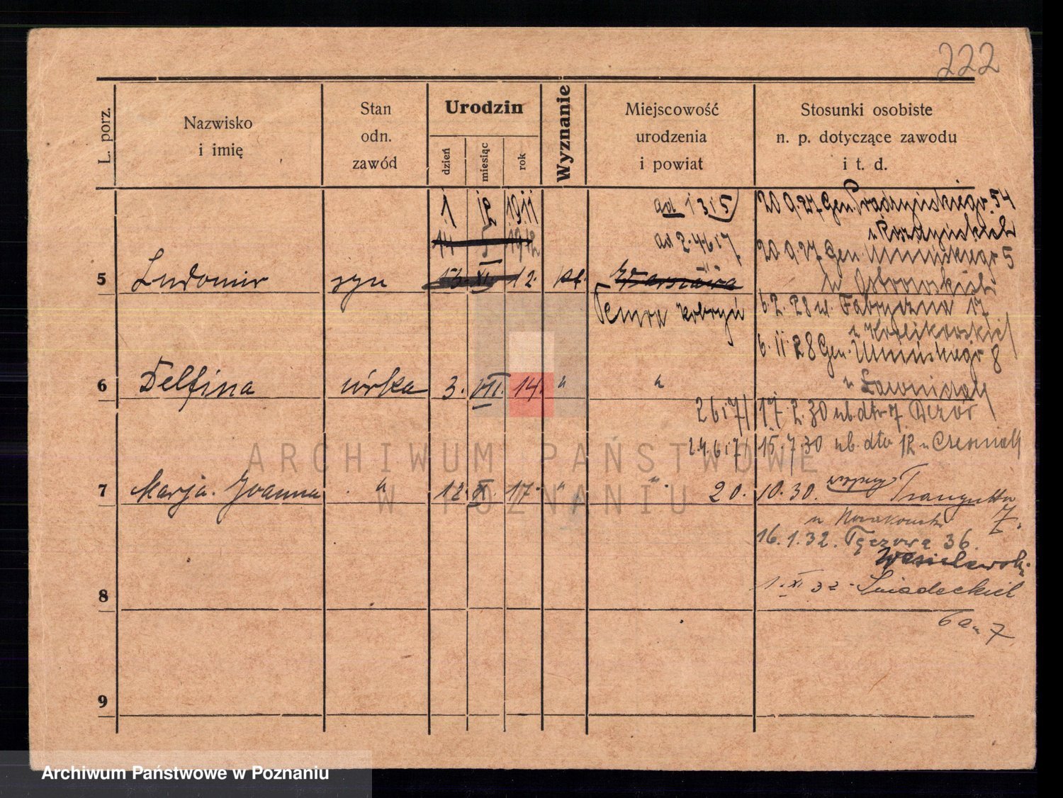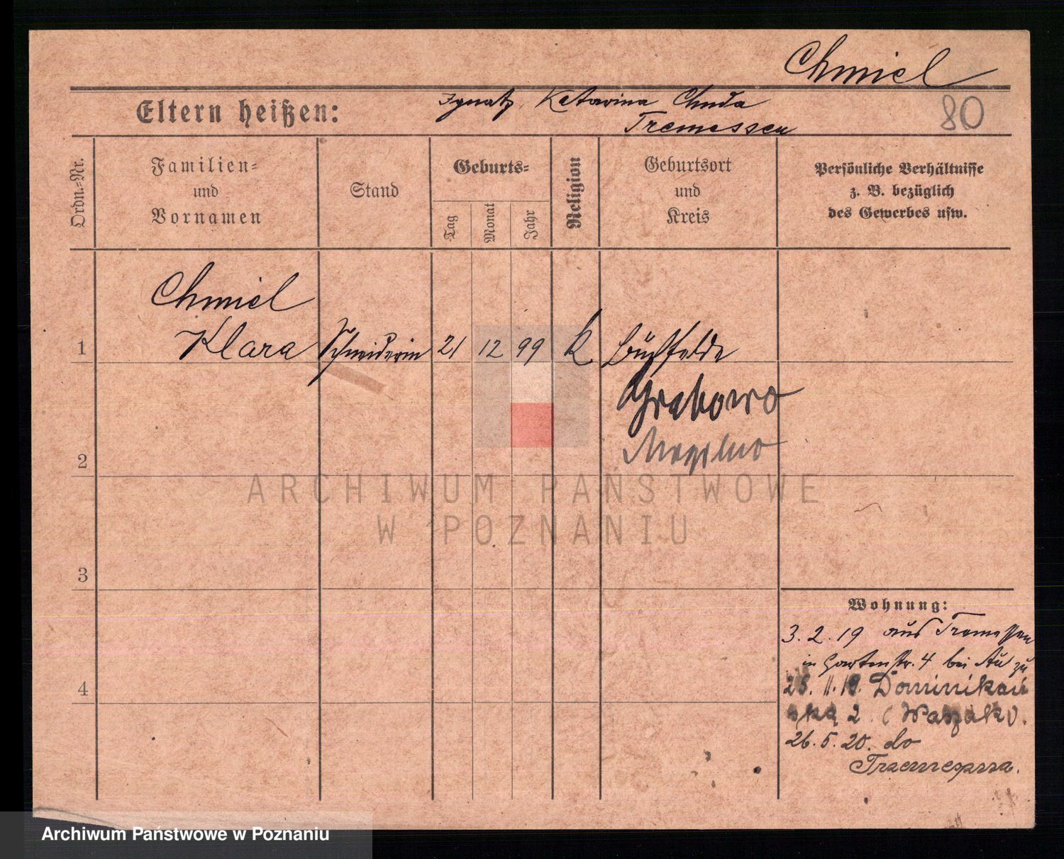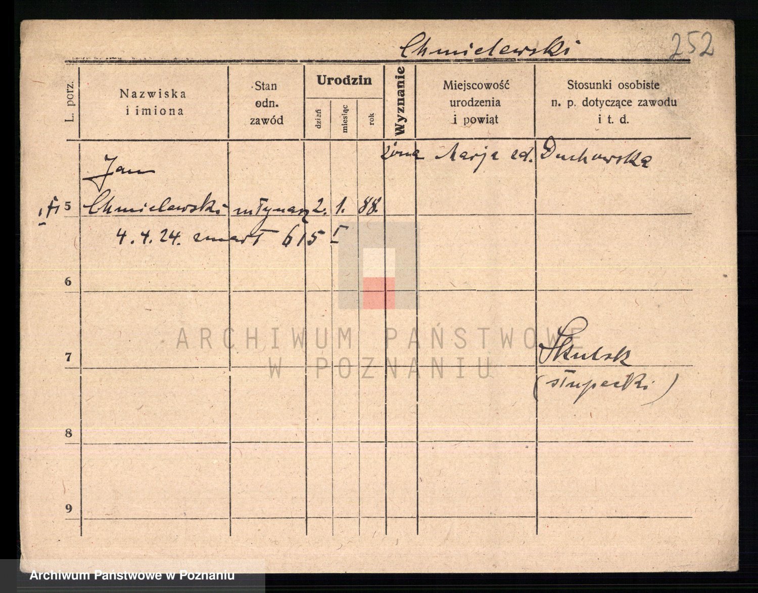 Podgląd karty osobowej dostępny jest po kliknięciu na nazwisko lub ikonkę karty. Można dokonywać powiększenia (ikony na górze) lub przechodzić między kolejnymi skanami (strzałki po bokach).