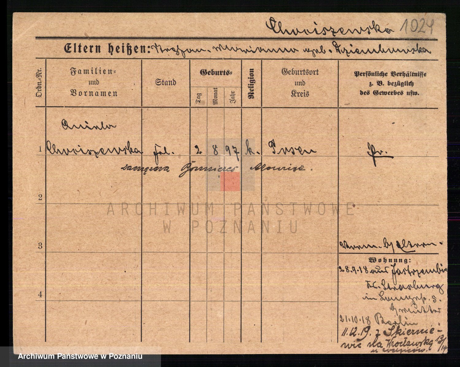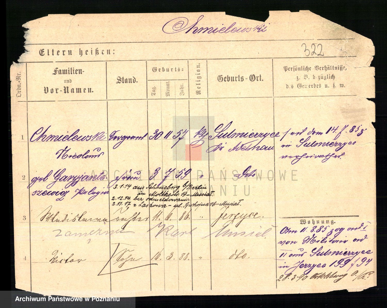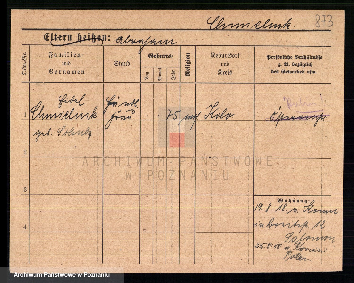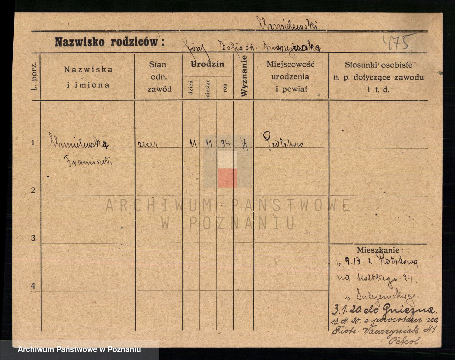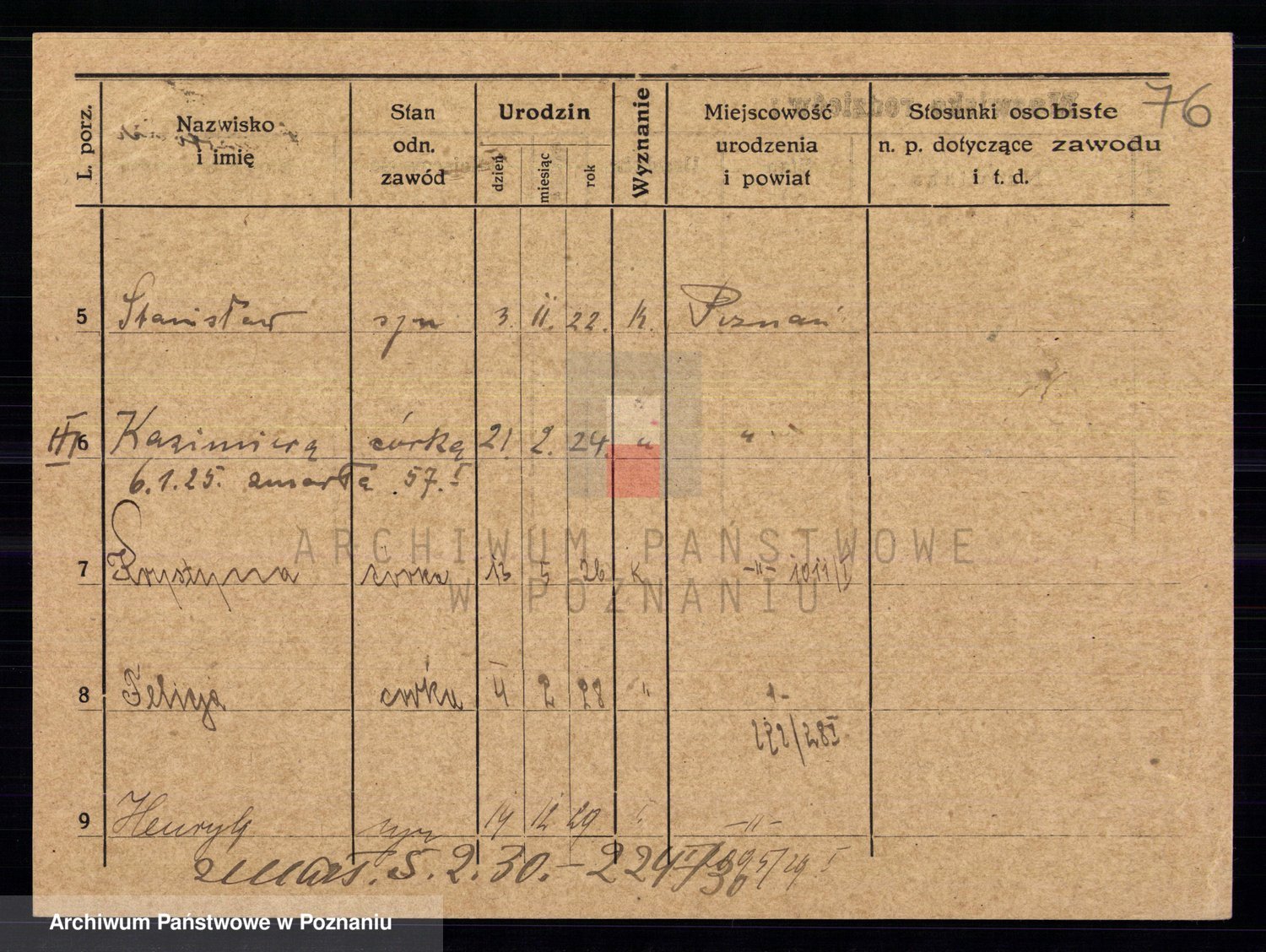 Podgląd karty osobowej dostępny jest po kliknięciu na nazwisko lub ikonkę karty. Można dokonywać powiększenia (ikony na górze) lub przechodzić między kolejnymi skanami (strzałki po bokach).