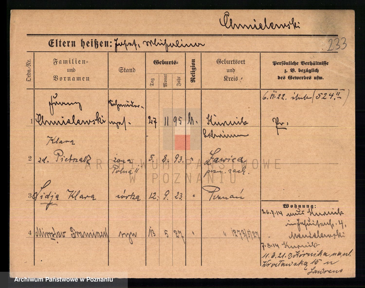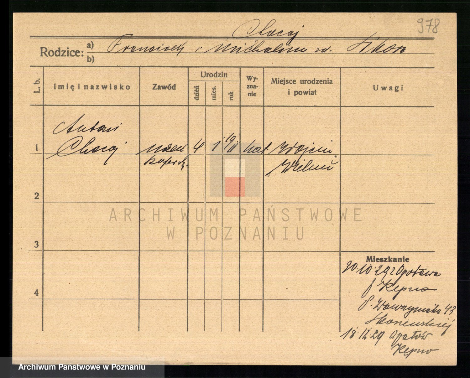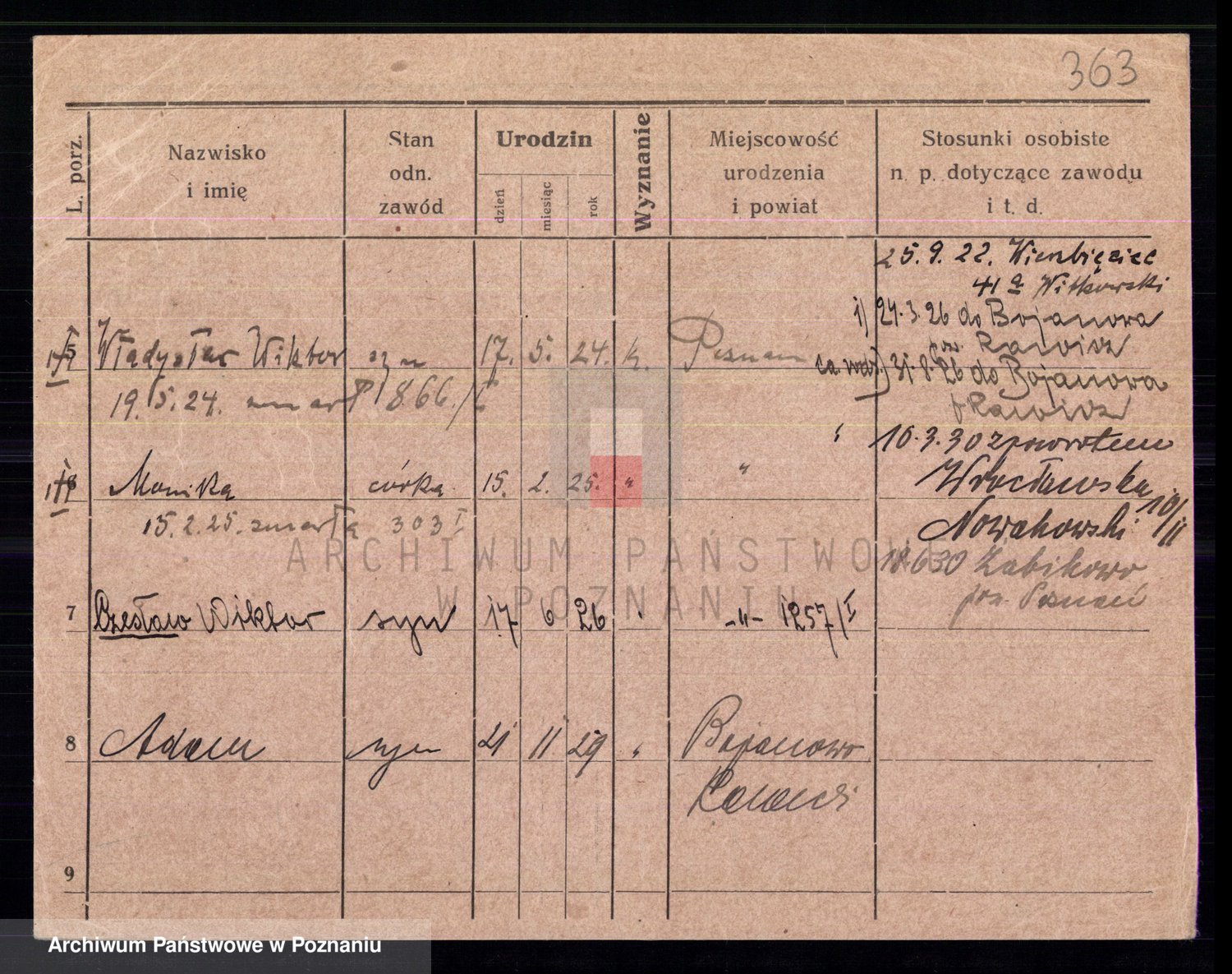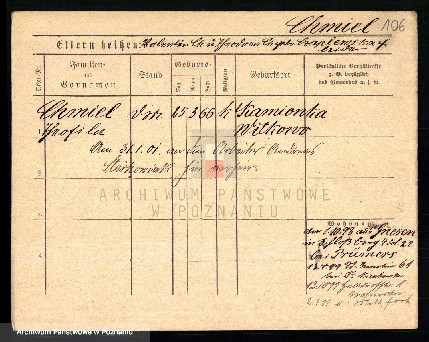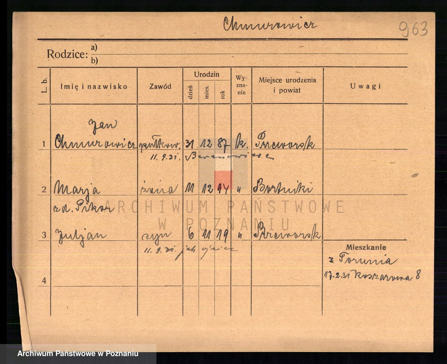 Podgląd karty osobowej dostępny jest po kliknięciu na nazwisko lub ikonkę karty. Można dokonywać powiększenia (ikony na górze) lub przechodzić między kolejnymi skanami (strzałki po bokach).