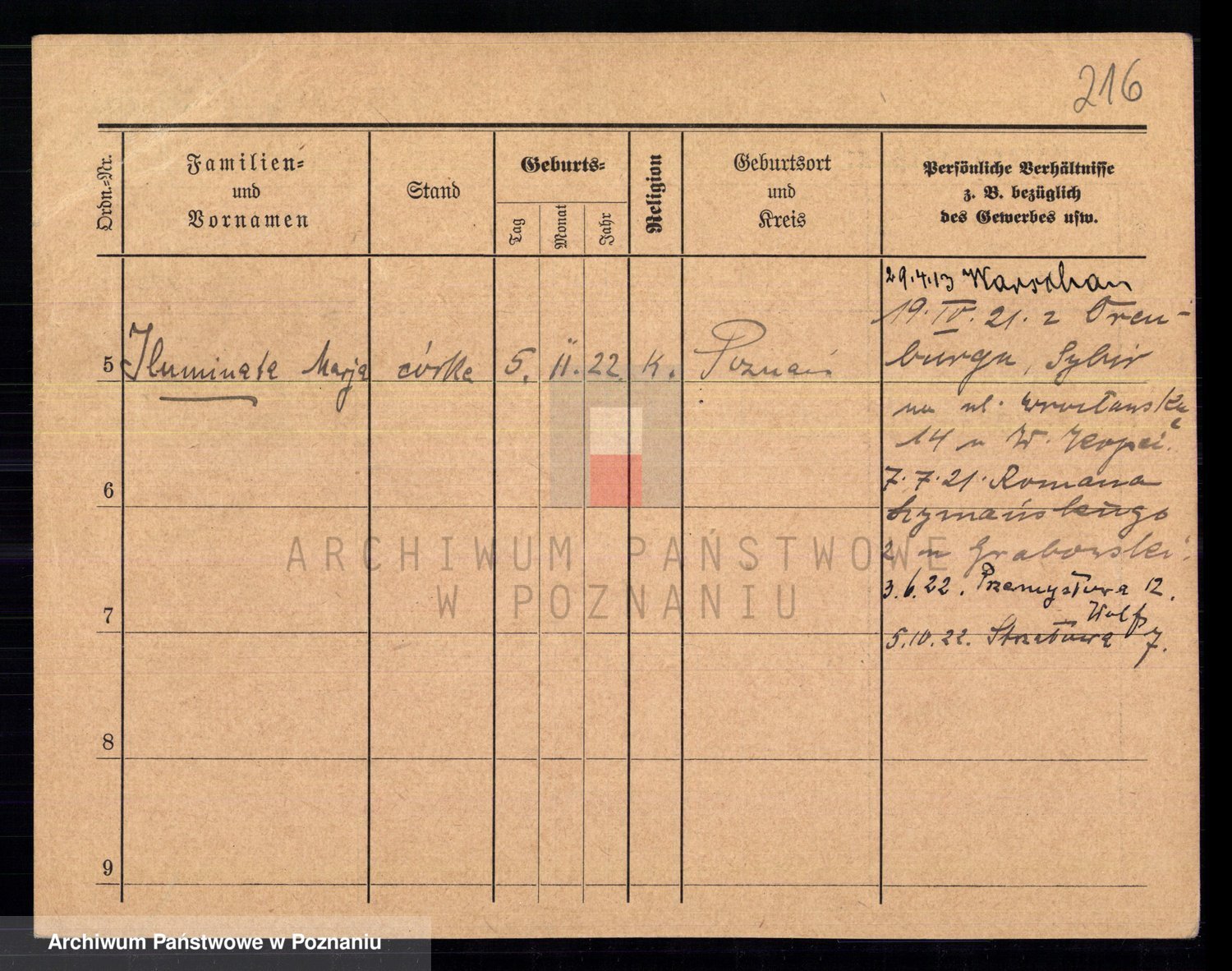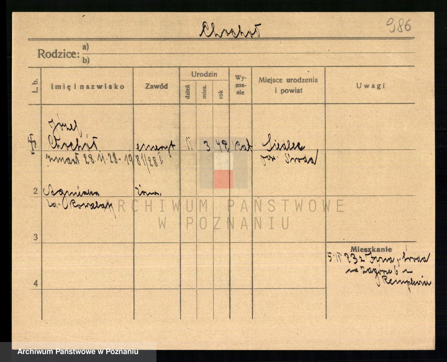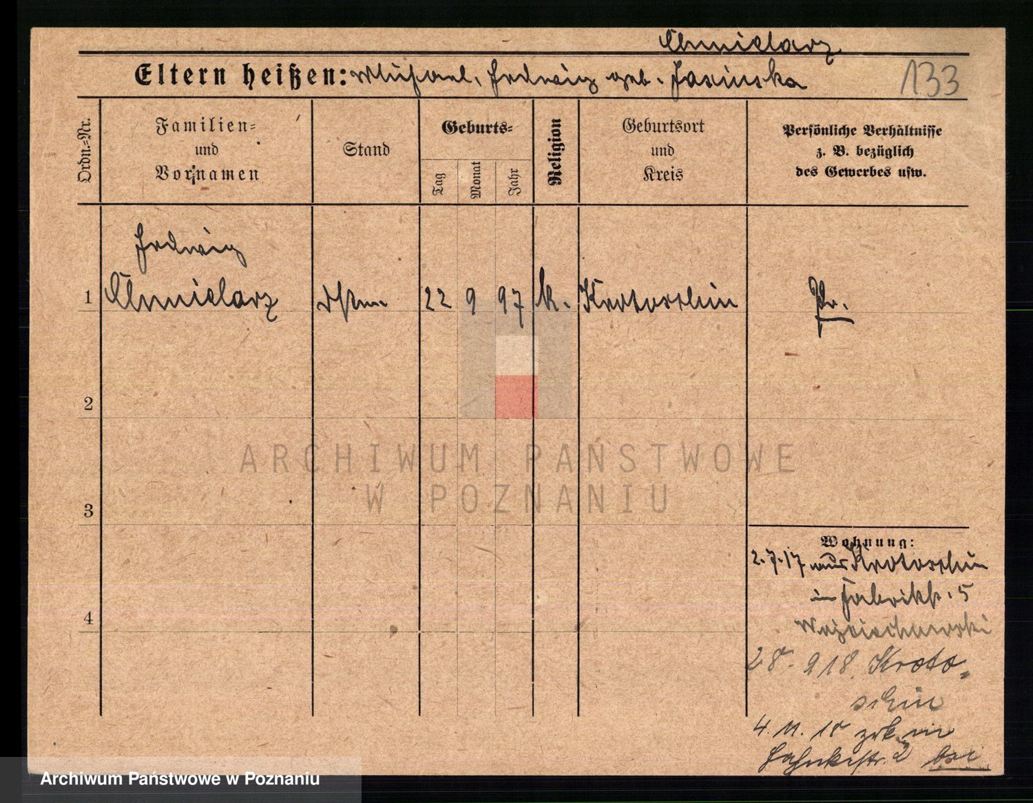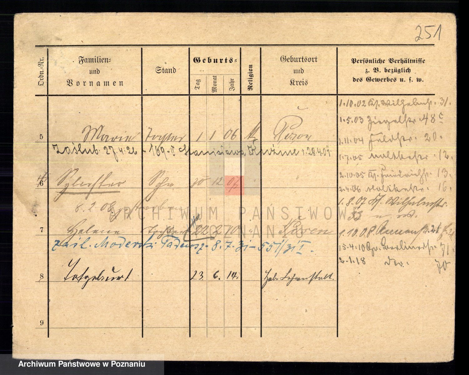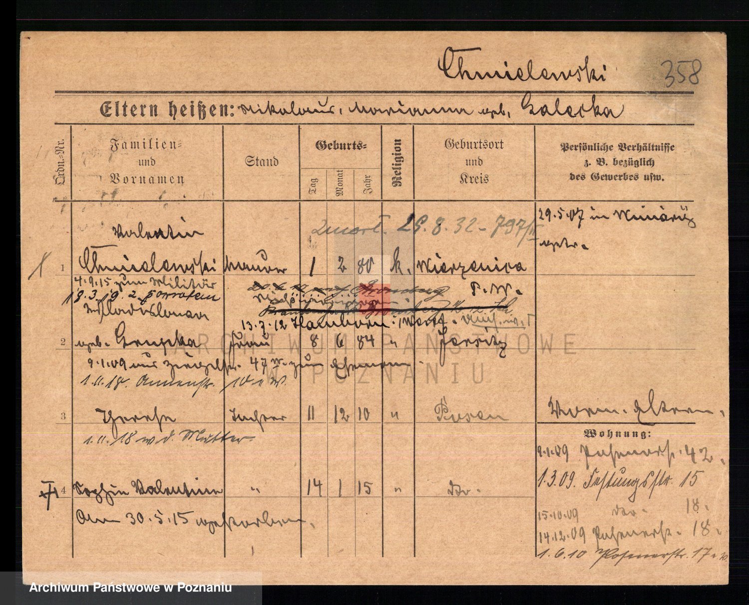 Podgląd karty osobowej dostępny jest po kliknięciu na nazwisko lub ikonkę karty. Można dokonywać powiększenia (ikony na górze) lub przechodzić między kolejnymi skanami (strzałki po bokach).