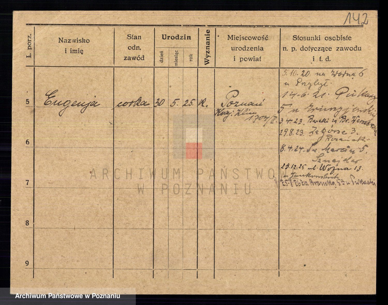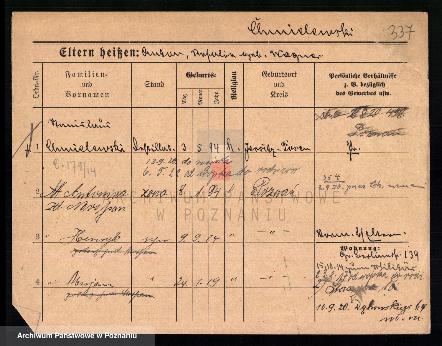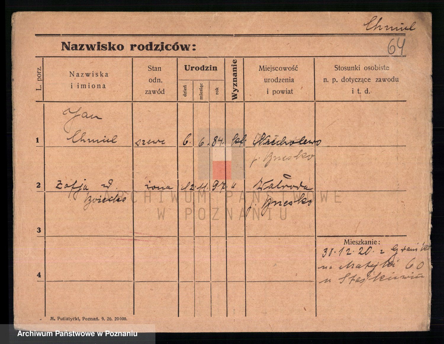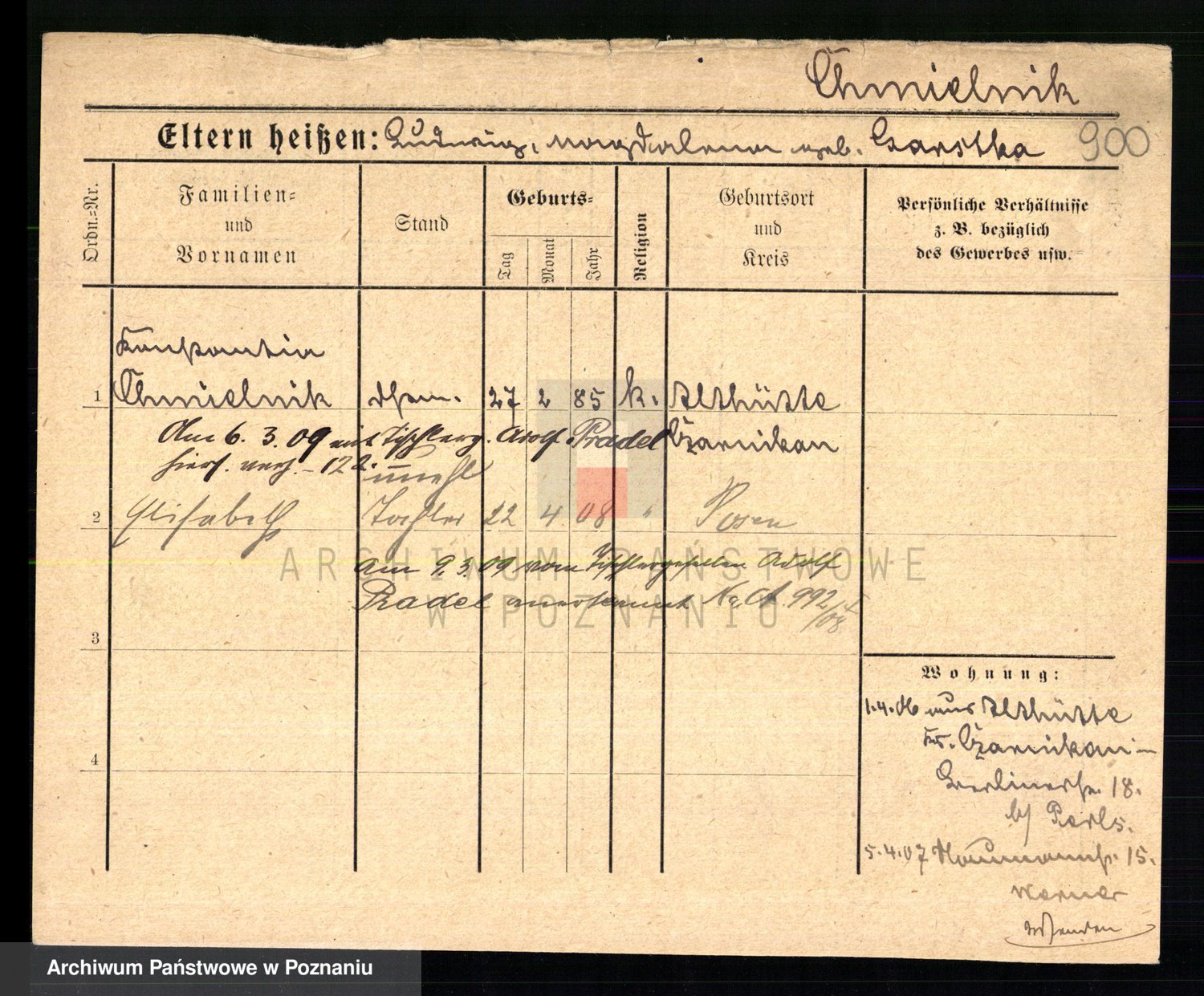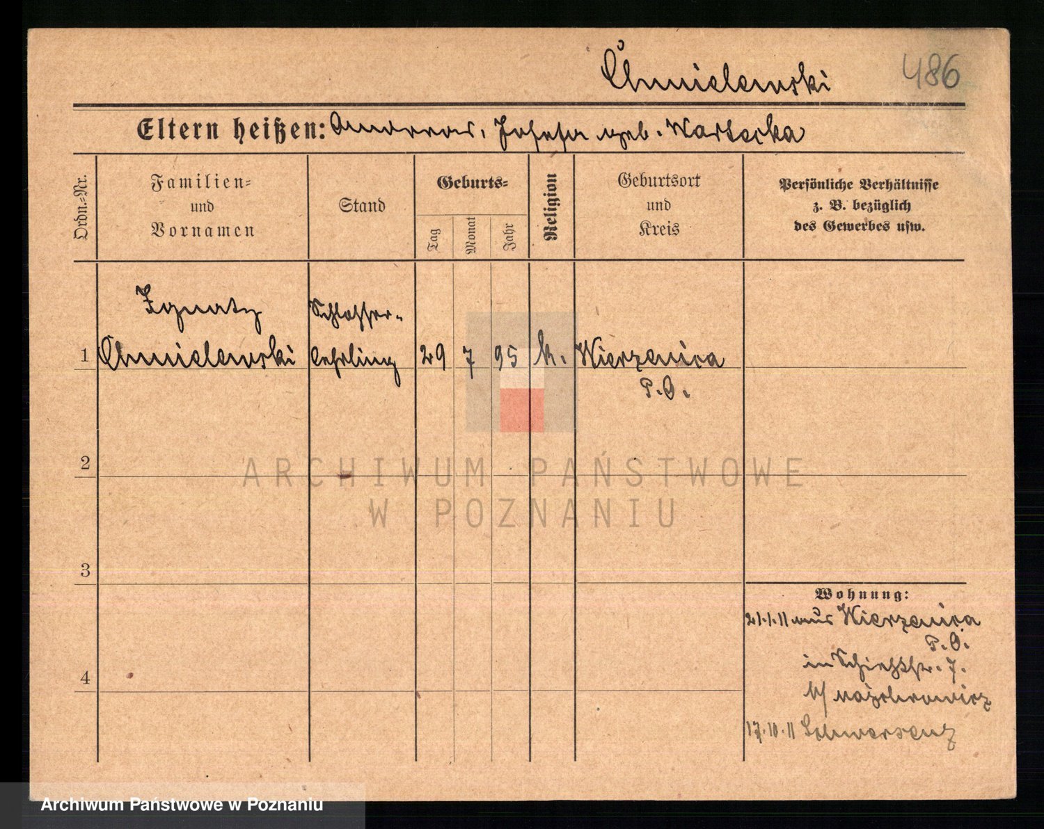 Podgląd karty osobowej dostępny jest po kliknięciu na nazwisko lub ikonkę karty. Można dokonywać powiększenia (ikony na górze) lub przechodzić między kolejnymi skanami (strzałki po bokach).