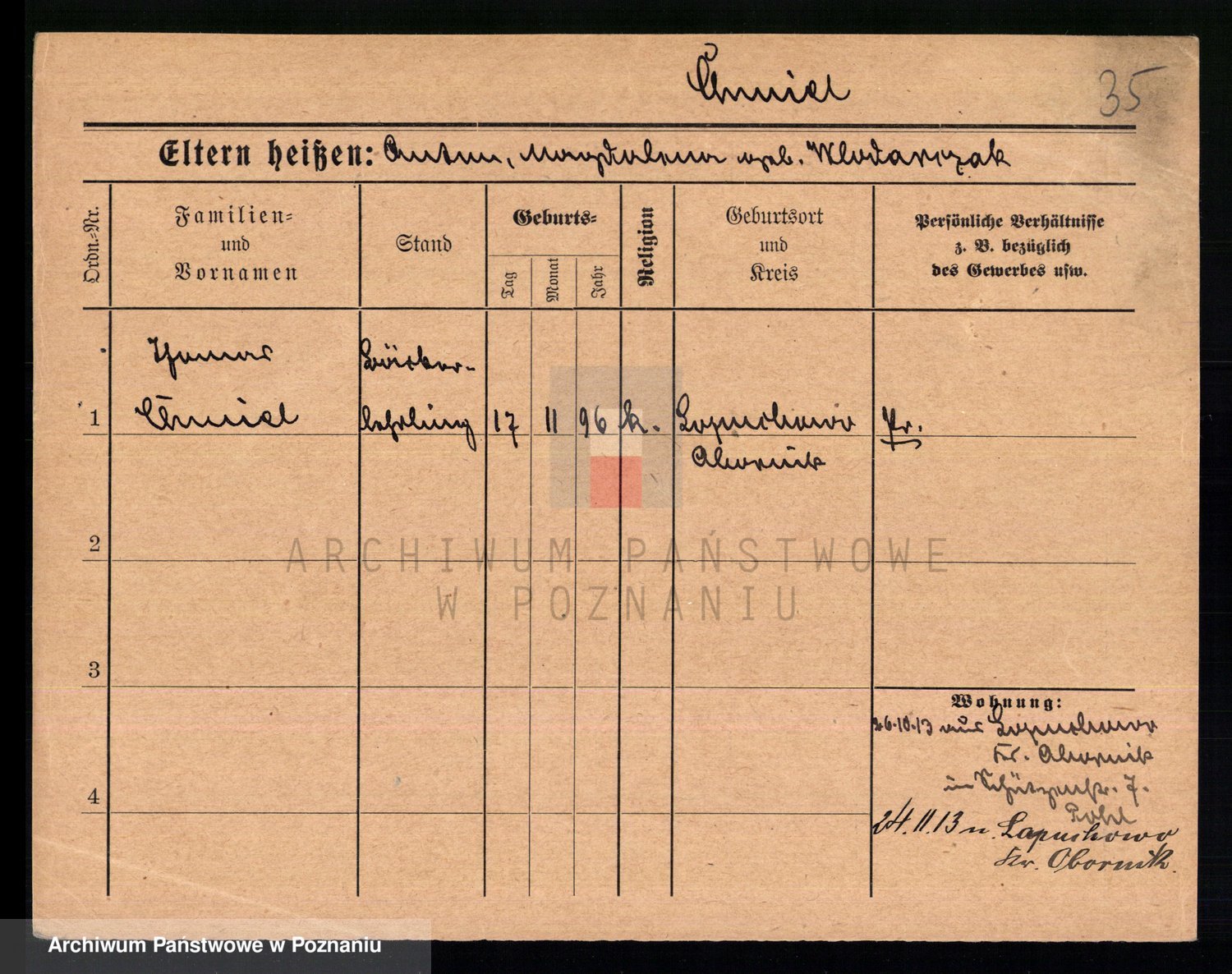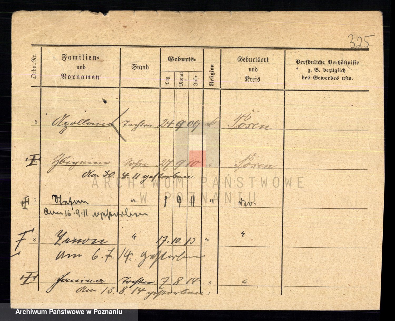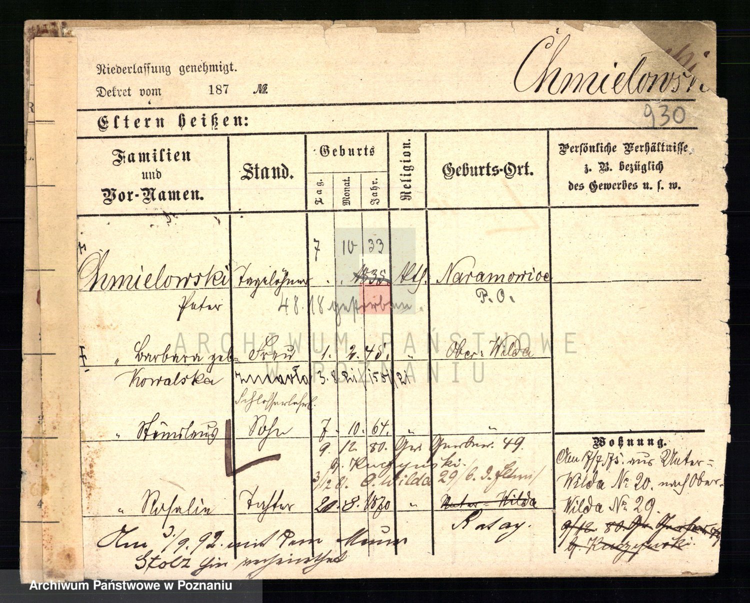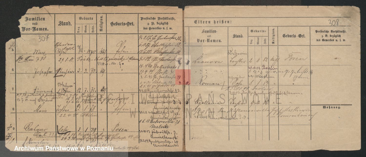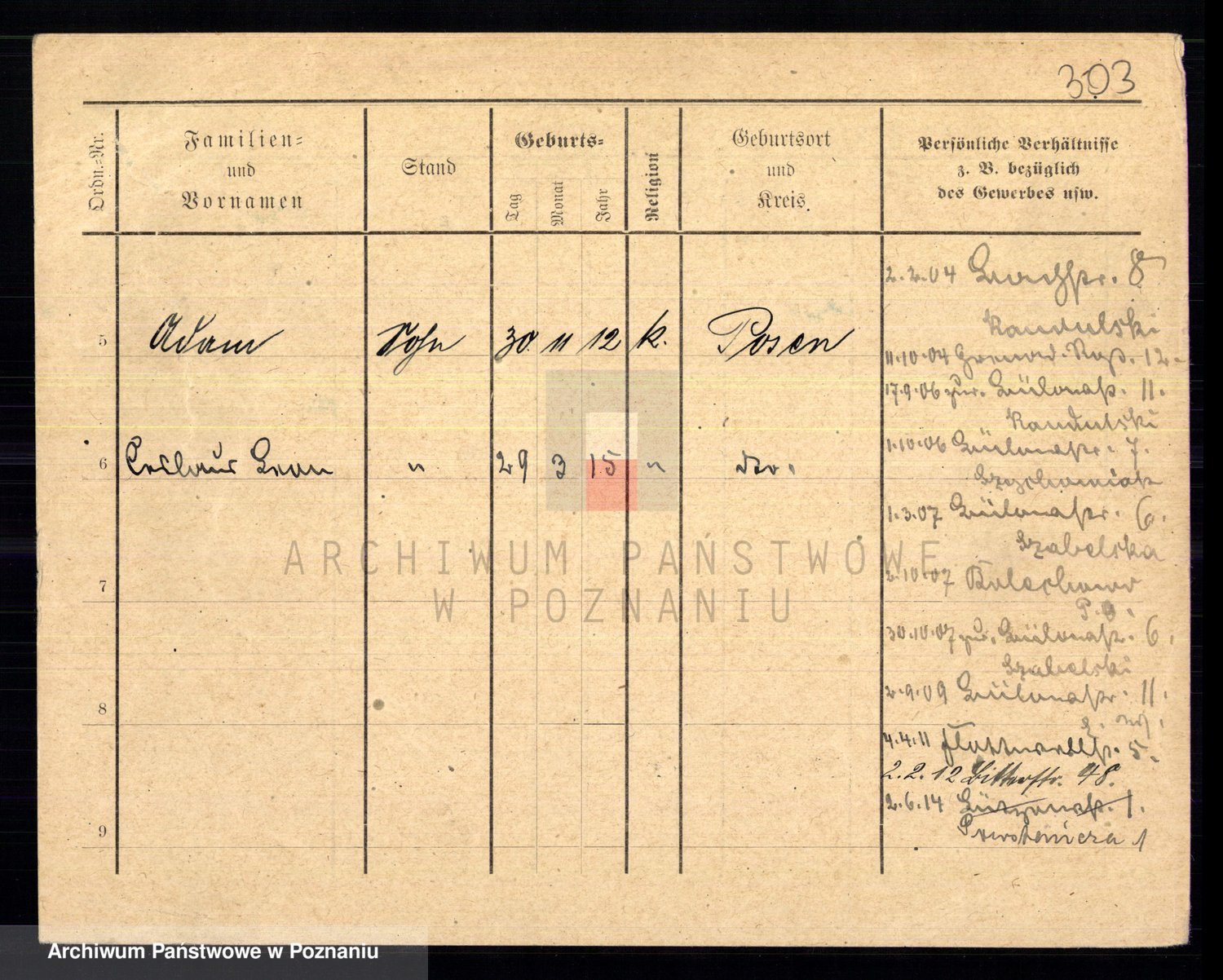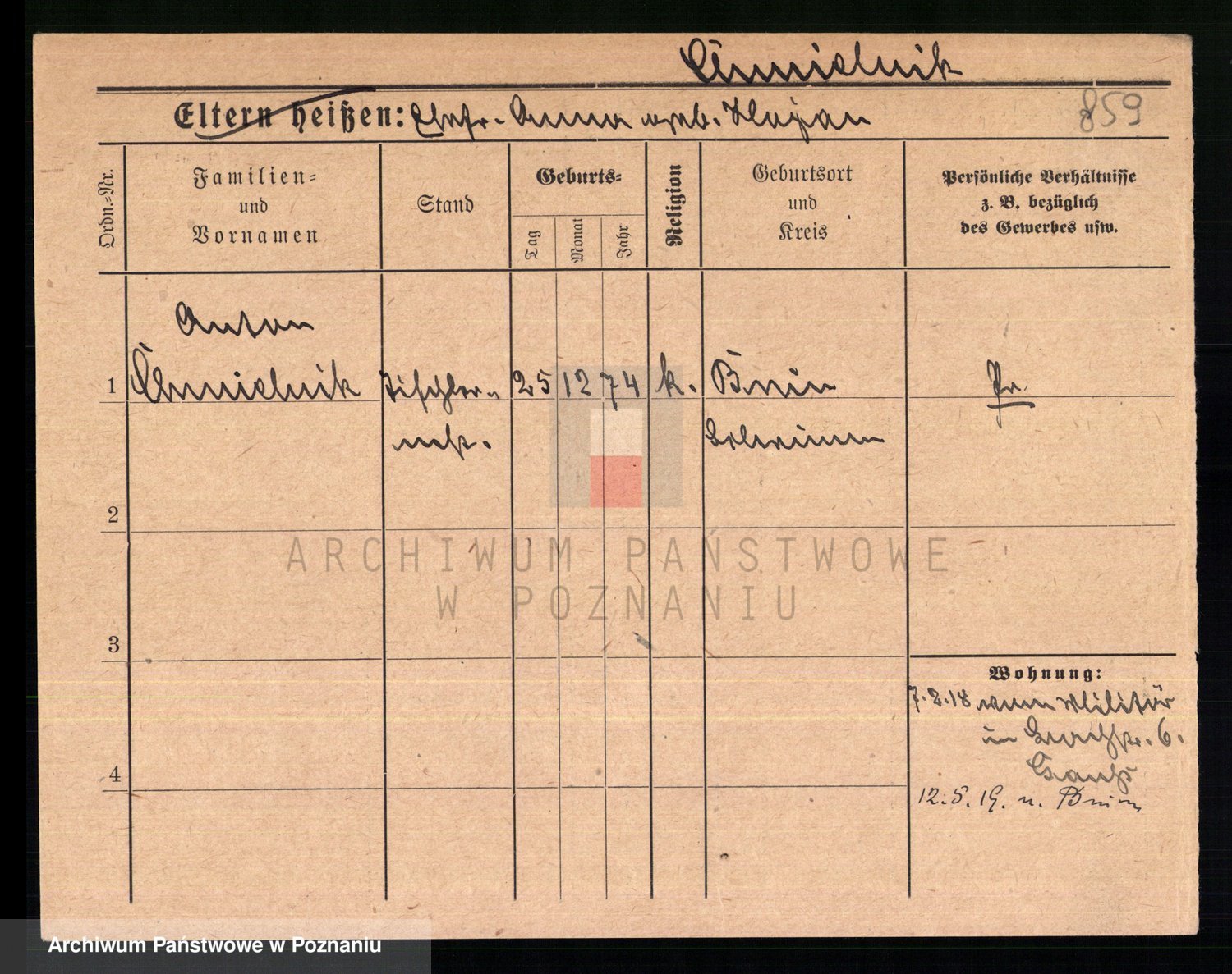 Podgląd karty osobowej dostępny jest po kliknięciu na nazwisko lub ikonkę karty. Można dokonywać powiększenia (ikony na górze) lub przechodzić między kolejnymi skanami (strzałki po bokach).