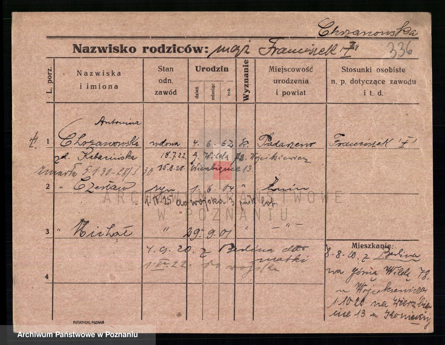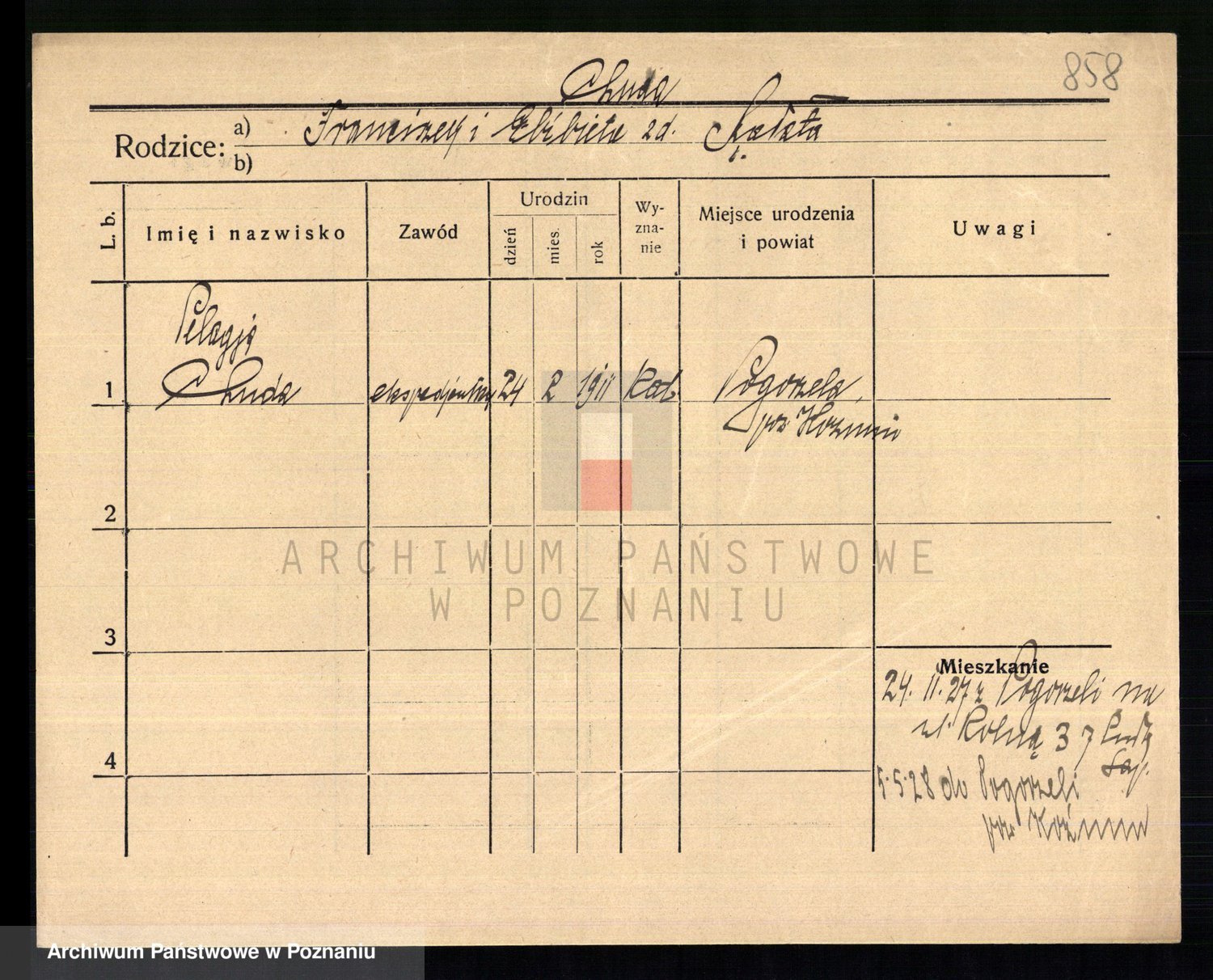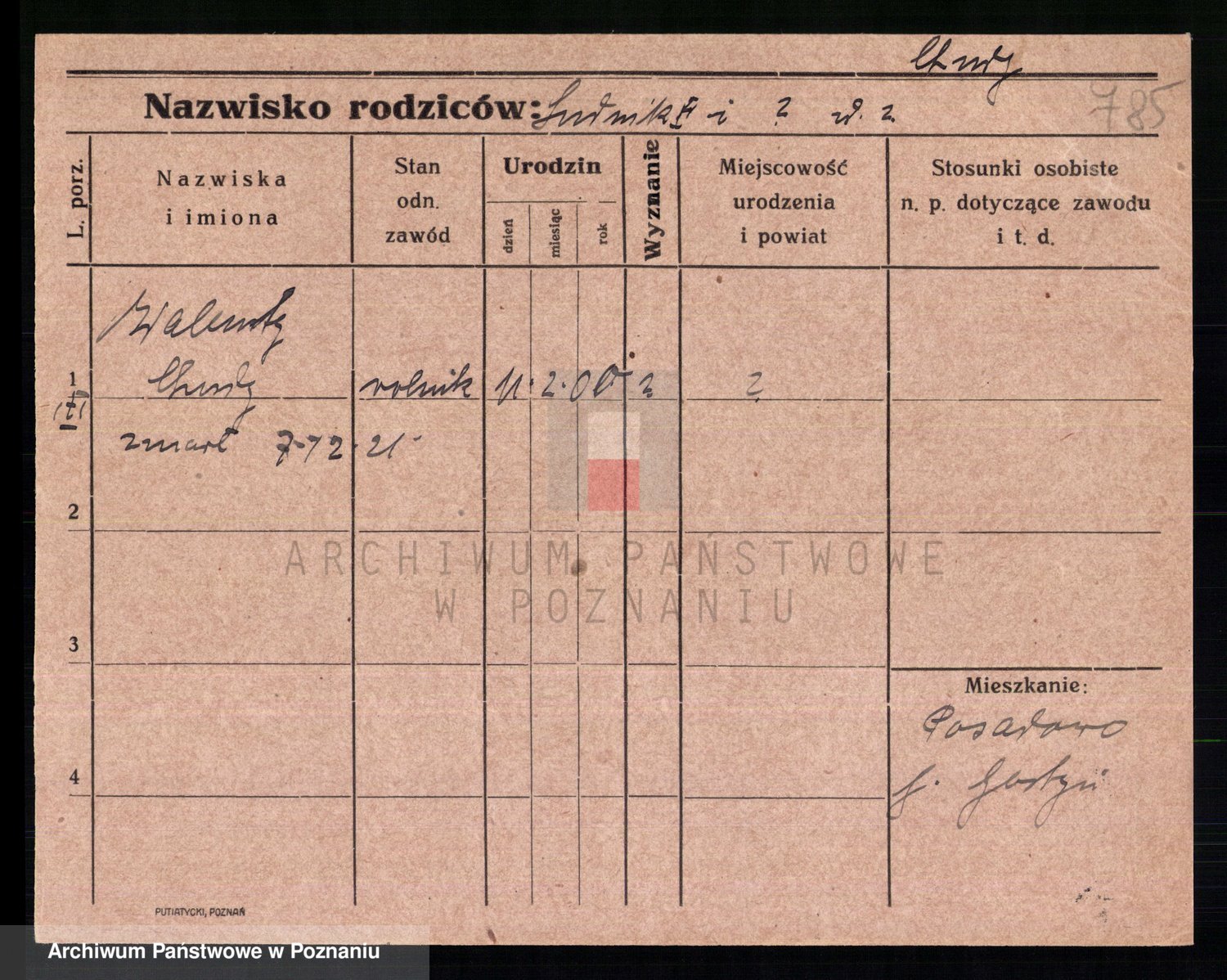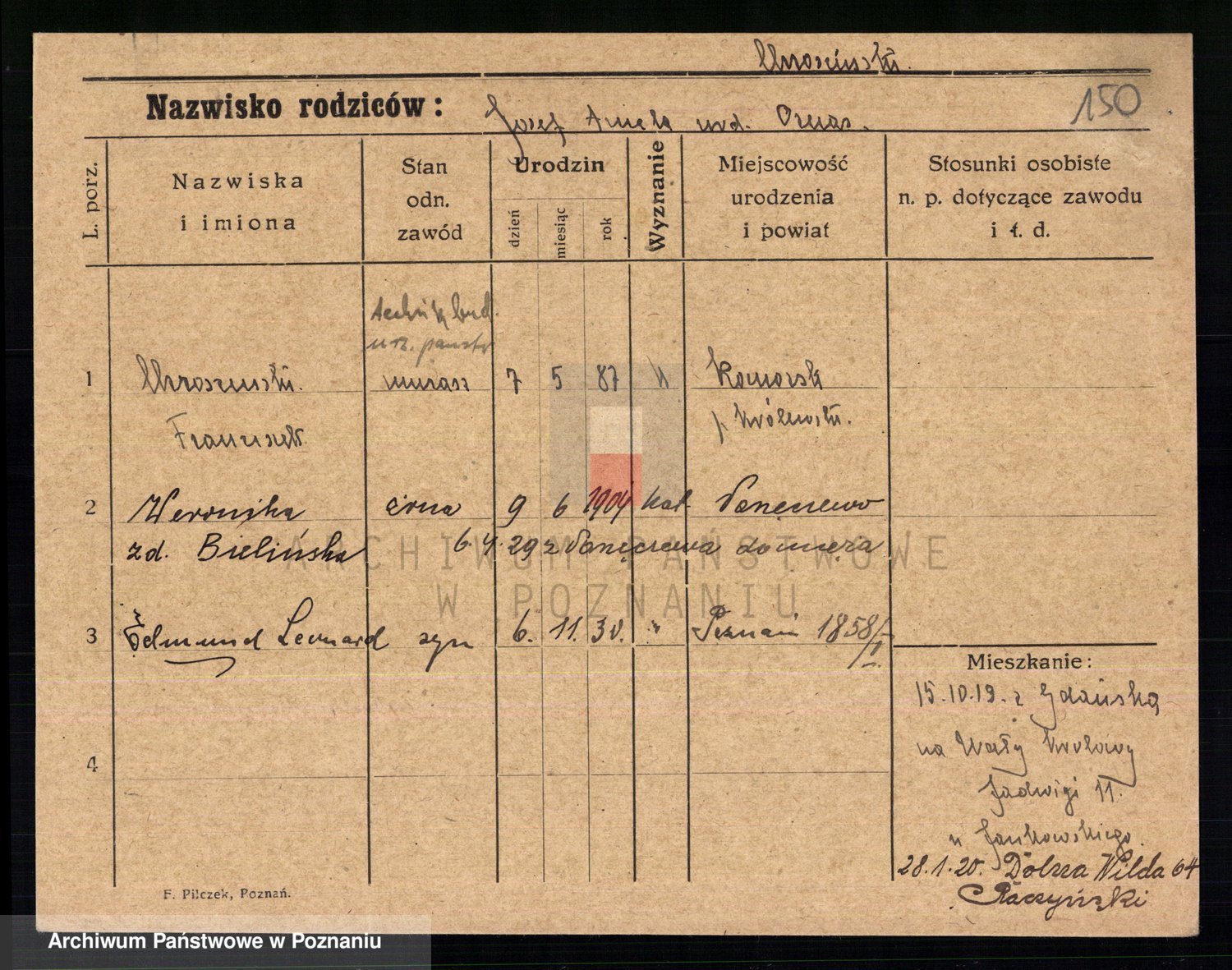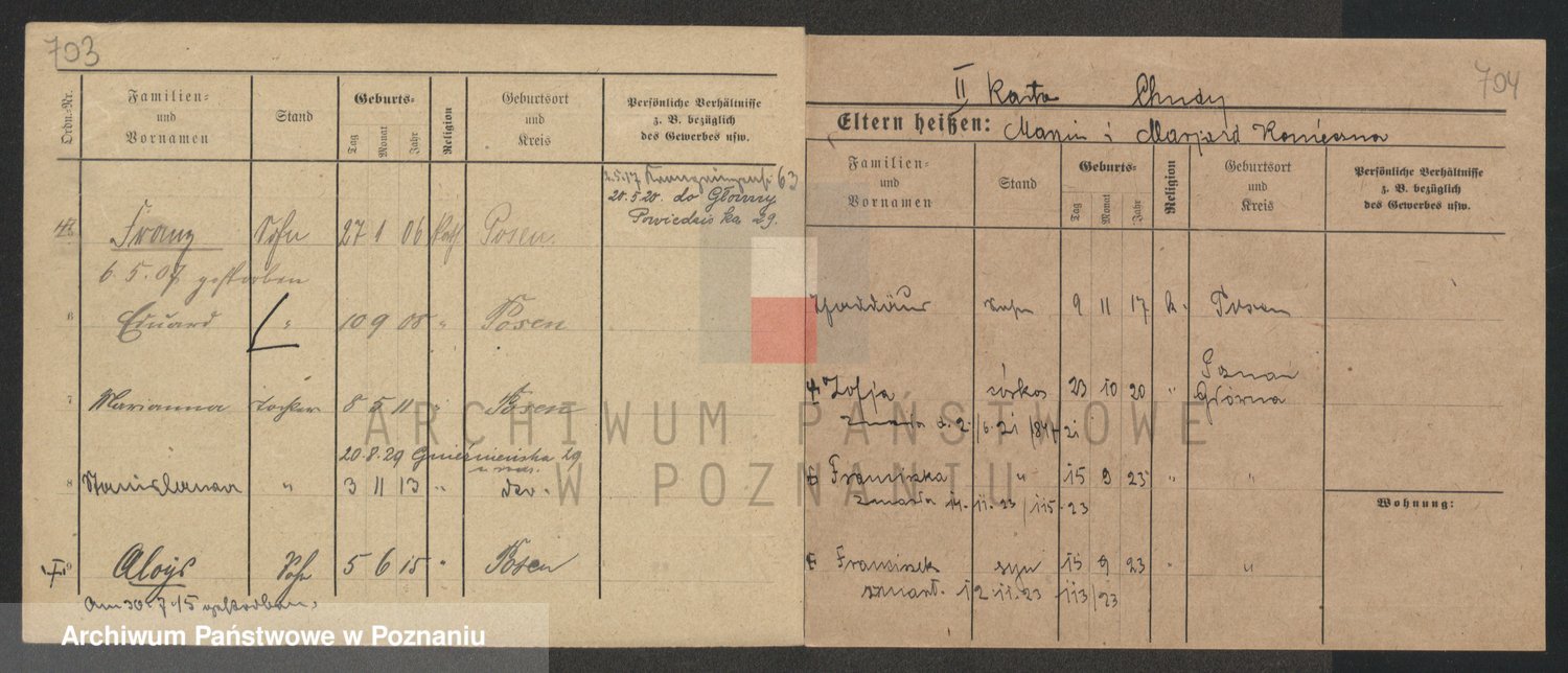Podgląd karty osobowej dostępny jest po kliknięciu na nazwisko lub ikonkę karty. Można dokonywać powiększenia (ikony na górze) lub przechodzić między kolejnymi skanami (strzałki po bokach).
