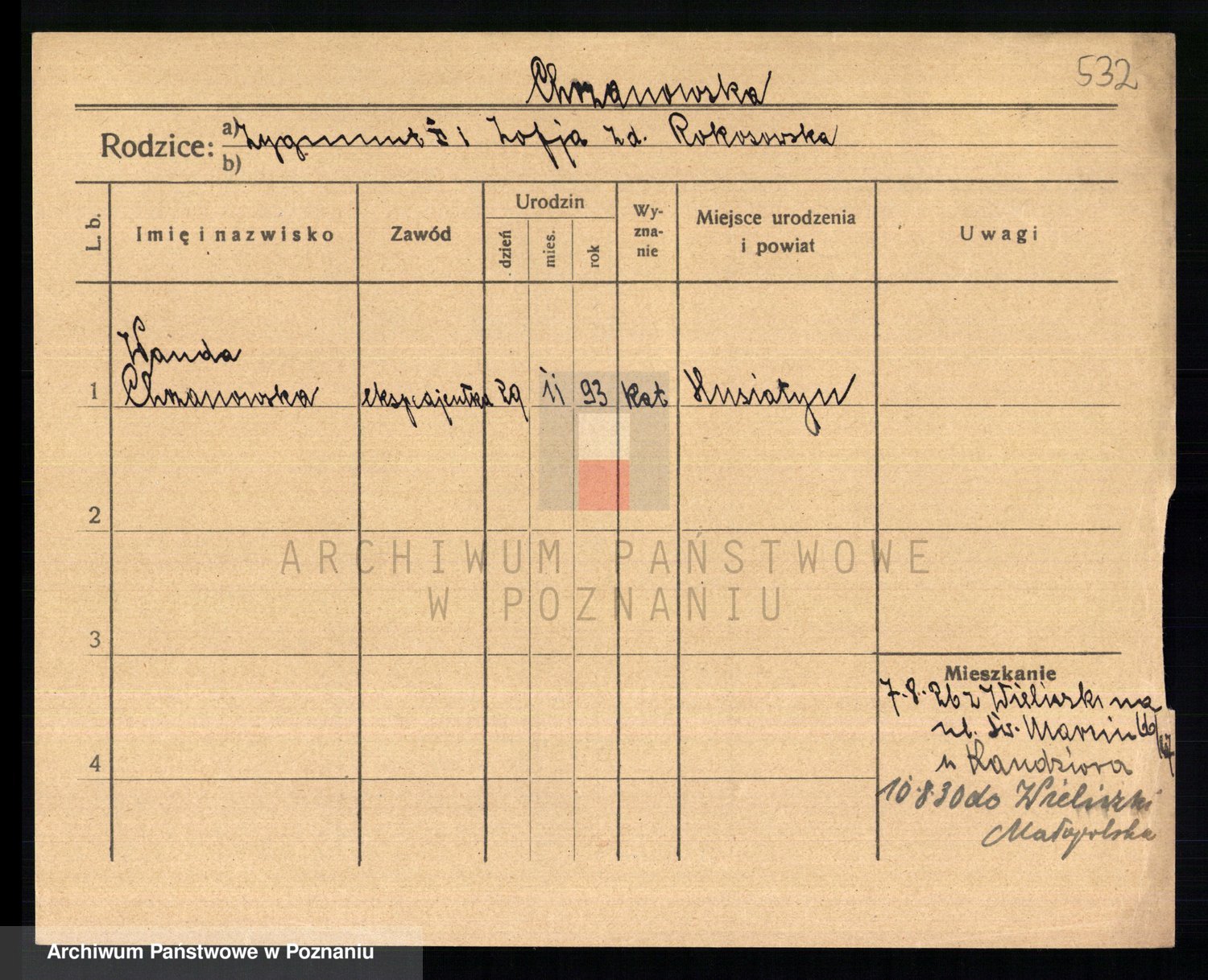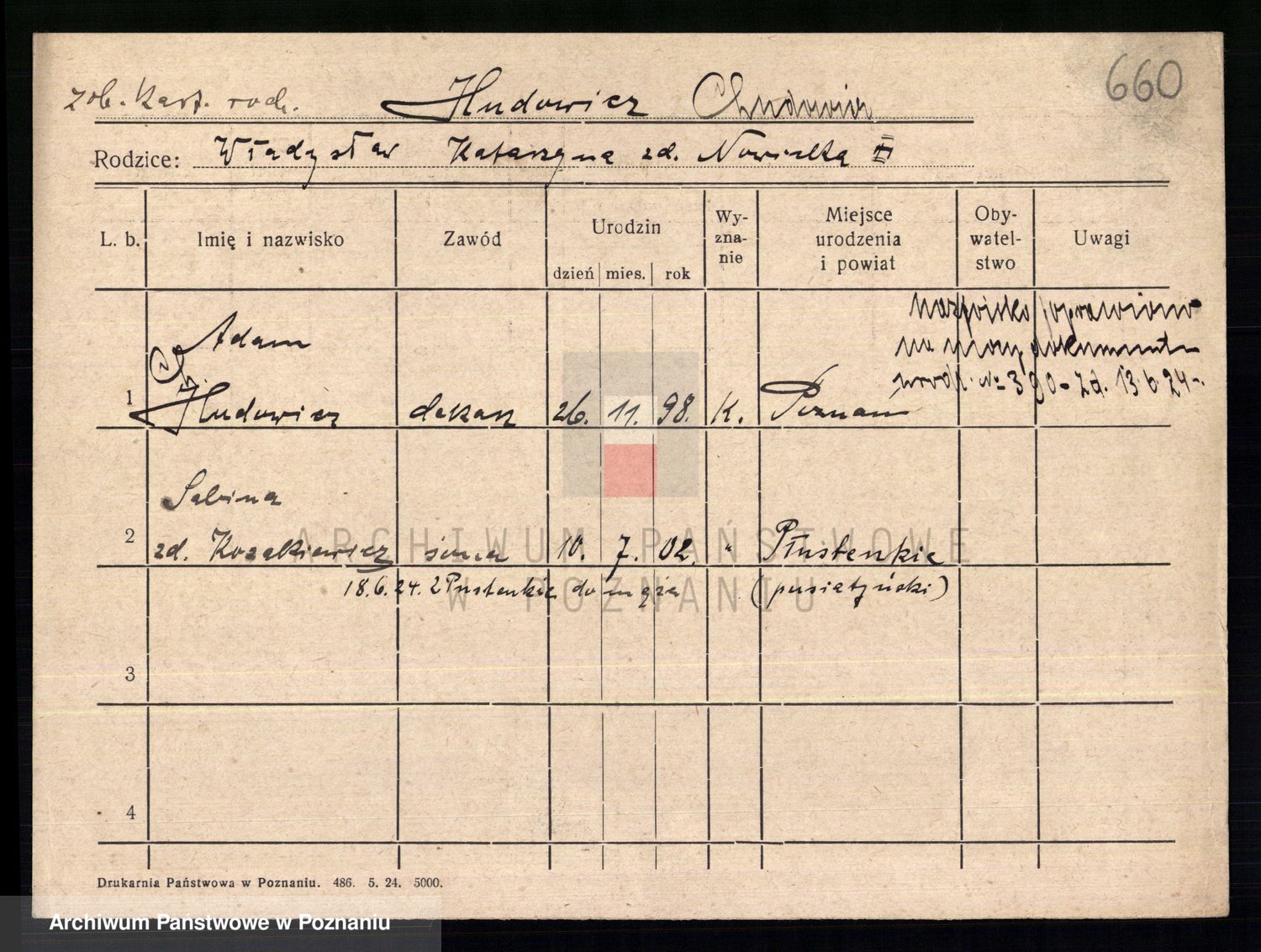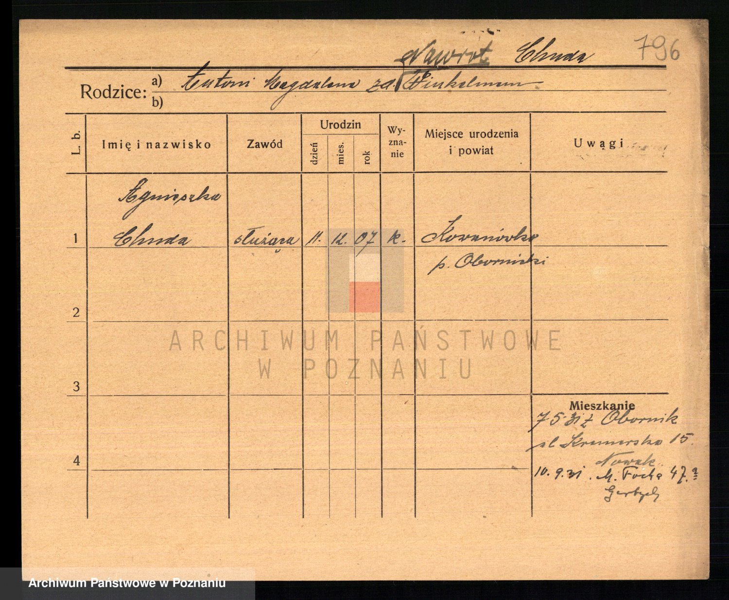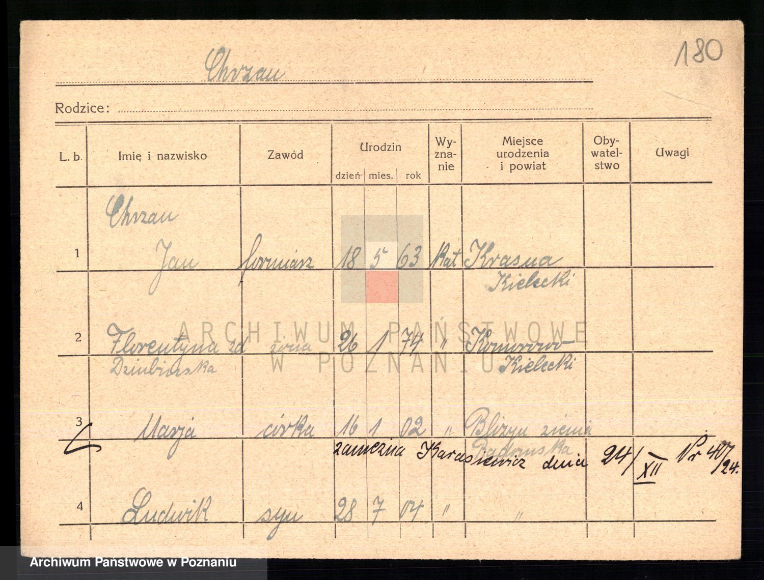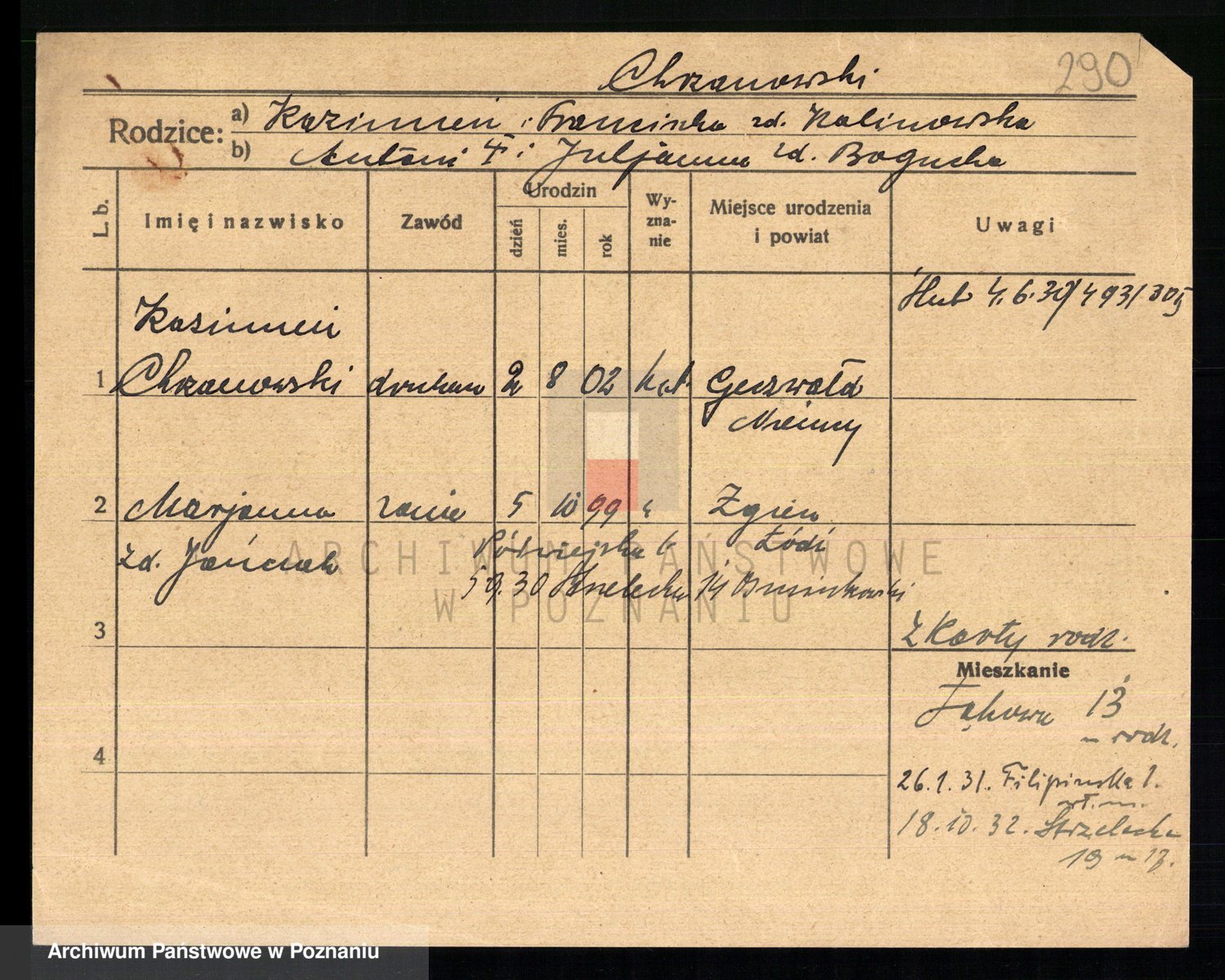 Podgląd karty osobowej dostępny jest po kliknięciu na nazwisko lub ikonkę karty. Można dokonywać powiększenia (ikony na górze) lub przechodzić między kolejnymi skanami (strzałki po bokach).
