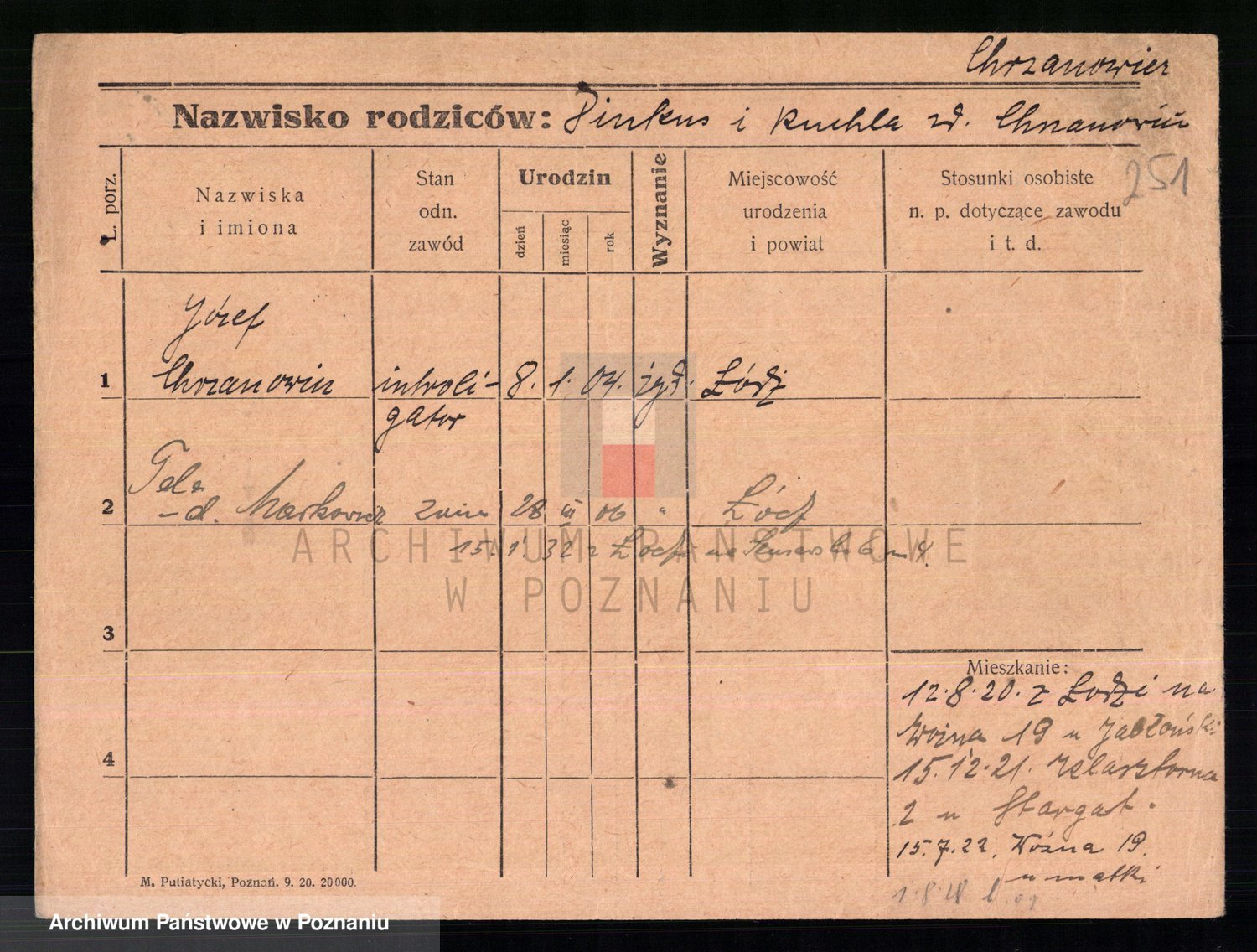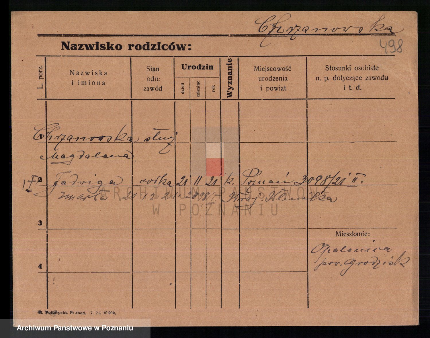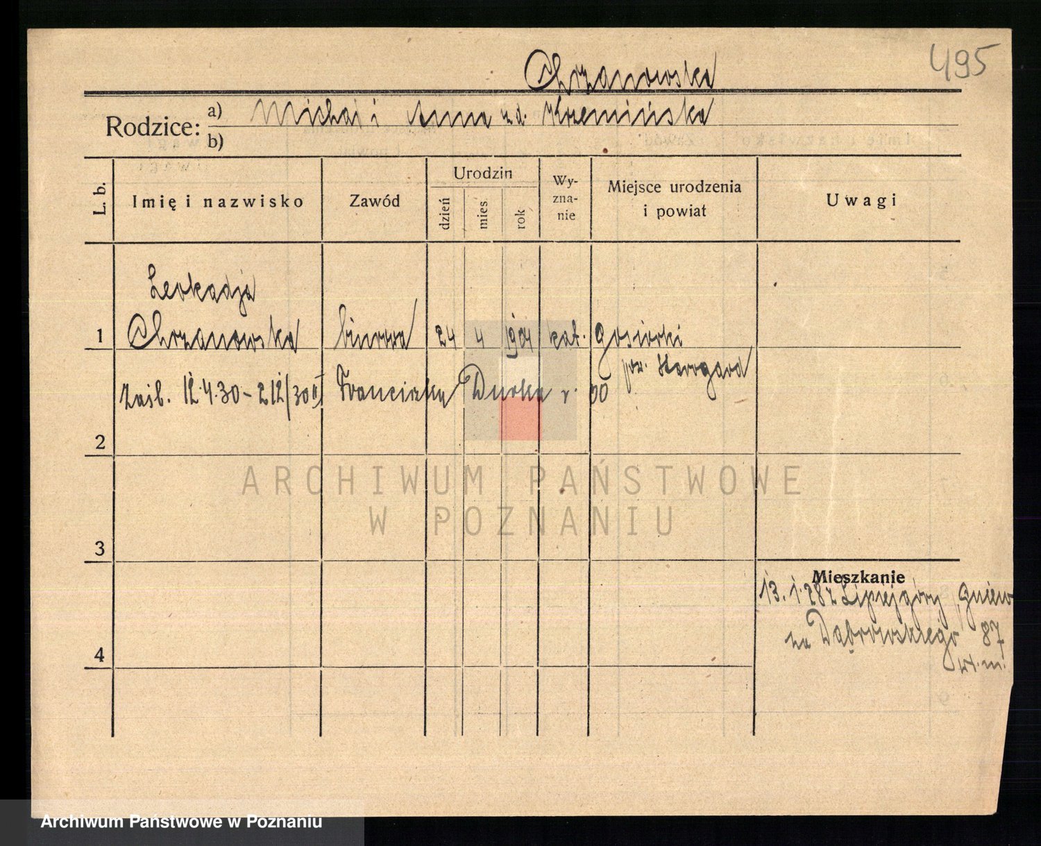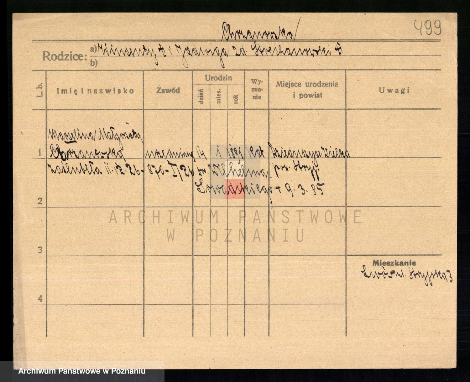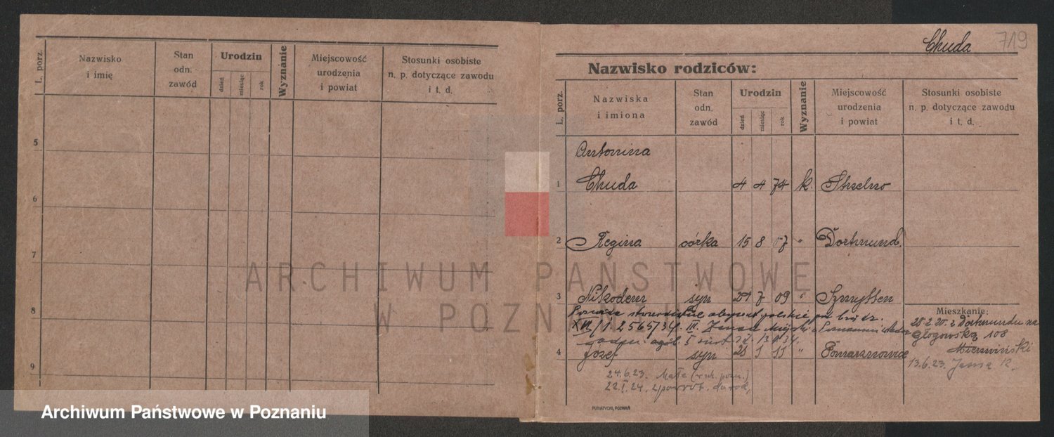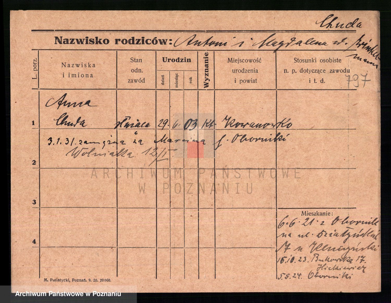 Podgląd karty osobowej dostępny jest po kliknięciu na nazwisko lub ikonkę karty. Można dokonywać powiększenia (ikony na górze) lub przechodzić między kolejnymi skanami (strzałki po bokach).