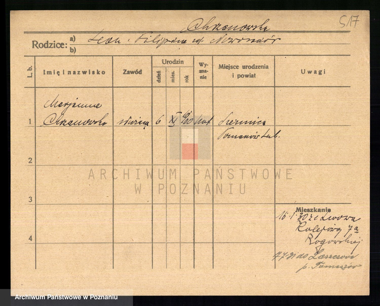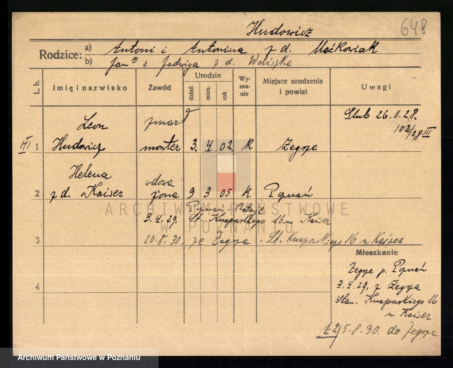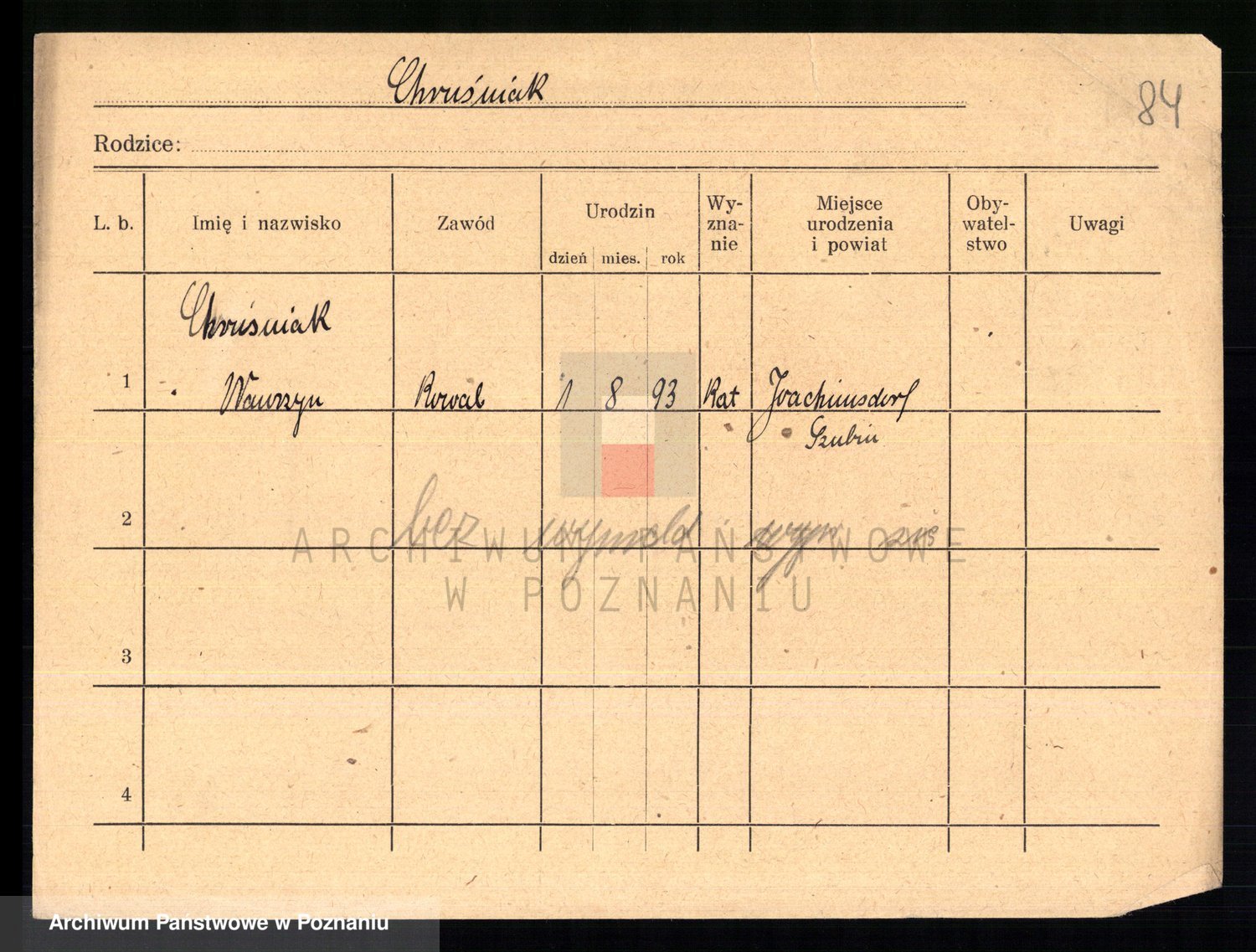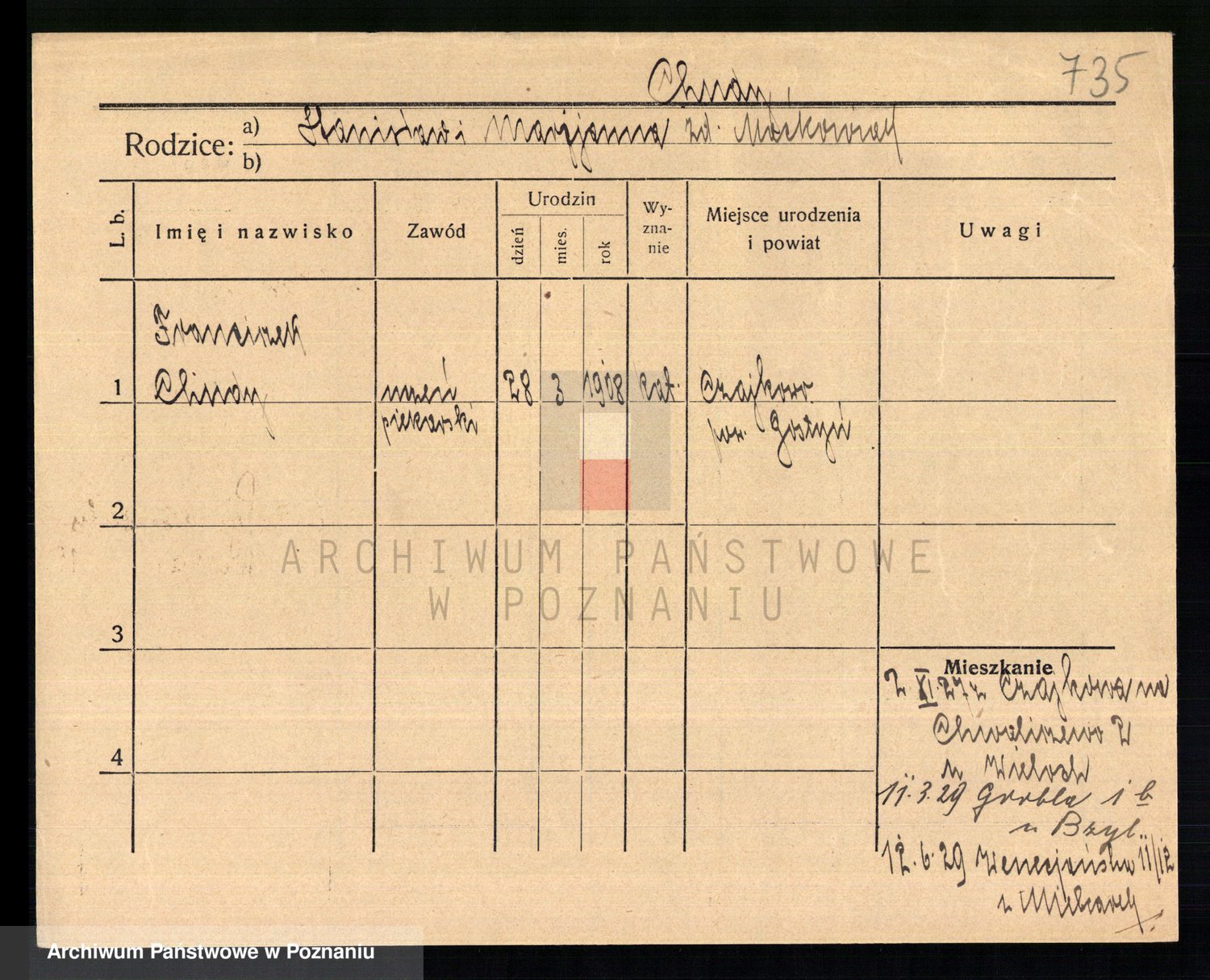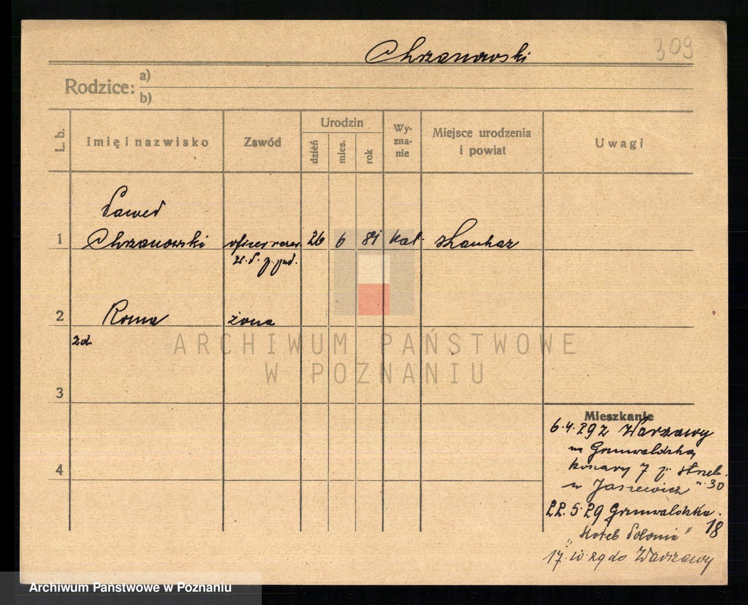 Podgląd karty osobowej dostępny jest po kliknięciu na nazwisko lub ikonkę karty. Można dokonywać powiększenia (ikony na górze) lub przechodzić między kolejnymi skanami (strzałki po bokach).