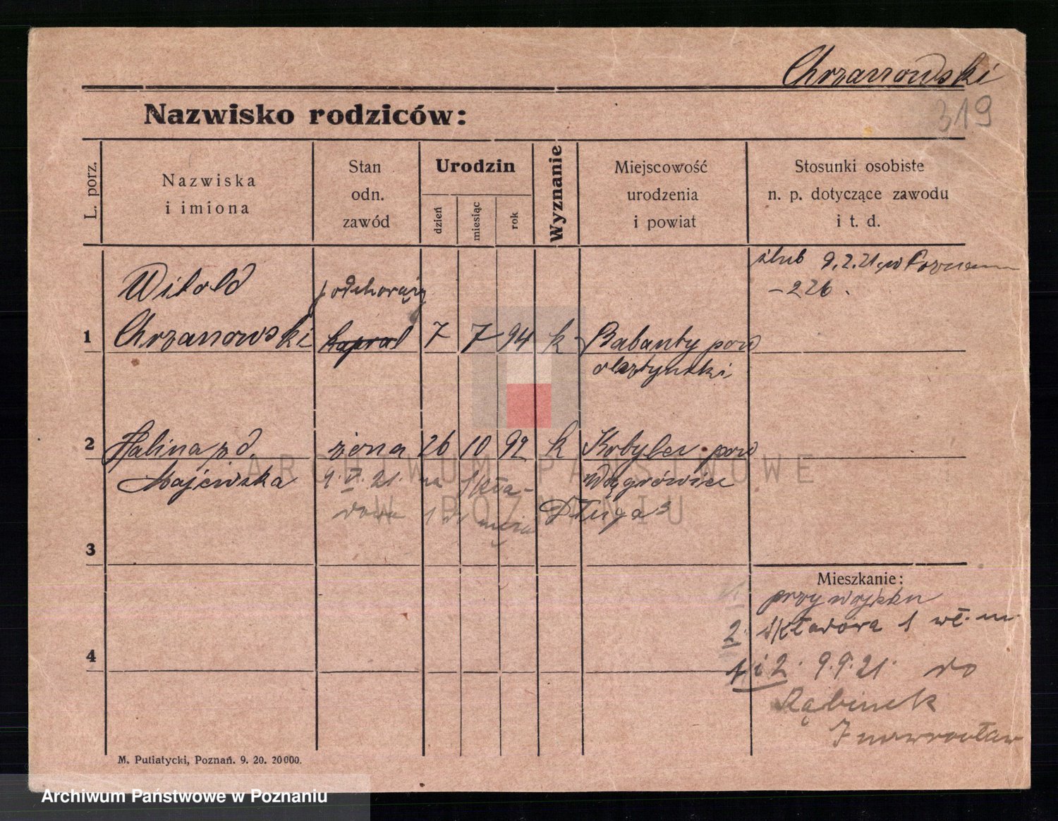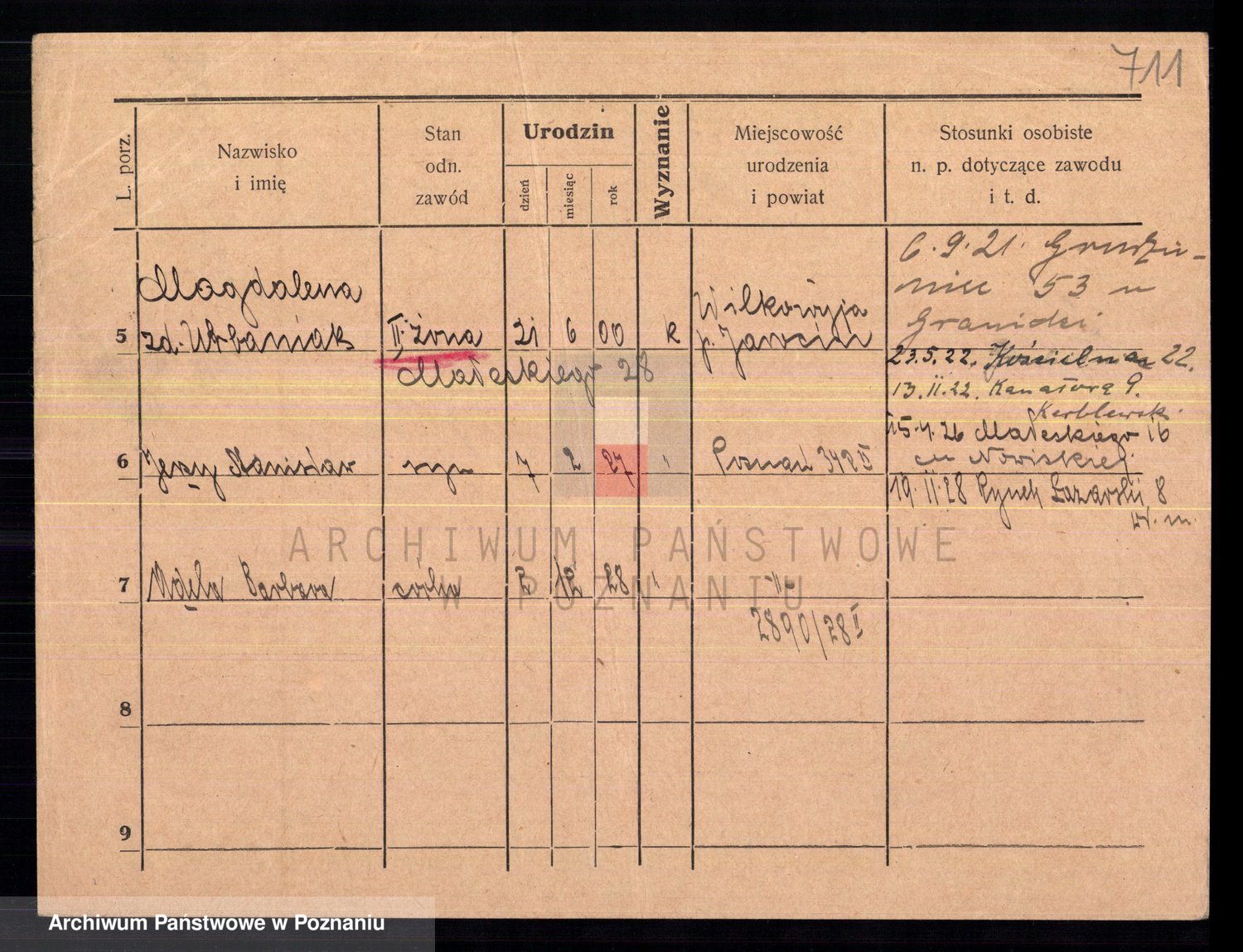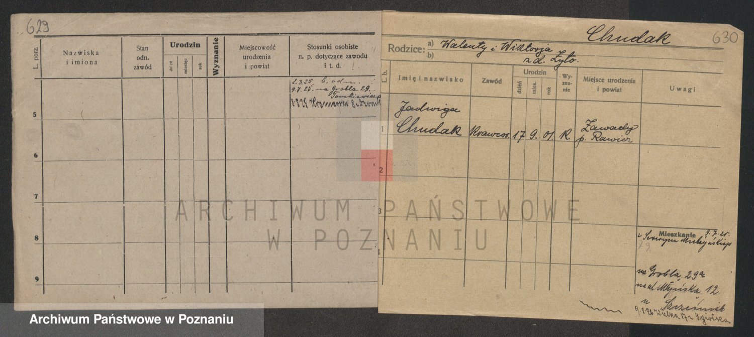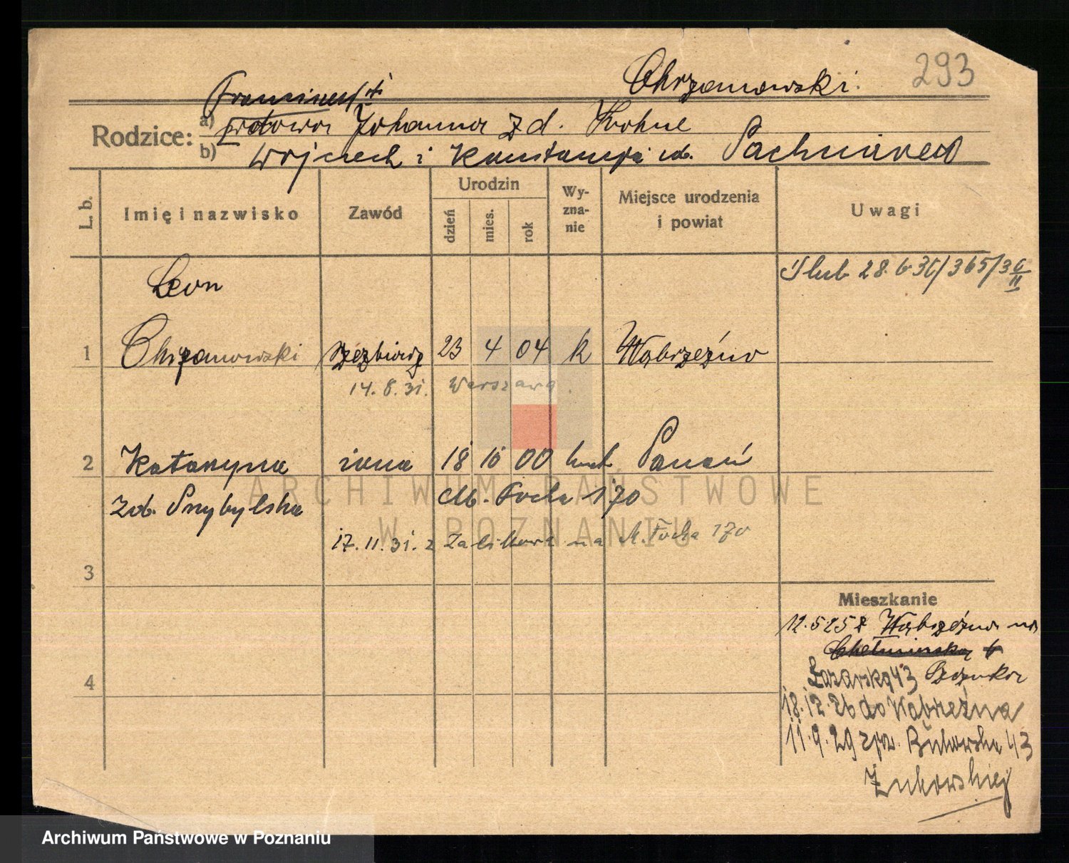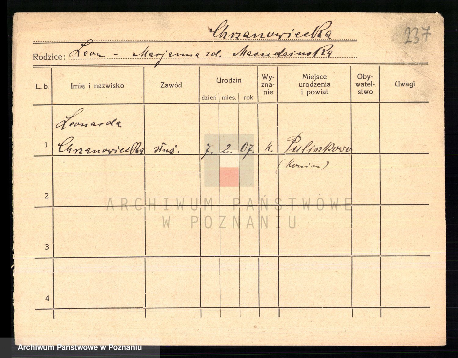 Podgląd karty osobowej dostępny jest po kliknięciu na nazwisko lub ikonkę karty. Można dokonywać powiększenia (ikony na górze) lub przechodzić między kolejnymi skanami (strzałki po bokach).