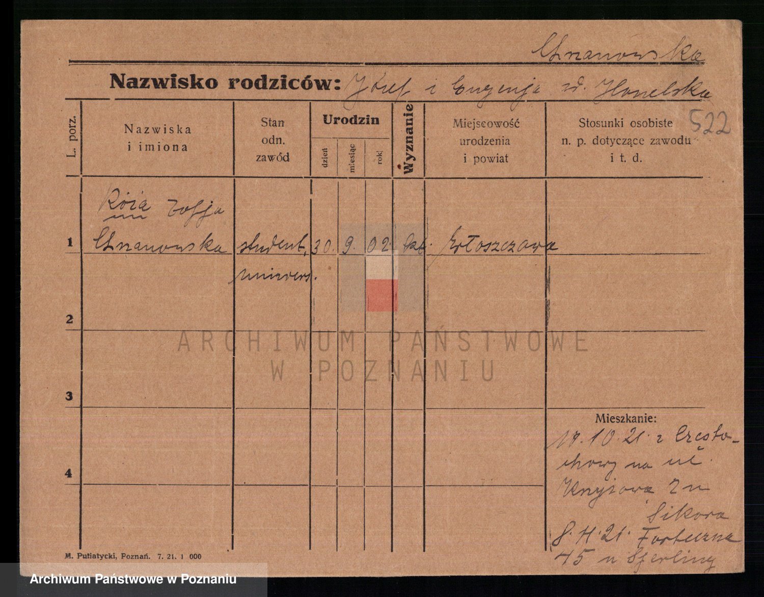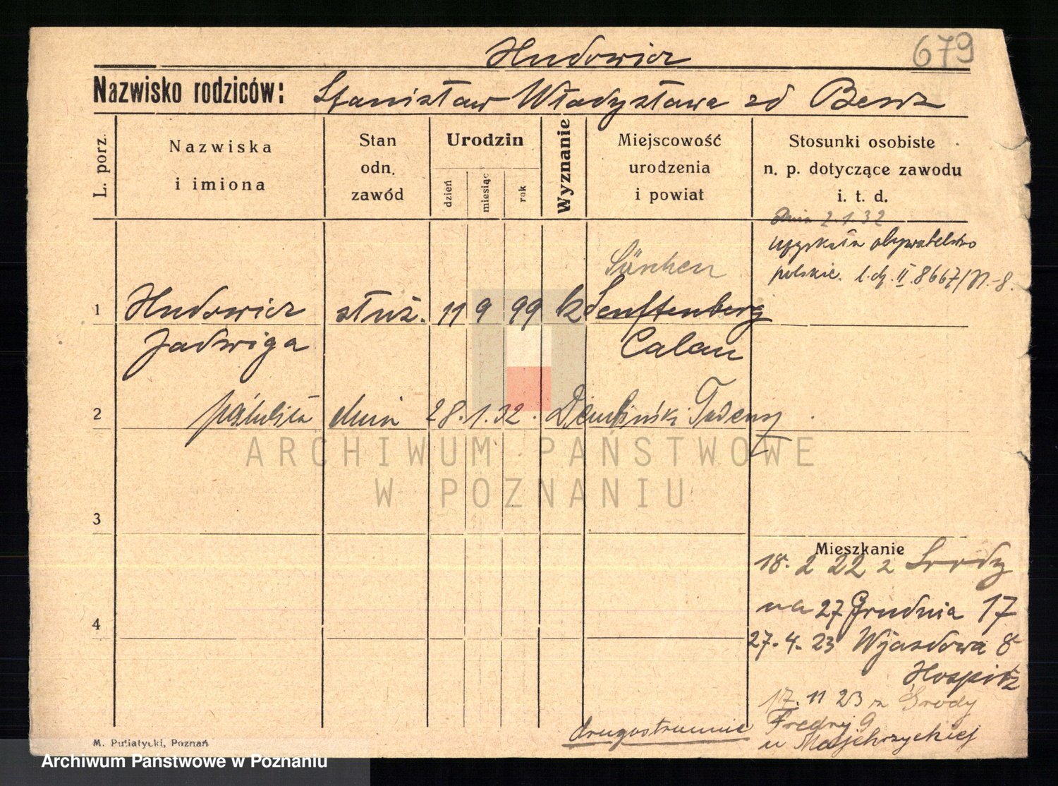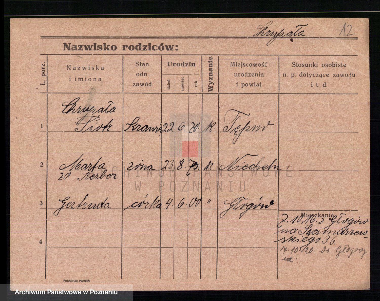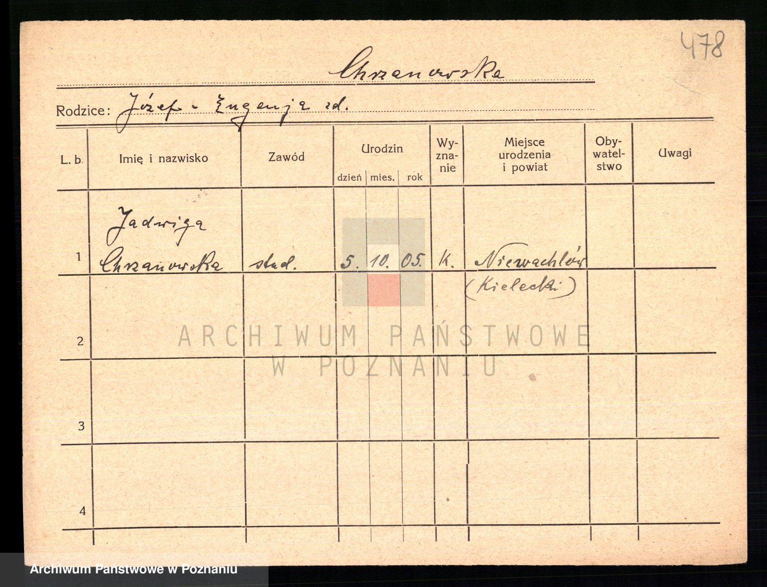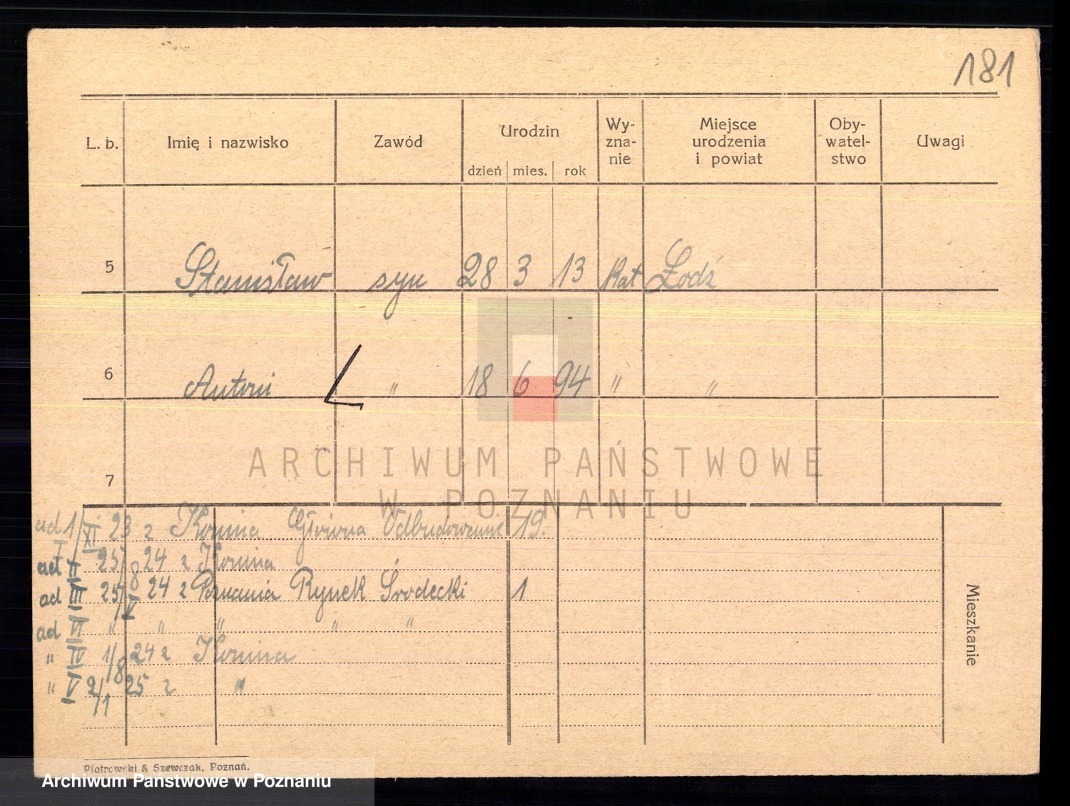 Podgląd karty osobowej dostępny jest po kliknięciu na nazwisko lub ikonkę karty. Można dokonywać powiększenia (ikony na górze) lub przechodzić między kolejnymi skanami (strzałki po bokach).