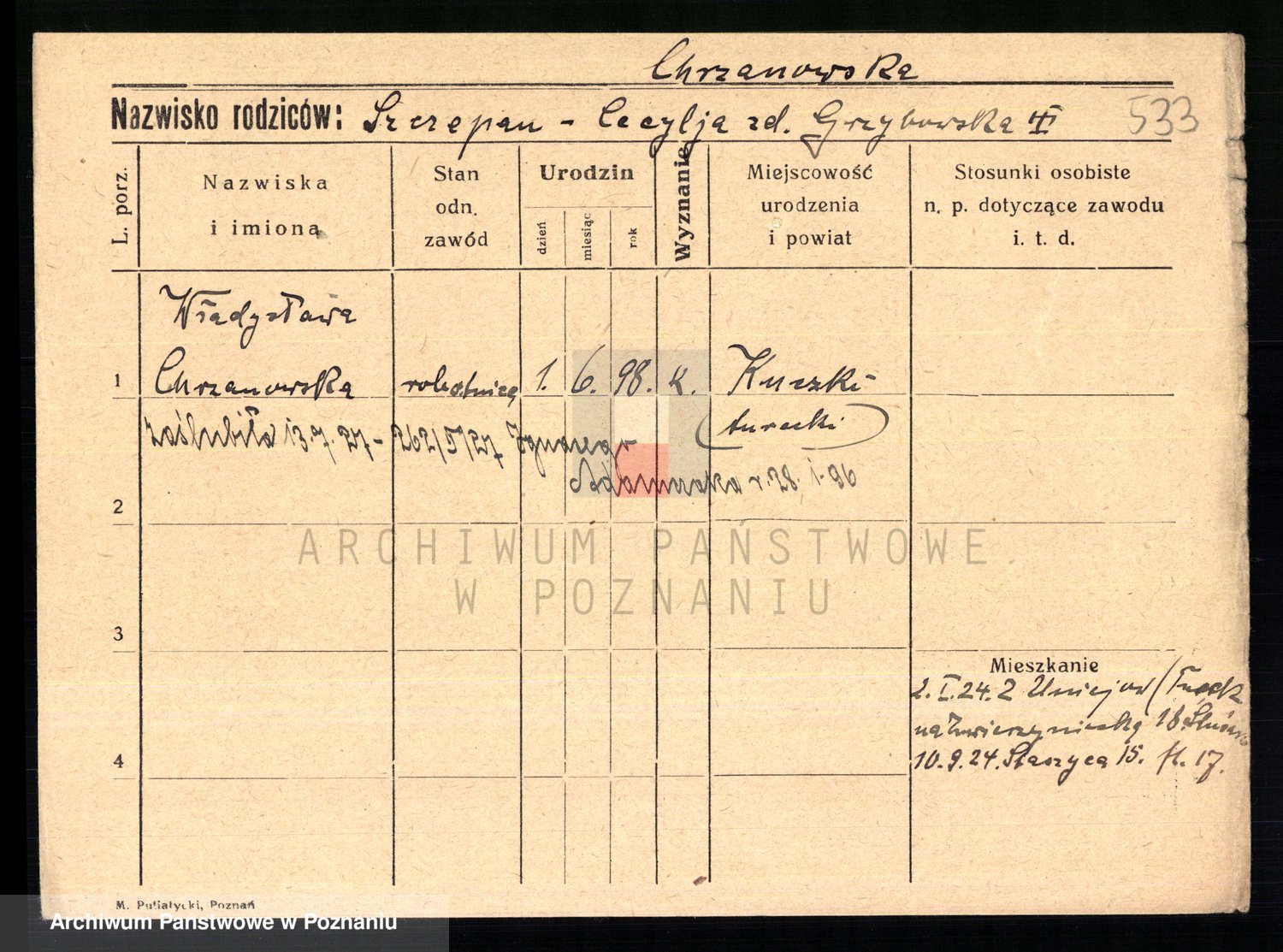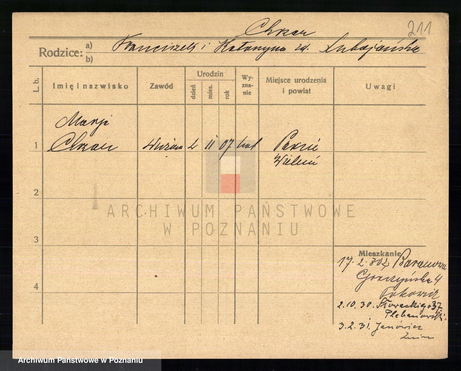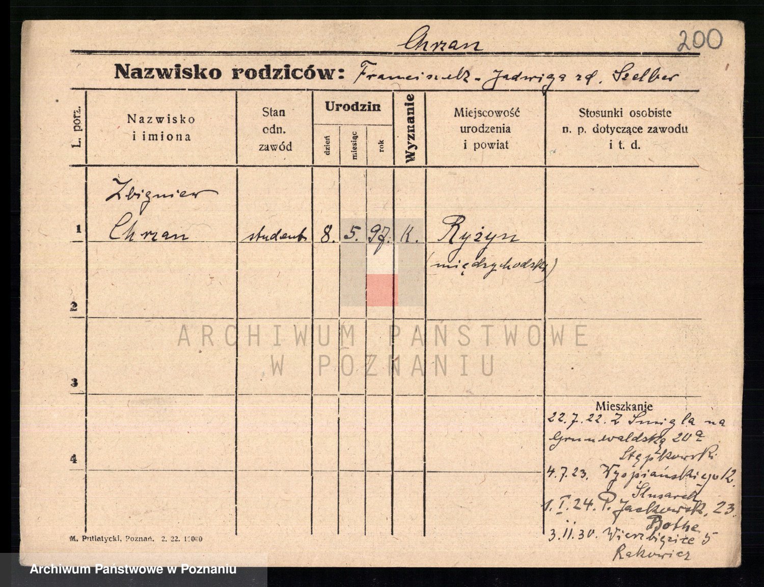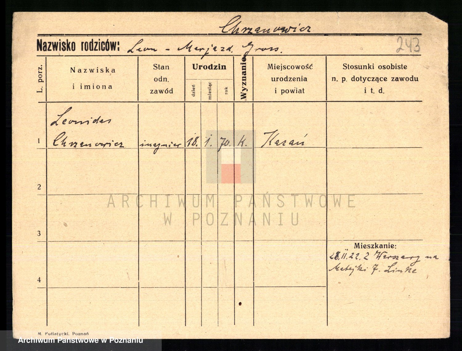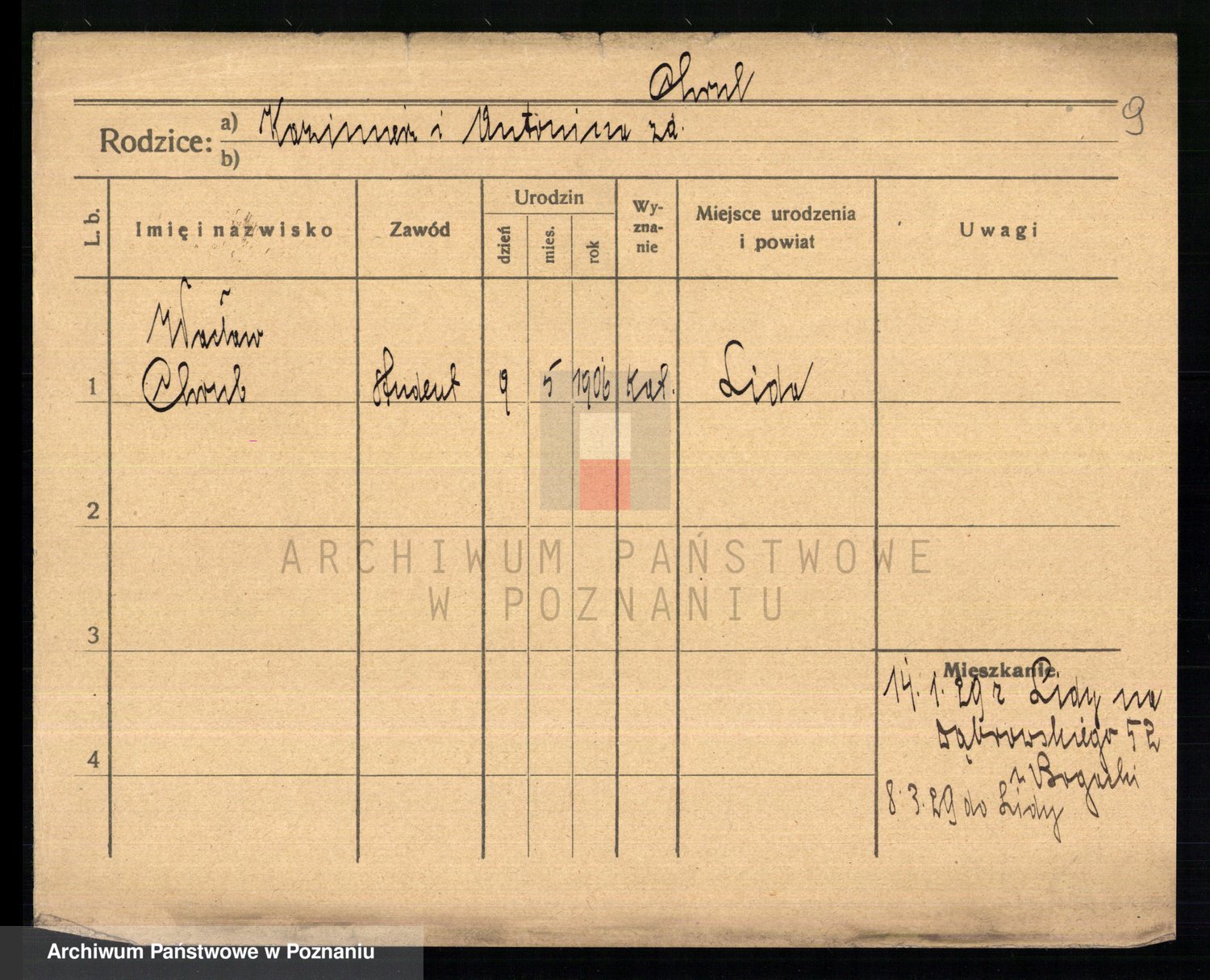 Podgląd karty osobowej dostępny jest po kliknięciu na nazwisko lub ikonkę karty. Można dokonywać powiększenia (ikony na górze) lub przechodzić między kolejnymi skanami (strzałki po bokach).