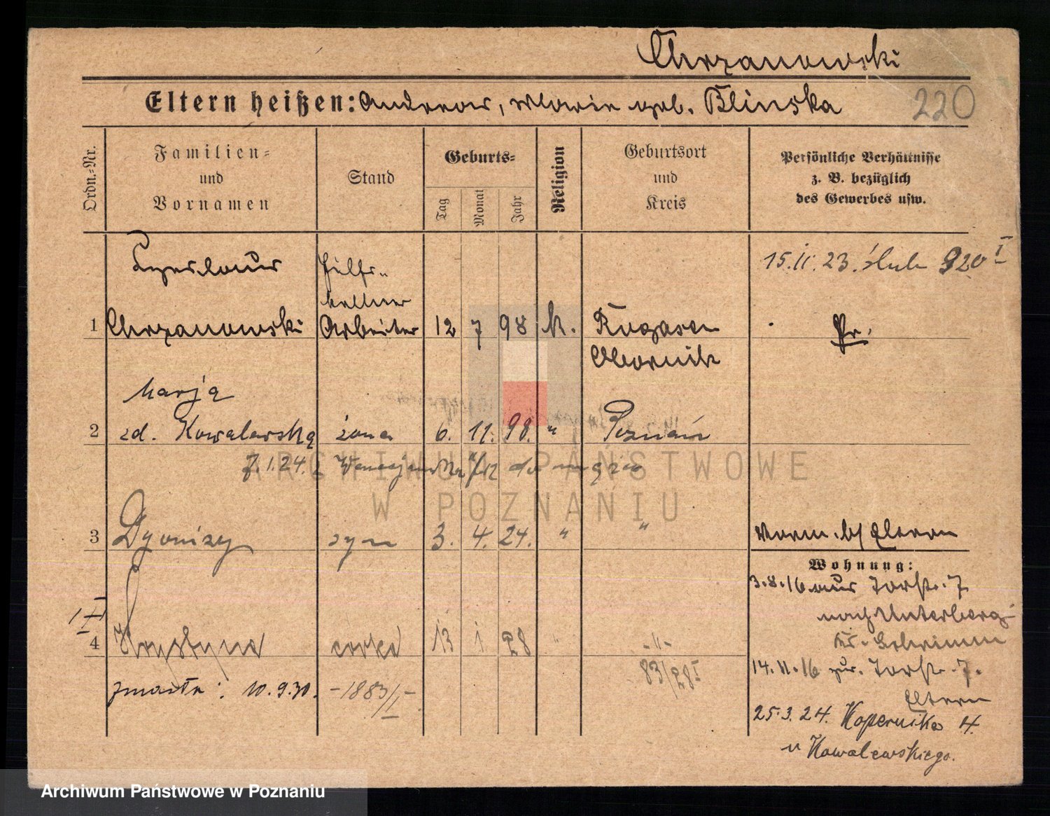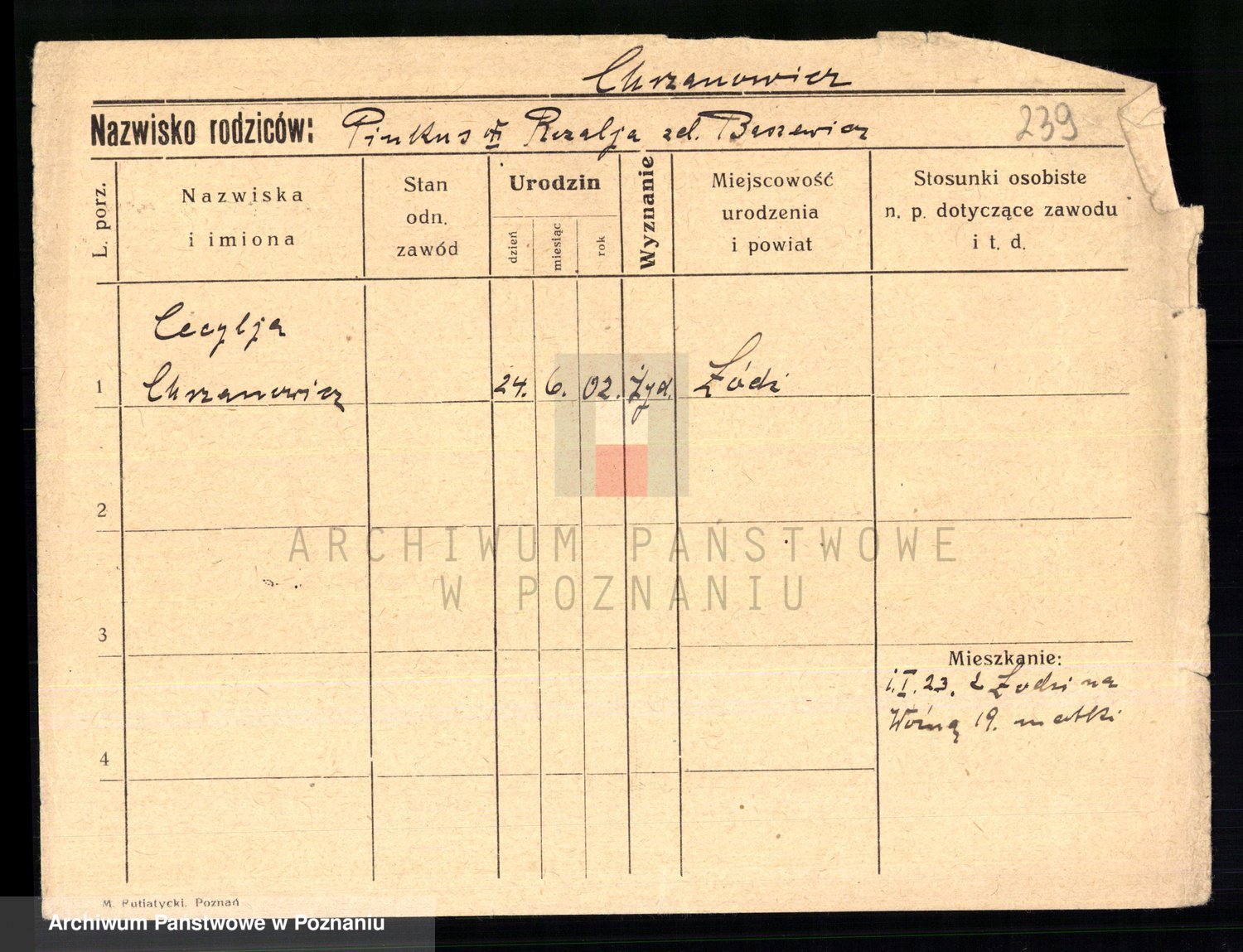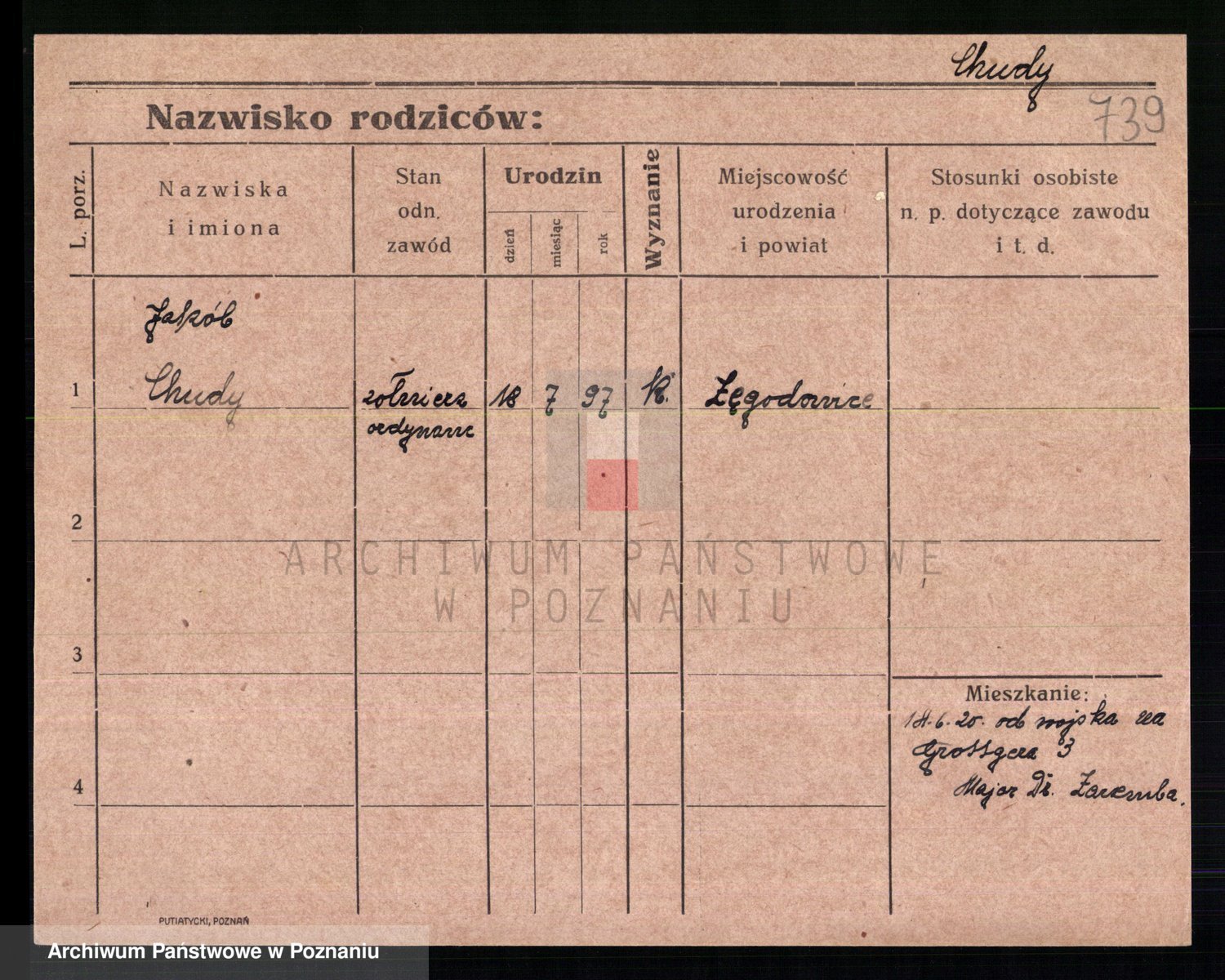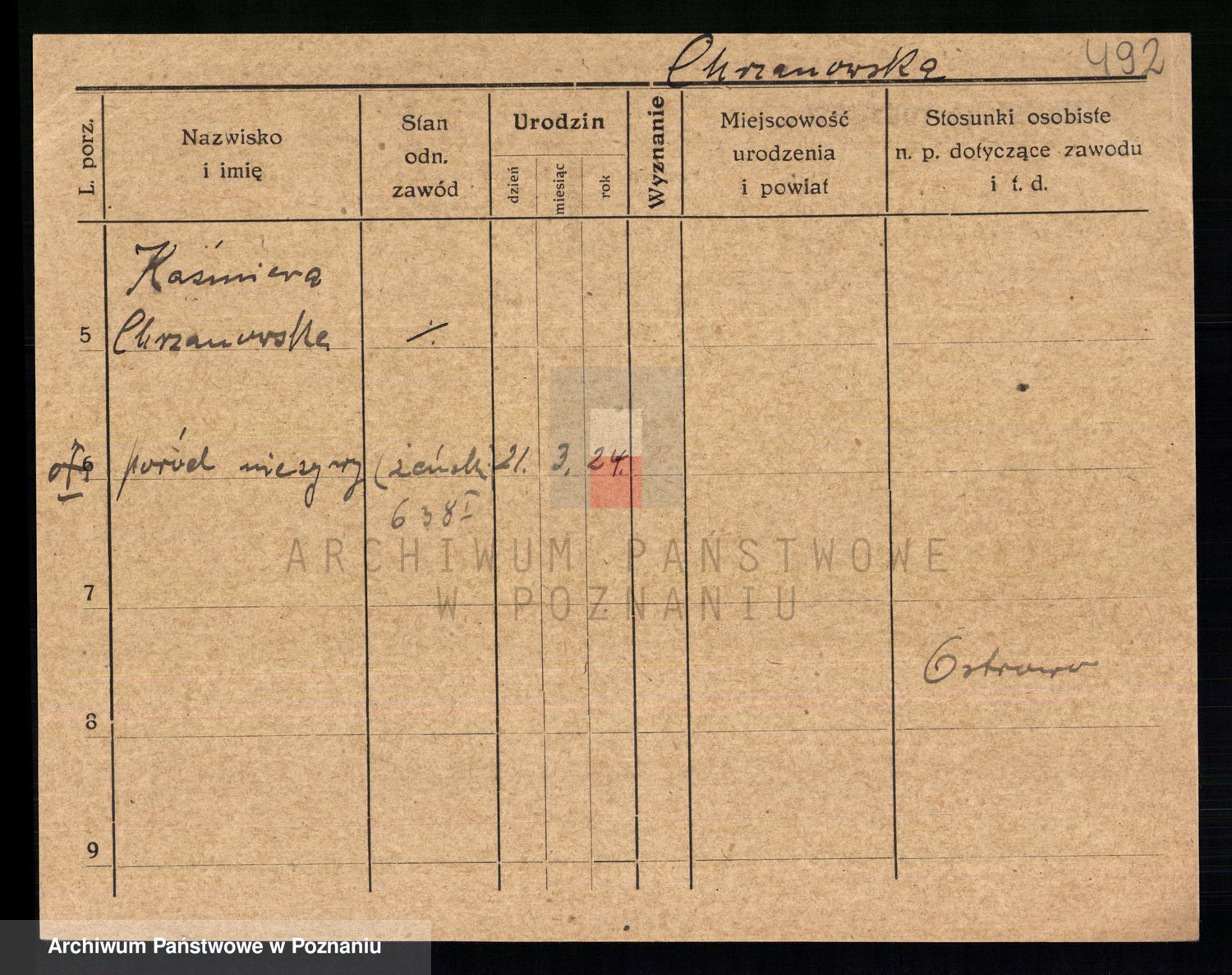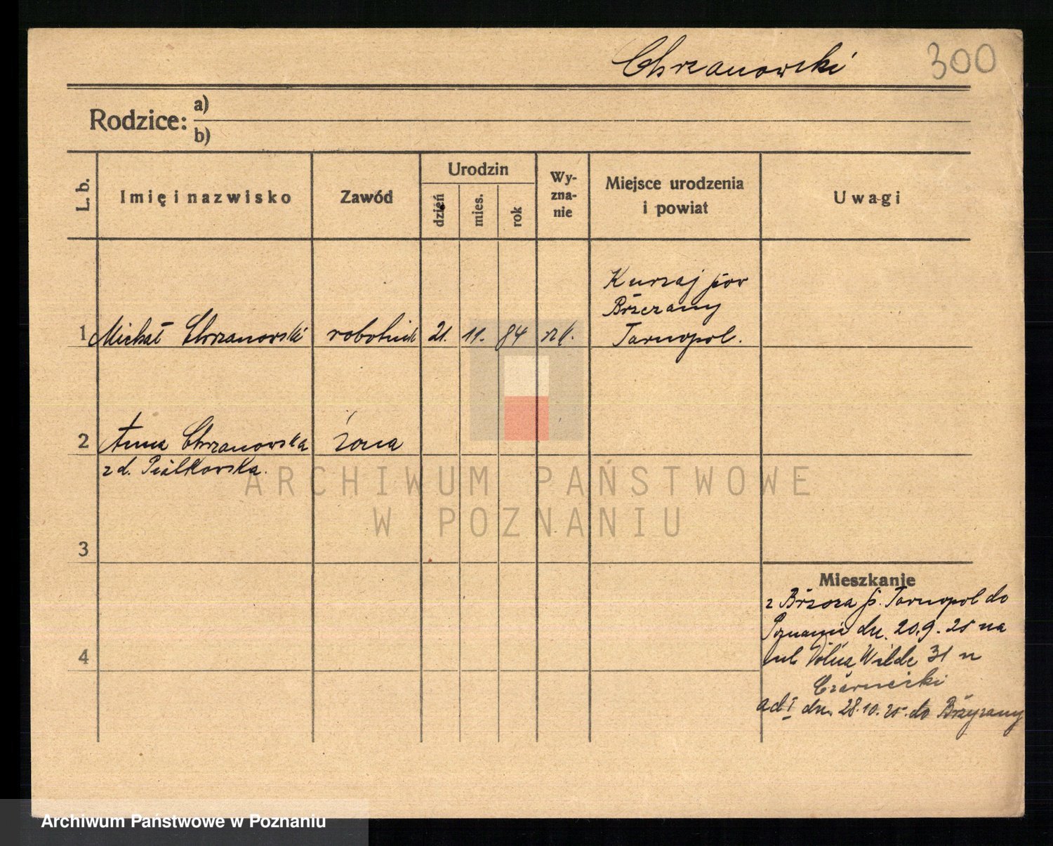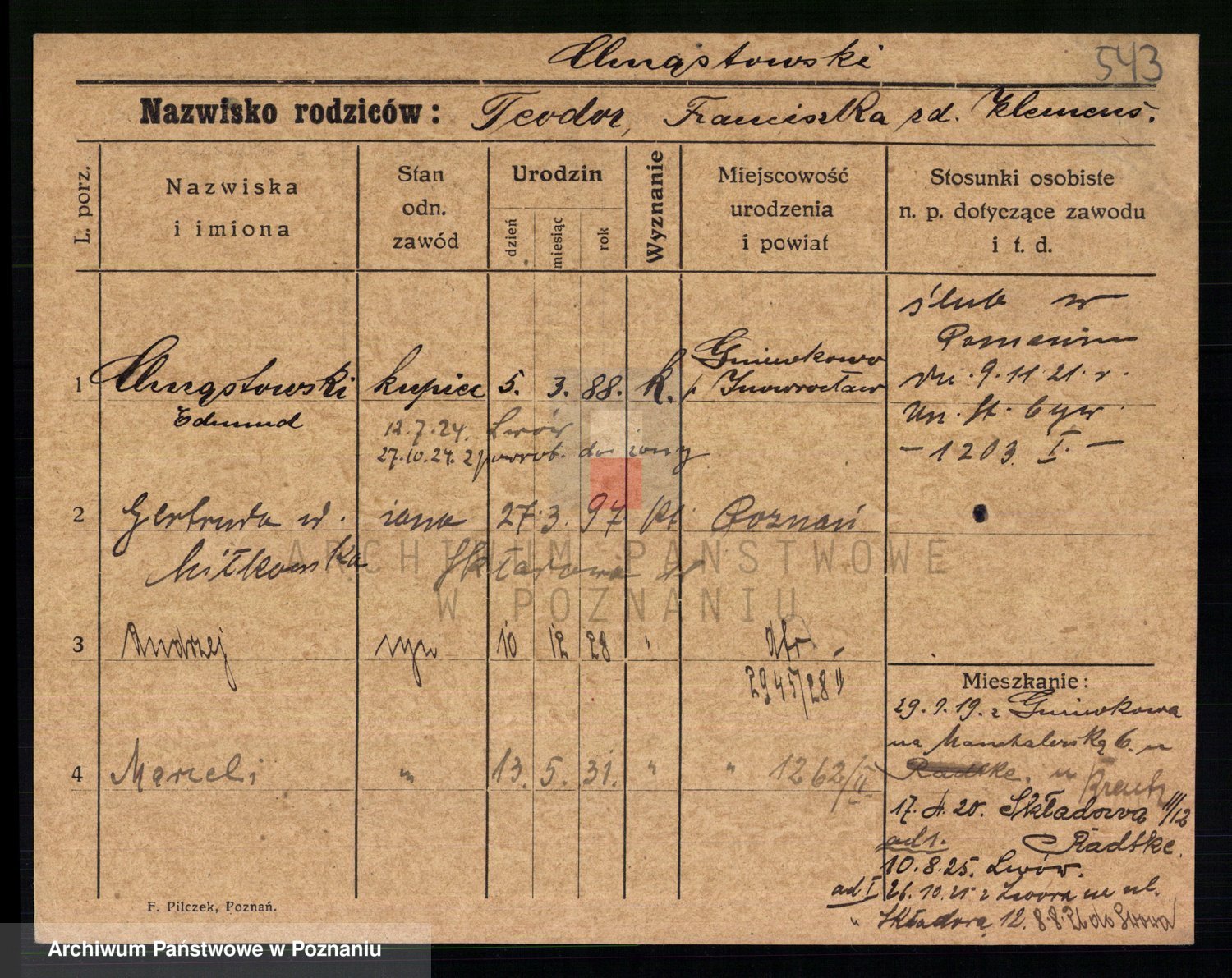 Podgląd karty osobowej dostępny jest po kliknięciu na nazwisko lub ikonkę karty. Można dokonywać powiększenia (ikony na górze) lub przechodzić między kolejnymi skanami (strzałki po bokach).