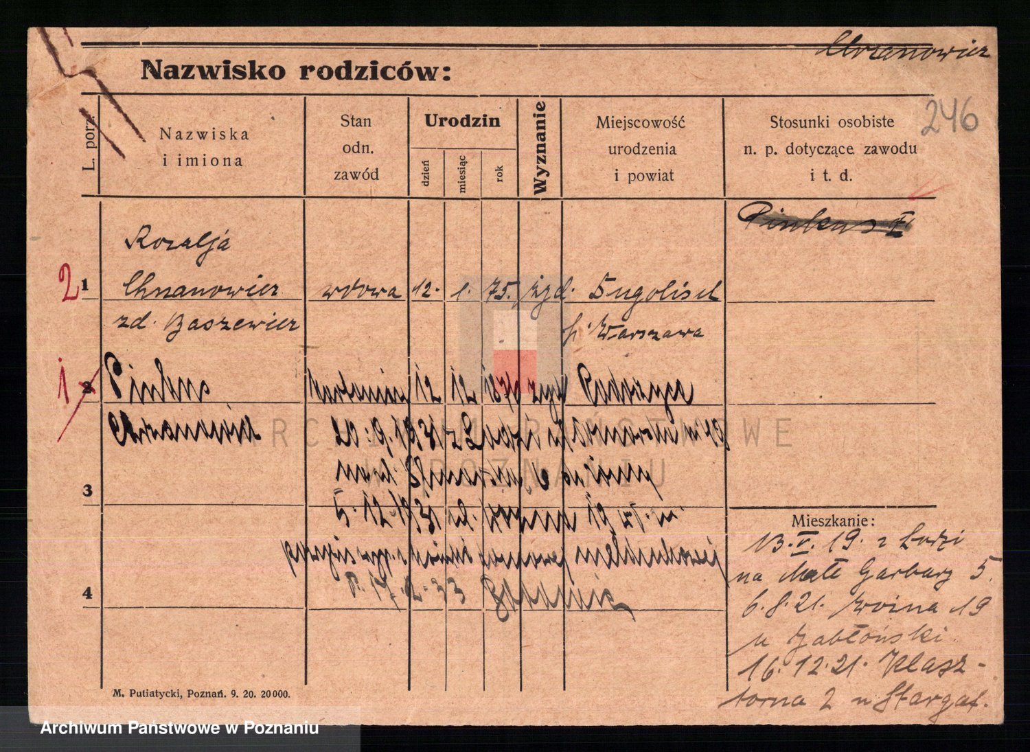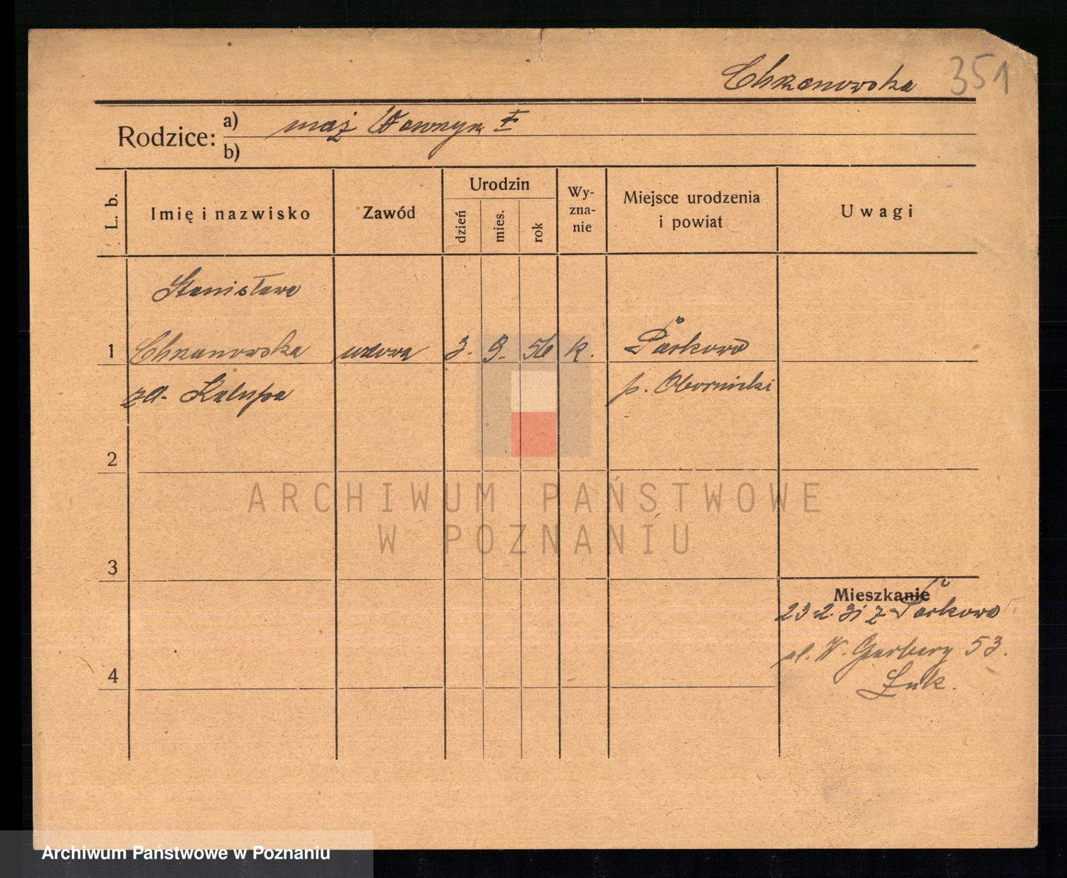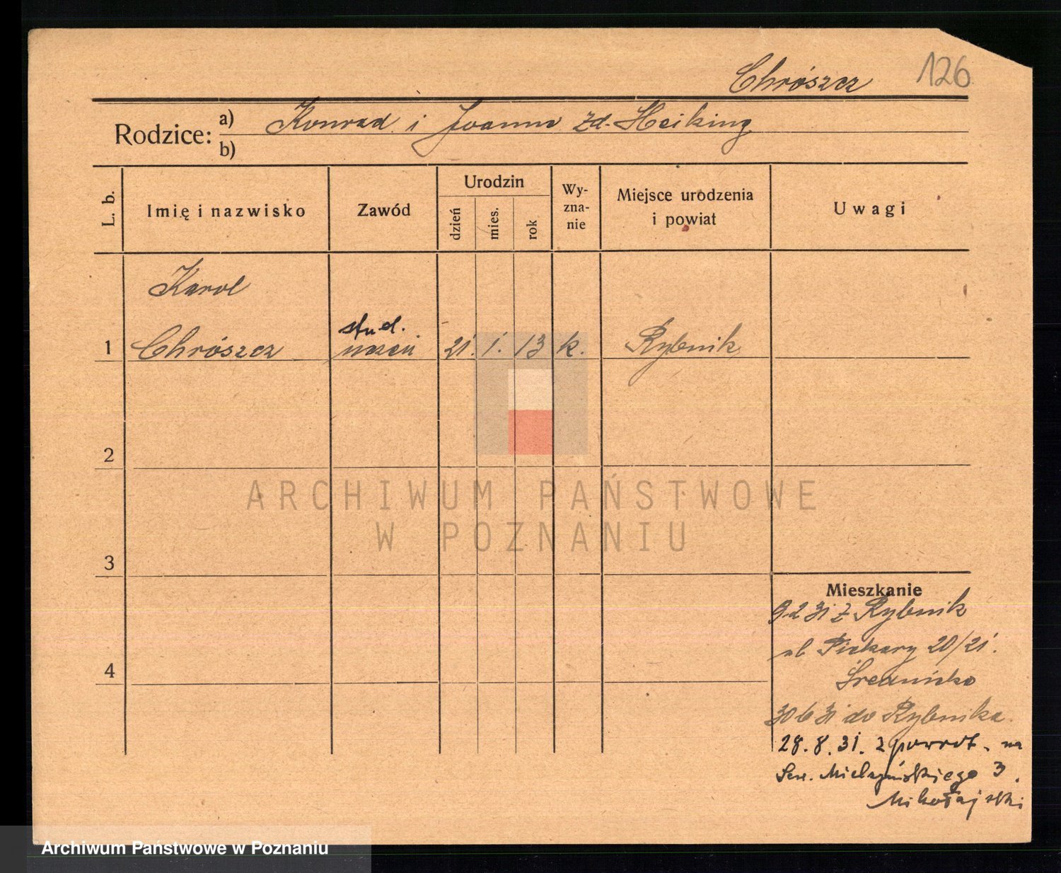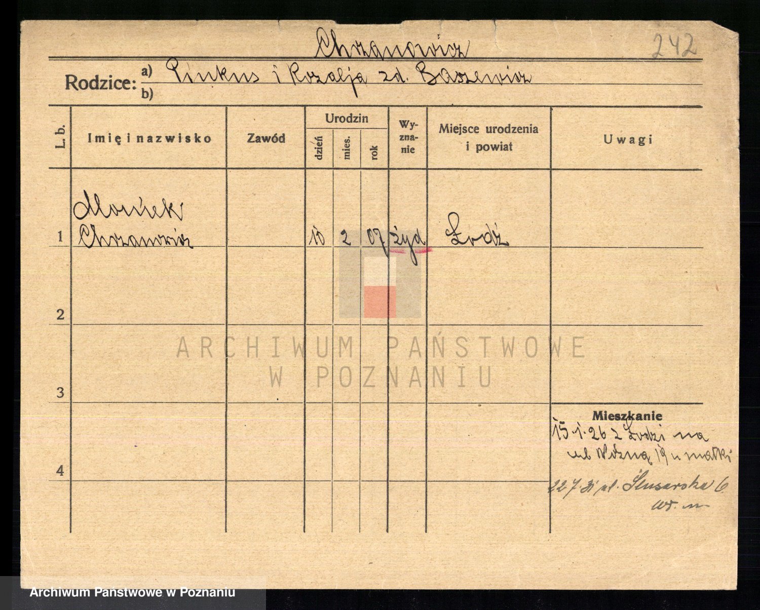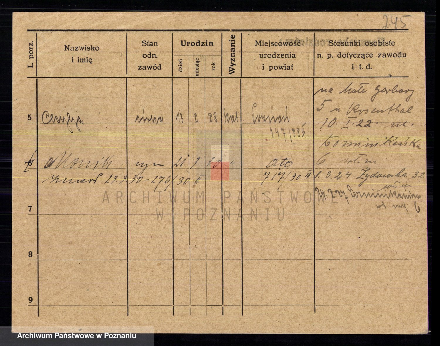 Podgląd karty osobowej dostępny jest po kliknięciu na nazwisko lub ikonkę karty. Można dokonywać powiększenia (ikony na górze) lub przechodzić między kolejnymi skanami (strzałki po bokach).