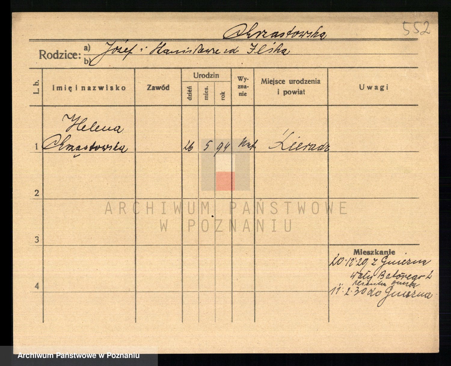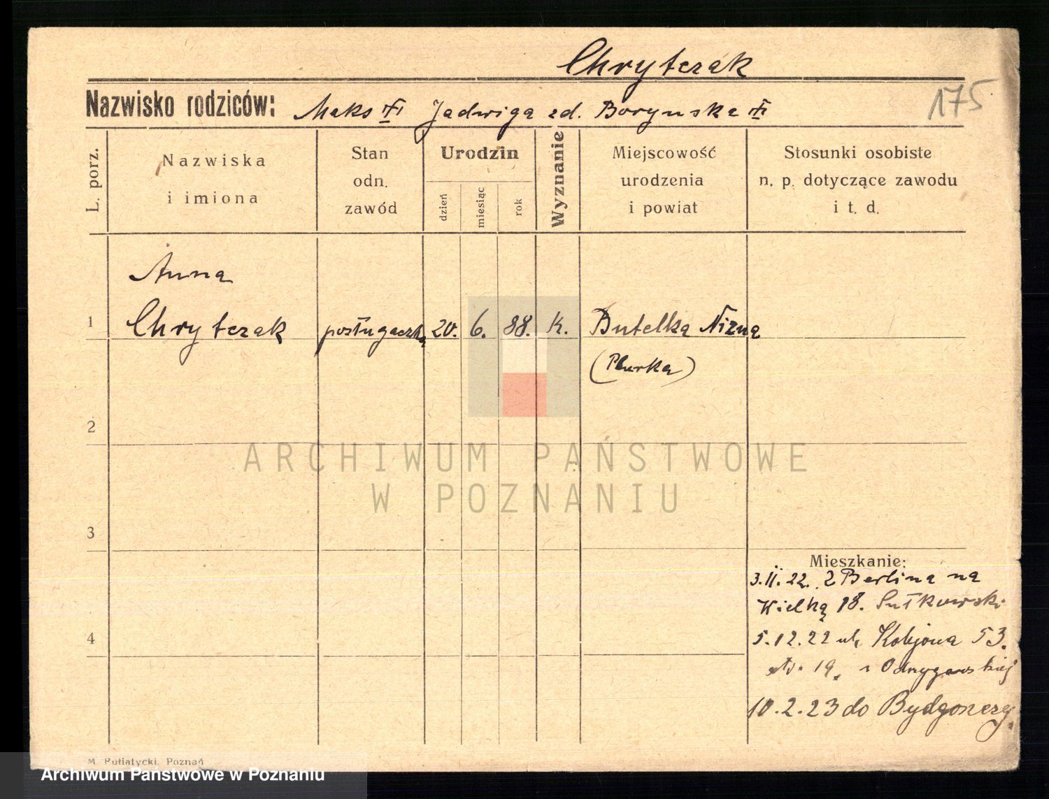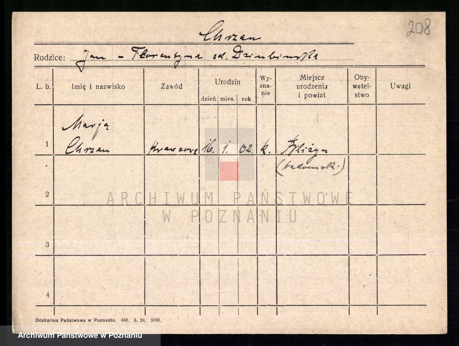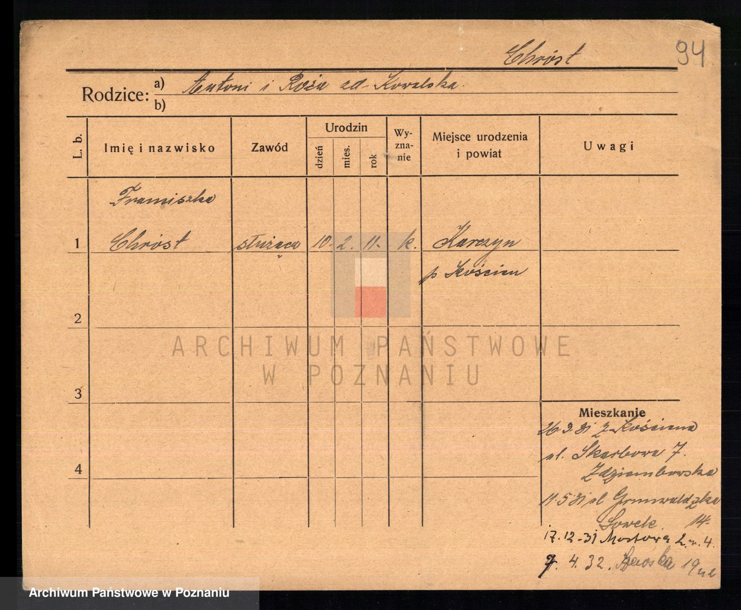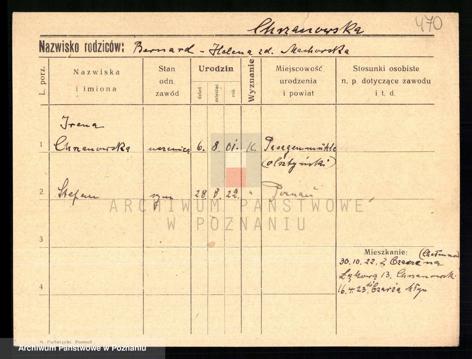 Podgląd karty osobowej dostępny jest po kliknięciu na nazwisko lub ikonkę karty. Można dokonywać powiększenia (ikony na górze) lub przechodzić między kolejnymi skanami (strzałki po bokach).