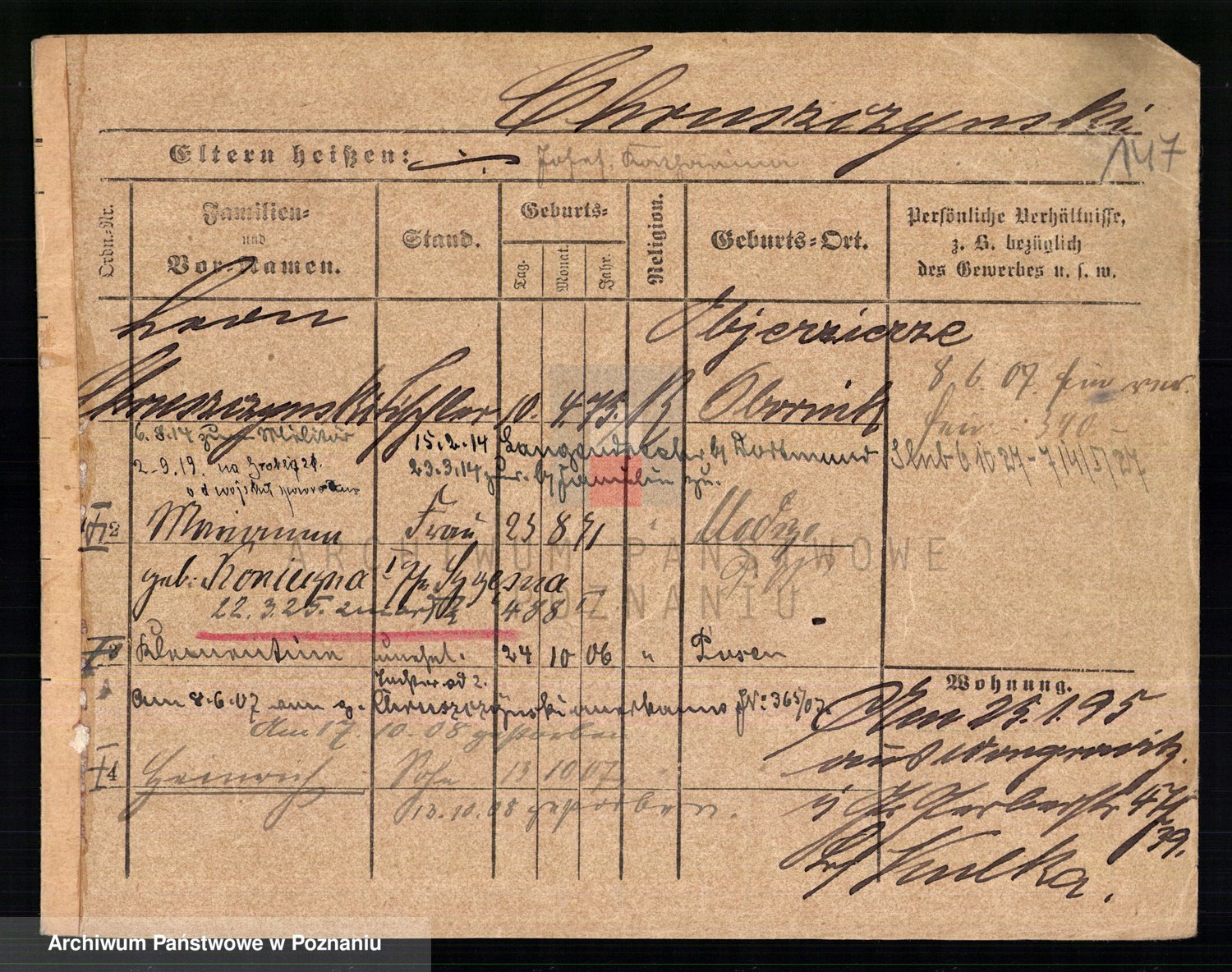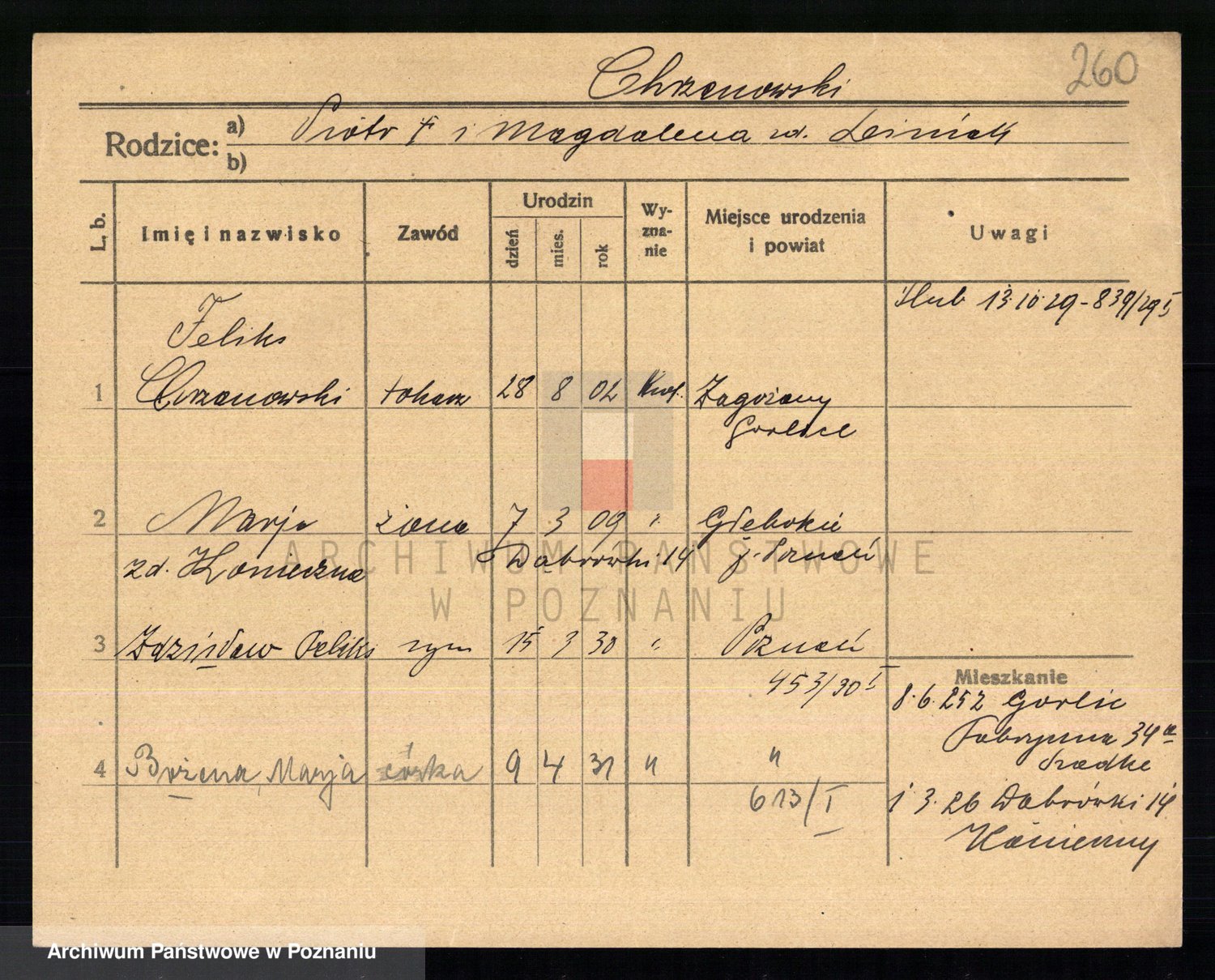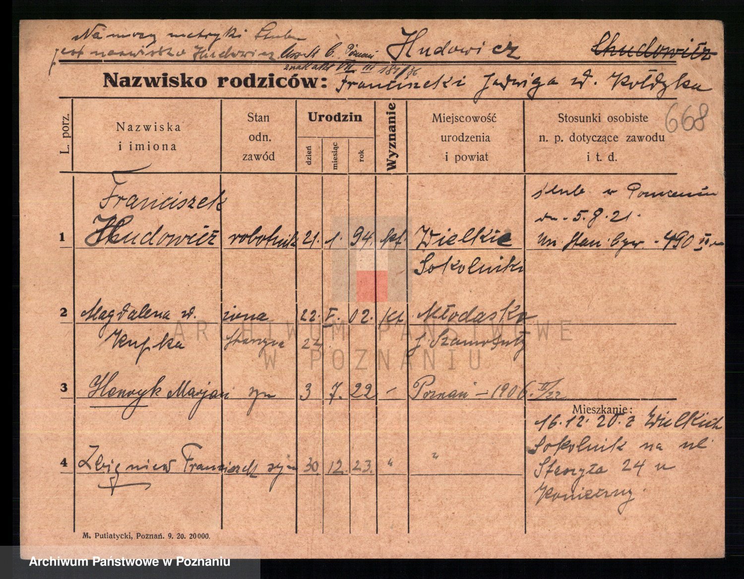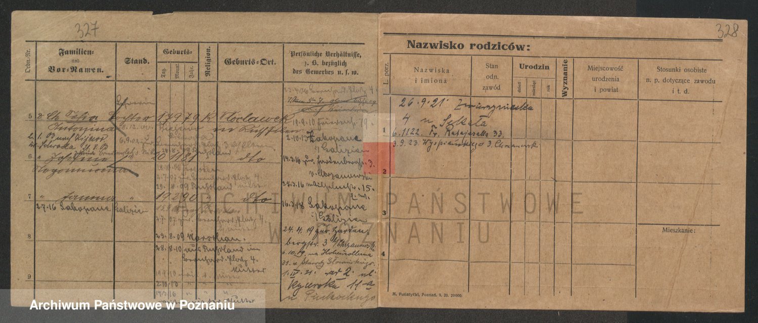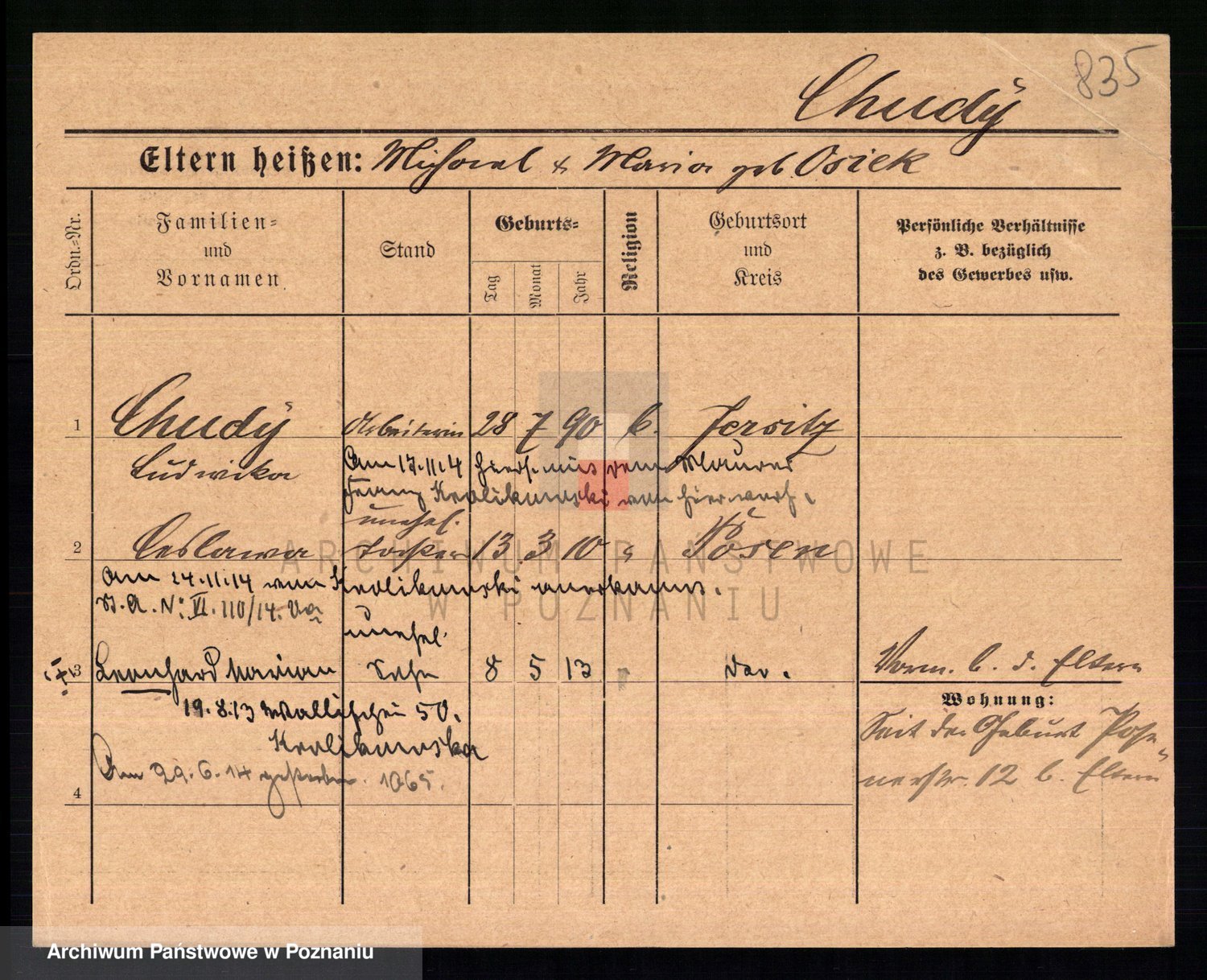 Podgląd karty osobowej dostępny jest po kliknięciu na nazwisko lub ikonkę karty. Można dokonywać powiększenia (ikony na górze) lub przechodzić między kolejnymi skanami (strzałki po bokach).