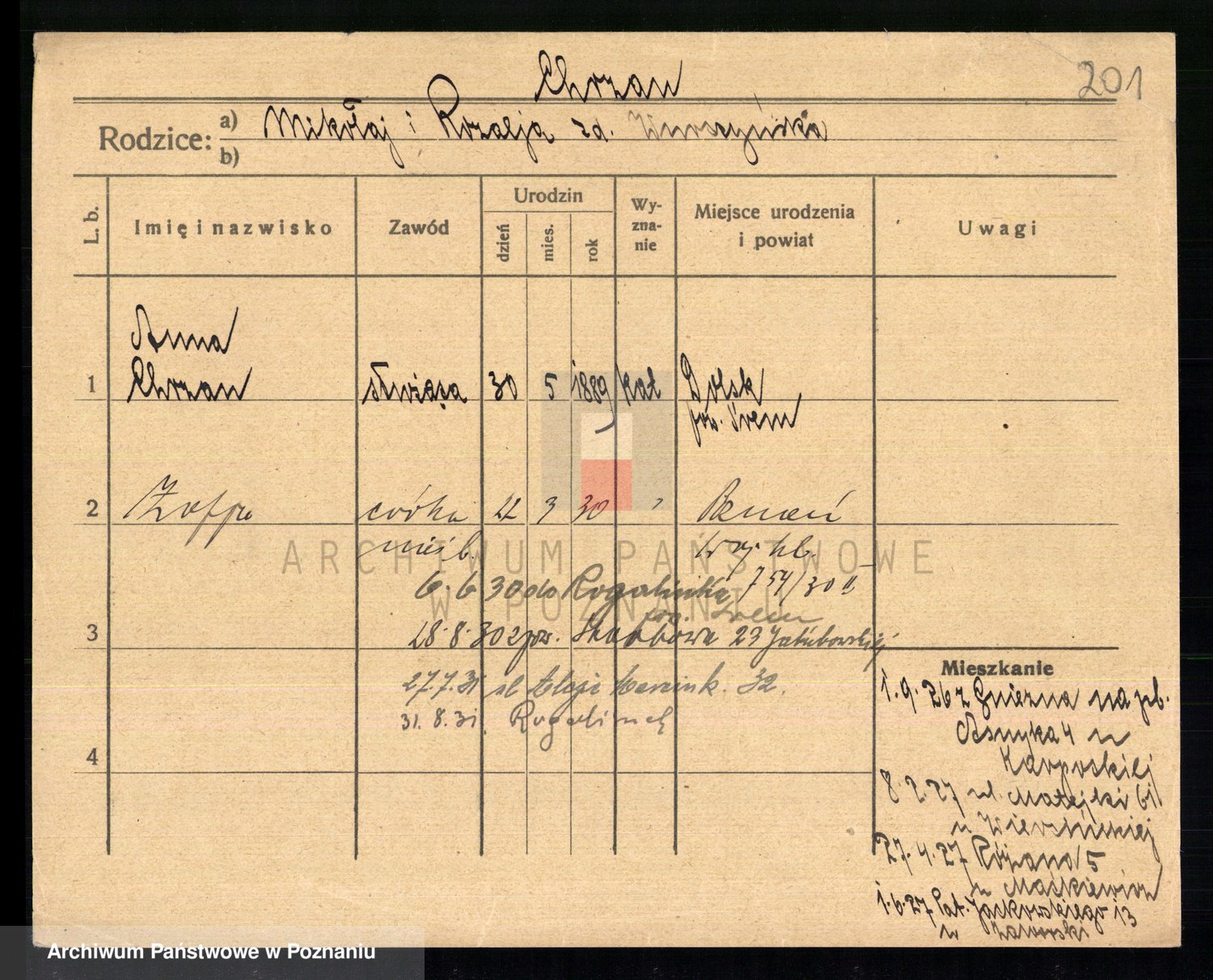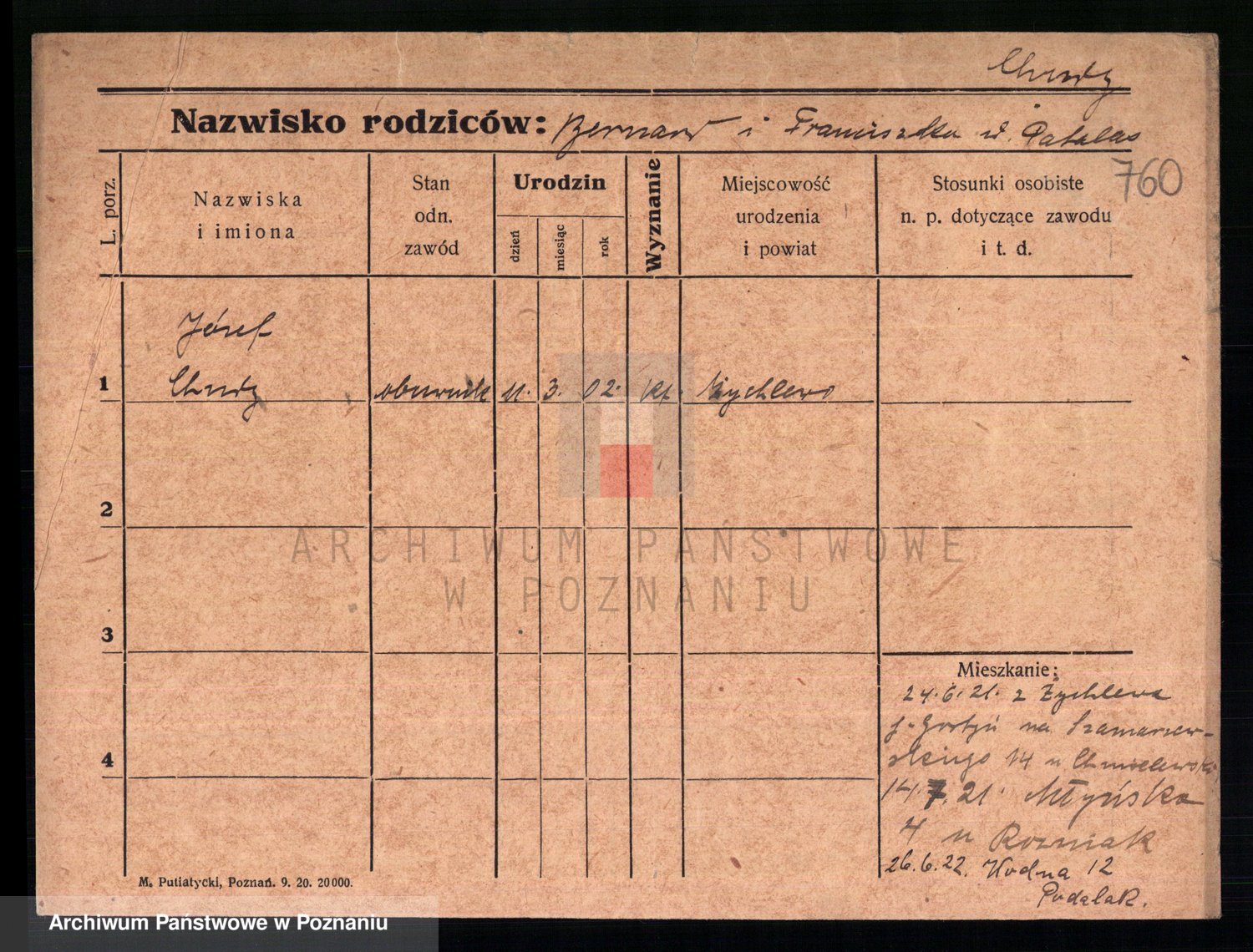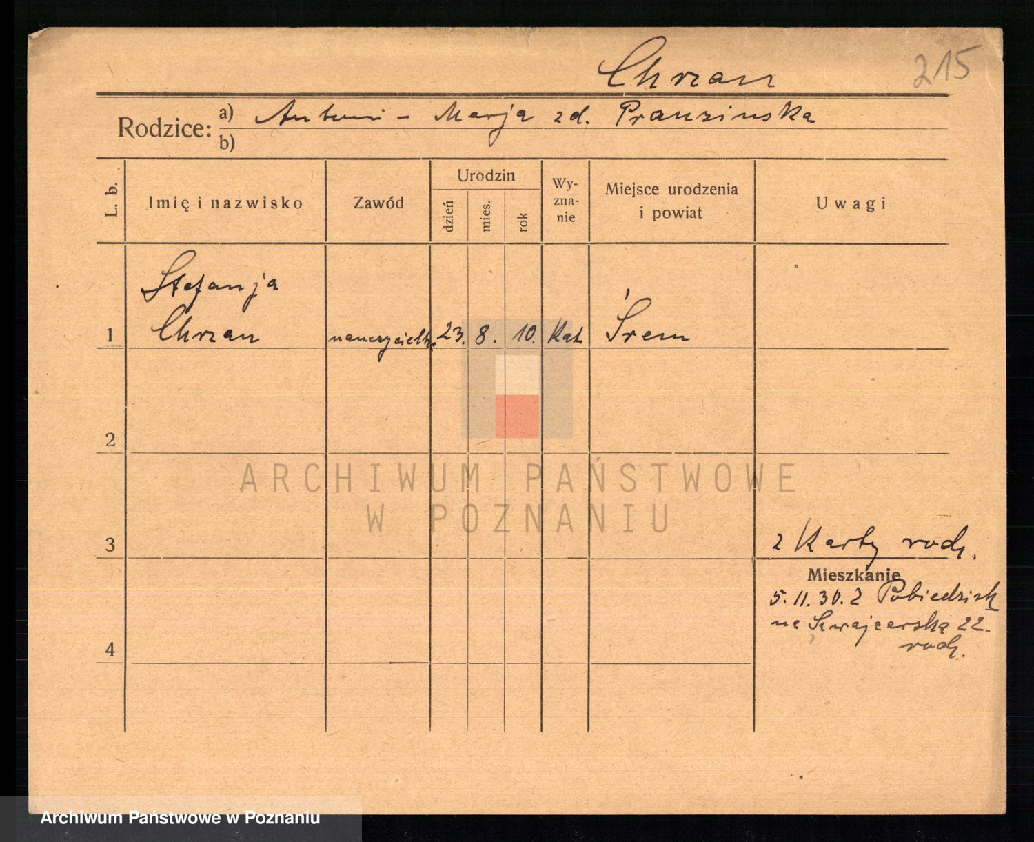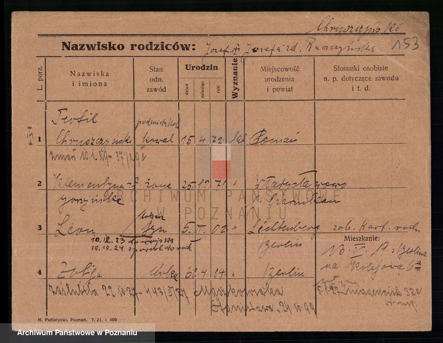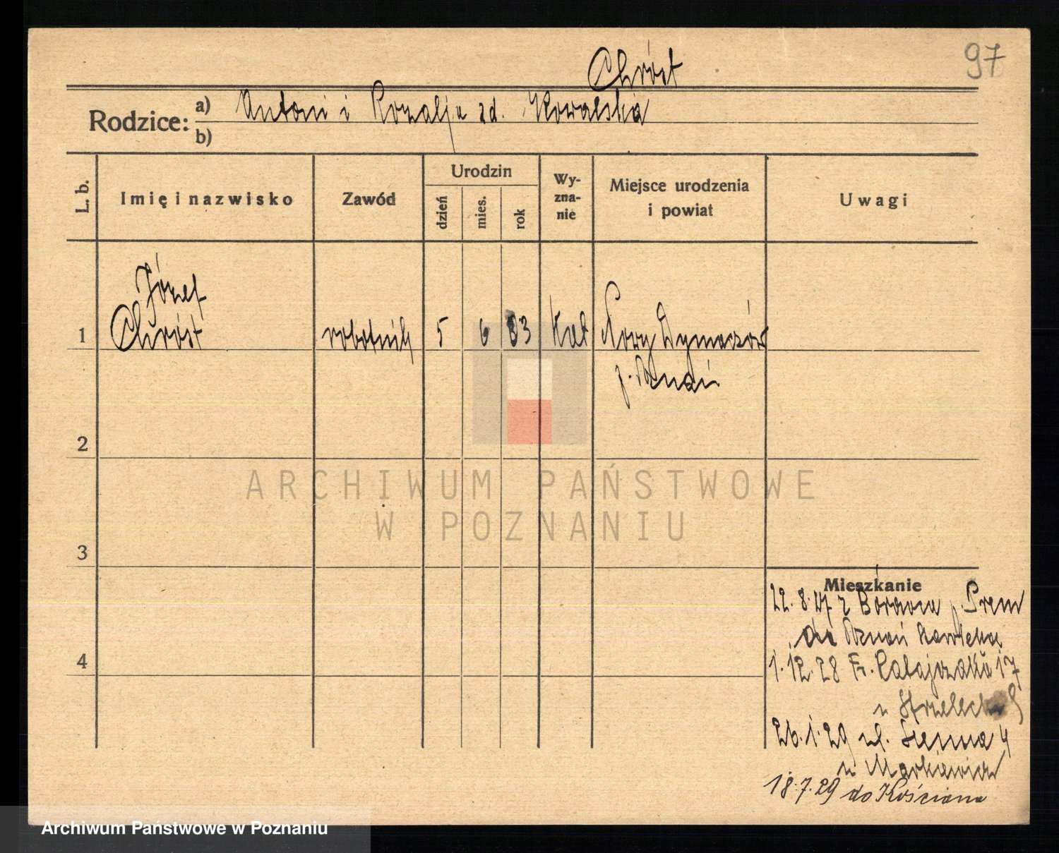 Podgląd karty osobowej dostępny jest po kliknięciu na nazwisko lub ikonkę karty. Można dokonywać powiększenia (ikony na górze) lub przechodzić między kolejnymi skanami (strzałki po bokach).