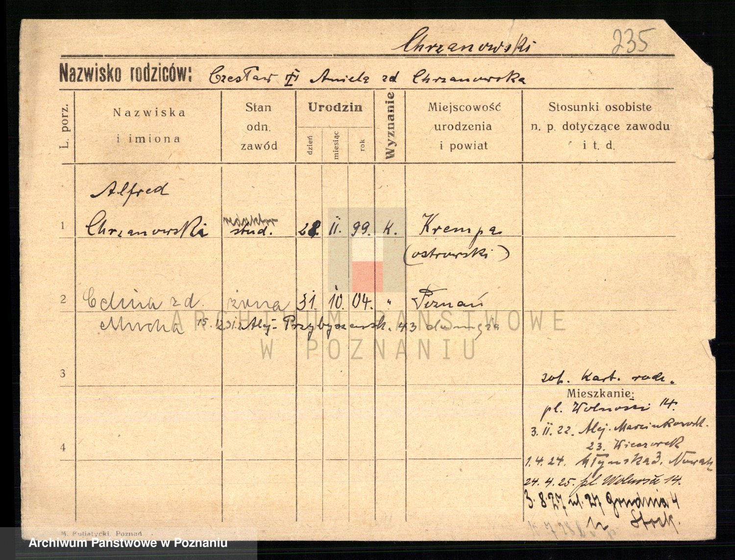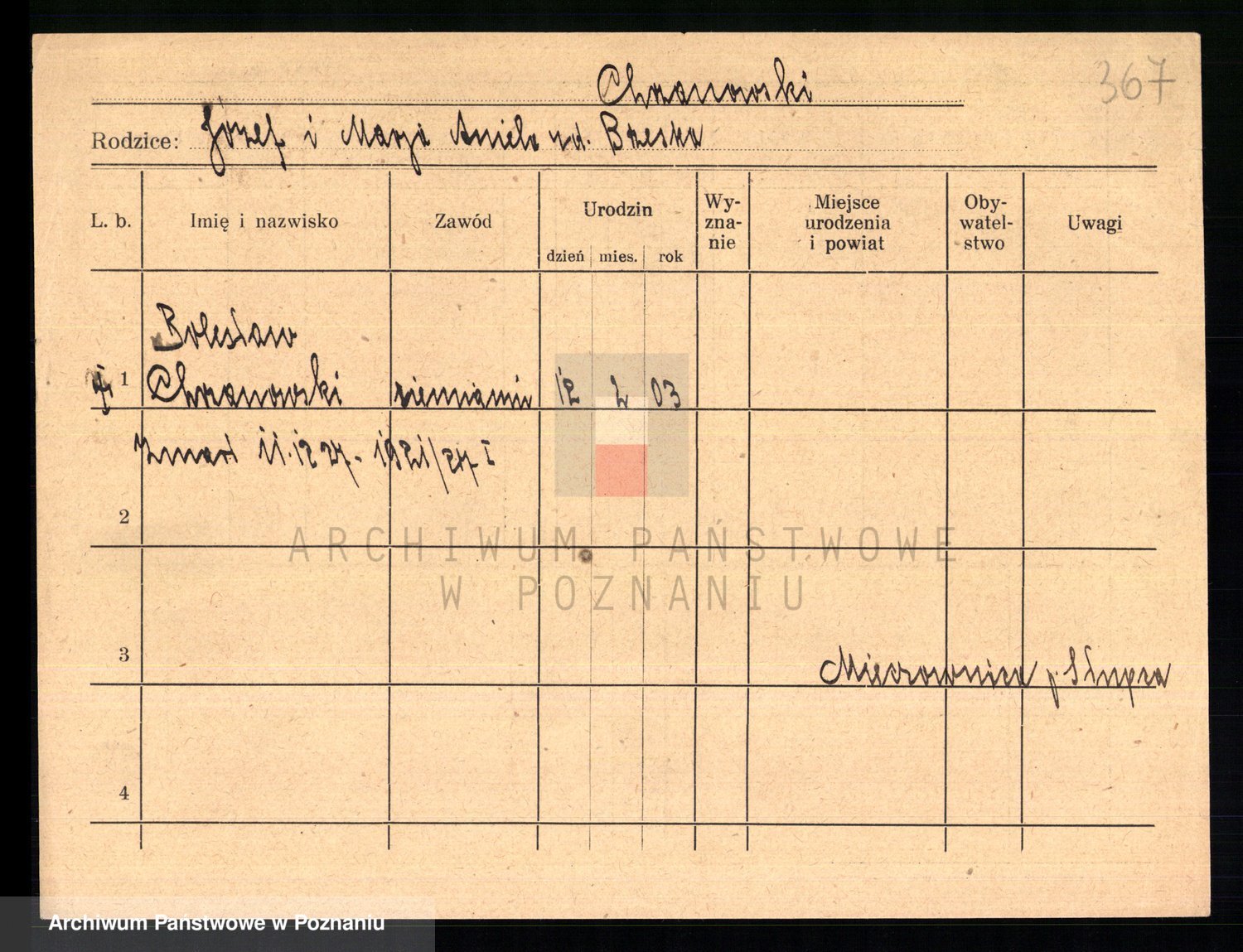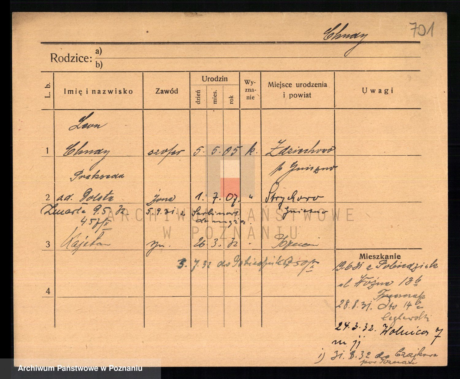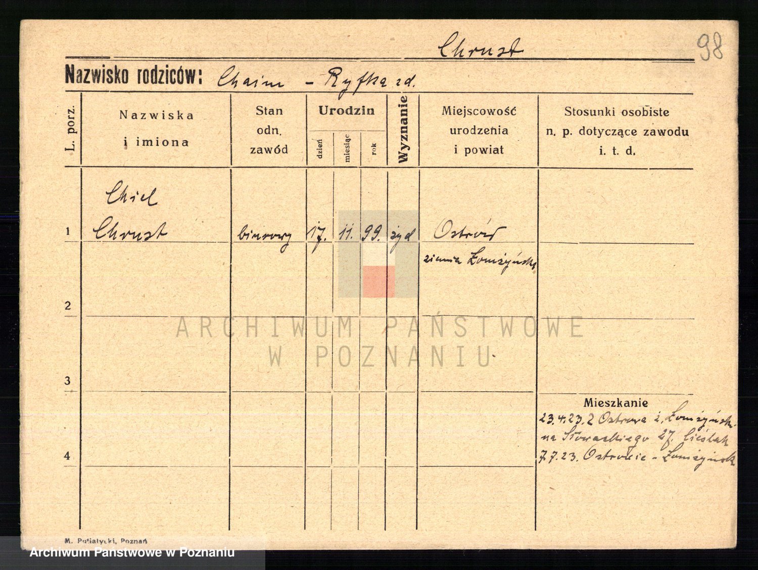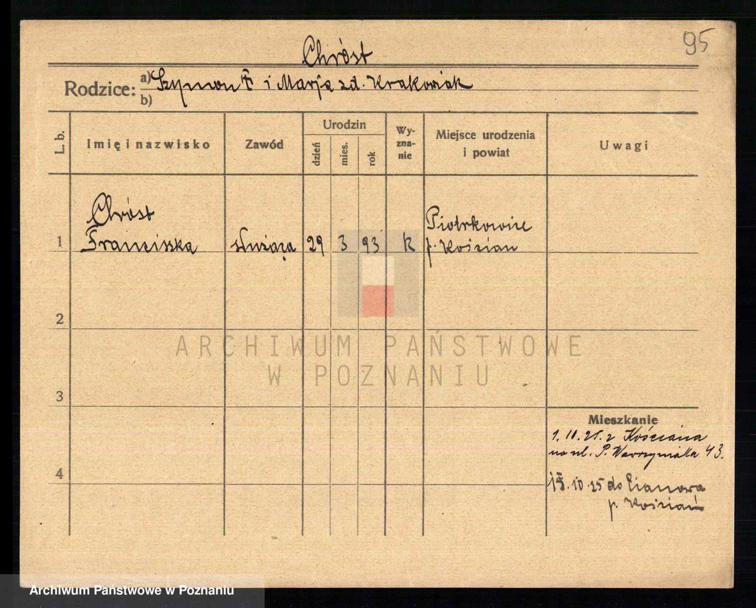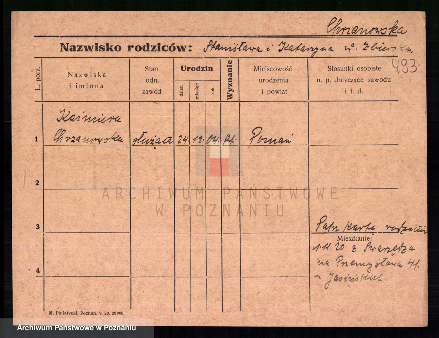 Podgląd karty osobowej dostępny jest po kliknięciu na nazwisko lub ikonkę karty. Można dokonywać powiększenia (ikony na górze) lub przechodzić między kolejnymi skanami (strzałki po bokach).