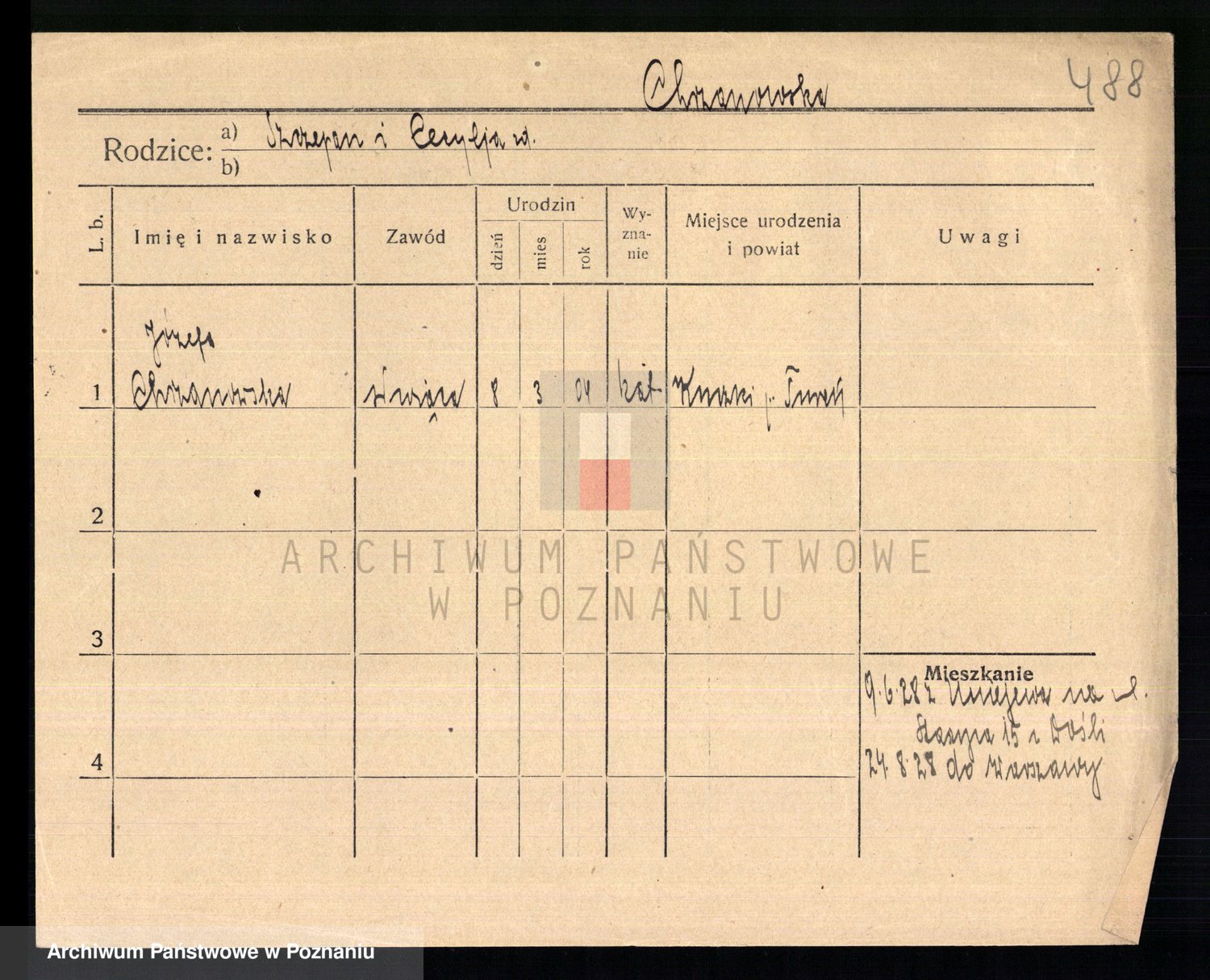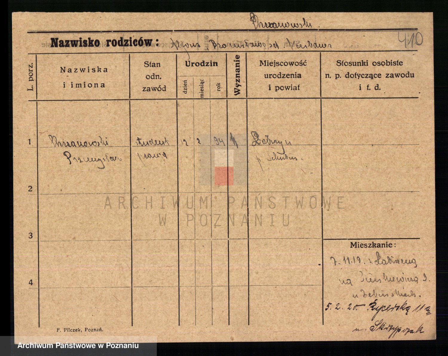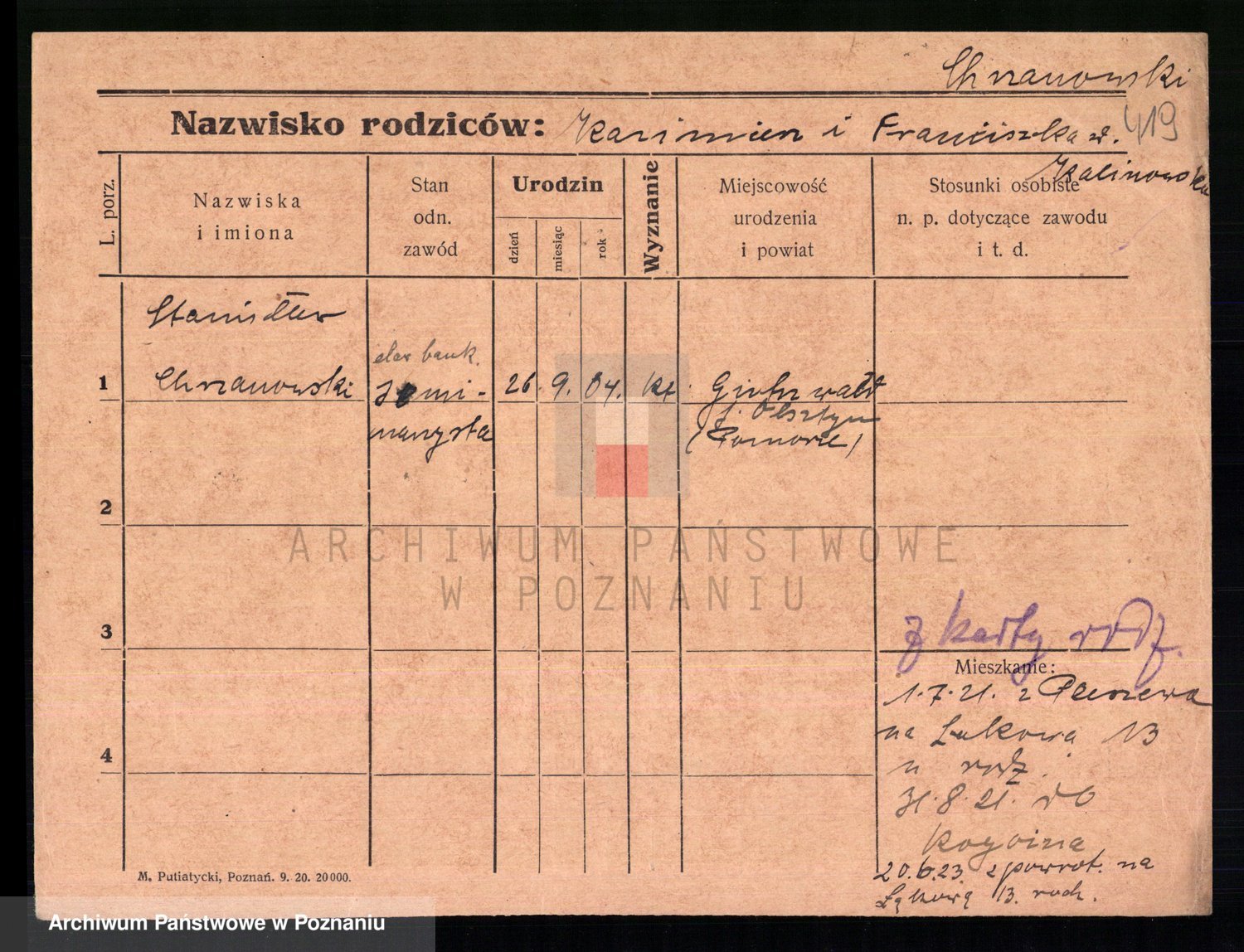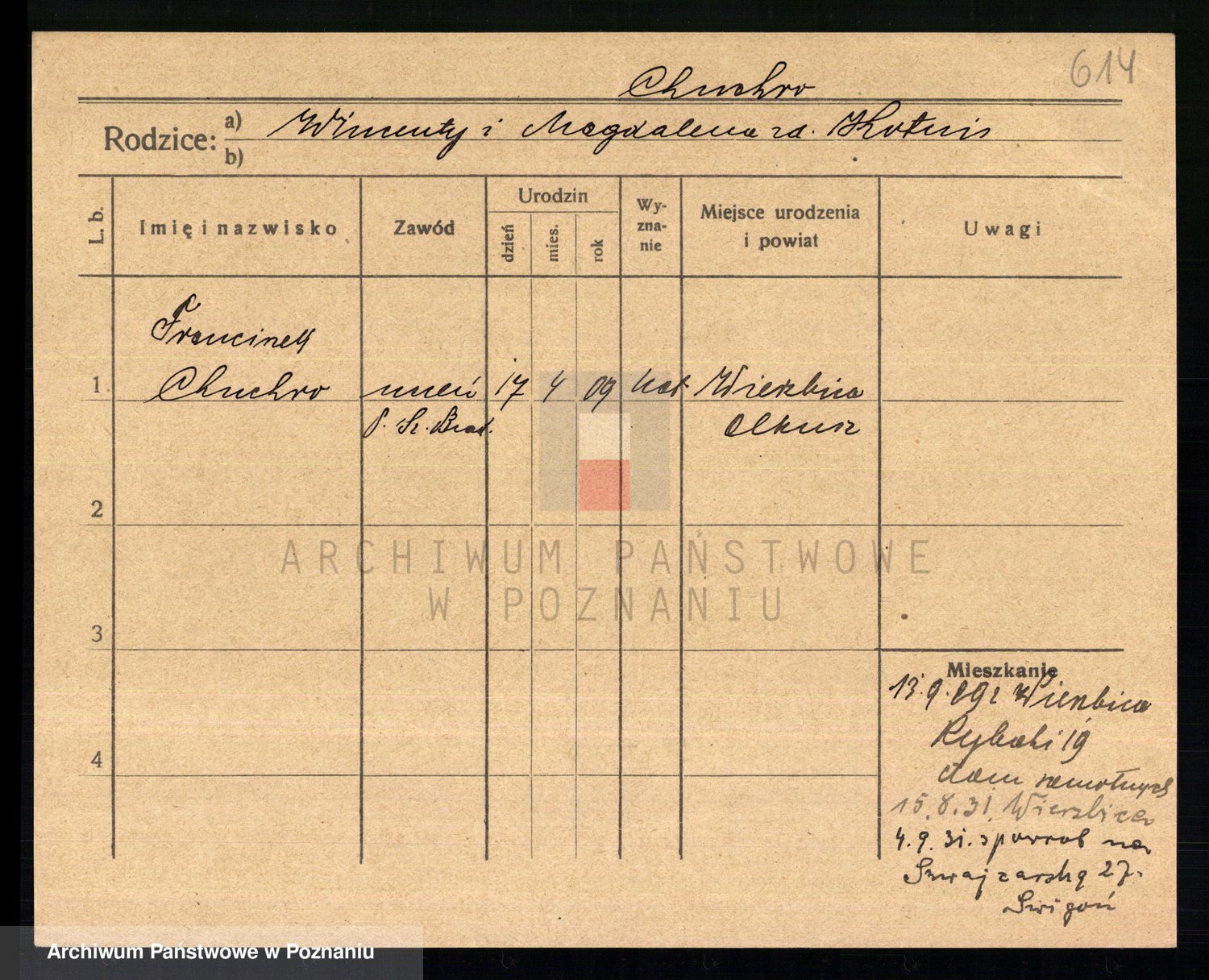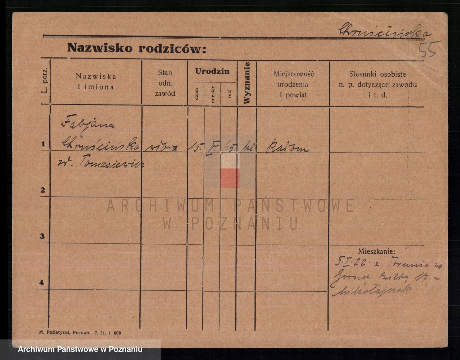 Podgląd karty osobowej dostępny jest po kliknięciu na nazwisko lub ikonkę karty. Można dokonywać powiększenia (ikony na górze) lub przechodzić między kolejnymi skanami (strzałki po bokach).
