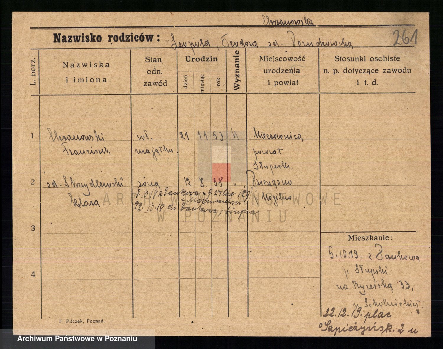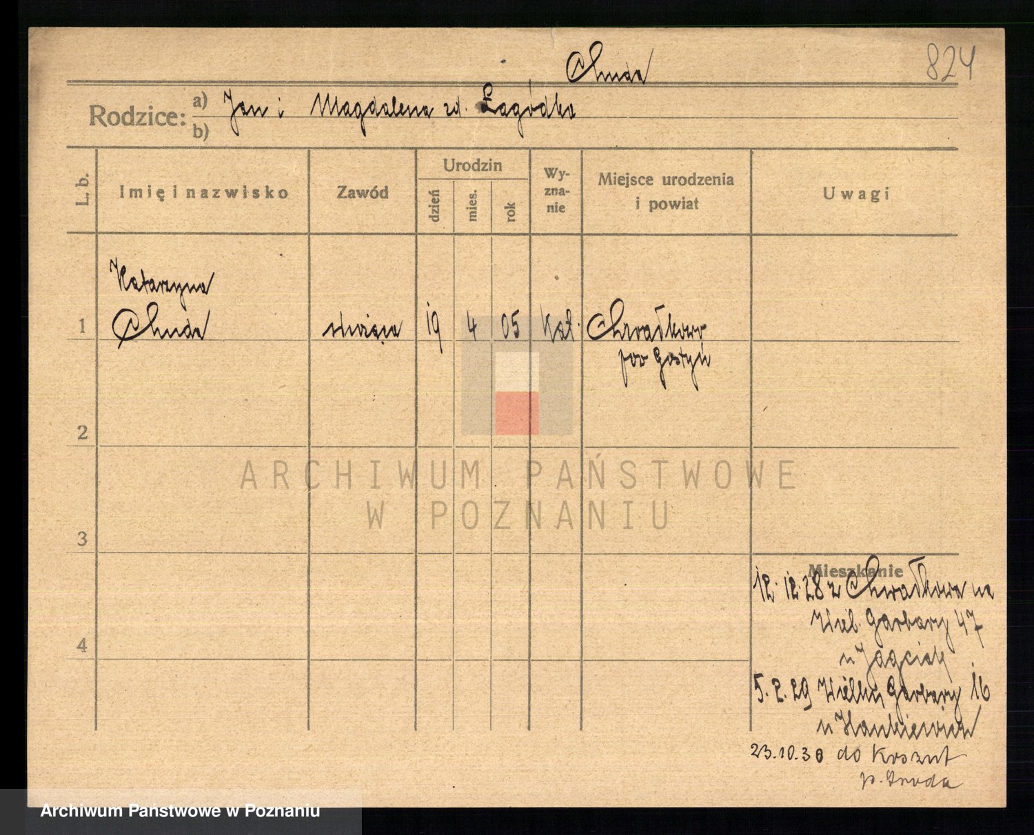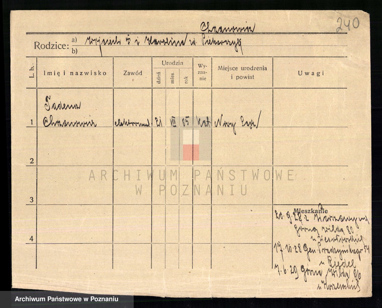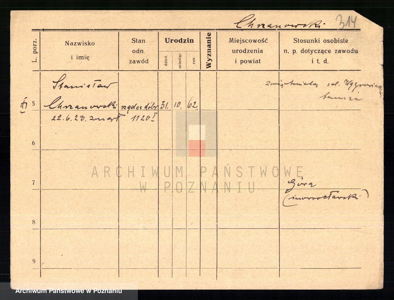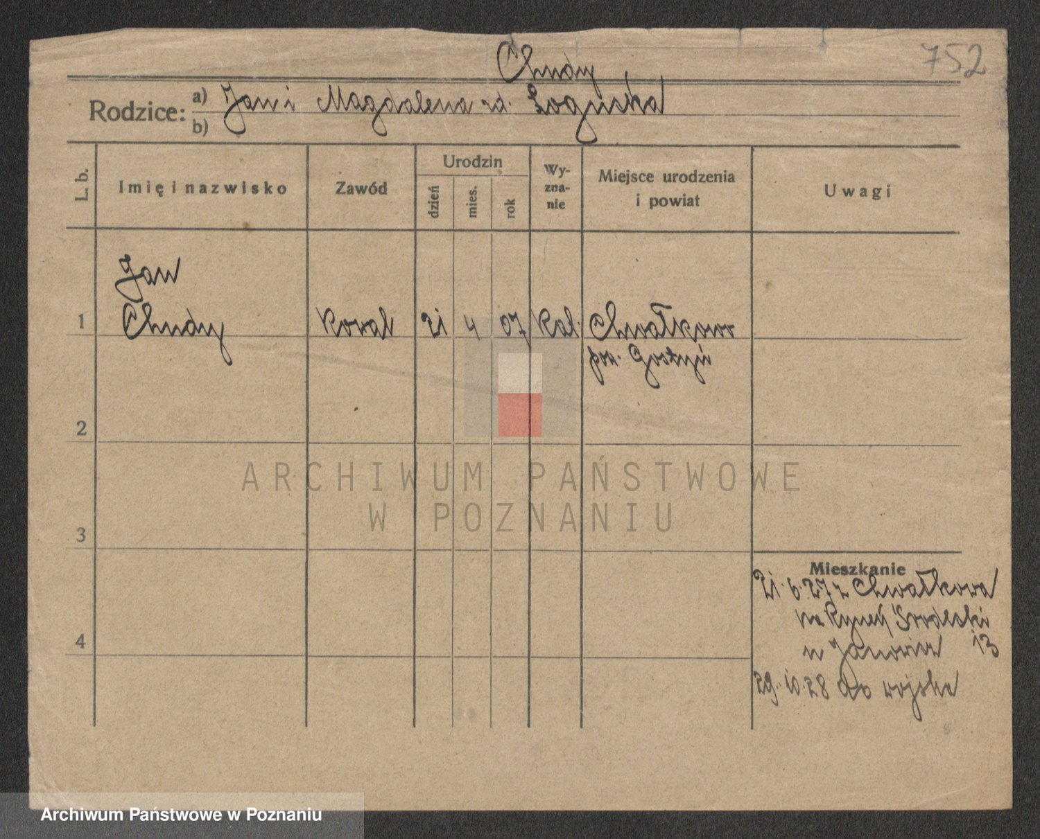 Podgląd karty osobowej dostępny jest po kliknięciu na nazwisko lub ikonkę karty. Można dokonywać powiększenia (ikony na górze) lub przechodzić między kolejnymi skanami (strzałki po bokach).