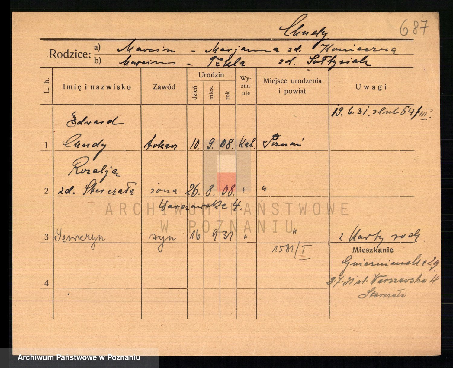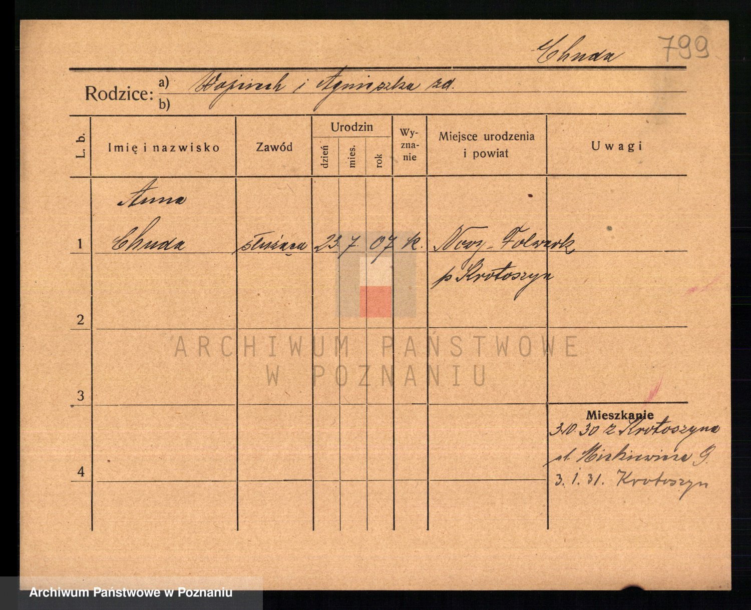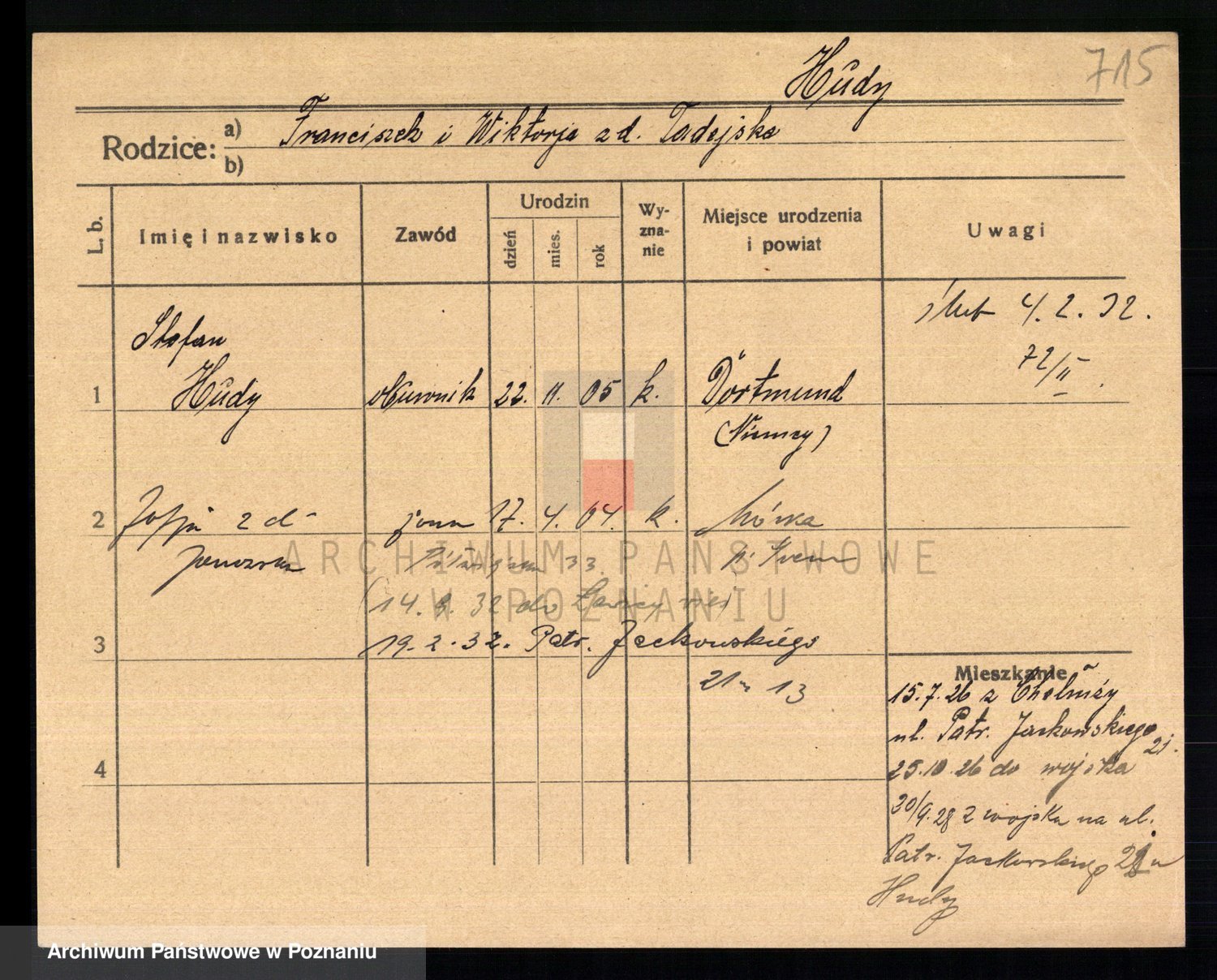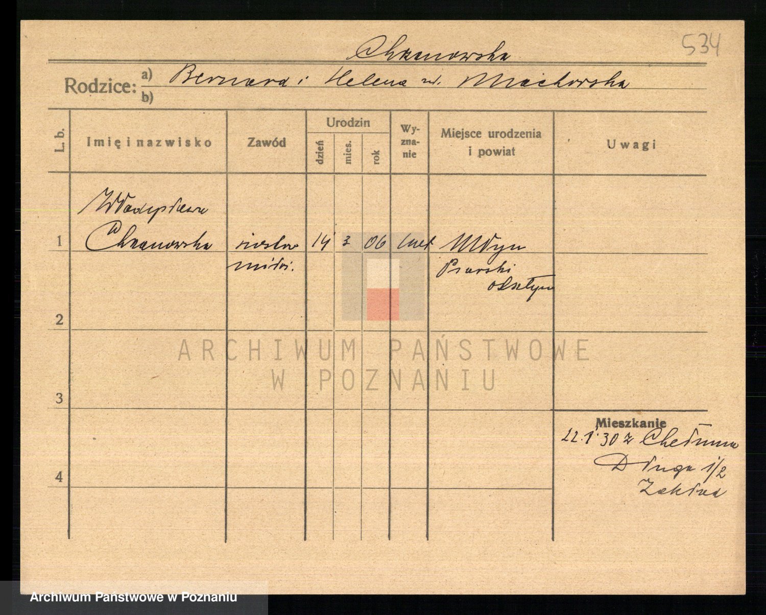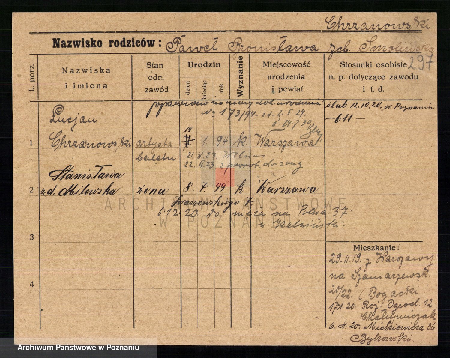 Podgląd karty osobowej dostępny jest po kliknięciu na nazwisko lub ikonkę karty. Można dokonywać powiększenia (ikony na górze) lub przechodzić między kolejnymi skanami (strzałki po bokach).