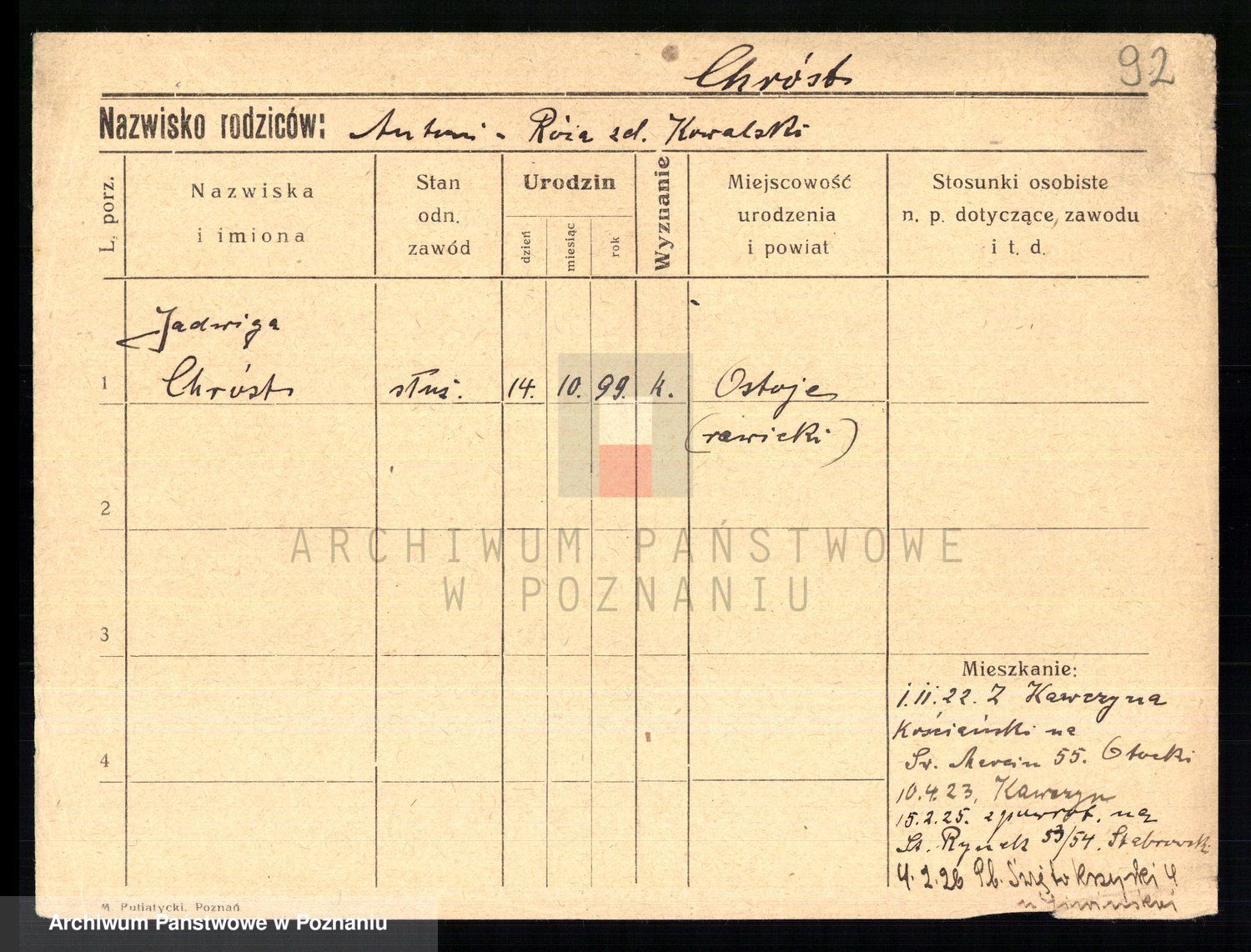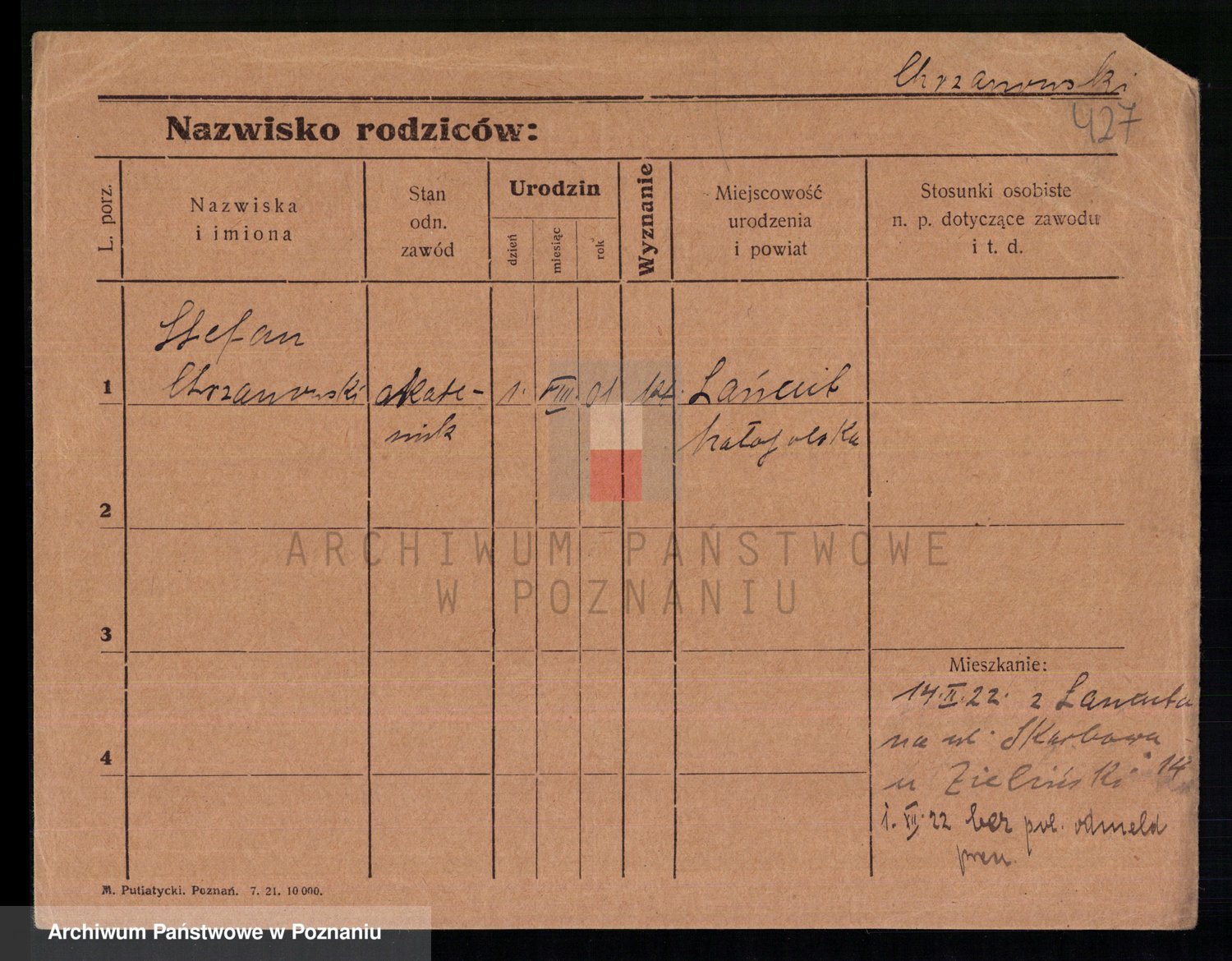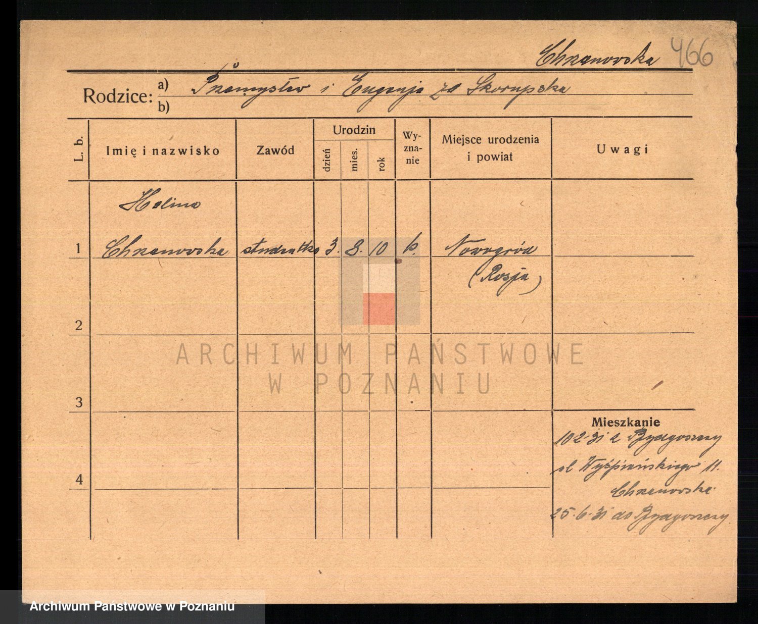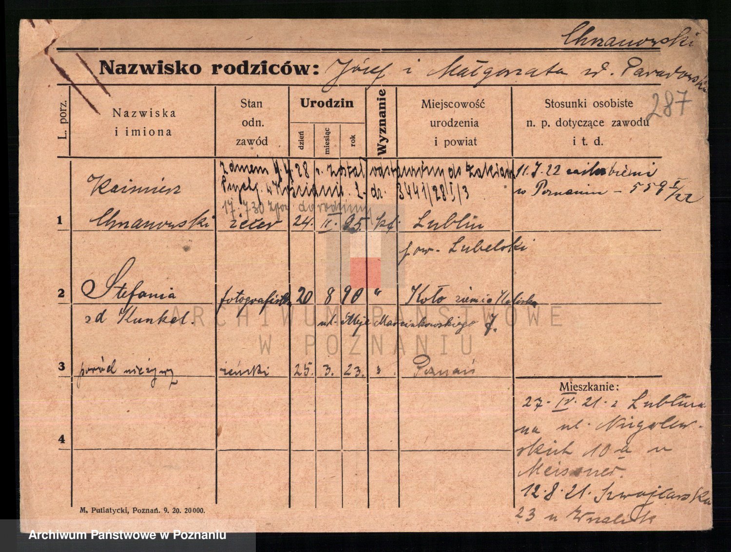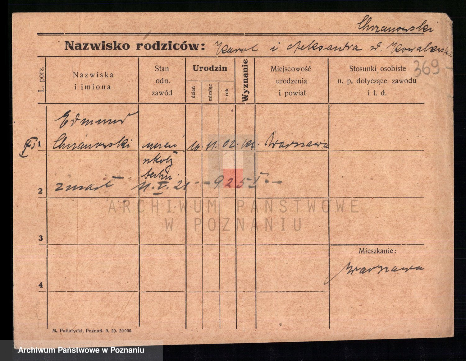 Podgląd karty osobowej dostępny jest po kliknięciu na nazwisko lub ikonkę karty. Można dokonywać powiększenia (ikony na górze) lub przechodzić między kolejnymi skanami (strzałki po bokach).