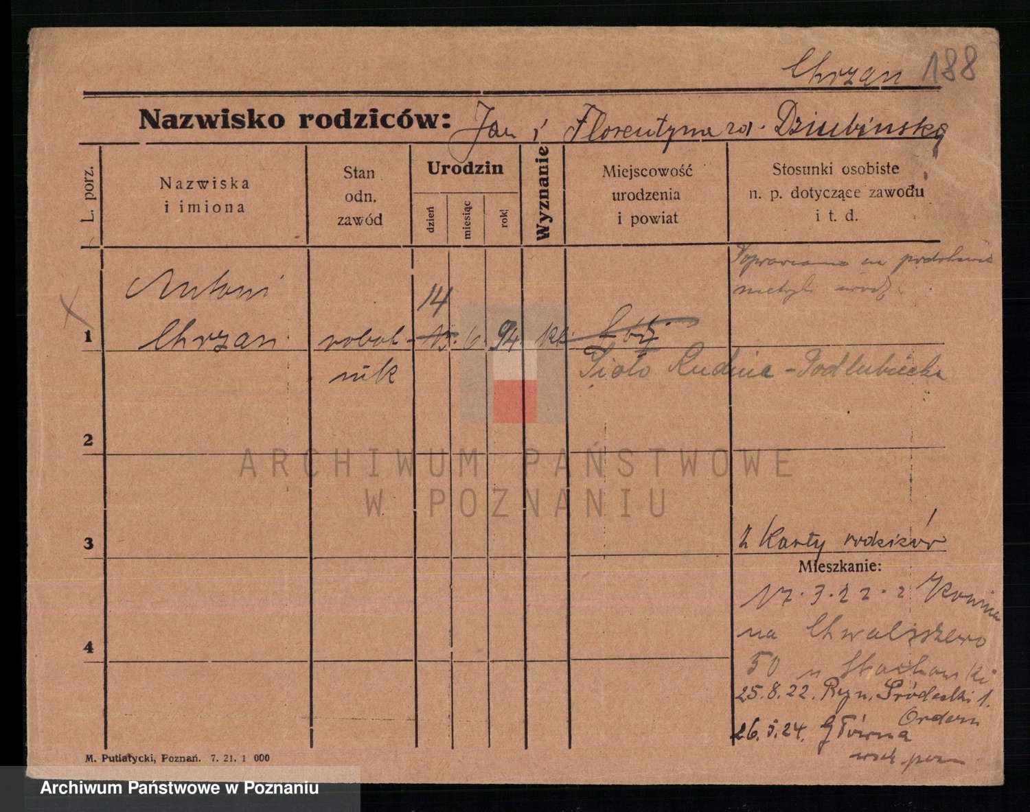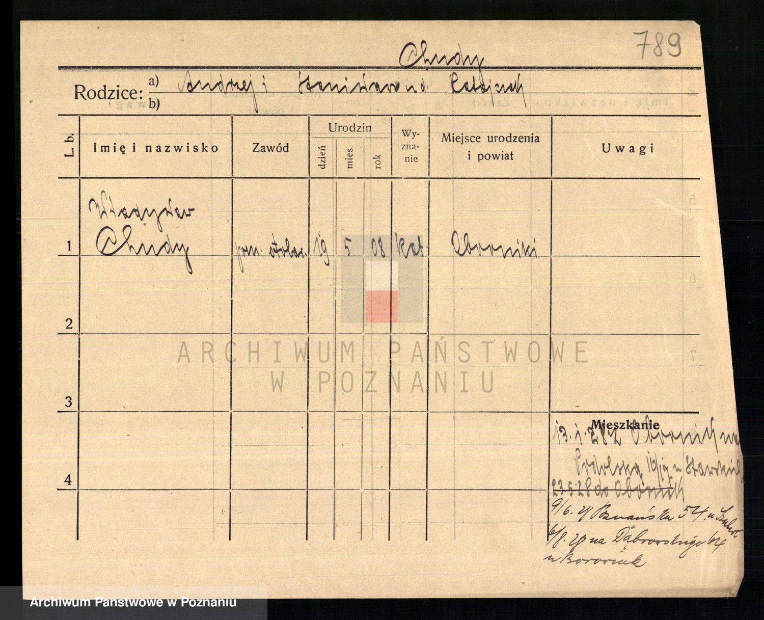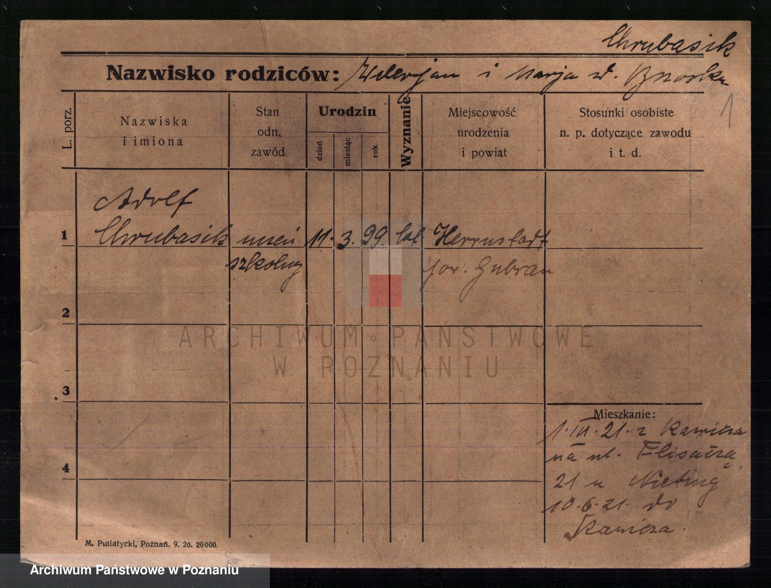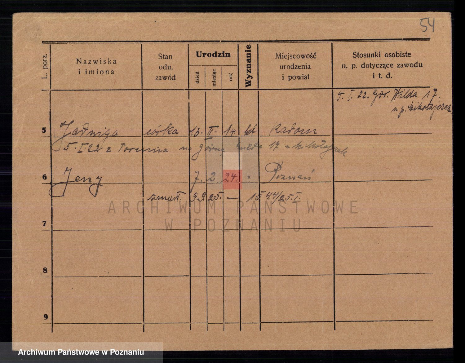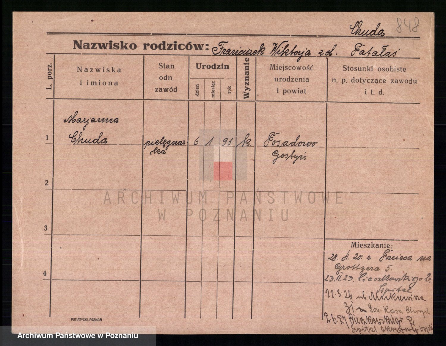 Podgląd karty osobowej dostępny jest po kliknięciu na nazwisko lub ikonkę karty. Można dokonywać powiększenia (ikony na górze) lub przechodzić między kolejnymi skanami (strzałki po bokach).
