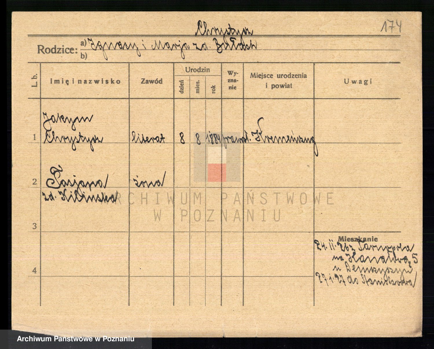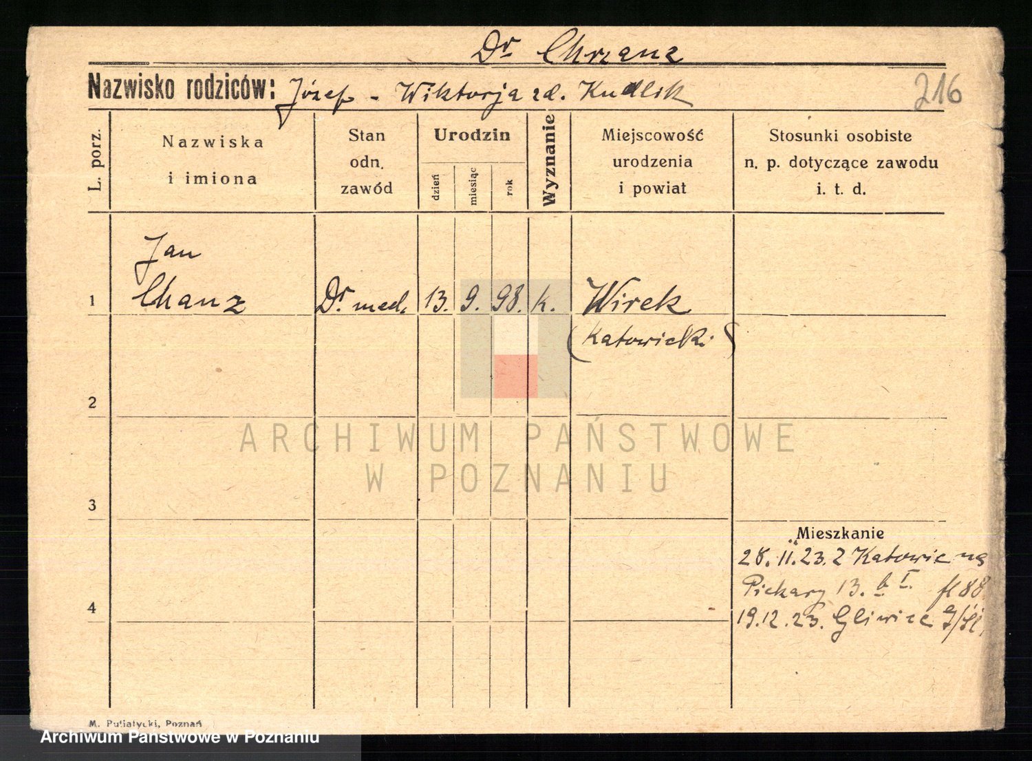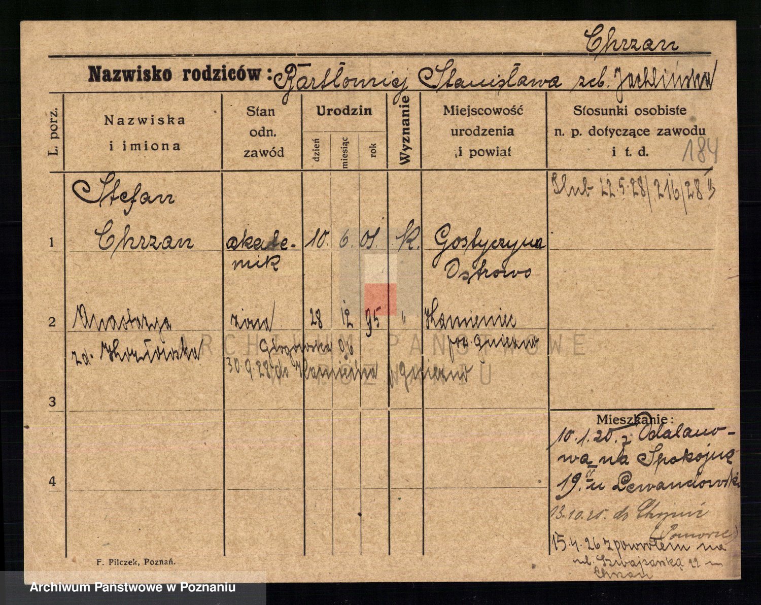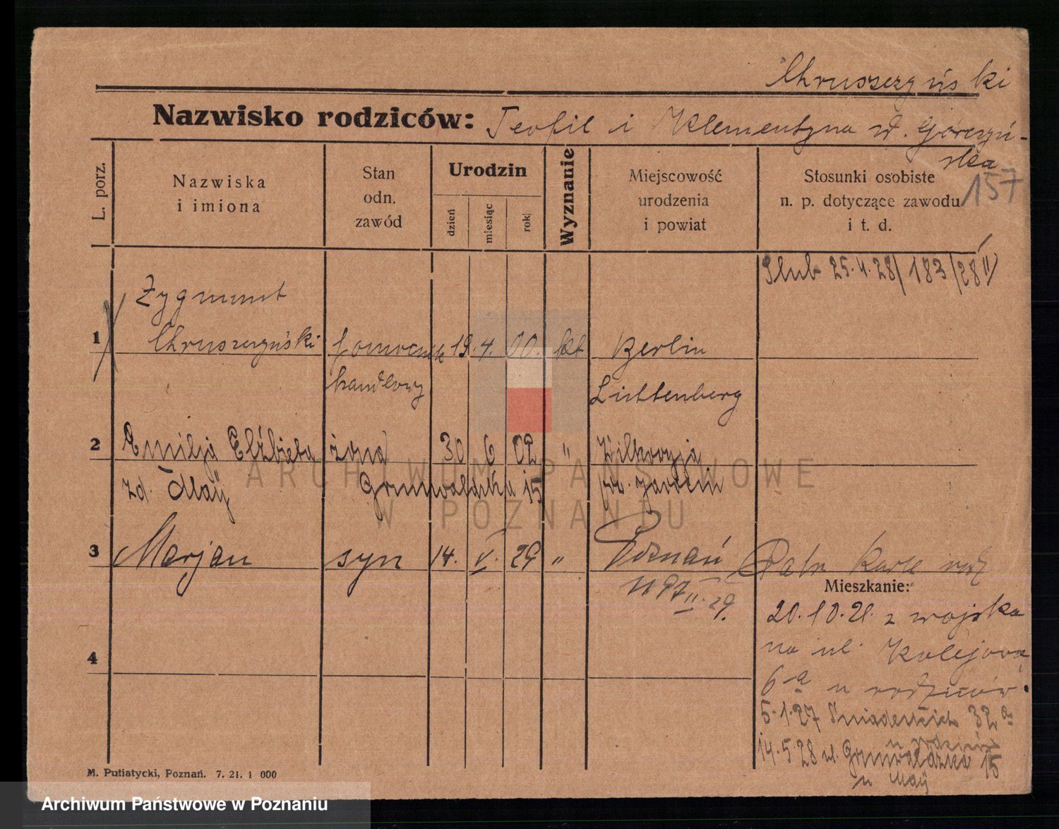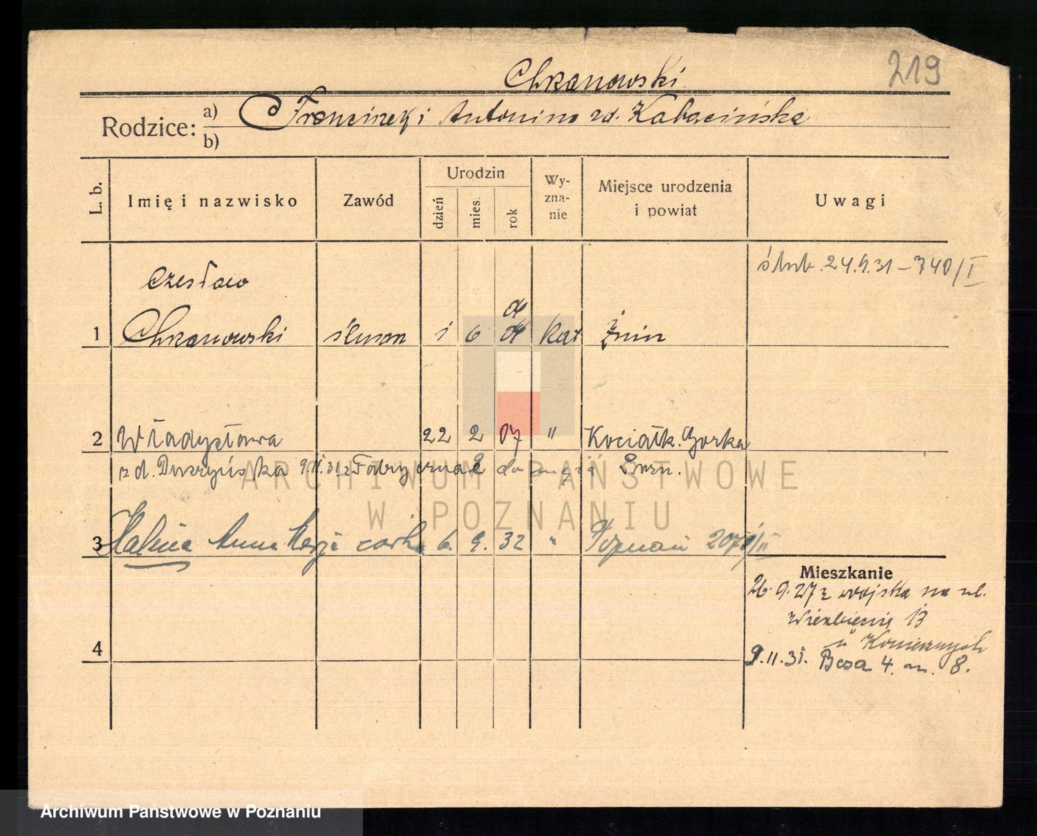 Podgląd karty osobowej dostępny jest po kliknięciu na nazwisko lub ikonkę karty. Można dokonywać powiększenia (ikony na górze) lub przechodzić między kolejnymi skanami (strzałki po bokach).