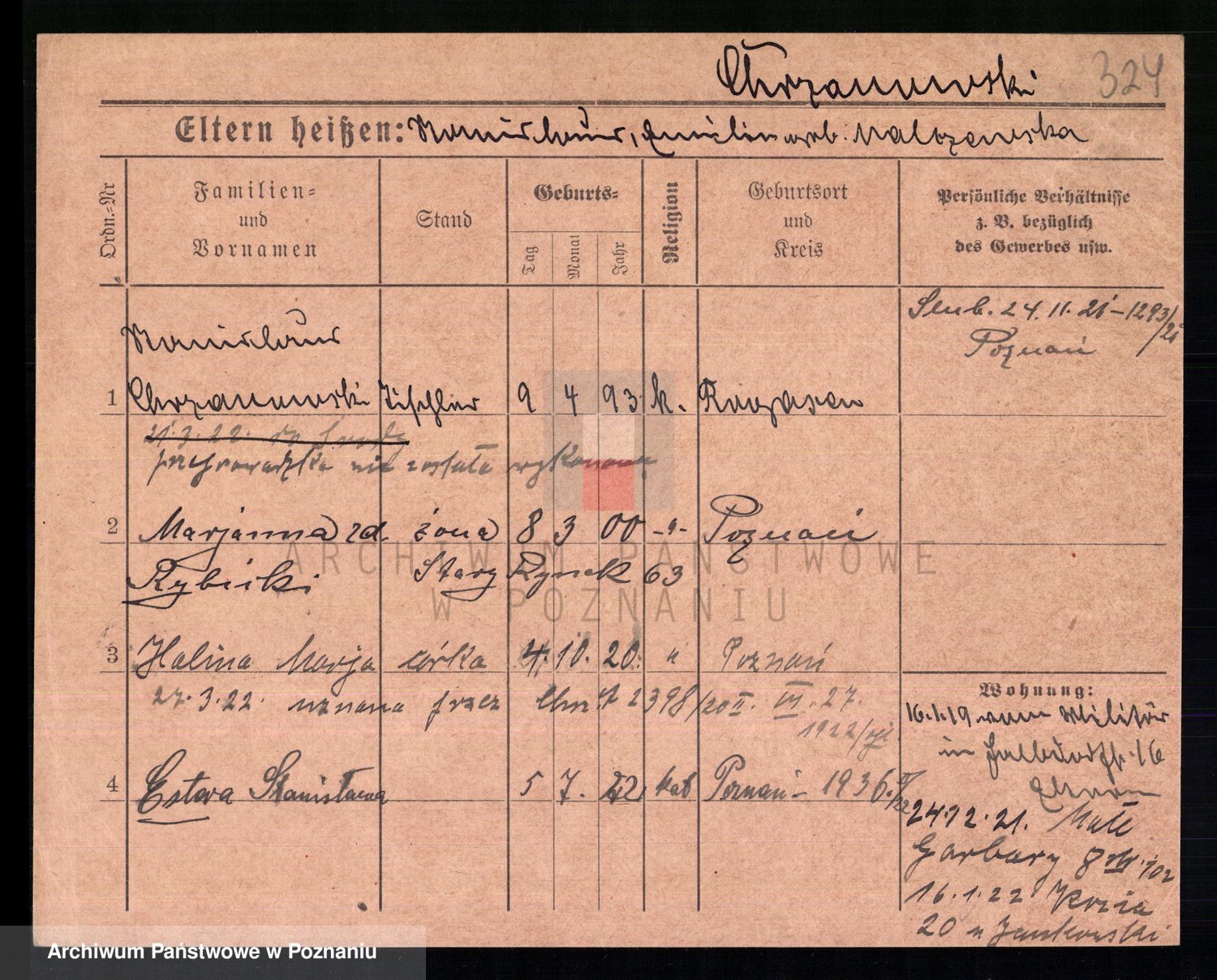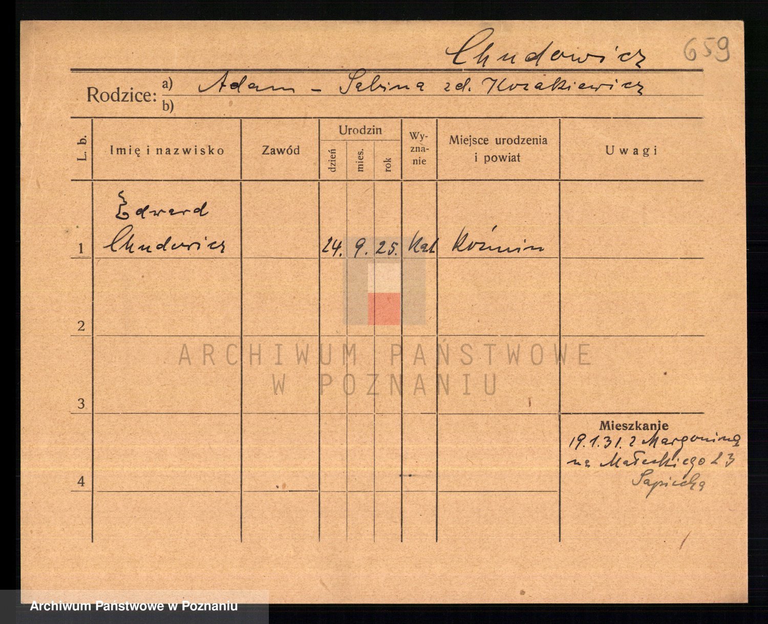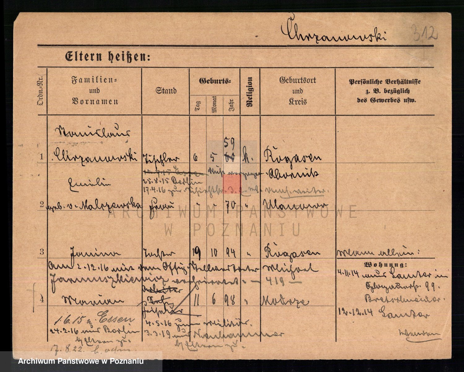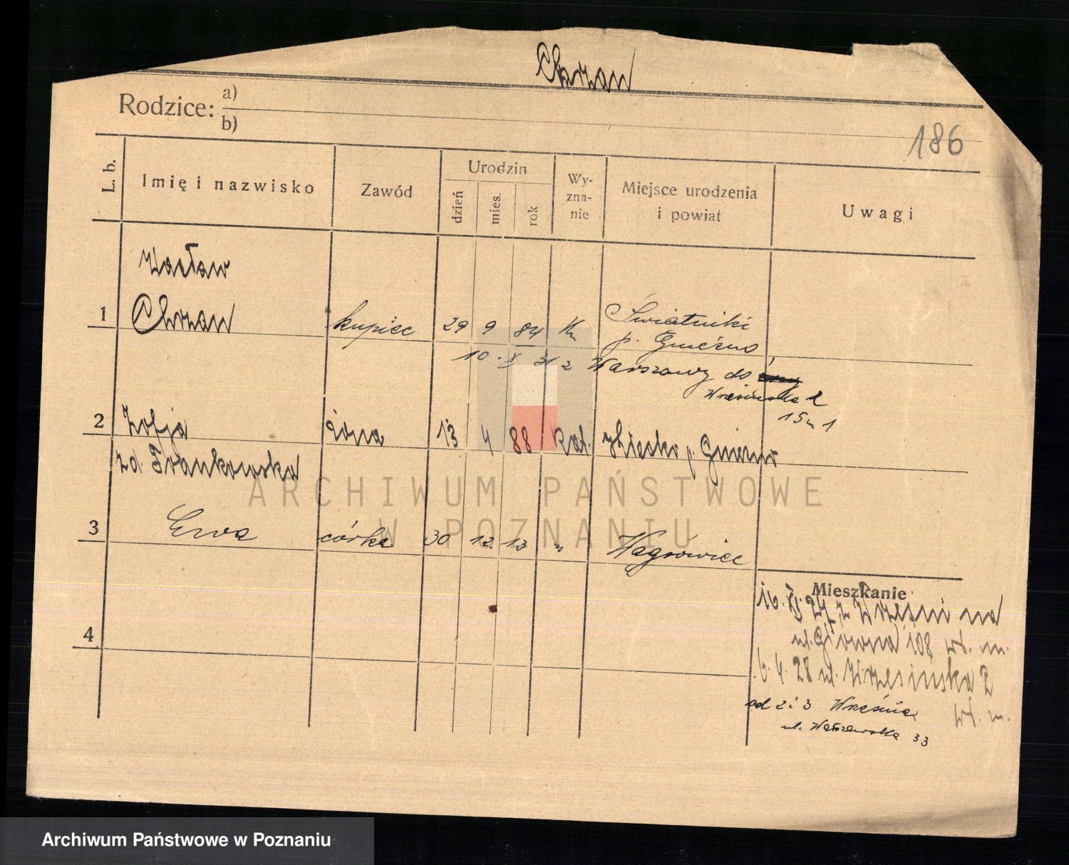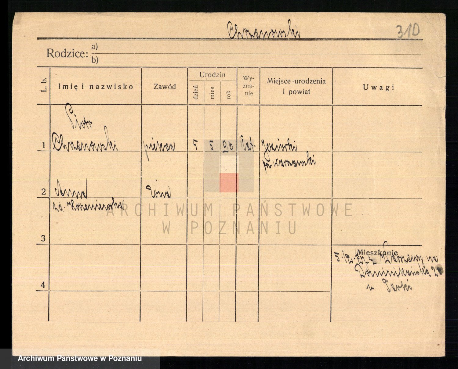 Podgląd karty osobowej dostępny jest po kliknięciu na nazwisko lub ikonkę karty. Można dokonywać powiększenia (ikony na górze) lub przechodzić między kolejnymi skanami (strzałki po bokach).