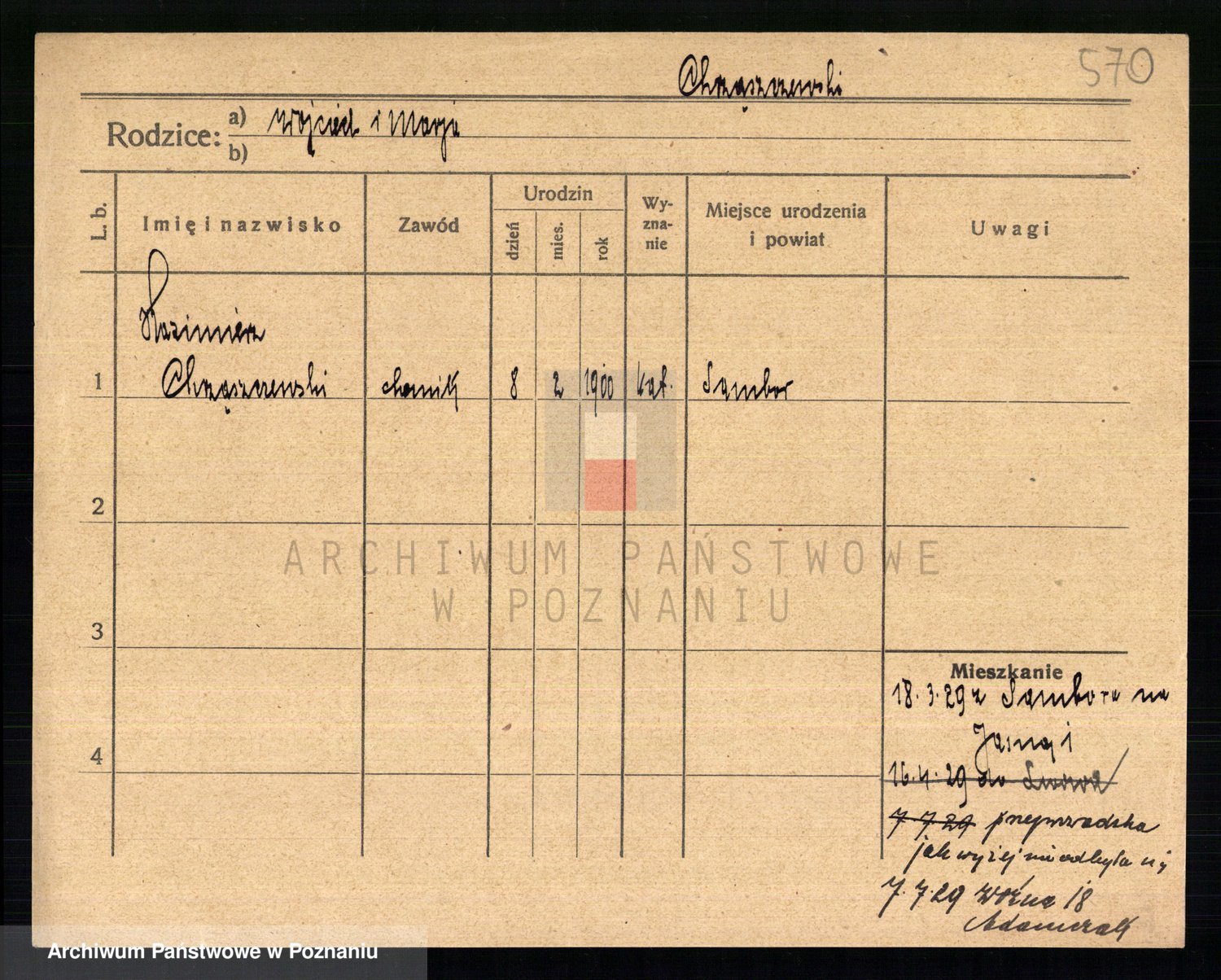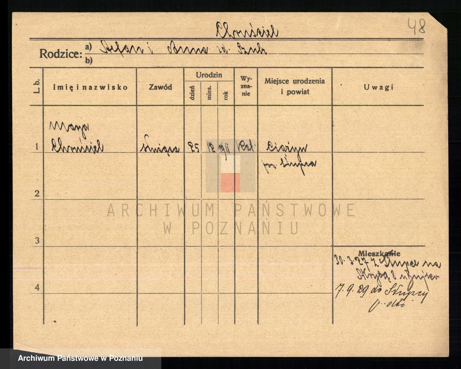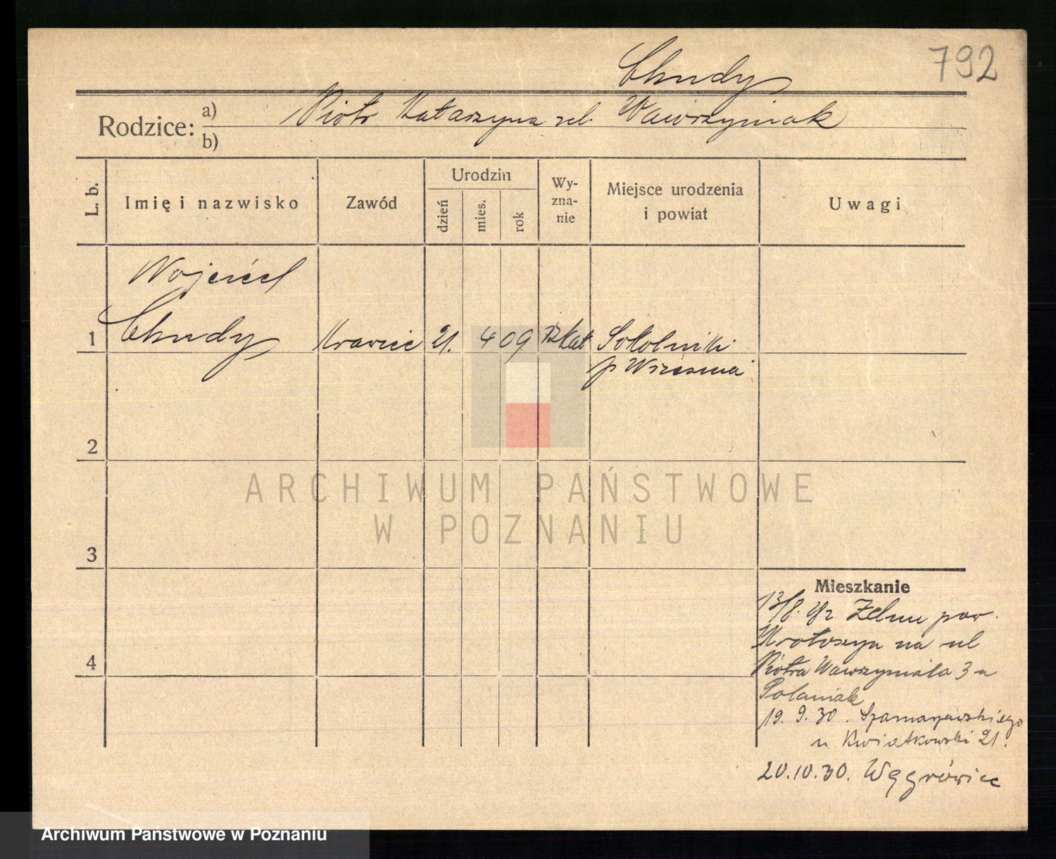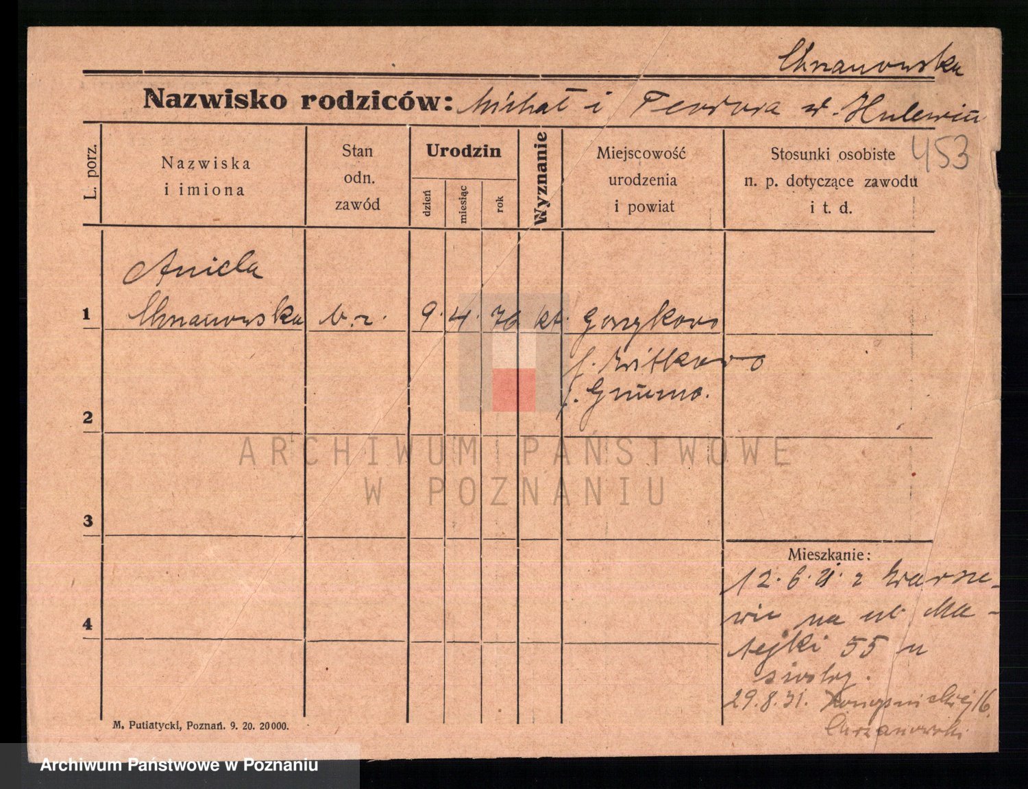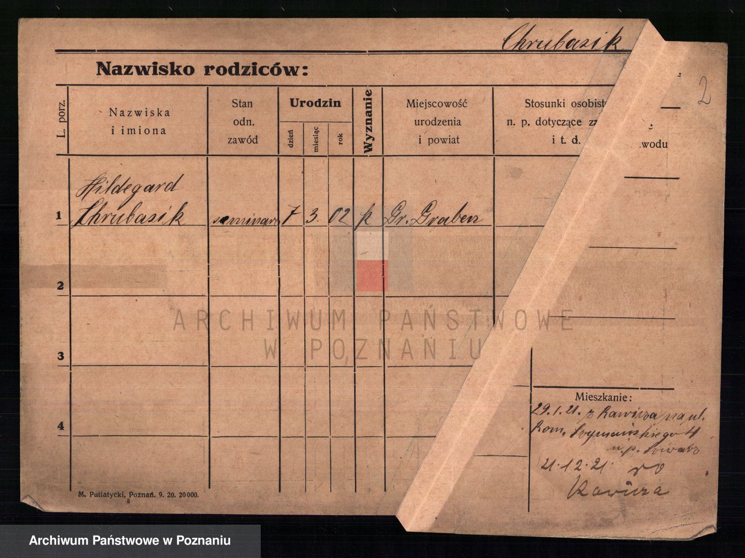 Podgląd karty osobowej dostępny jest po kliknięciu na nazwisko lub ikonkę karty. Można dokonywać powiększenia (ikony na górze) lub przechodzić między kolejnymi skanami (strzałki po bokach).