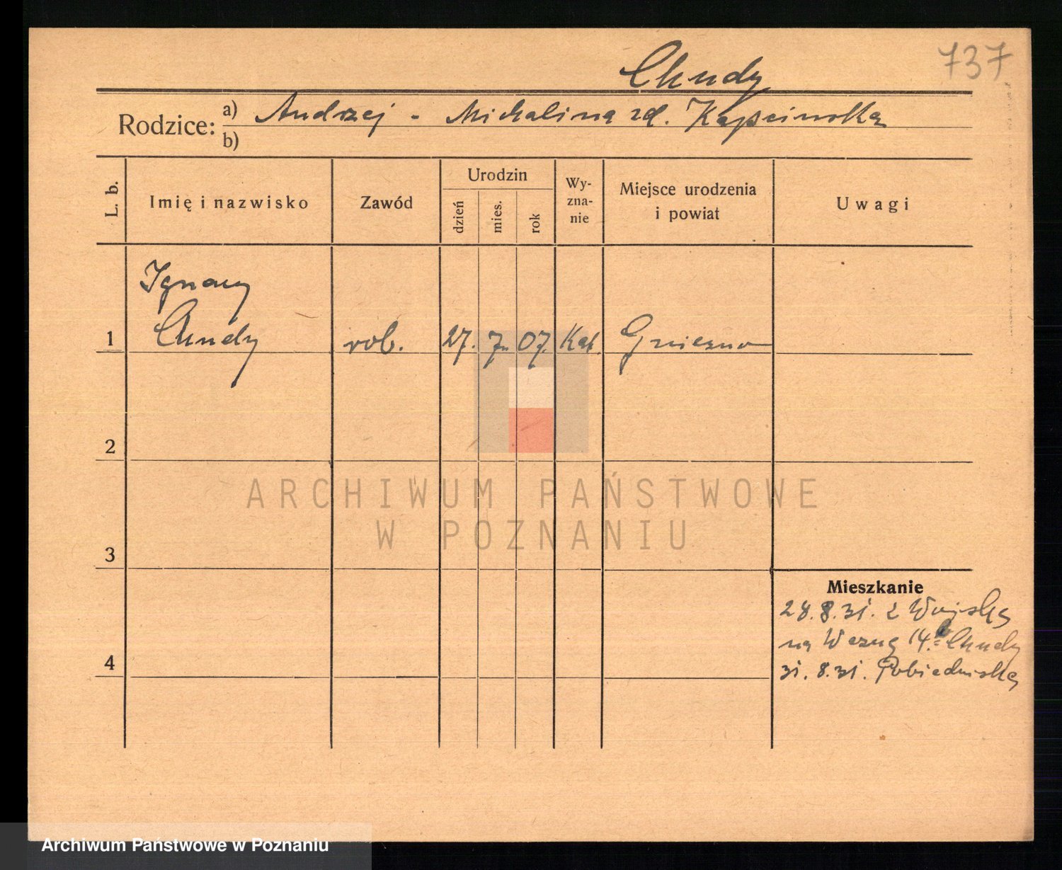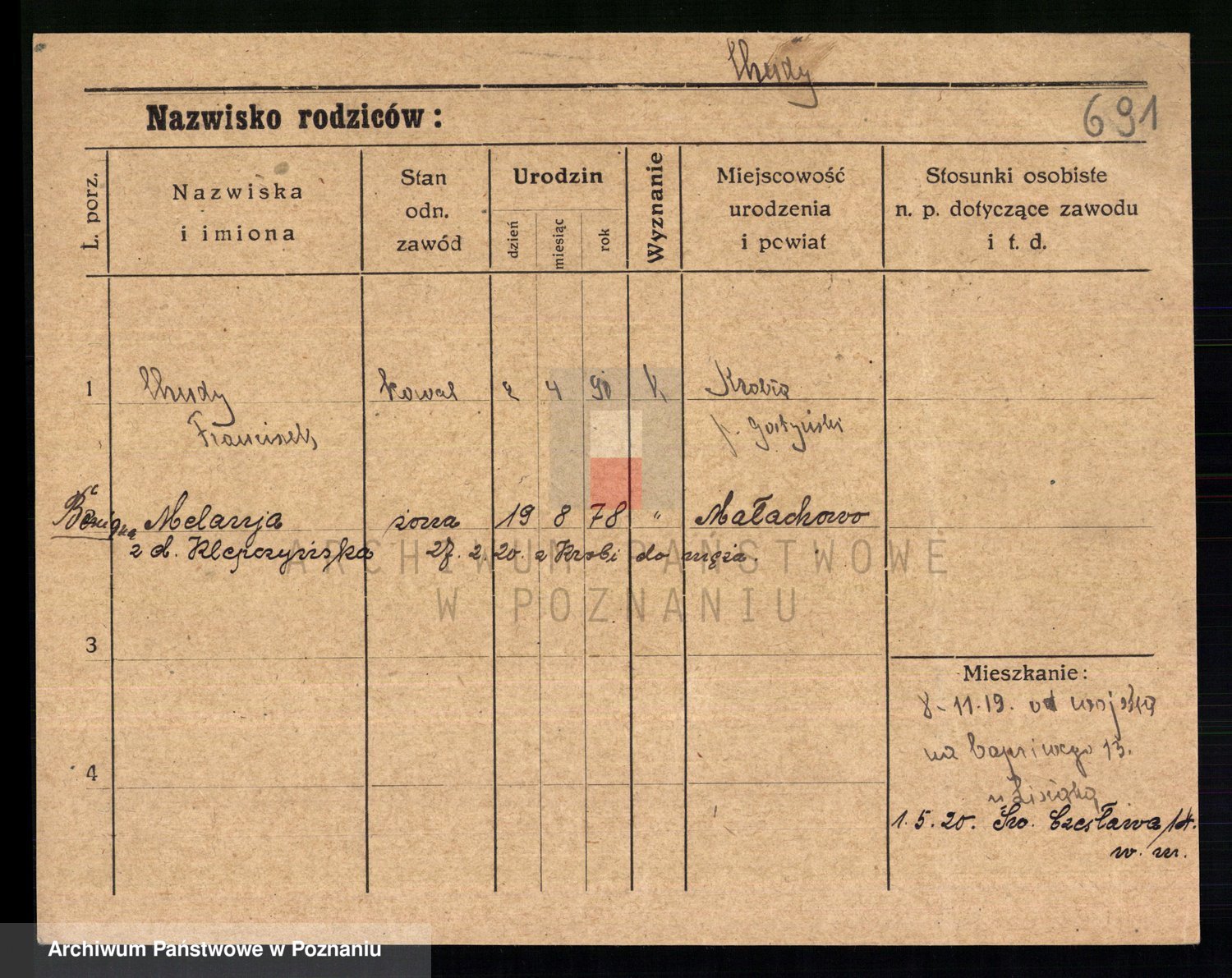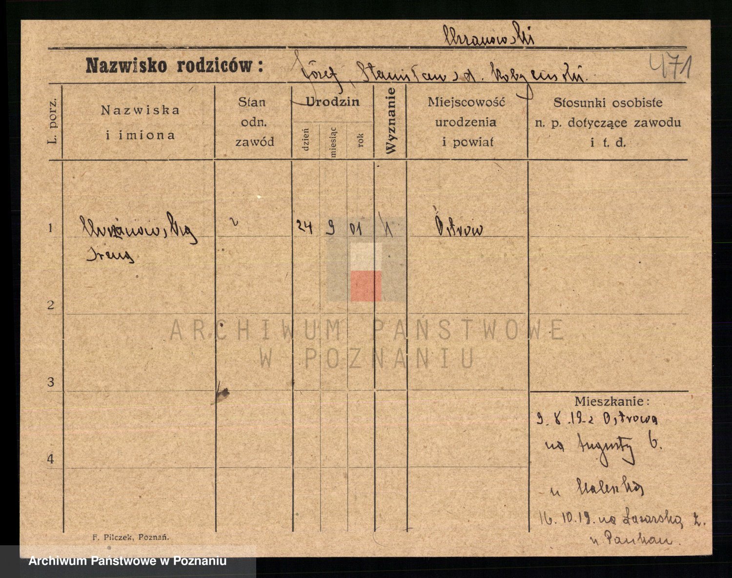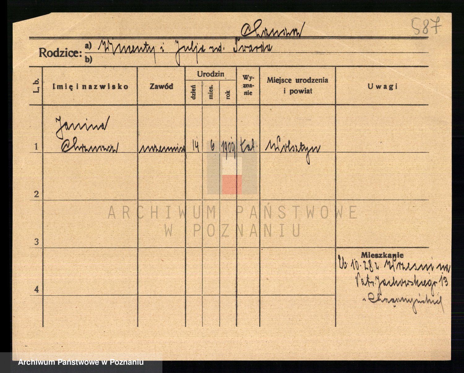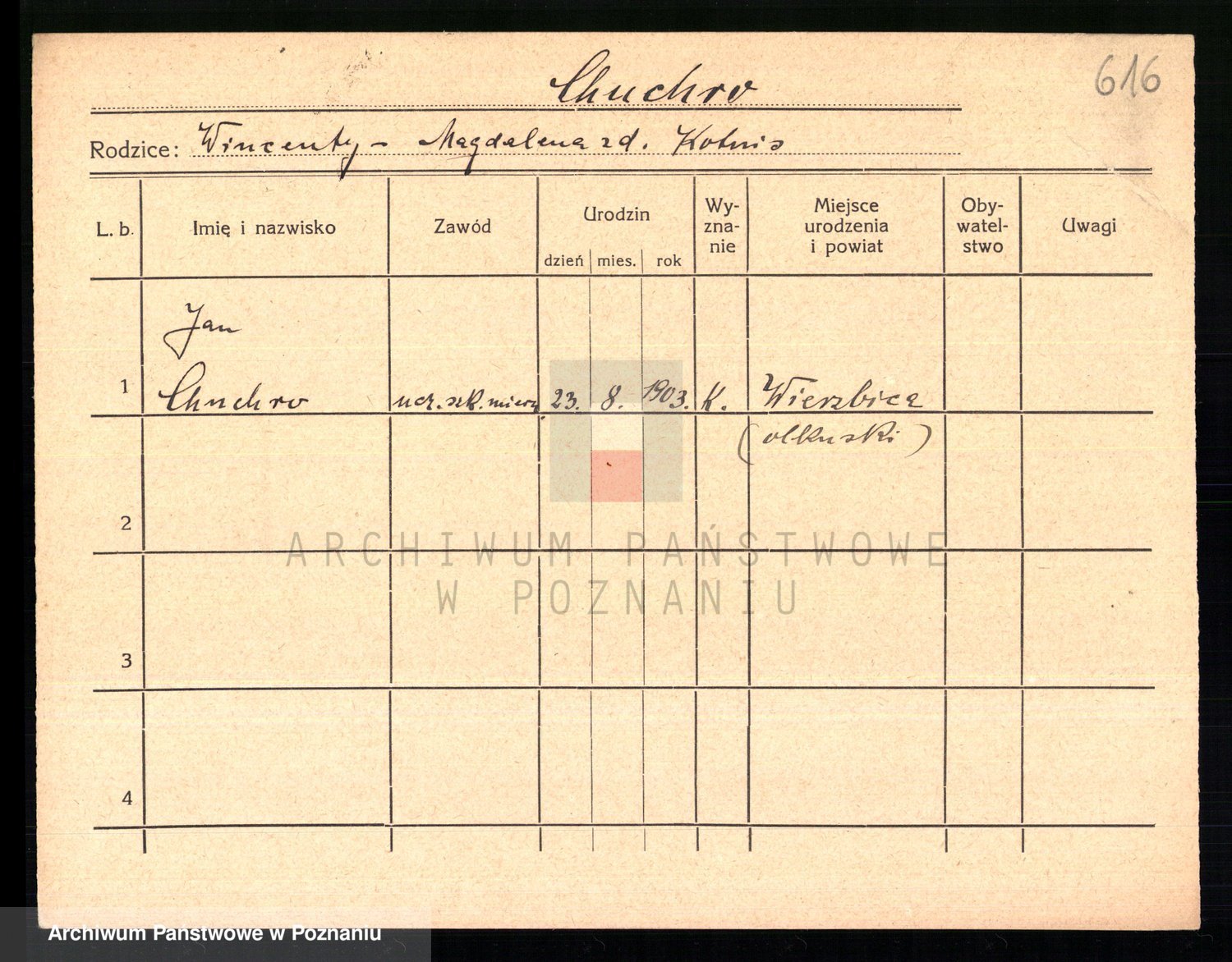 Podgląd karty osobowej dostępny jest po kliknięciu na nazwisko lub ikonkę karty. Można dokonywać powiększenia (ikony na górze) lub przechodzić między kolejnymi skanami (strzałki po bokach).