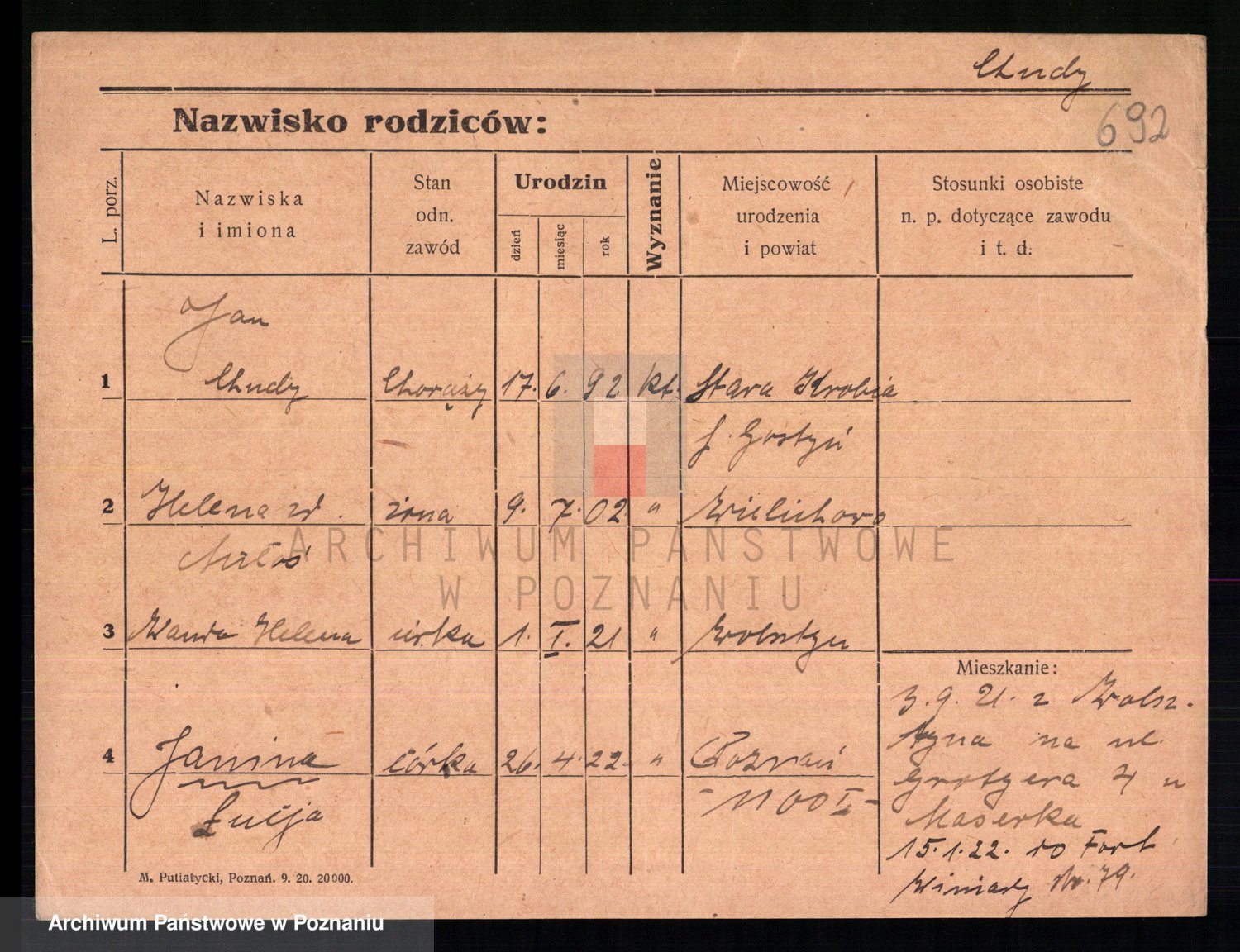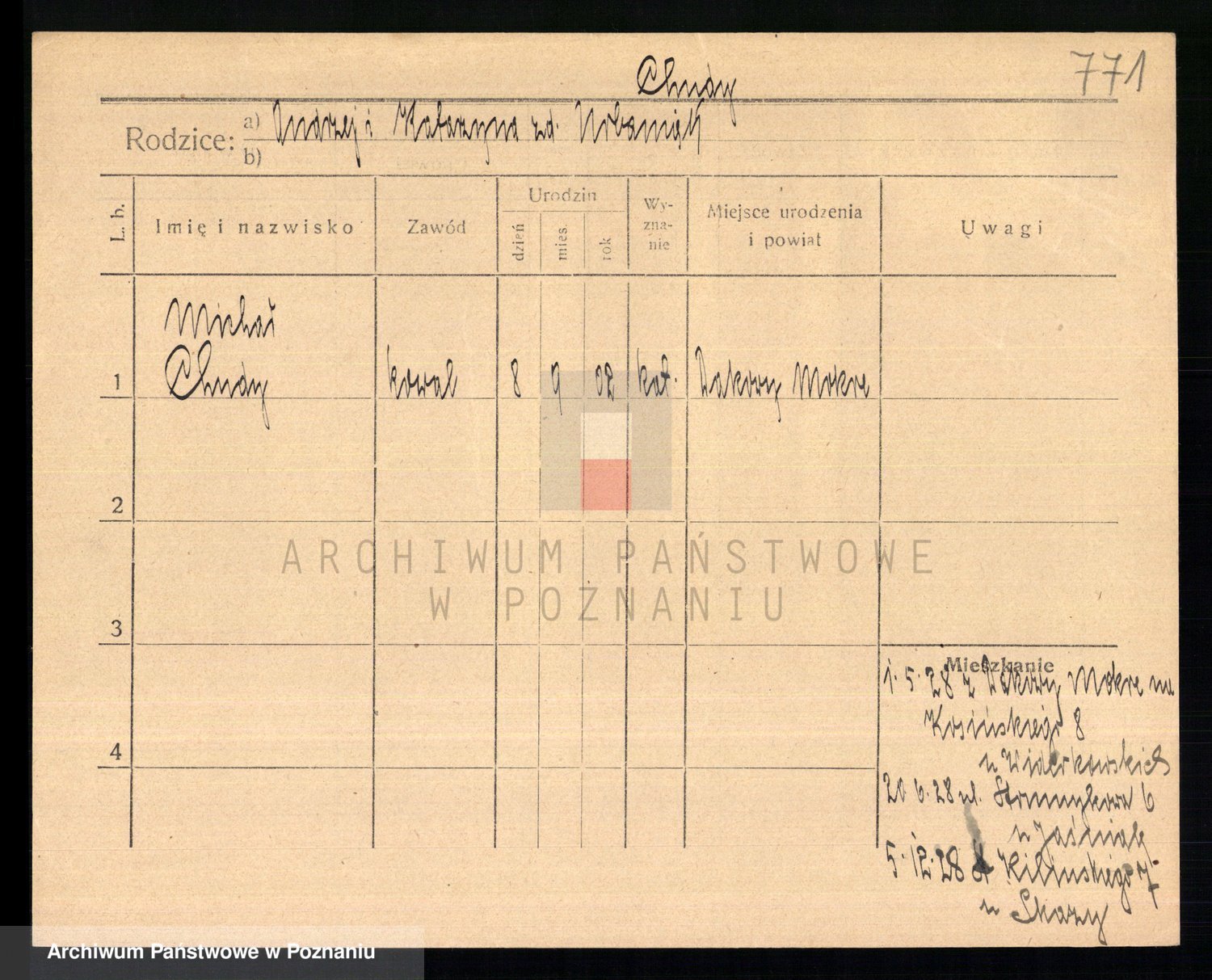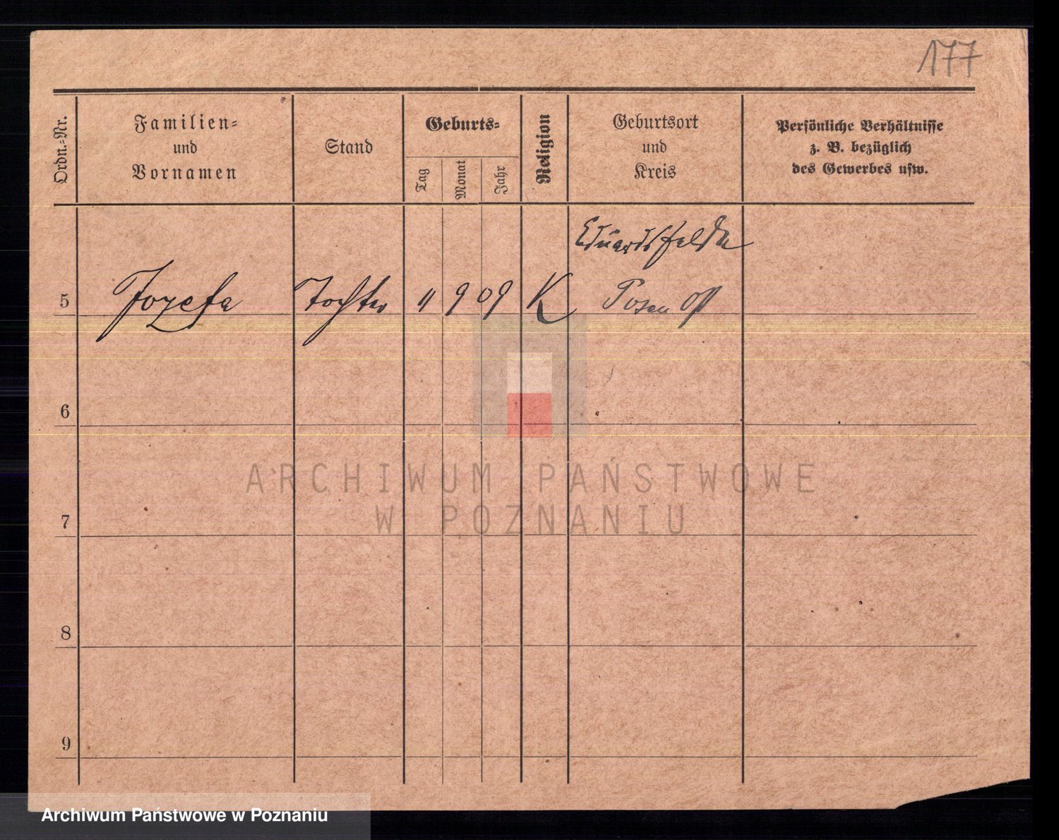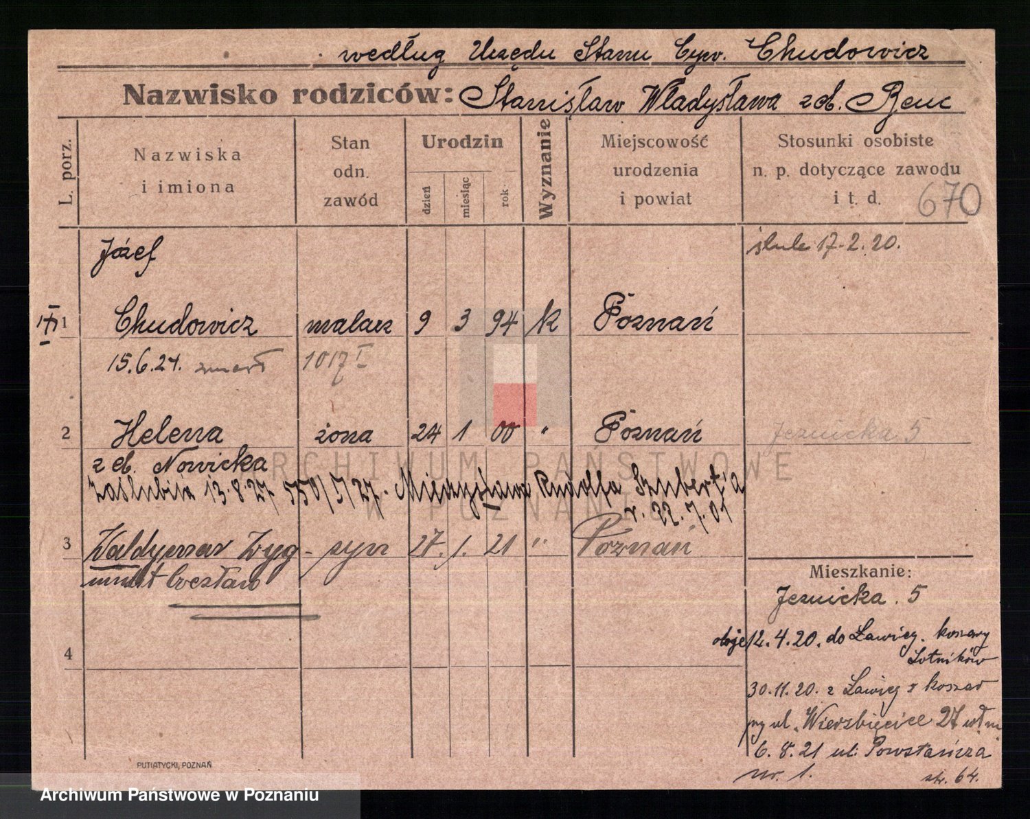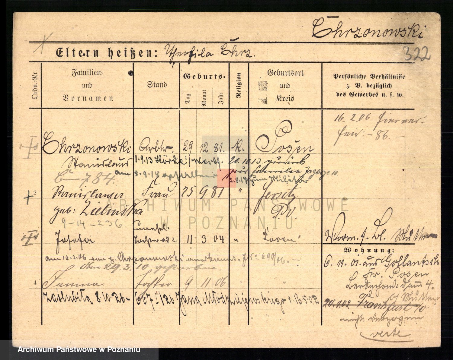 Podgląd karty osobowej dostępny jest po kliknięciu na nazwisko lub ikonkę karty. Można dokonywać powiększenia (ikony na górze) lub przechodzić między kolejnymi skanami (strzałki po bokach).