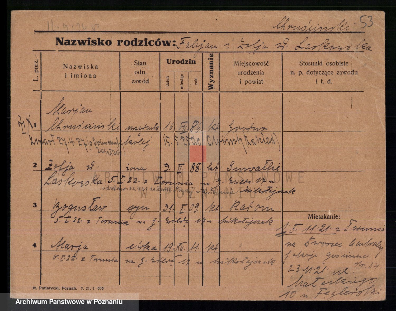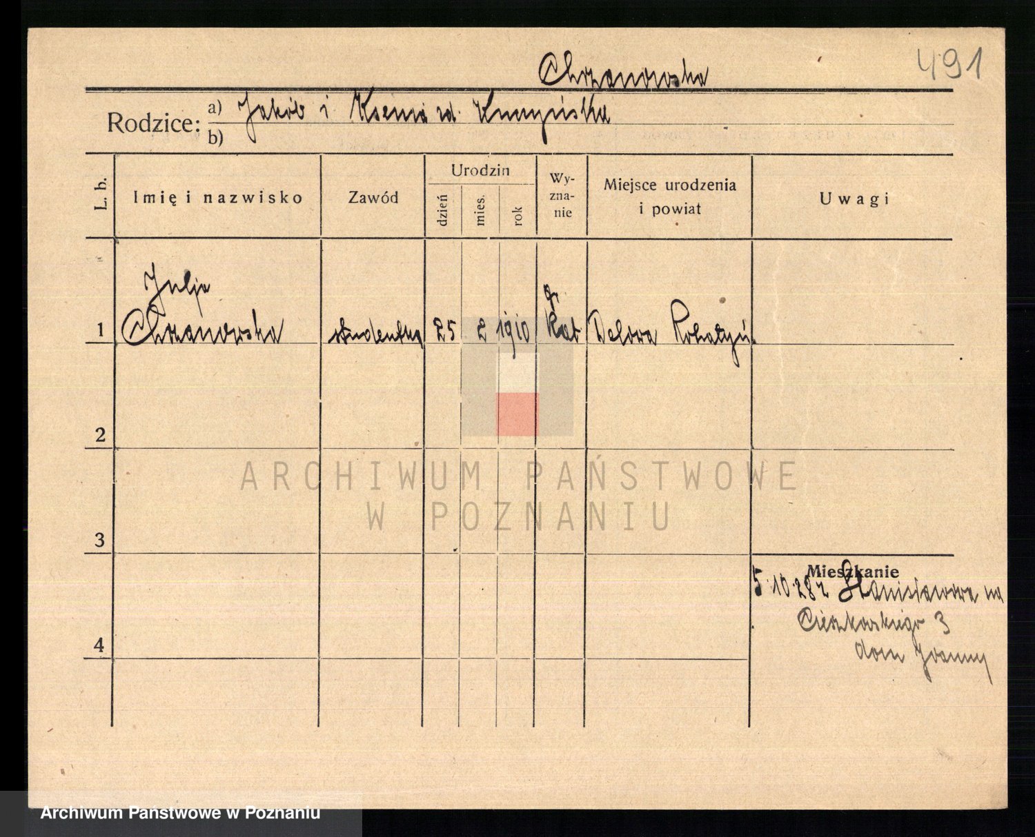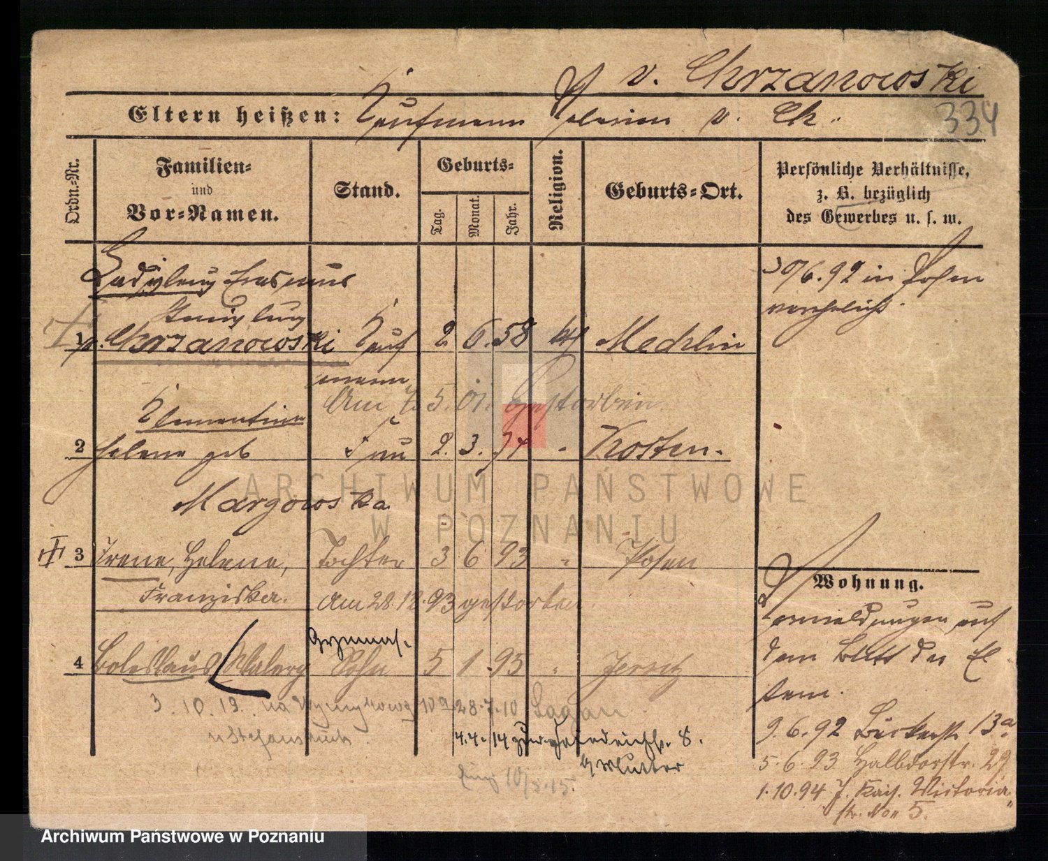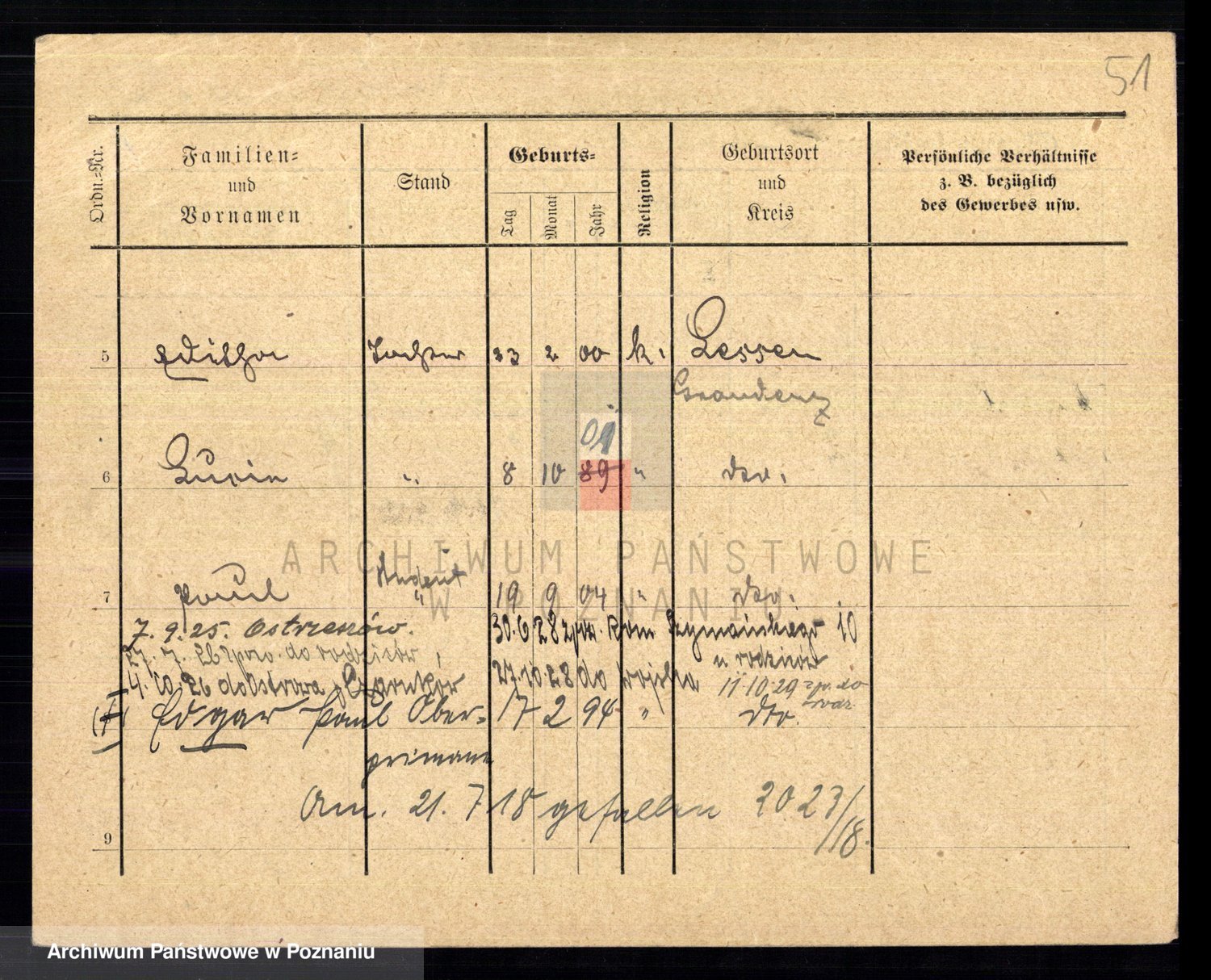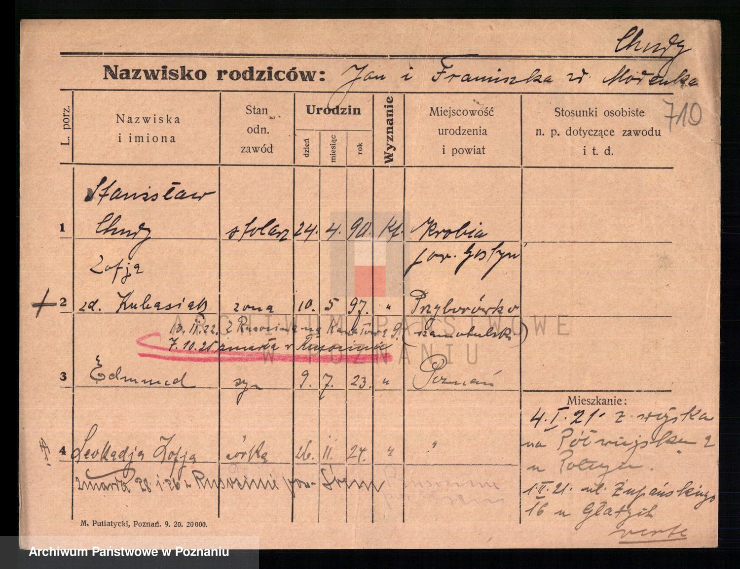 Podgląd karty osobowej dostępny jest po kliknięciu na nazwisko lub ikonkę karty. Można dokonywać powiększenia (ikony na górze) lub przechodzić między kolejnymi skanami (strzałki po bokach).