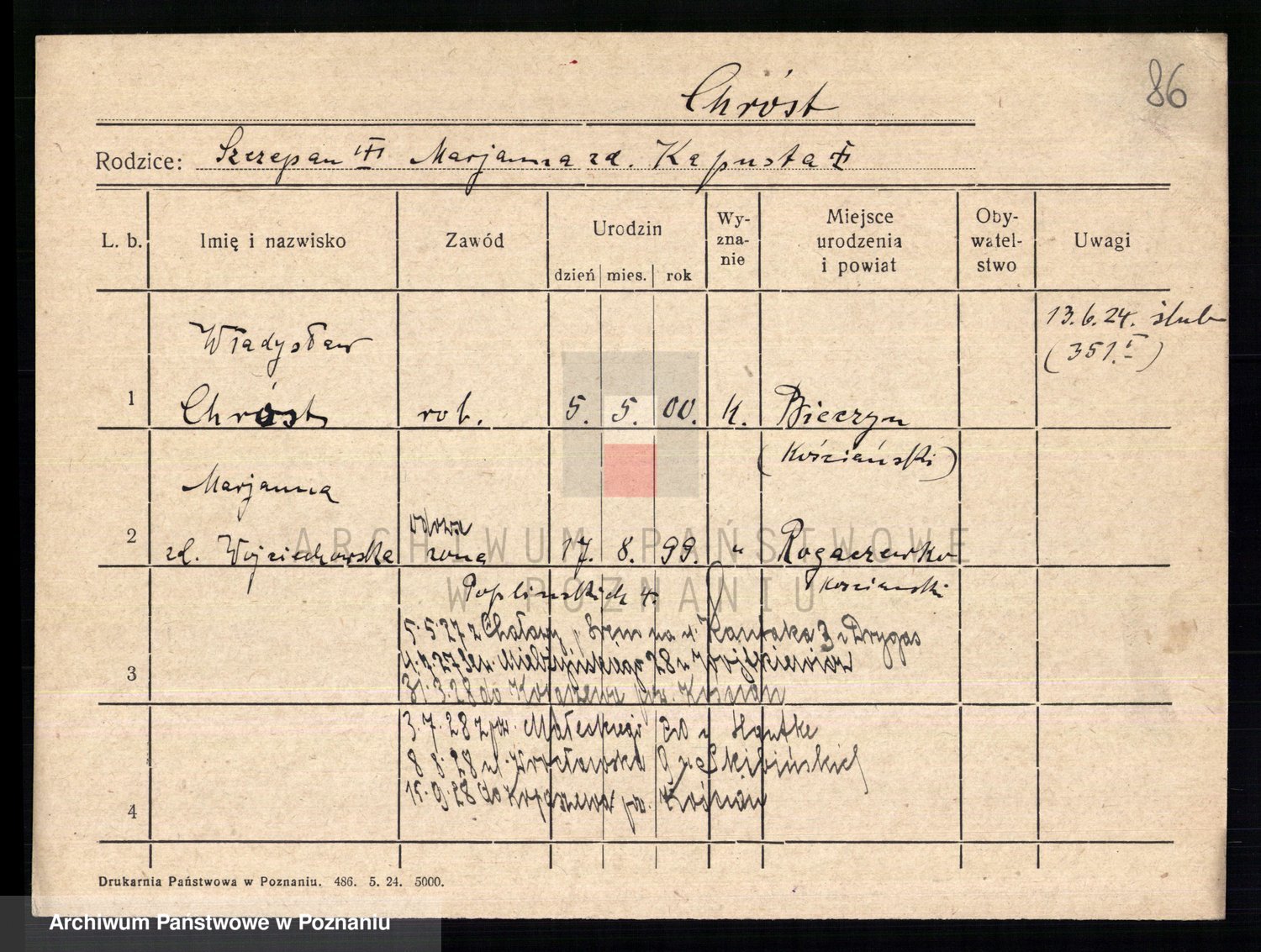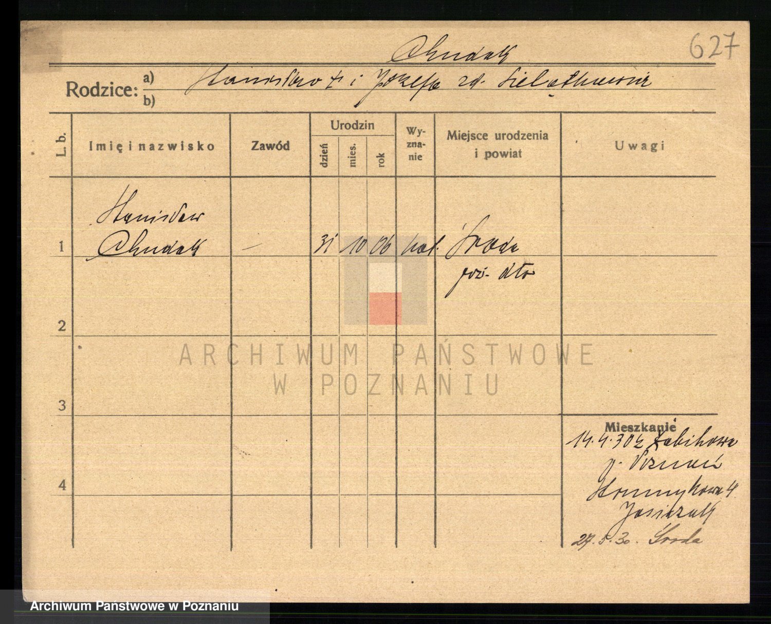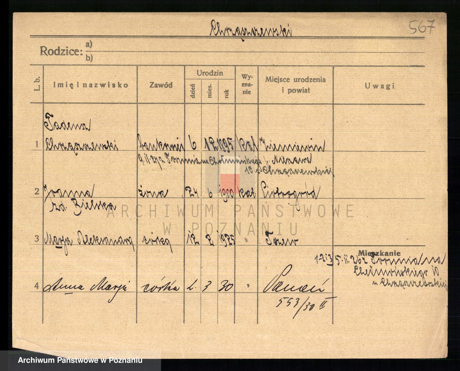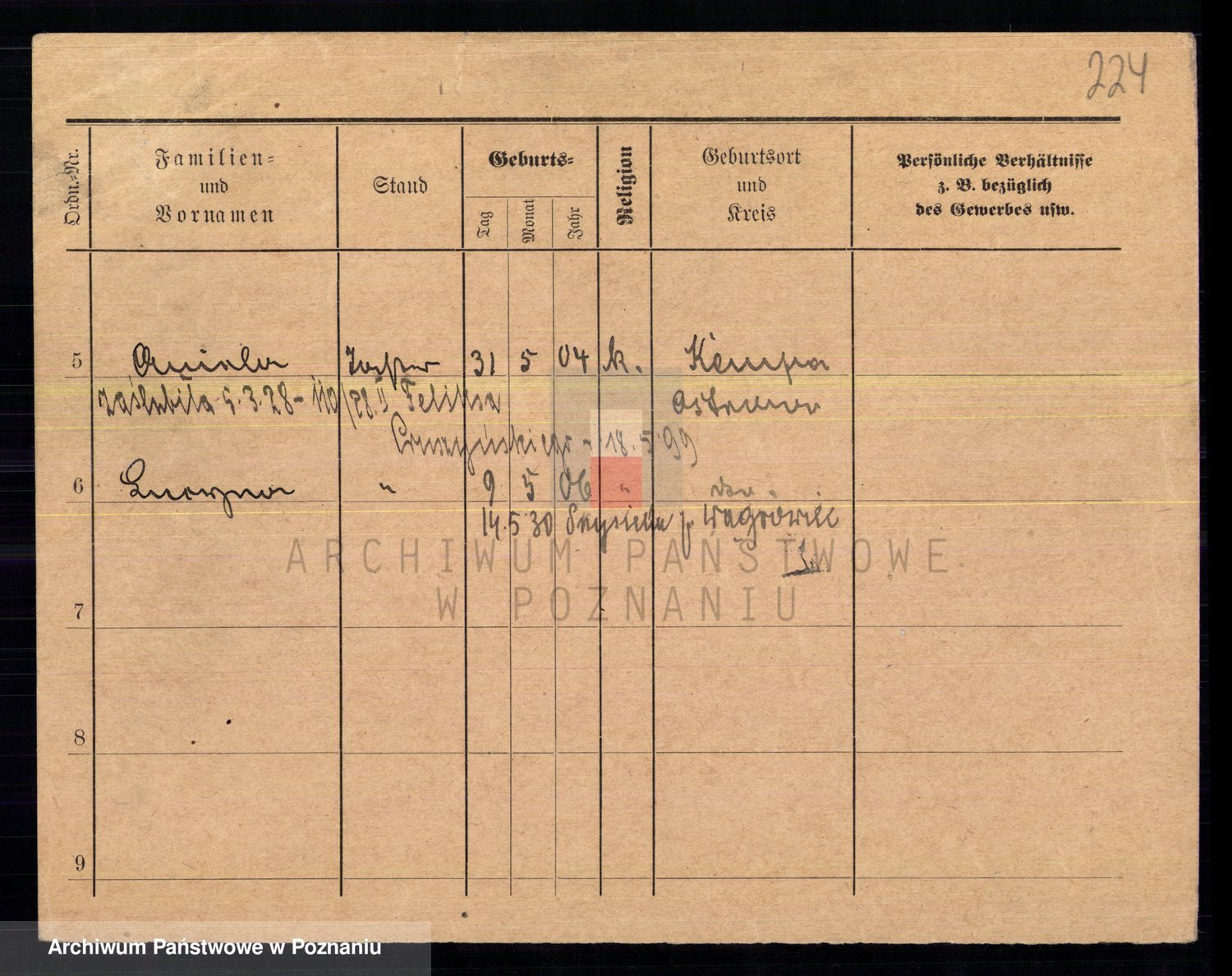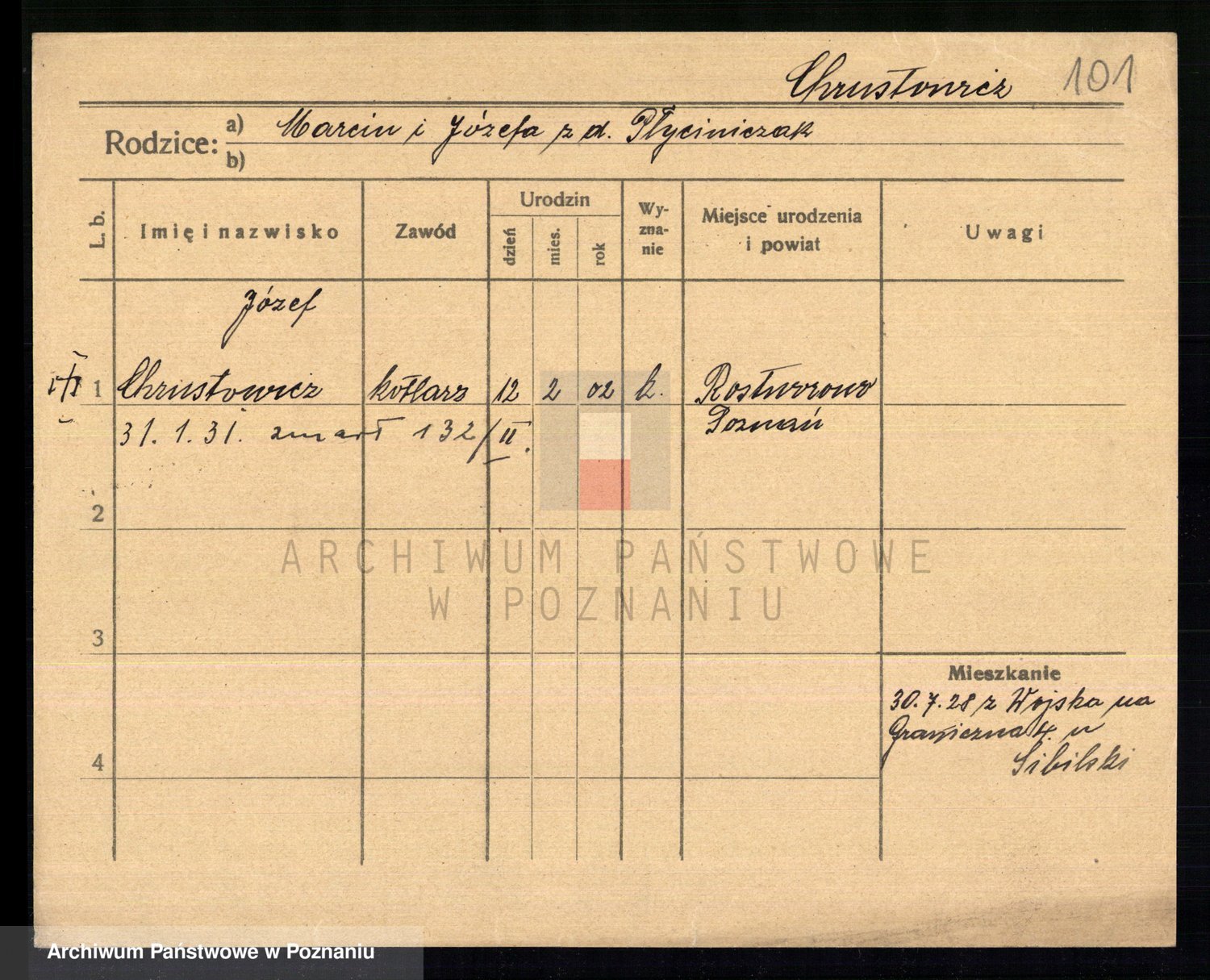 Podgląd karty osobowej dostępny jest po kliknięciu na nazwisko lub ikonkę karty. Można dokonywać powiększenia (ikony na górze) lub przechodzić między kolejnymi skanami (strzałki po bokach).