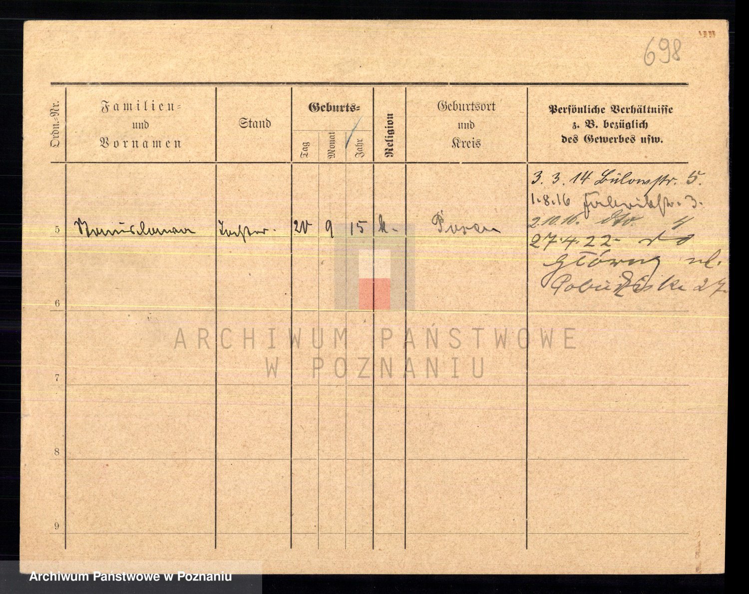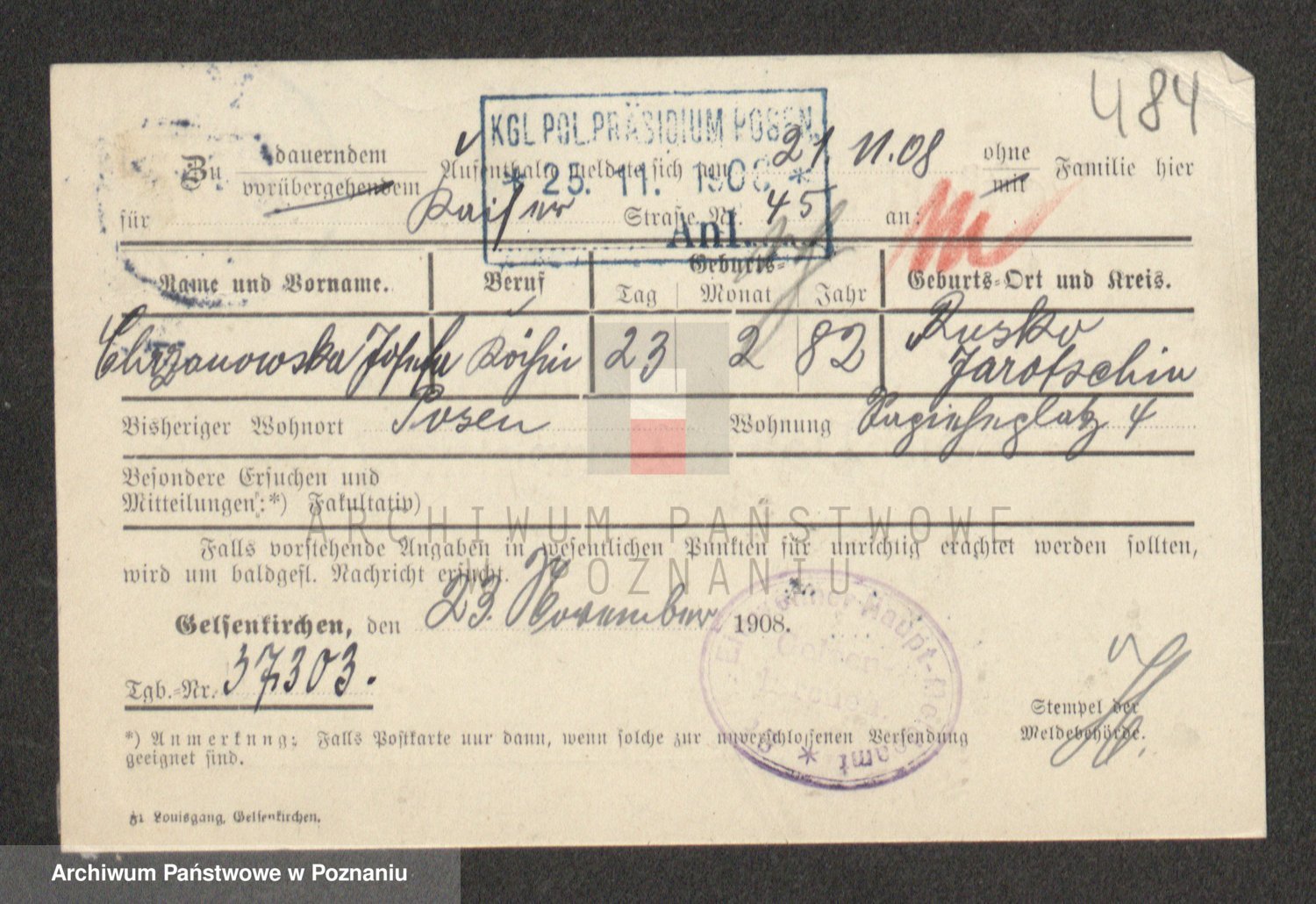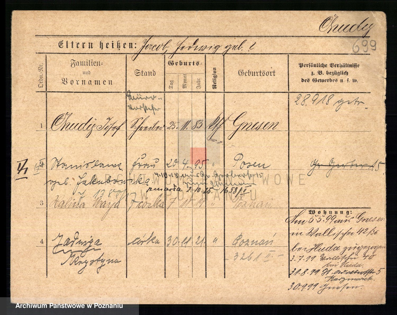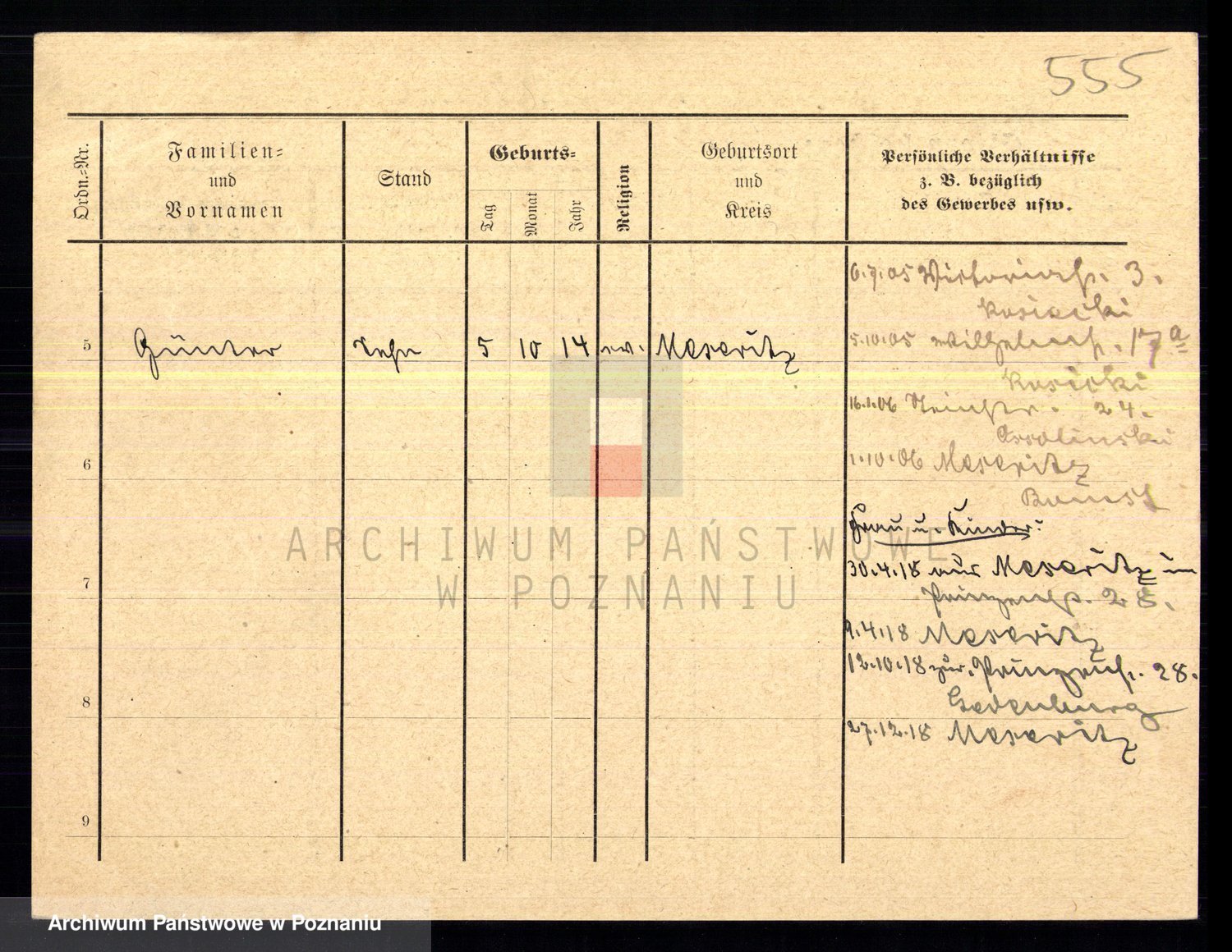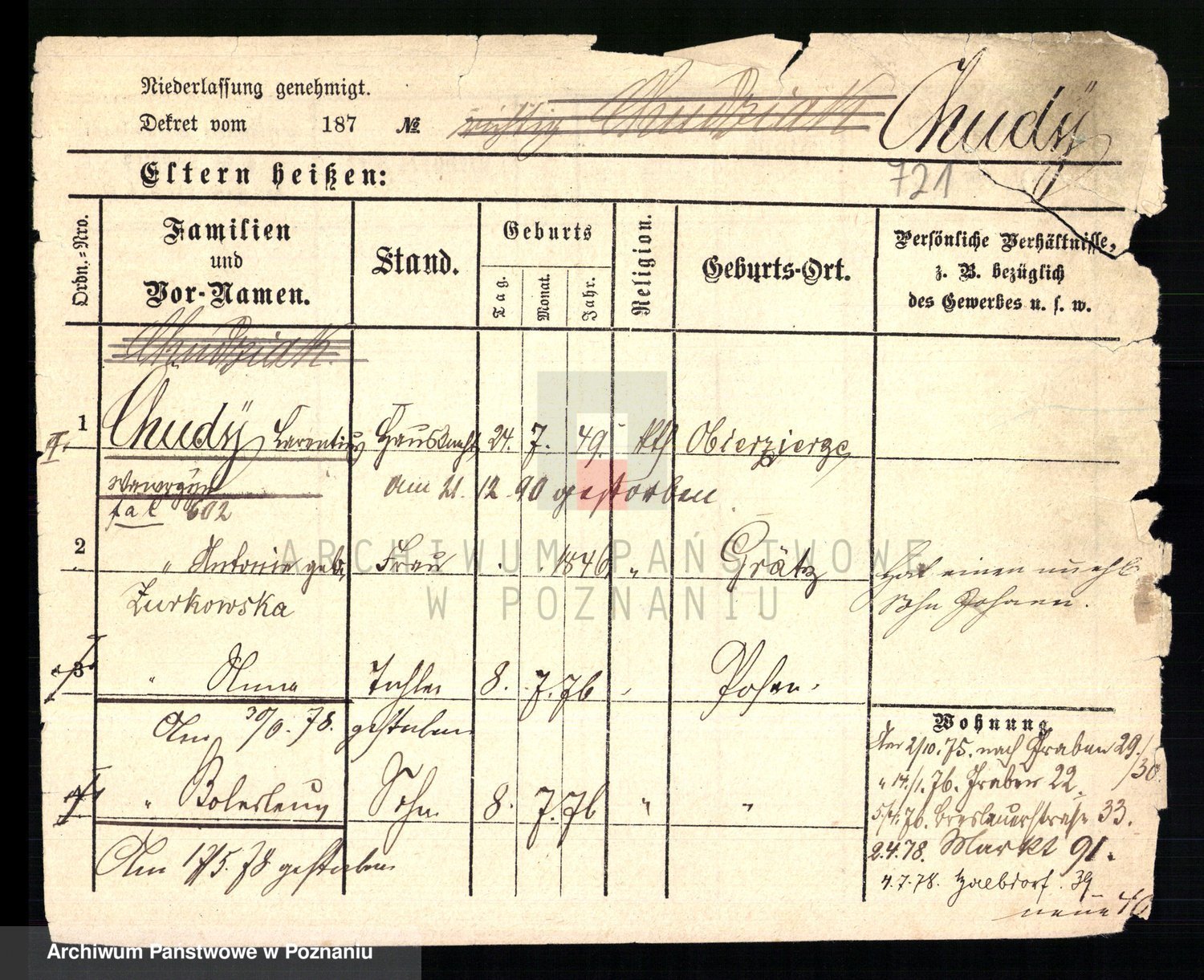 Podgląd karty osobowej dostępny jest po kliknięciu na nazwisko lub ikonkę karty. Można dokonywać powiększenia (ikony na górze) lub przechodzić między kolejnymi skanami (strzałki po bokach).