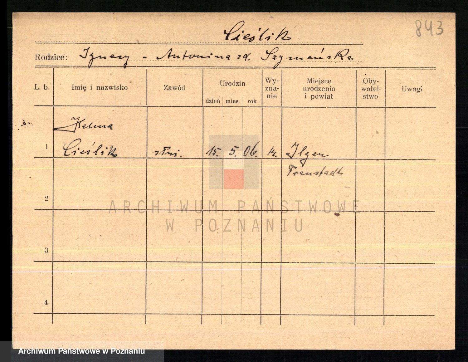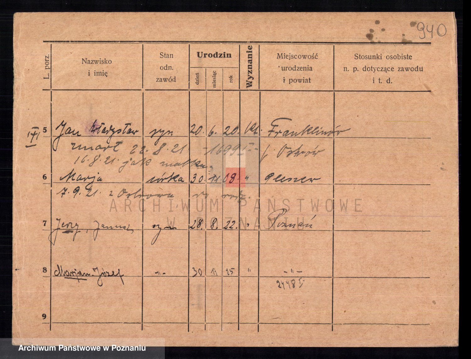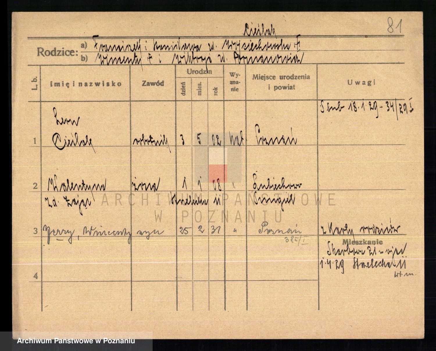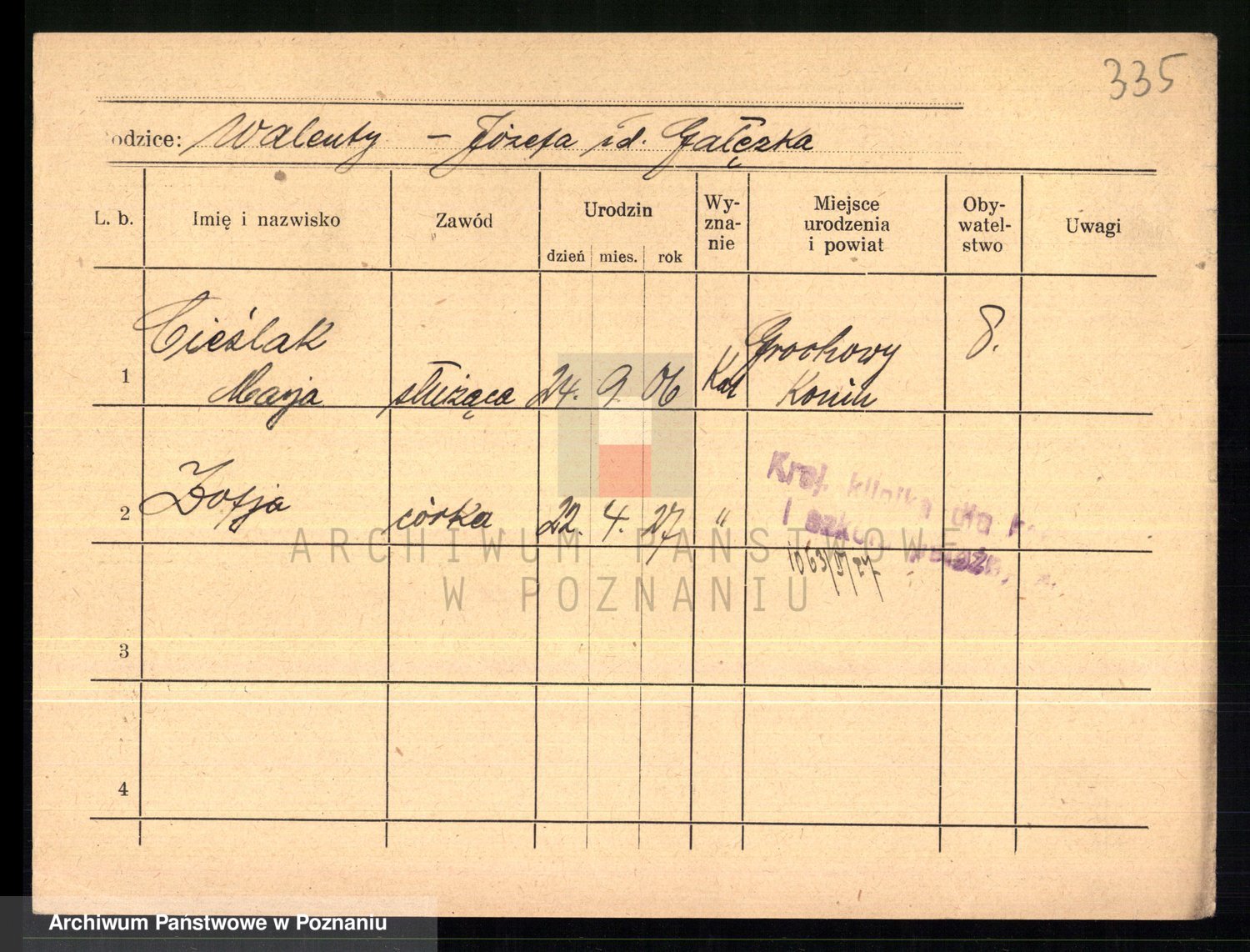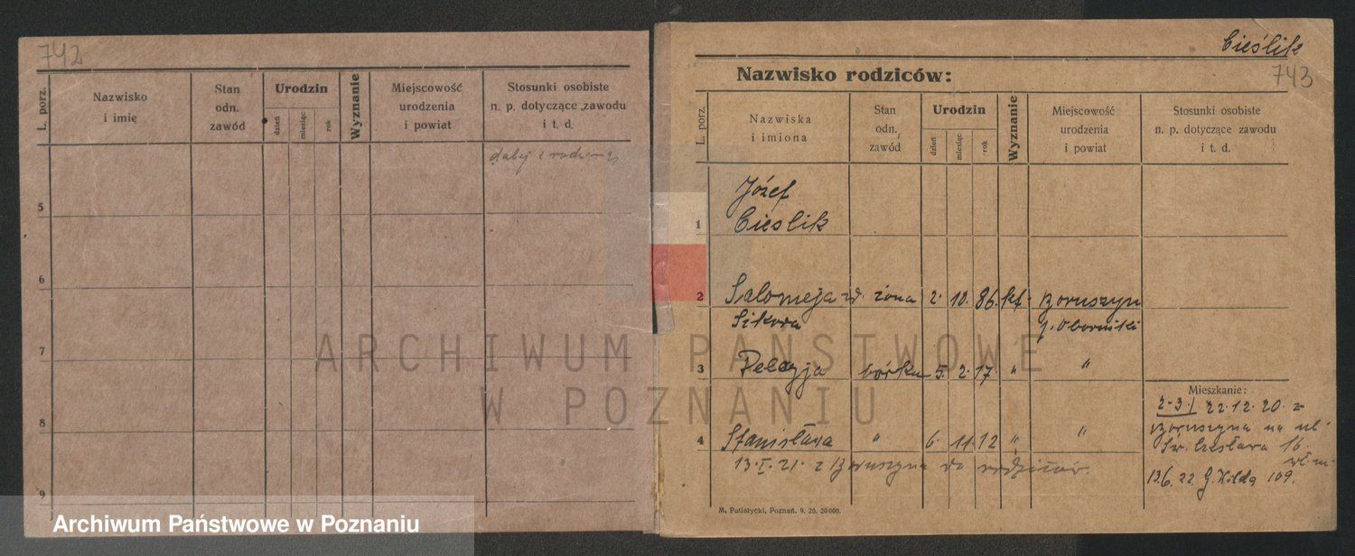 Podgląd karty osobowej dostępny jest po kliknięciu na nazwisko lub ikonkę karty. Można dokonywać powiększenia (ikony na górze) lub przechodzić między kolejnymi skanami (strzałki po bokach).