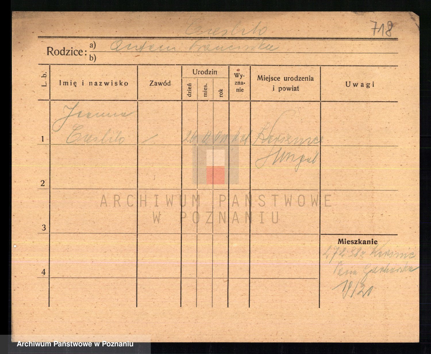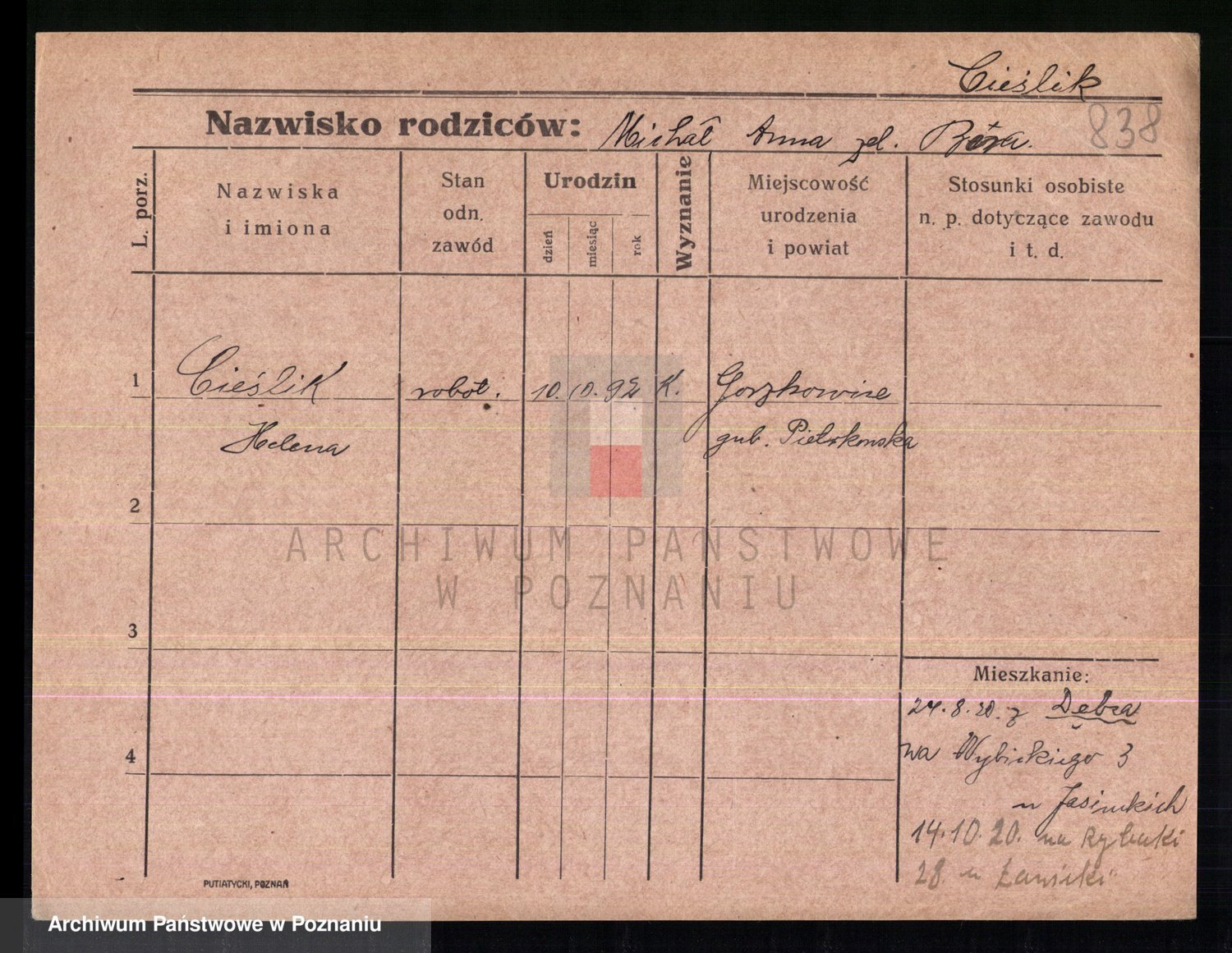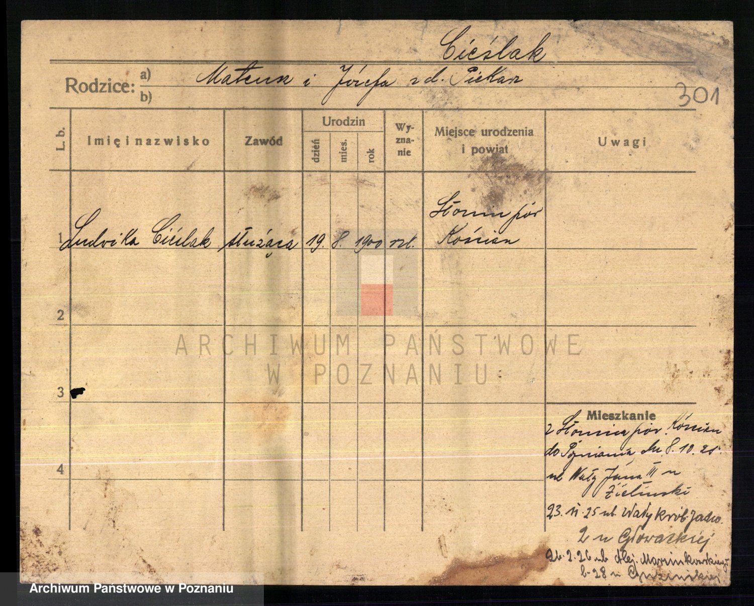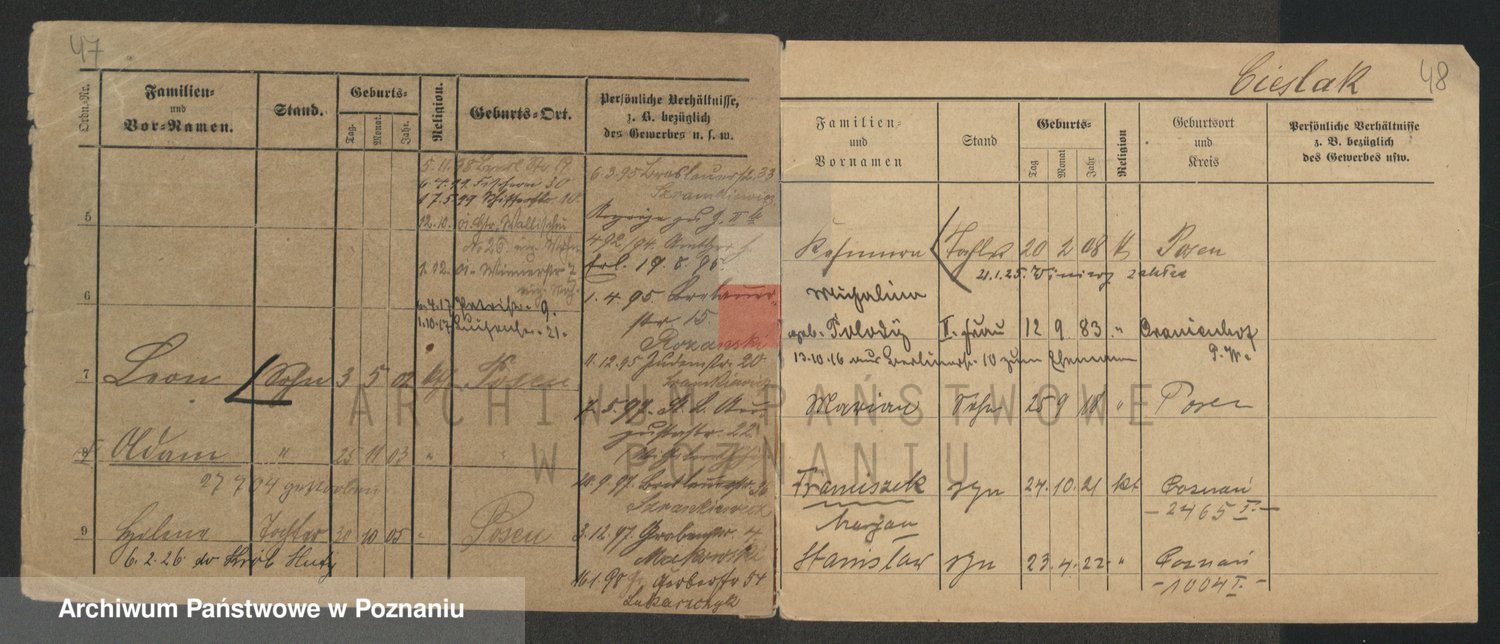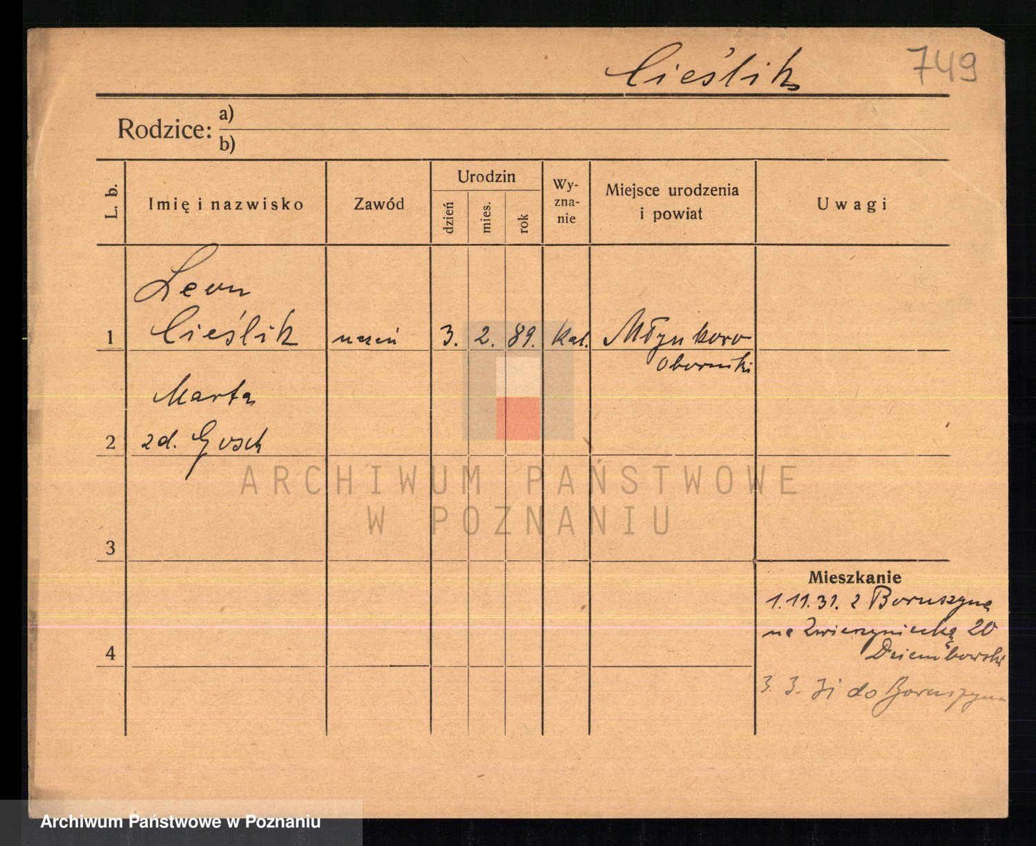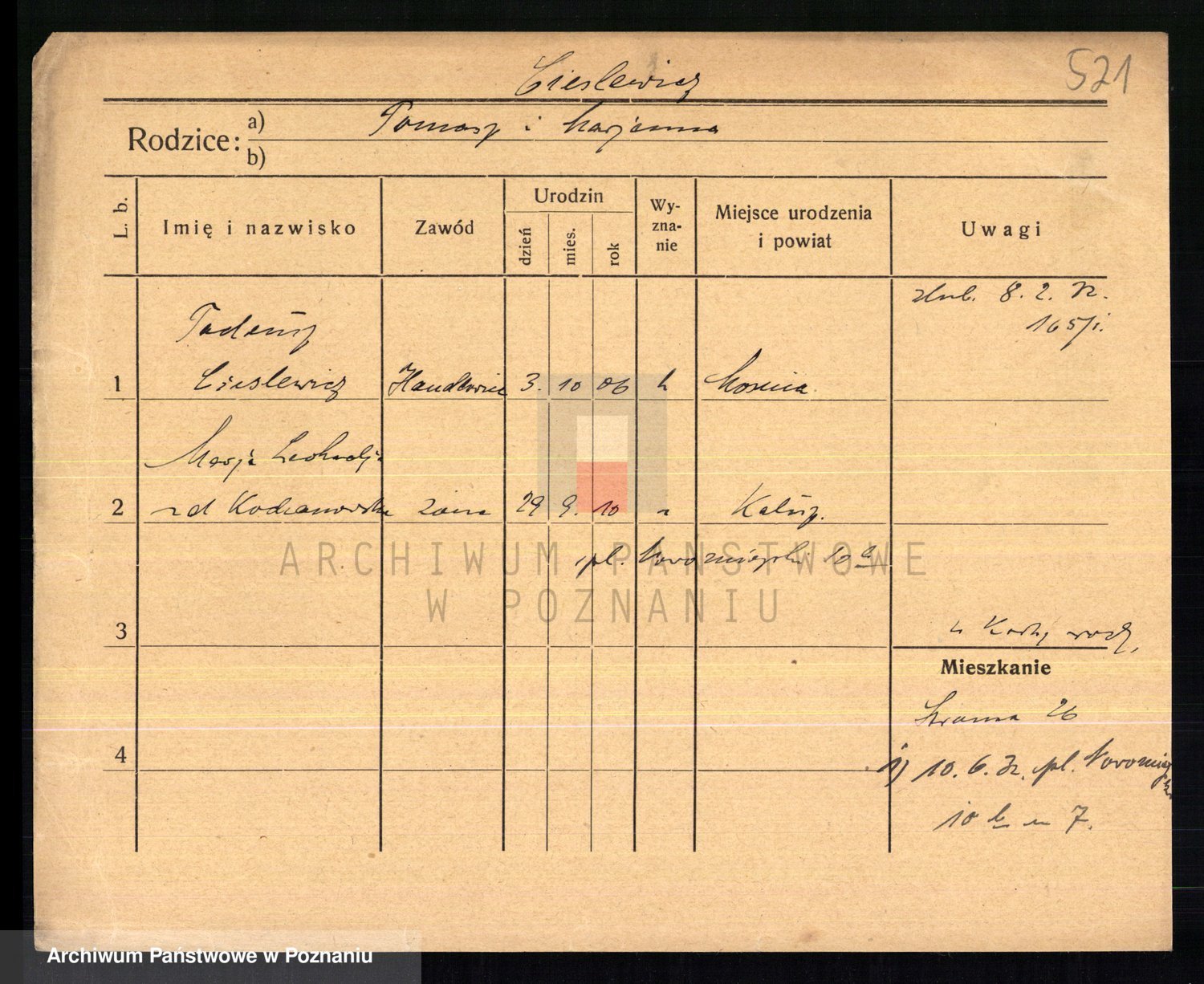 Podgląd karty osobowej dostępny jest po kliknięciu na nazwisko lub ikonkę karty. Można dokonywać powiększenia (ikony na górze) lub przechodzić między kolejnymi skanami (strzałki po bokach).
