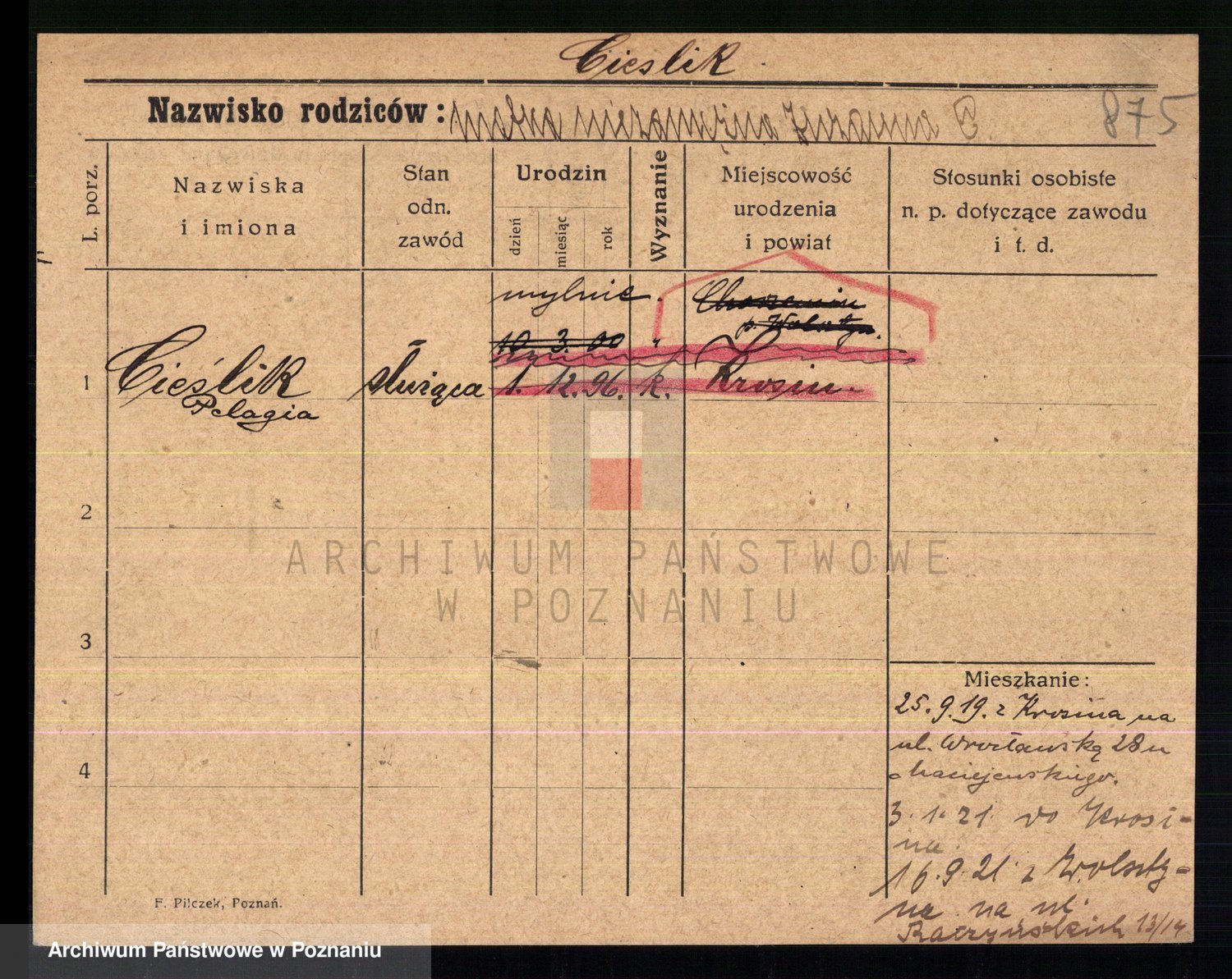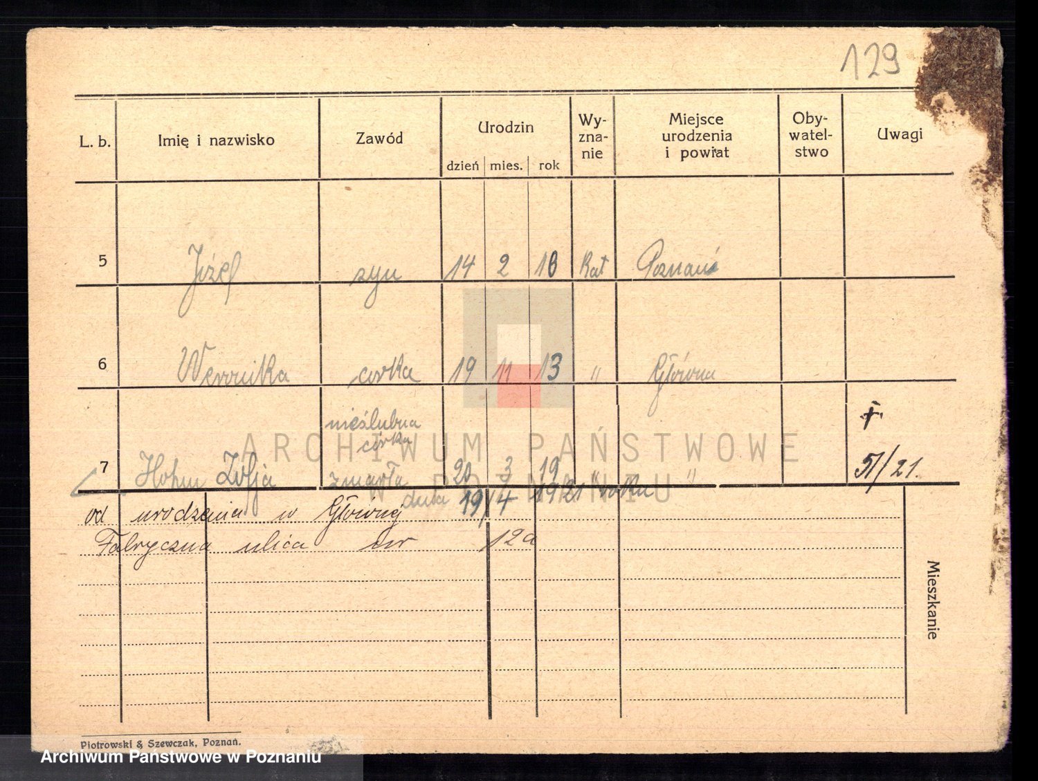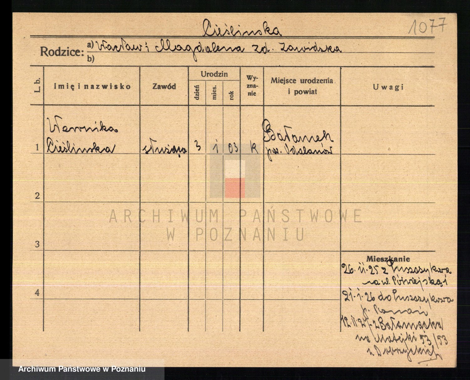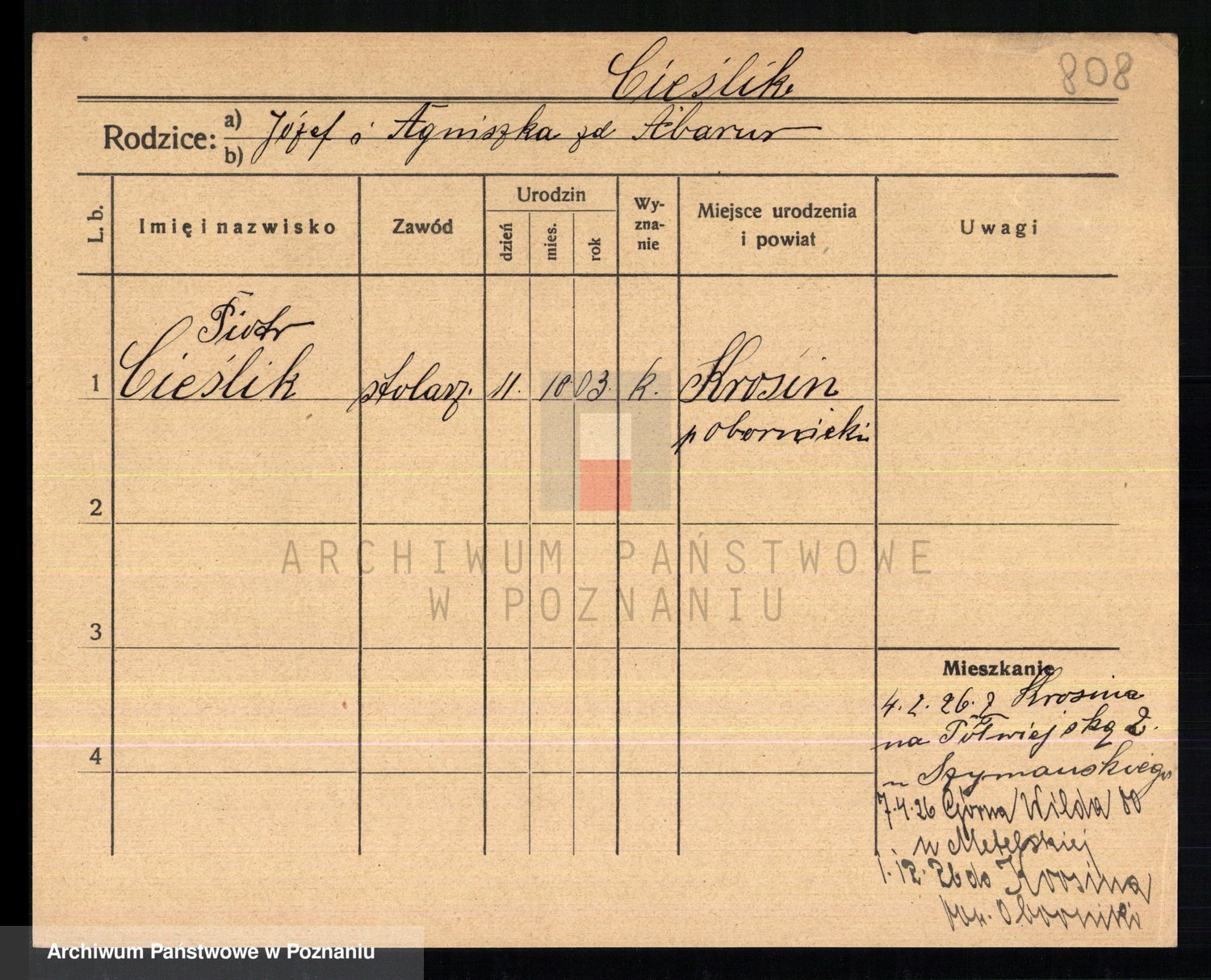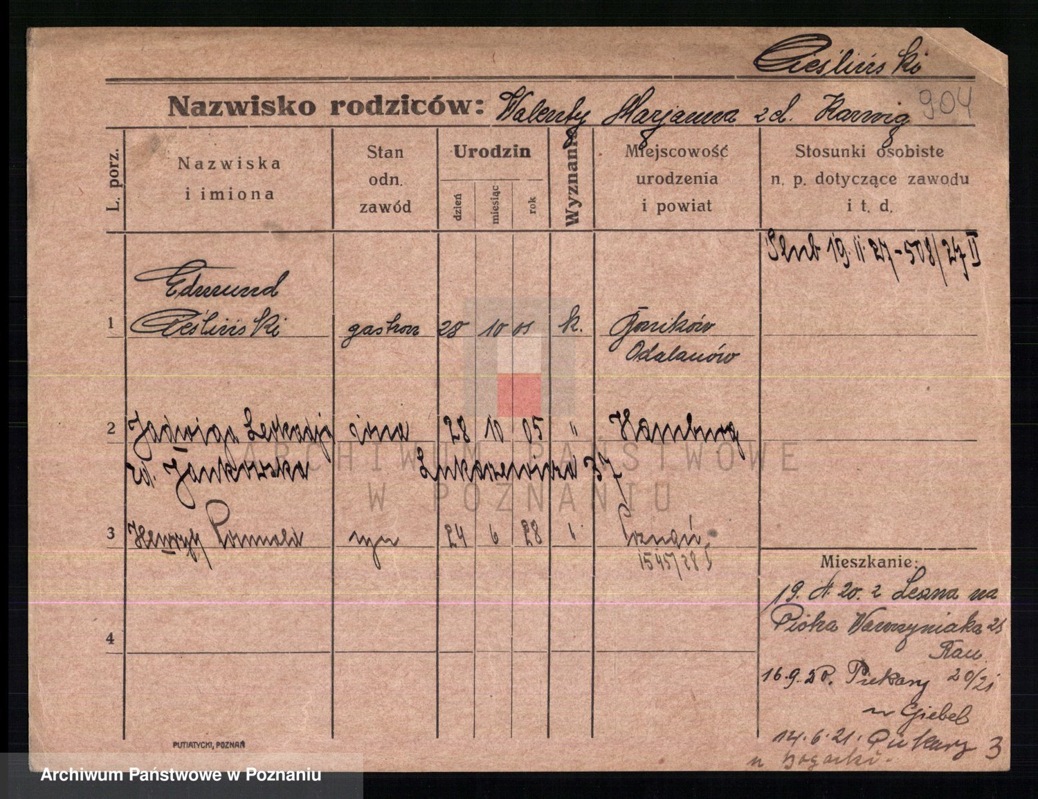 Podgląd karty osobowej dostępny jest po kliknięciu na nazwisko lub ikonkę karty. Można dokonywać powiększenia (ikony na górze) lub przechodzić między kolejnymi skanami (strzałki po bokach).