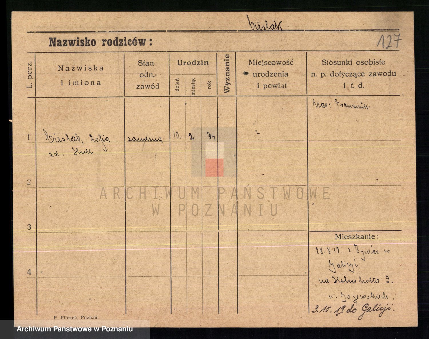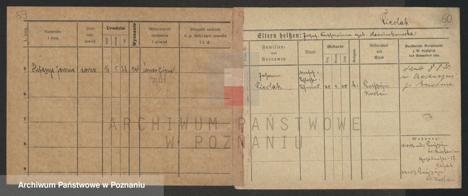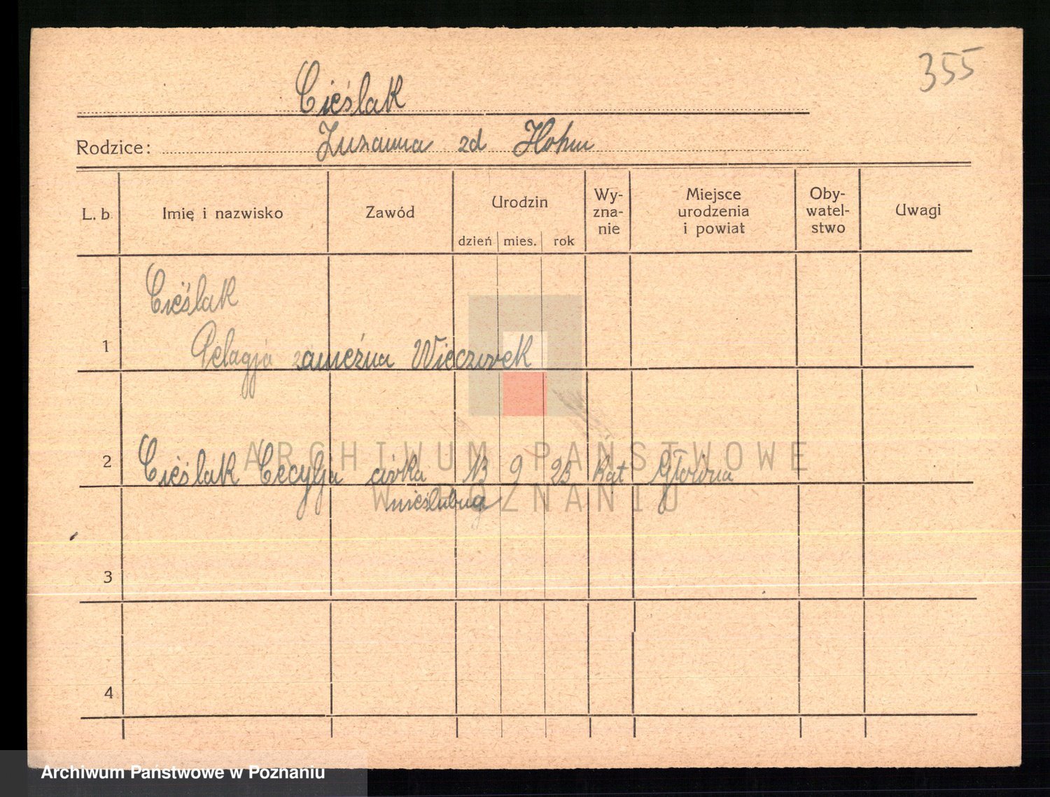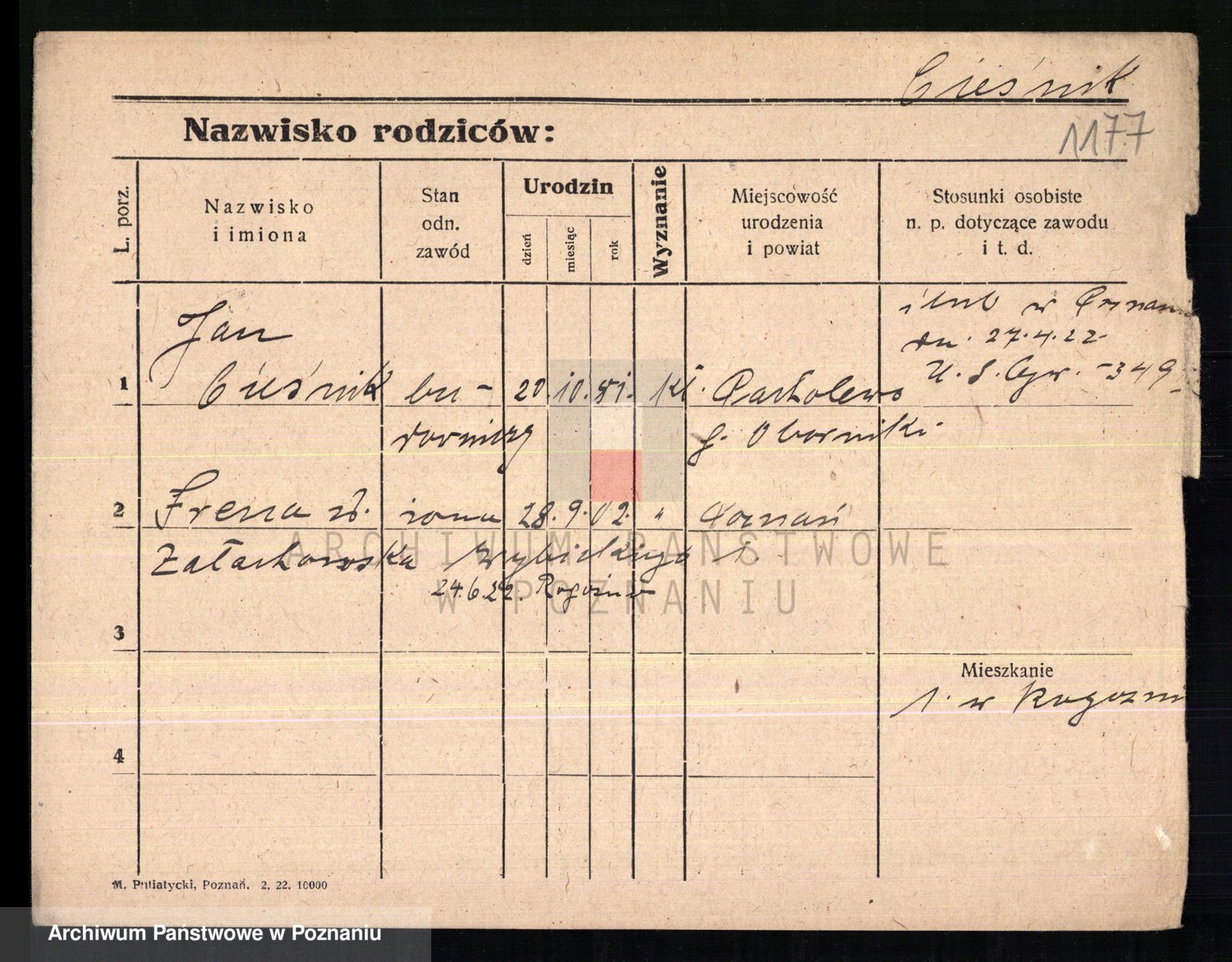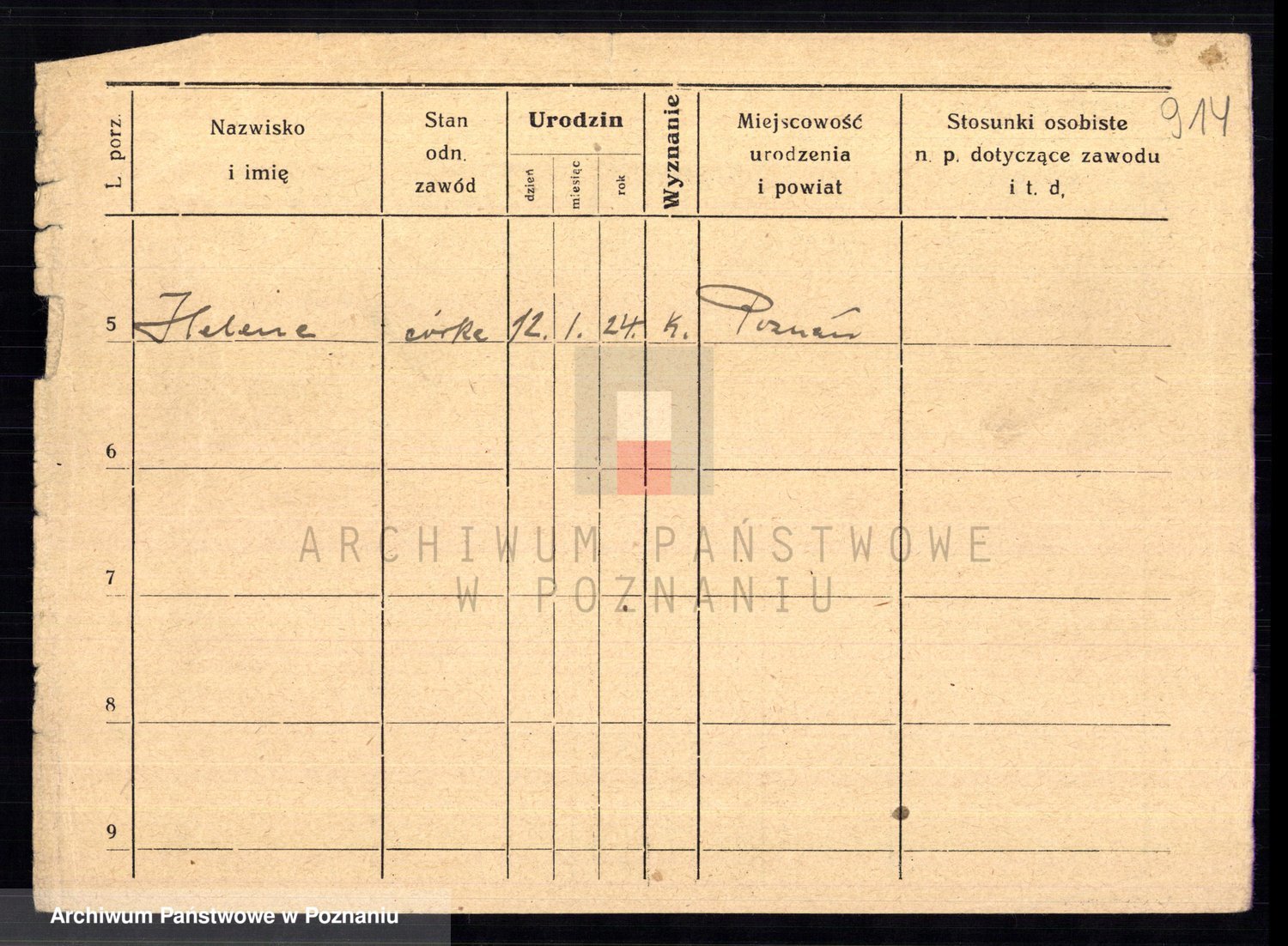 Podgląd karty osobowej dostępny jest po kliknięciu na nazwisko lub ikonkę karty. Można dokonywać powiększenia (ikony na górze) lub przechodzić między kolejnymi skanami (strzałki po bokach).