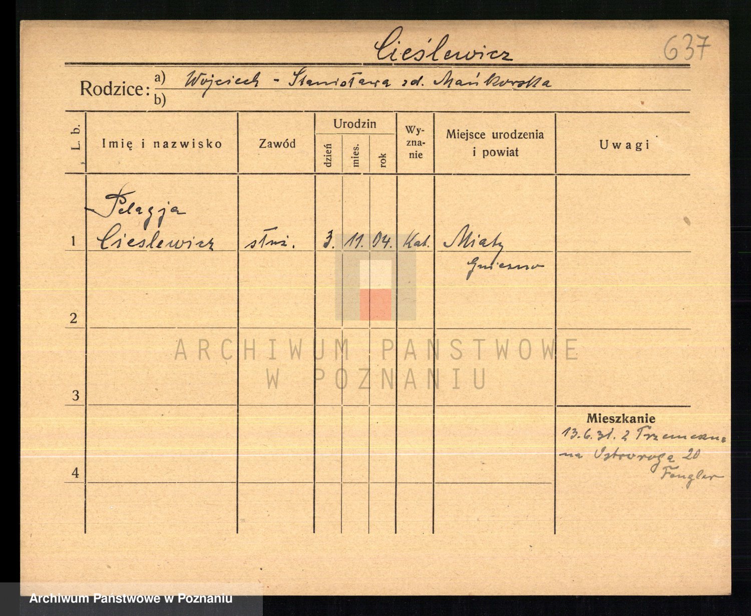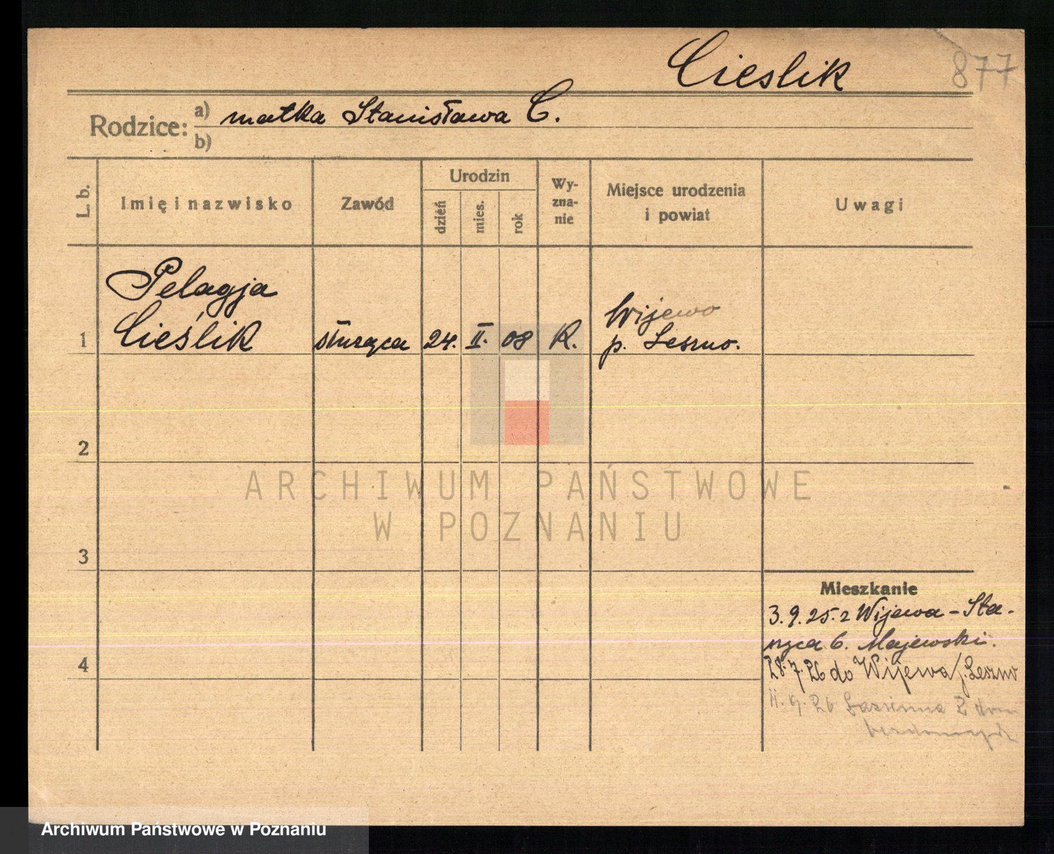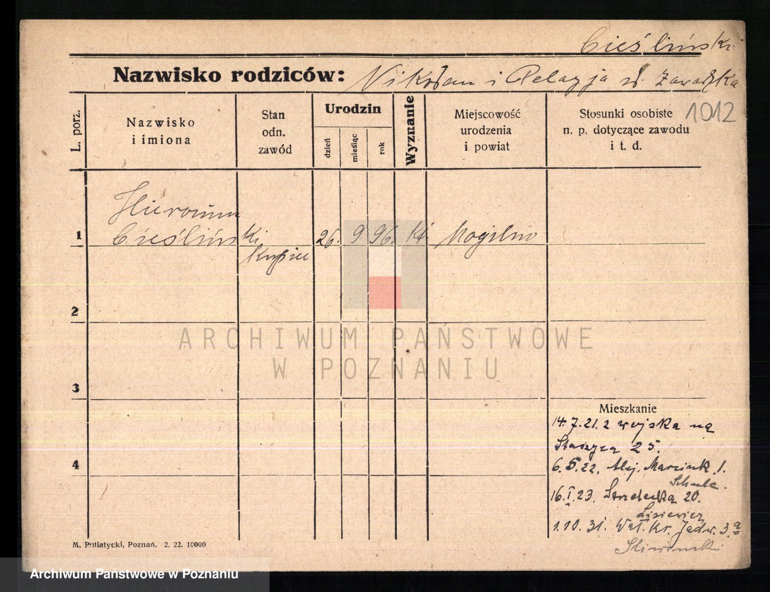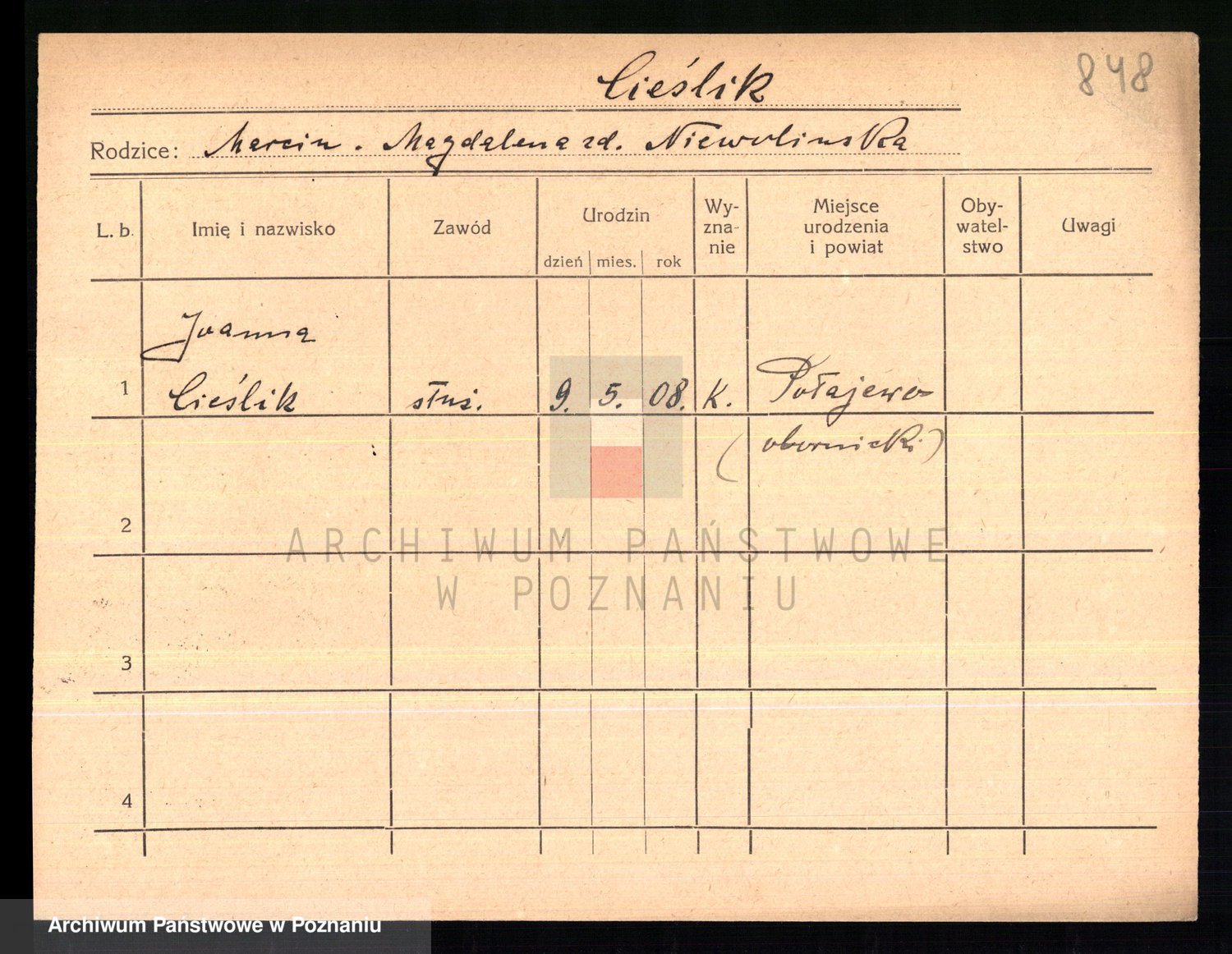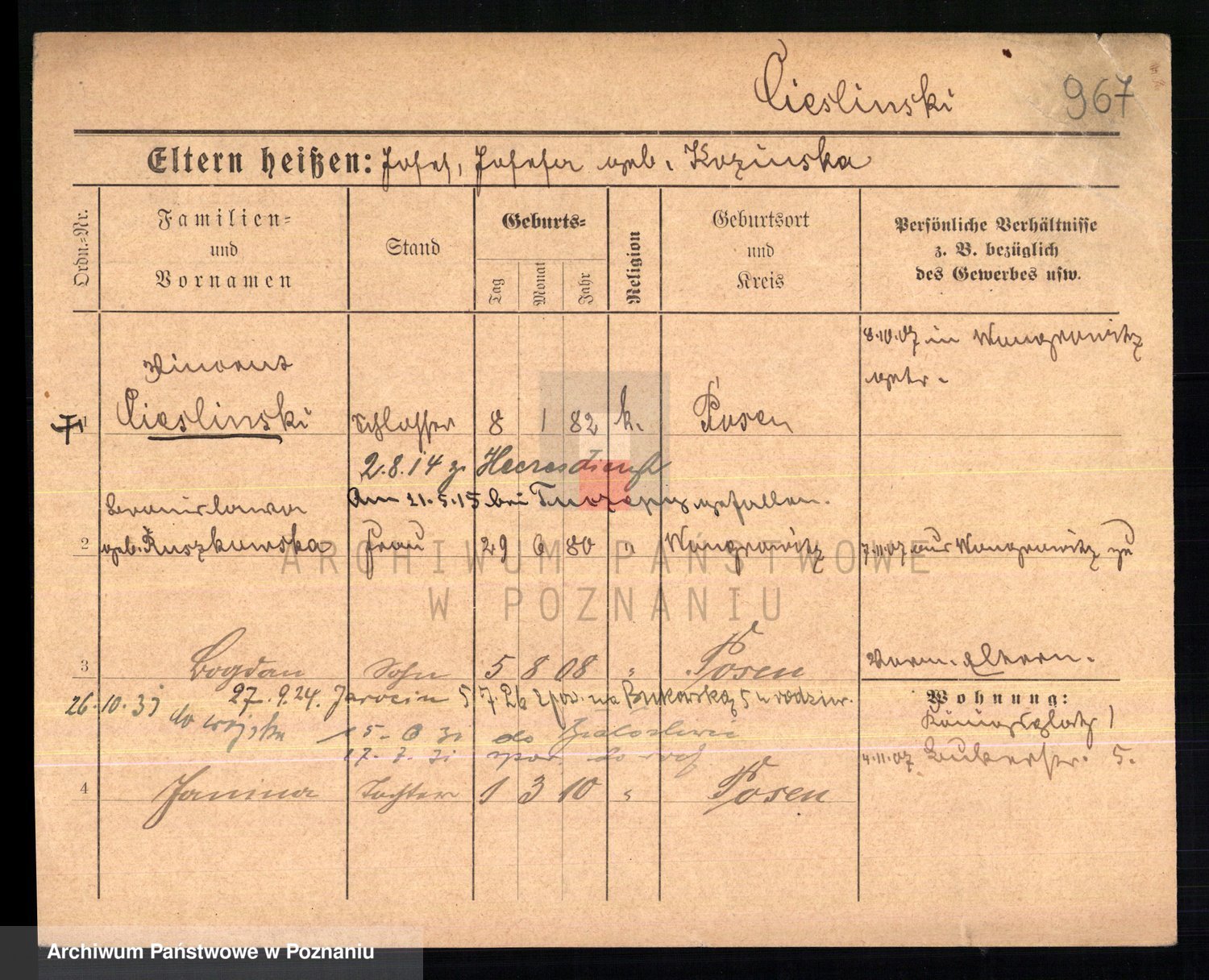Podgląd karty osobowej dostępny jest po kliknięciu na nazwisko lub ikonkę karty. Można dokonywać powiększenia (ikony na górze) lub przechodzić między kolejnymi skanami (strzałki po bokach).